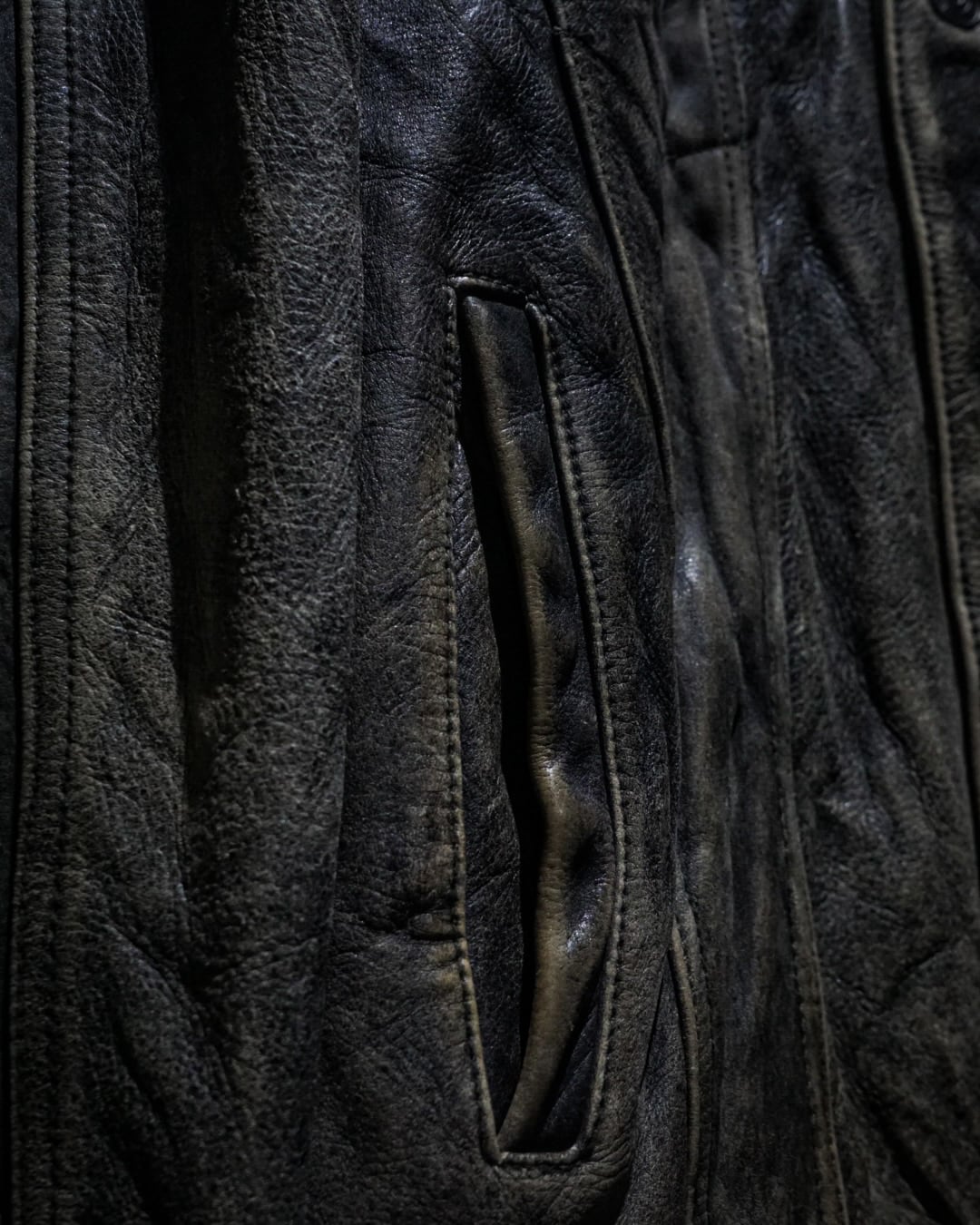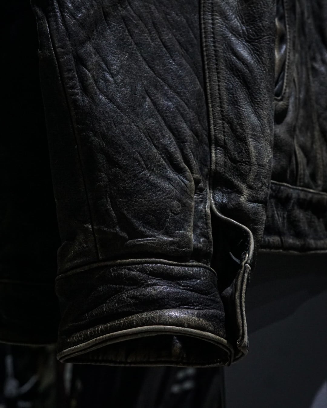 トラッカー型の特徴でもあるフラップポケットやV字の切り替えを踏襲しながら、レザー特有のシボがヴィンテージの雰囲気をさらに加速。