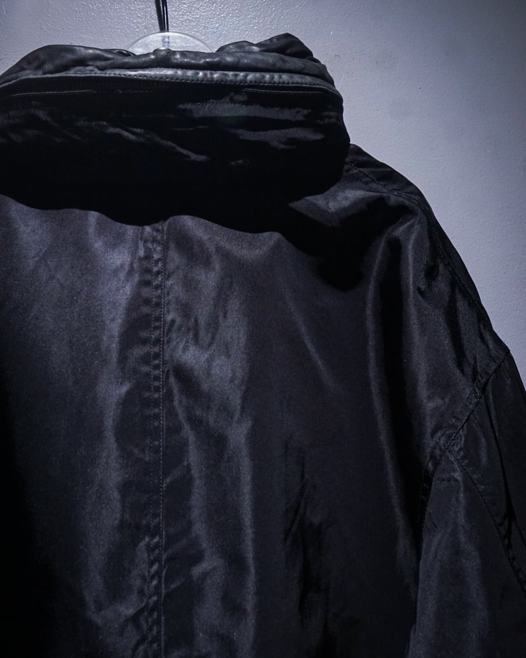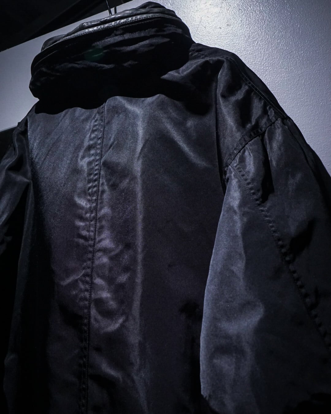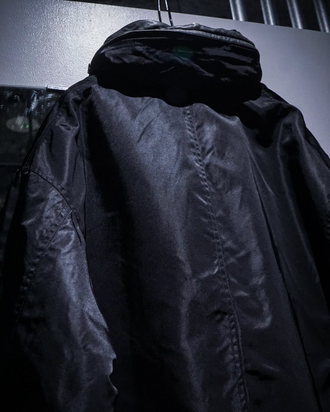 まず目を惹くのは、襟の内側にレザー切り替えを施した独特の作り。ナイロンシェルとの質感のコントラストが強く、ジップを上まで閉めたときの表情が一段深まります。レザーは控えめな艶があり、デザインとしてもアクセントに。