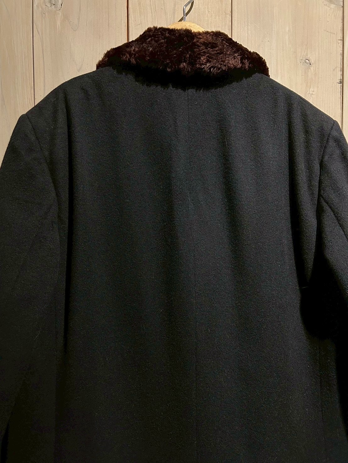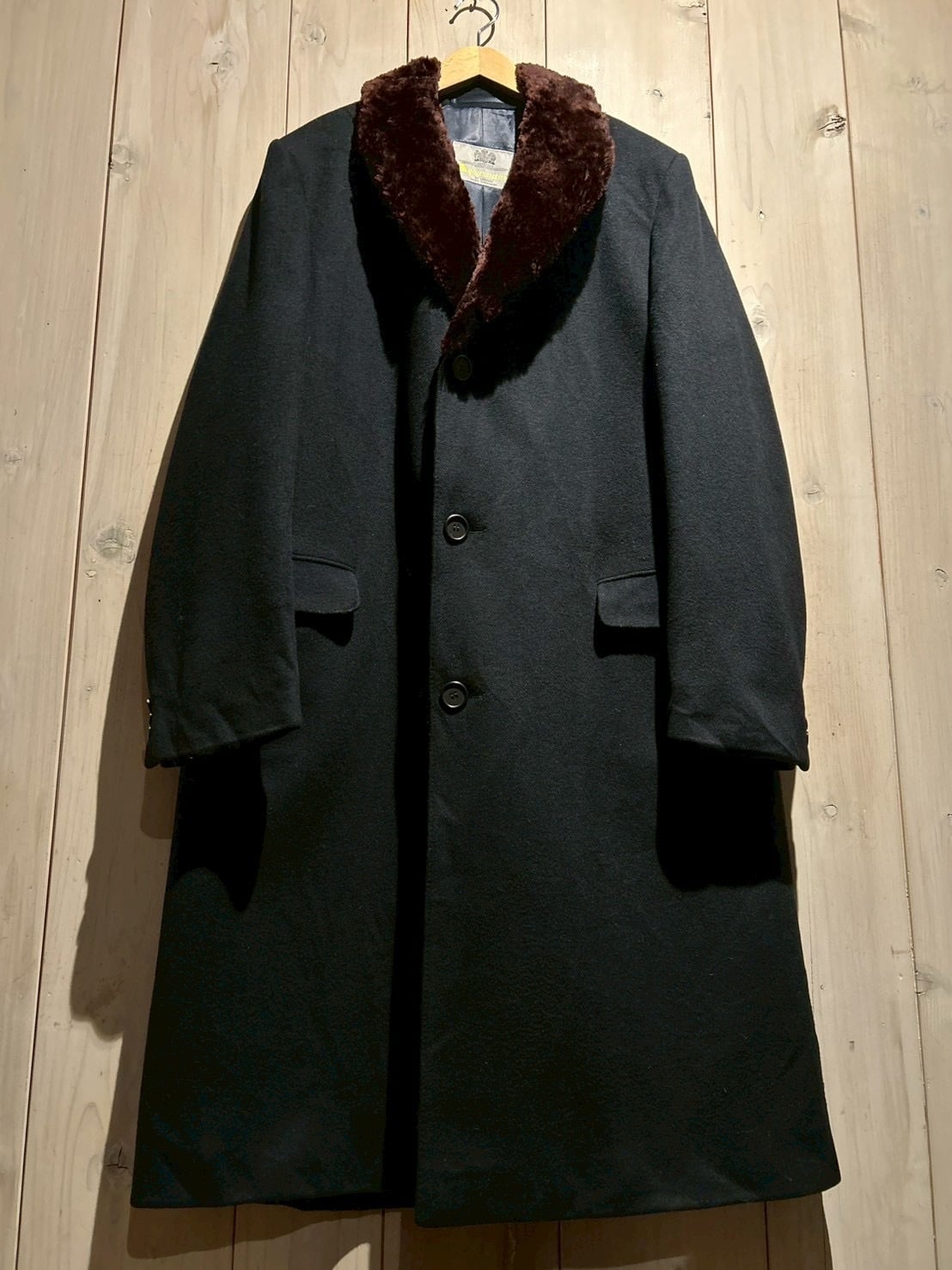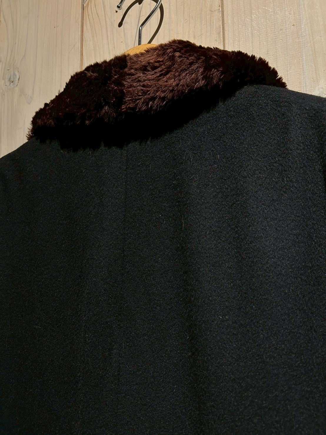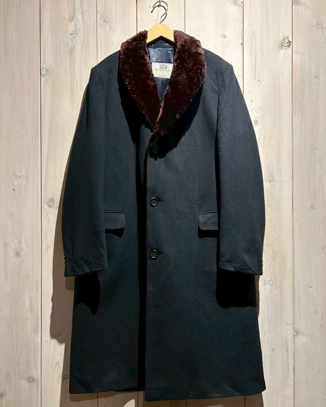 深いネイビーのウールをベースに、襟にはブラウンのフェイクファーを贅沢に施したウールコート。
