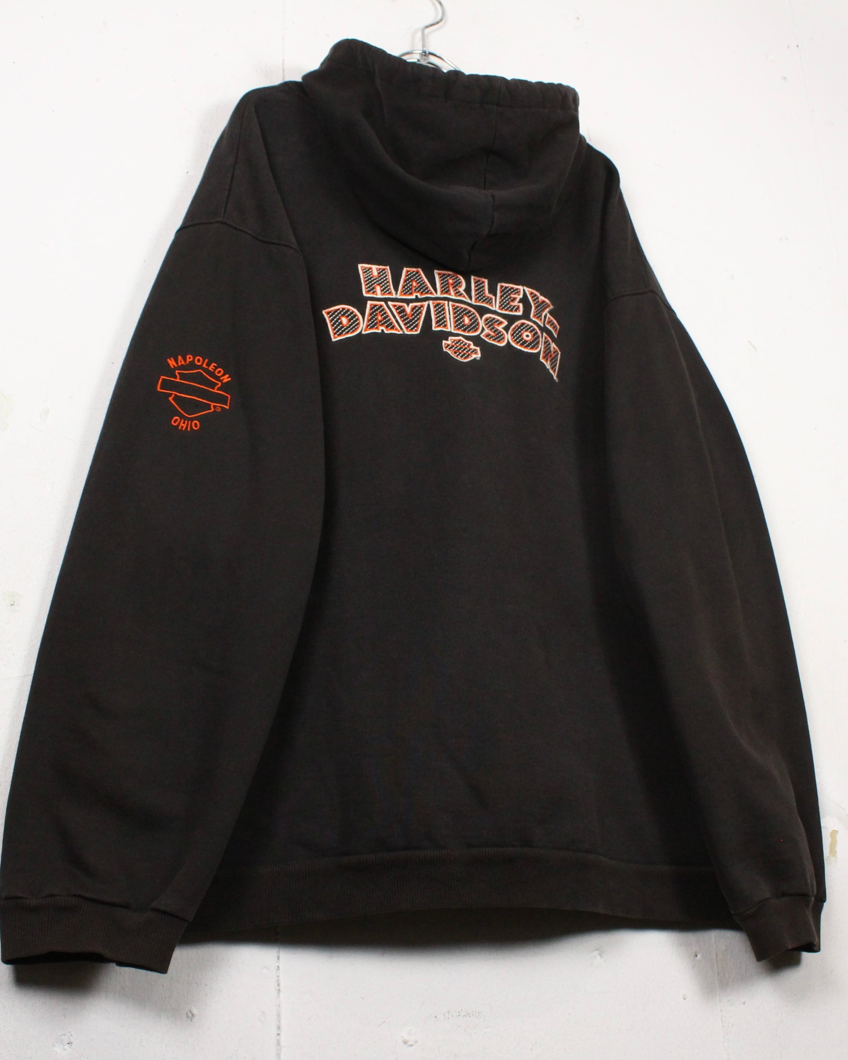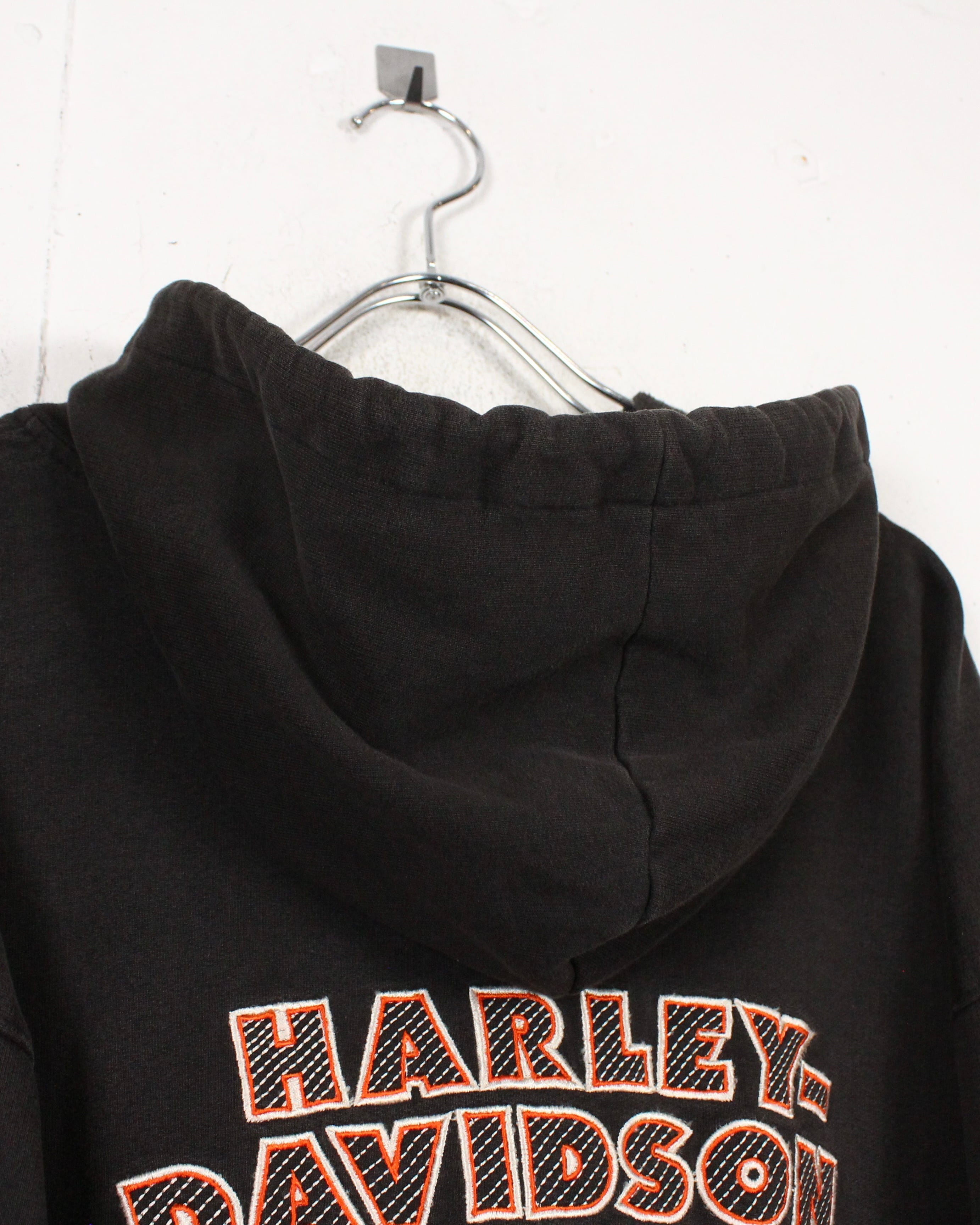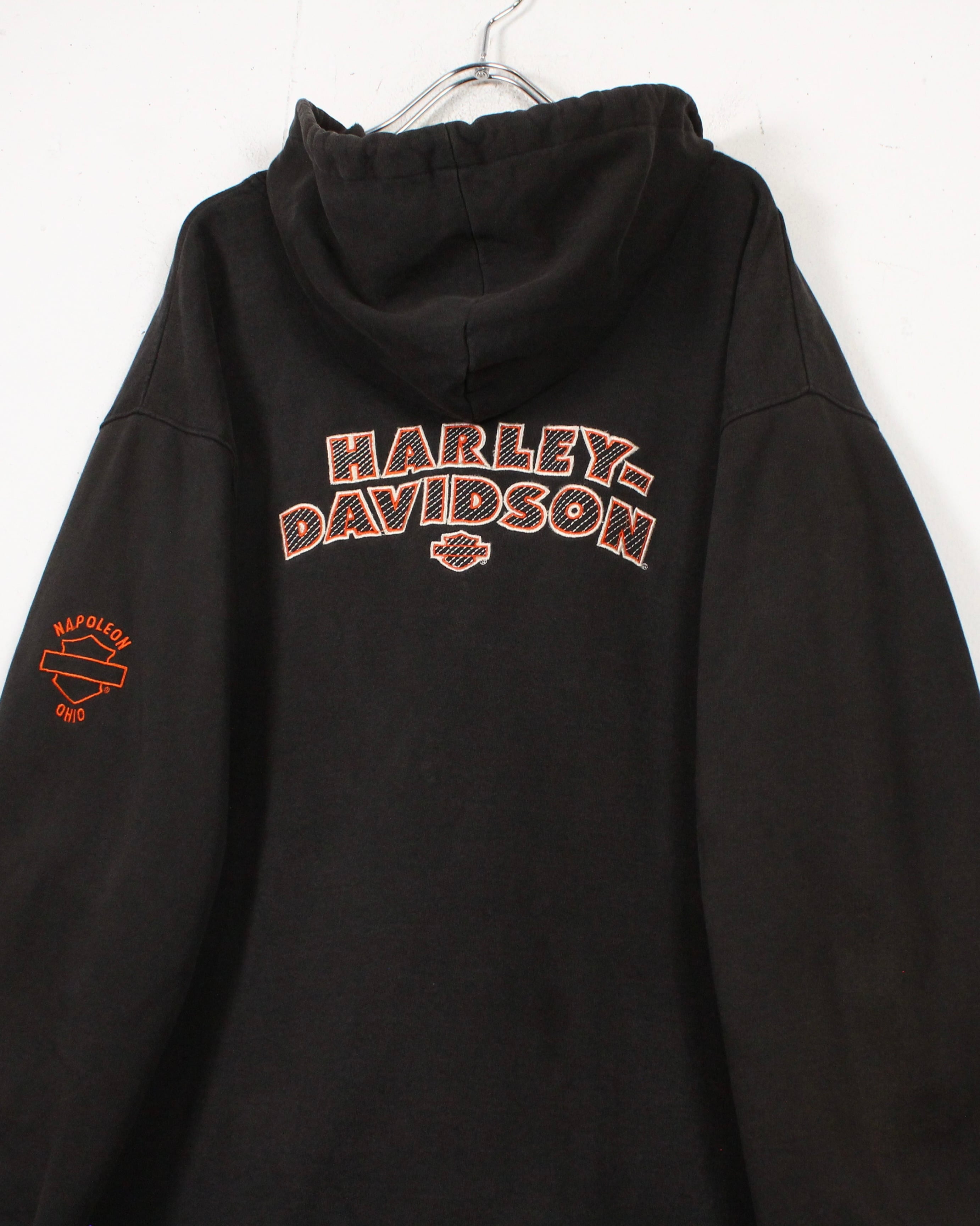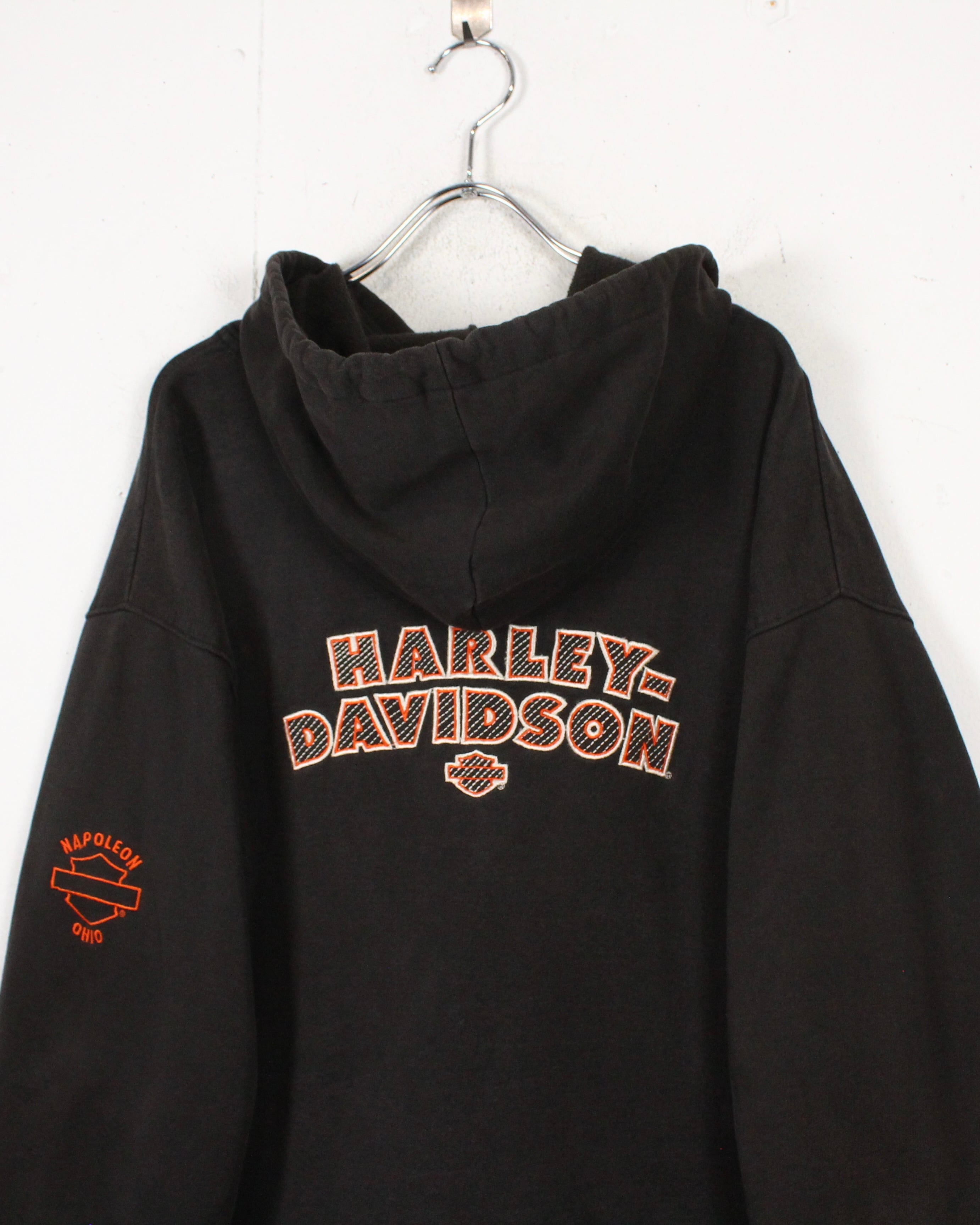 刺繍のオレンジがブラックボディのフェードと相まって存在感を放つ“Harley-Davidson”のジップフーディです。