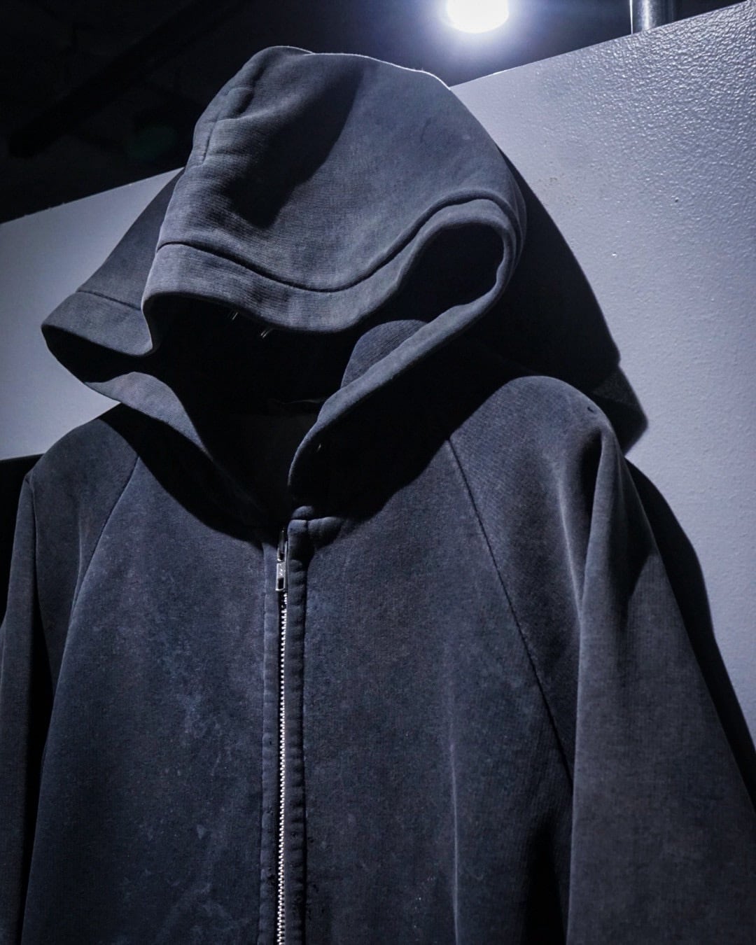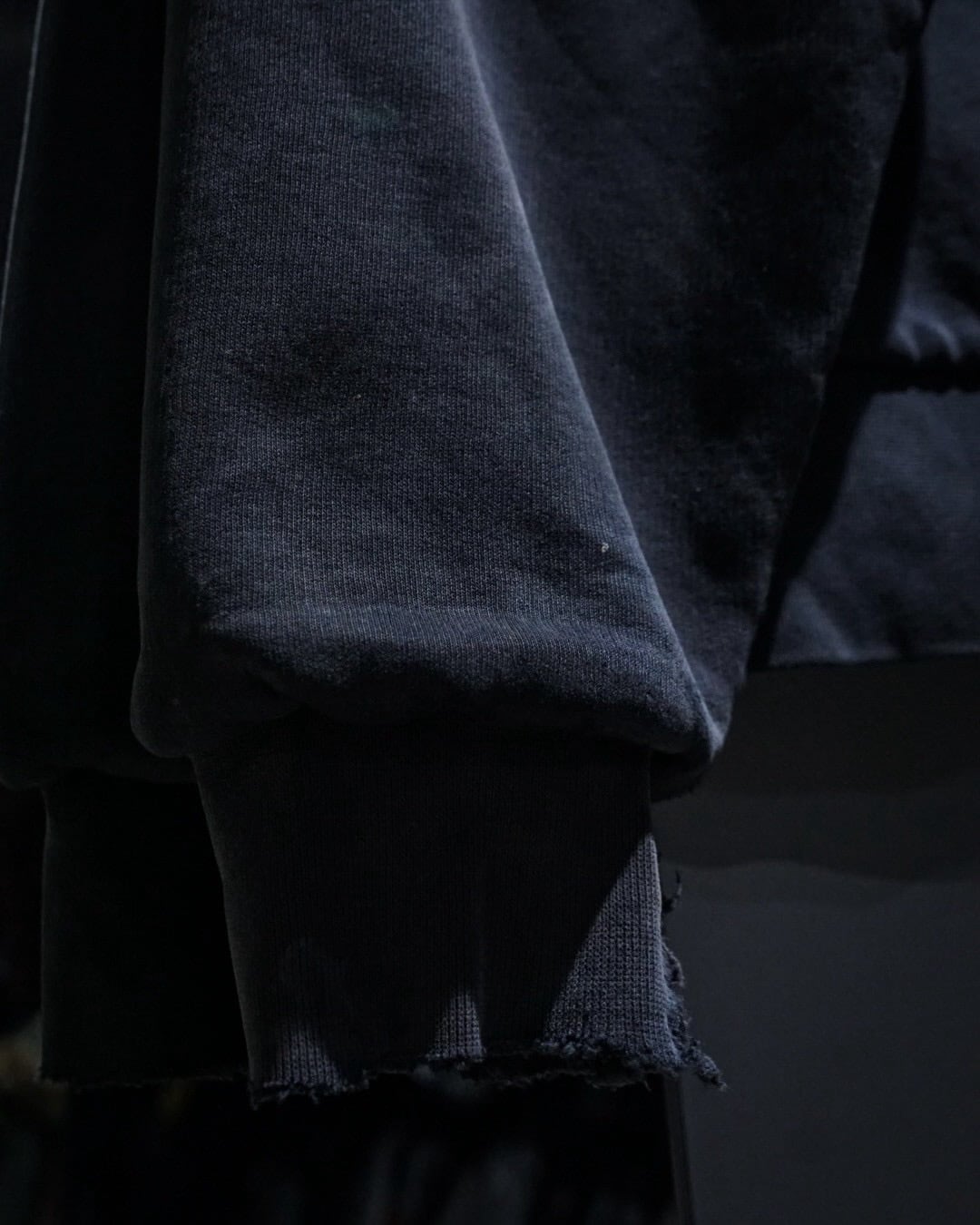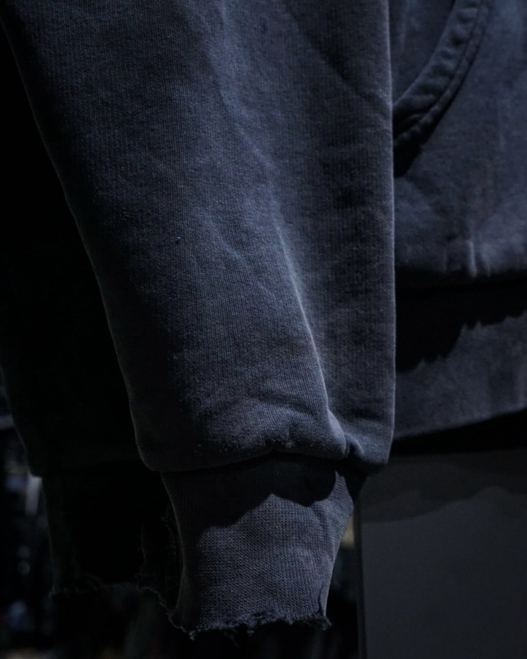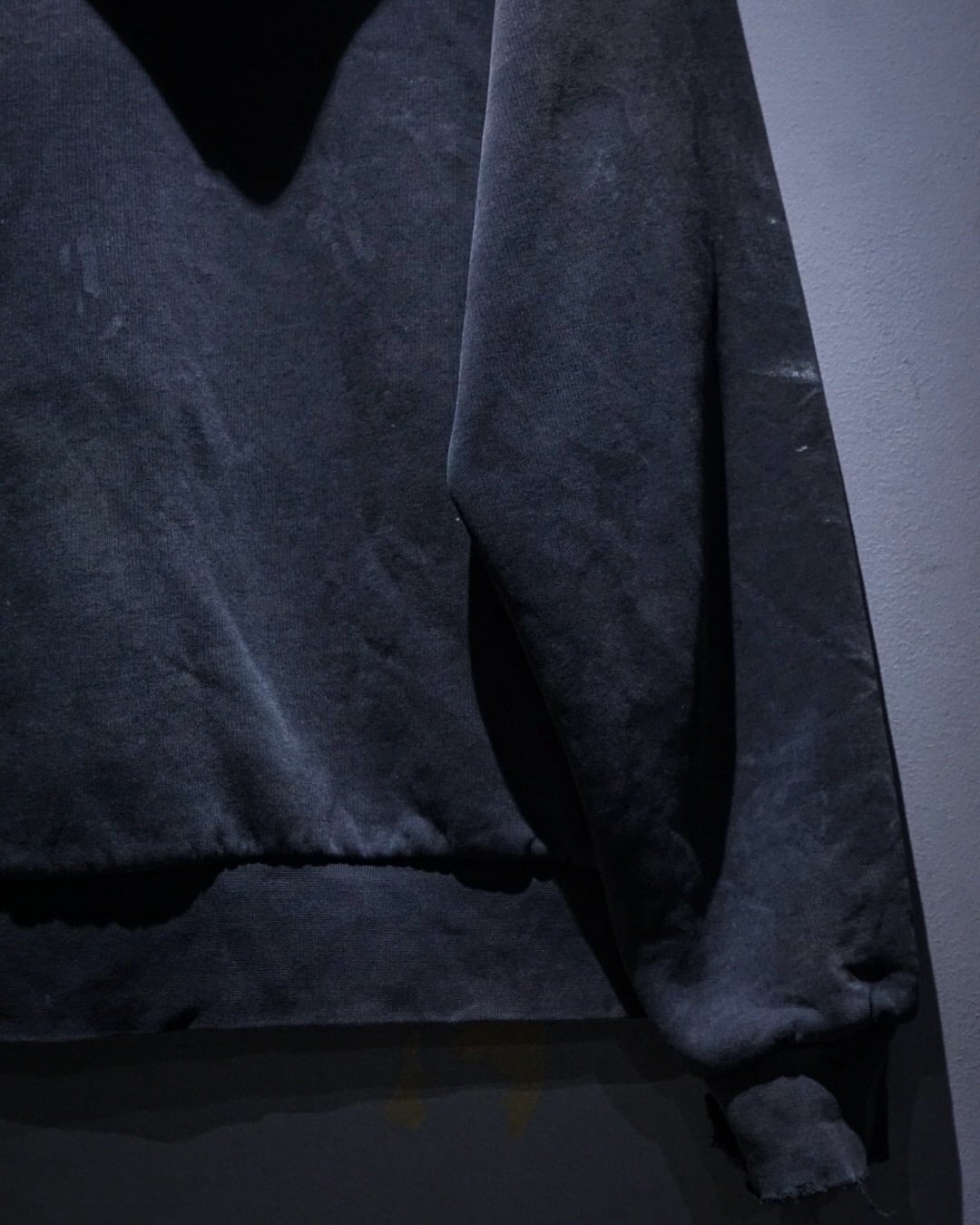 長い年月をかけて生まれたフェード感が美しいジップフーディ。狙って作るのは容易ではなく、前所有者の時間がそのまま染み込んだリアルな表情で、ブラックが淡く抜けたボディがヴィンテージ特有の奥行きを作り出しています。