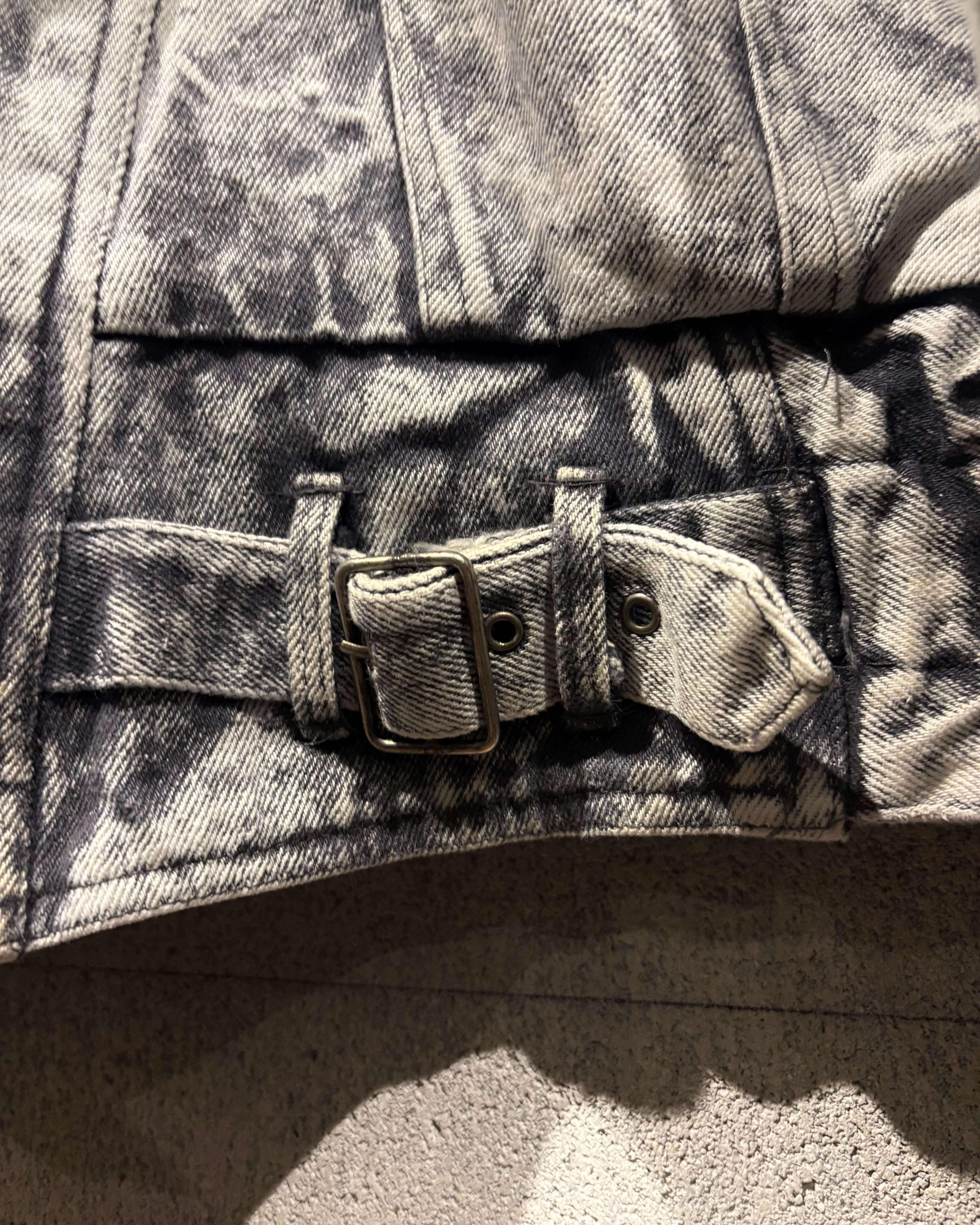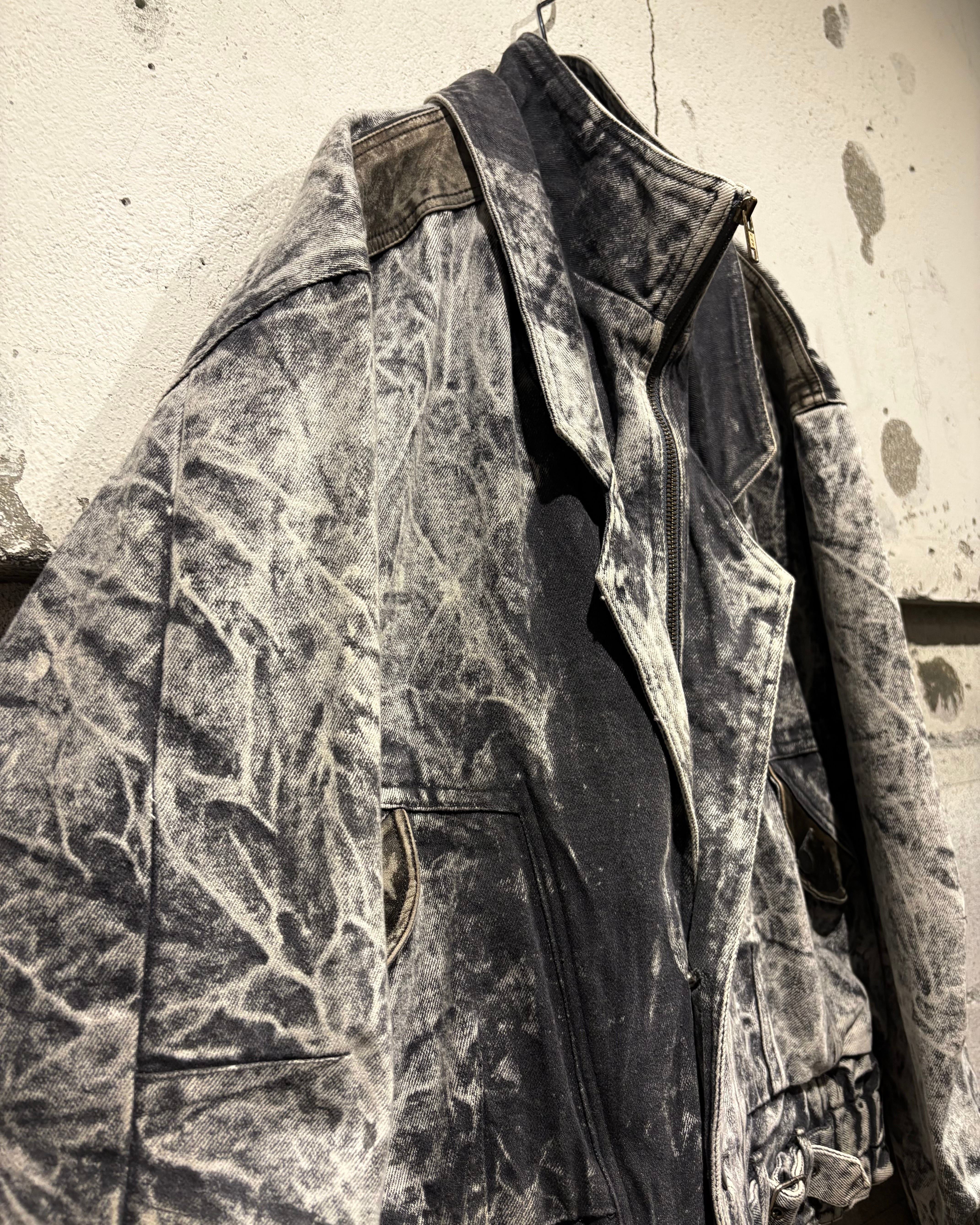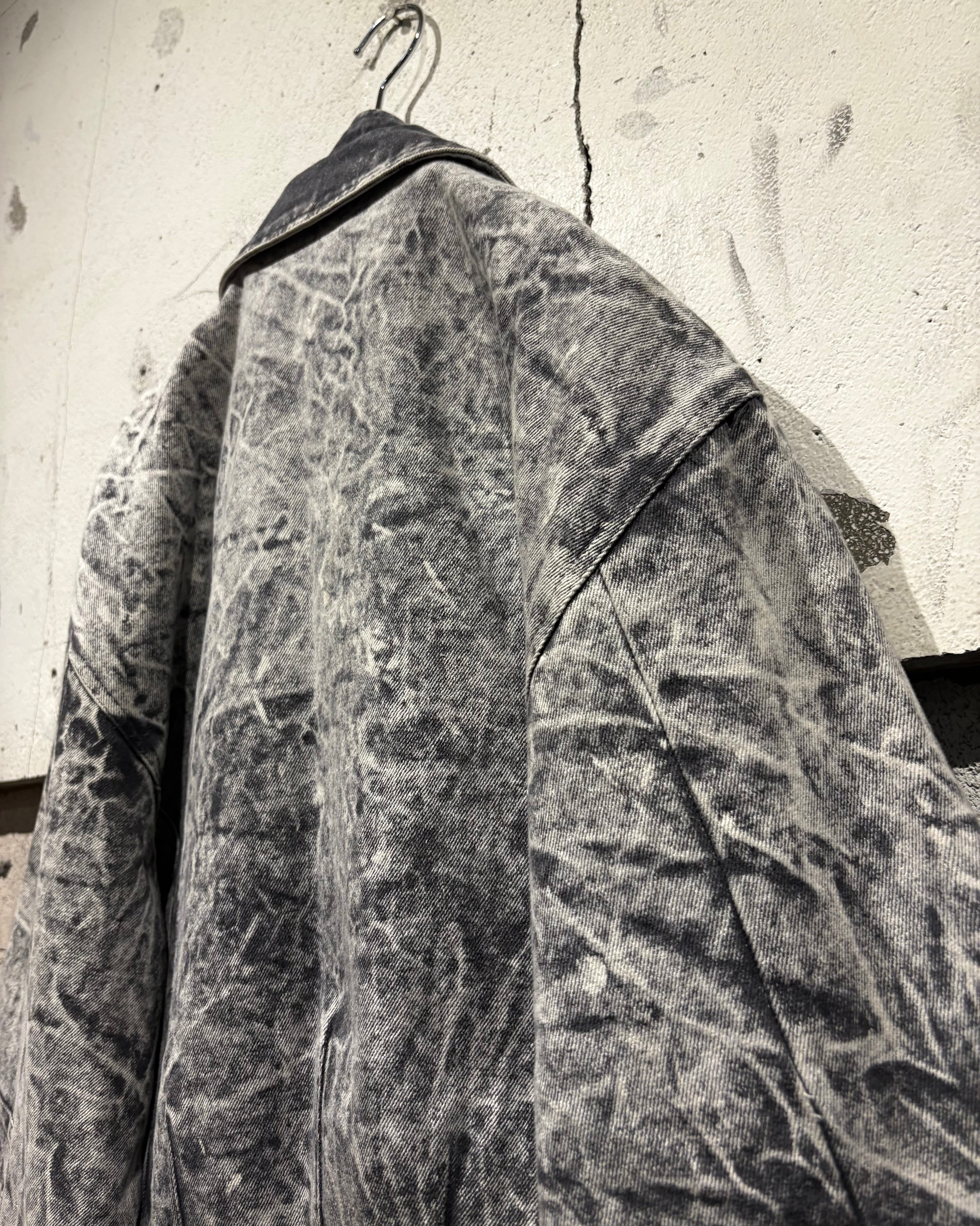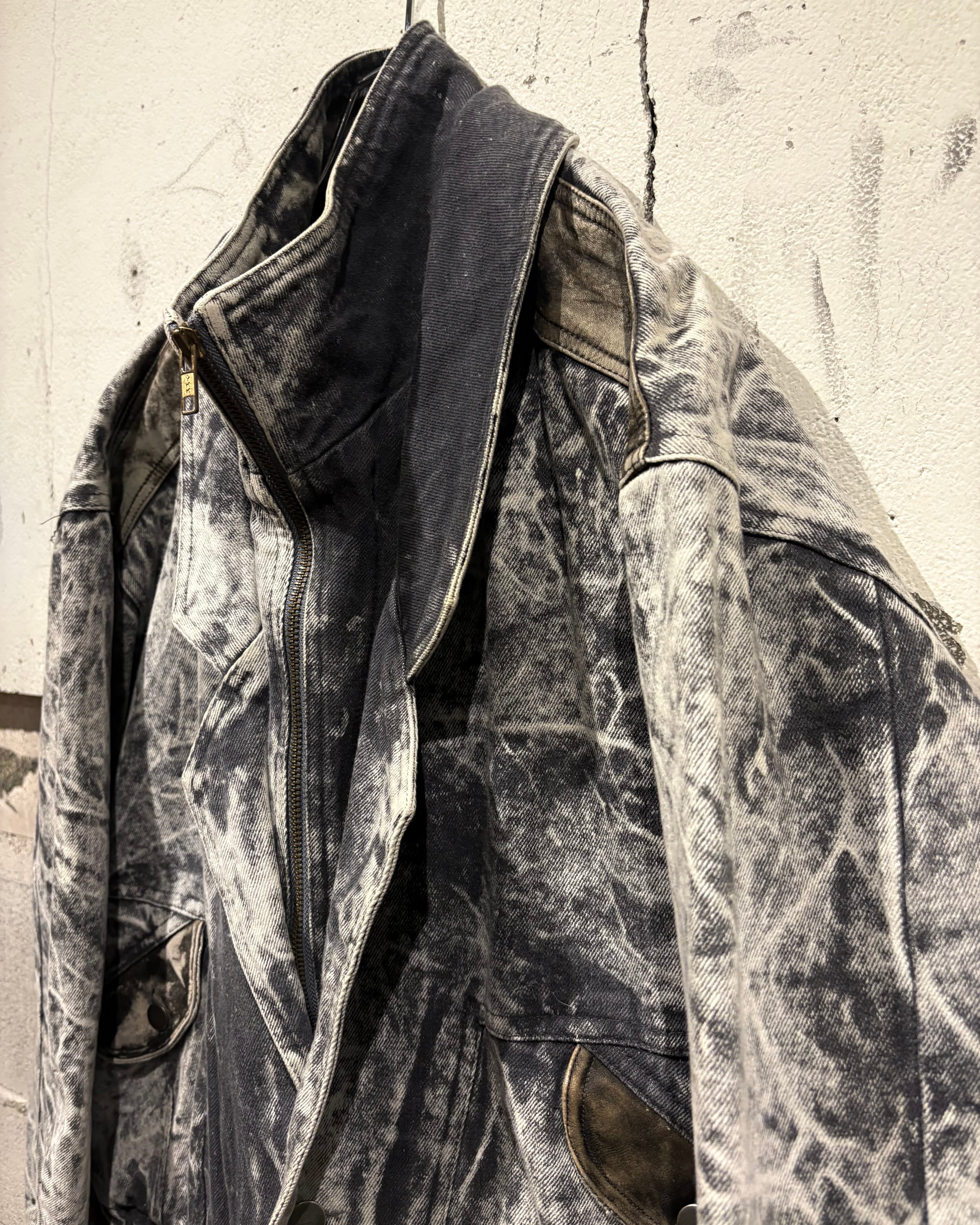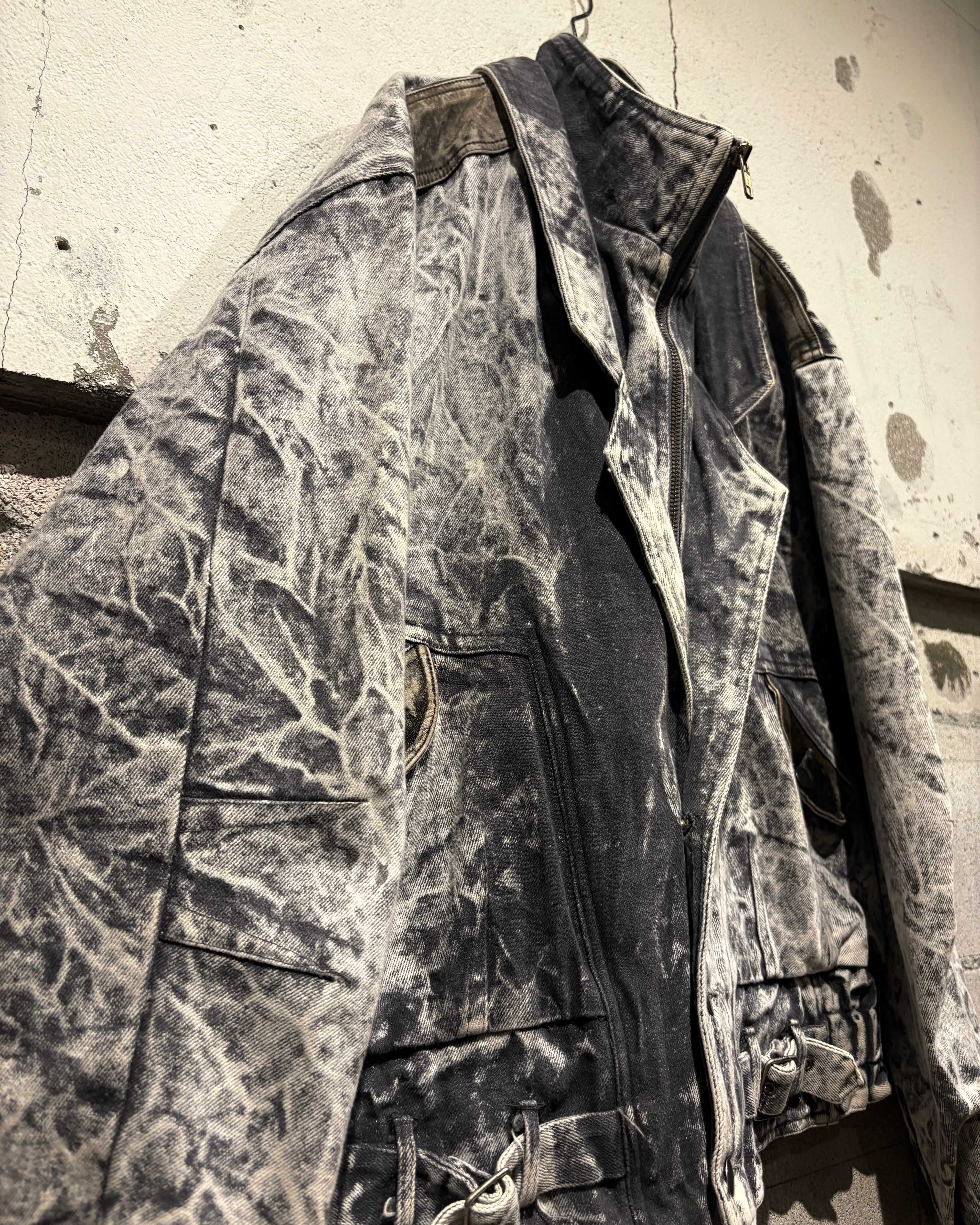 大胆なケミカルウォッシュを効かせたグレーのデニム素材をボディに使用し、ハイネックのレイヤードギミックを施した1着。