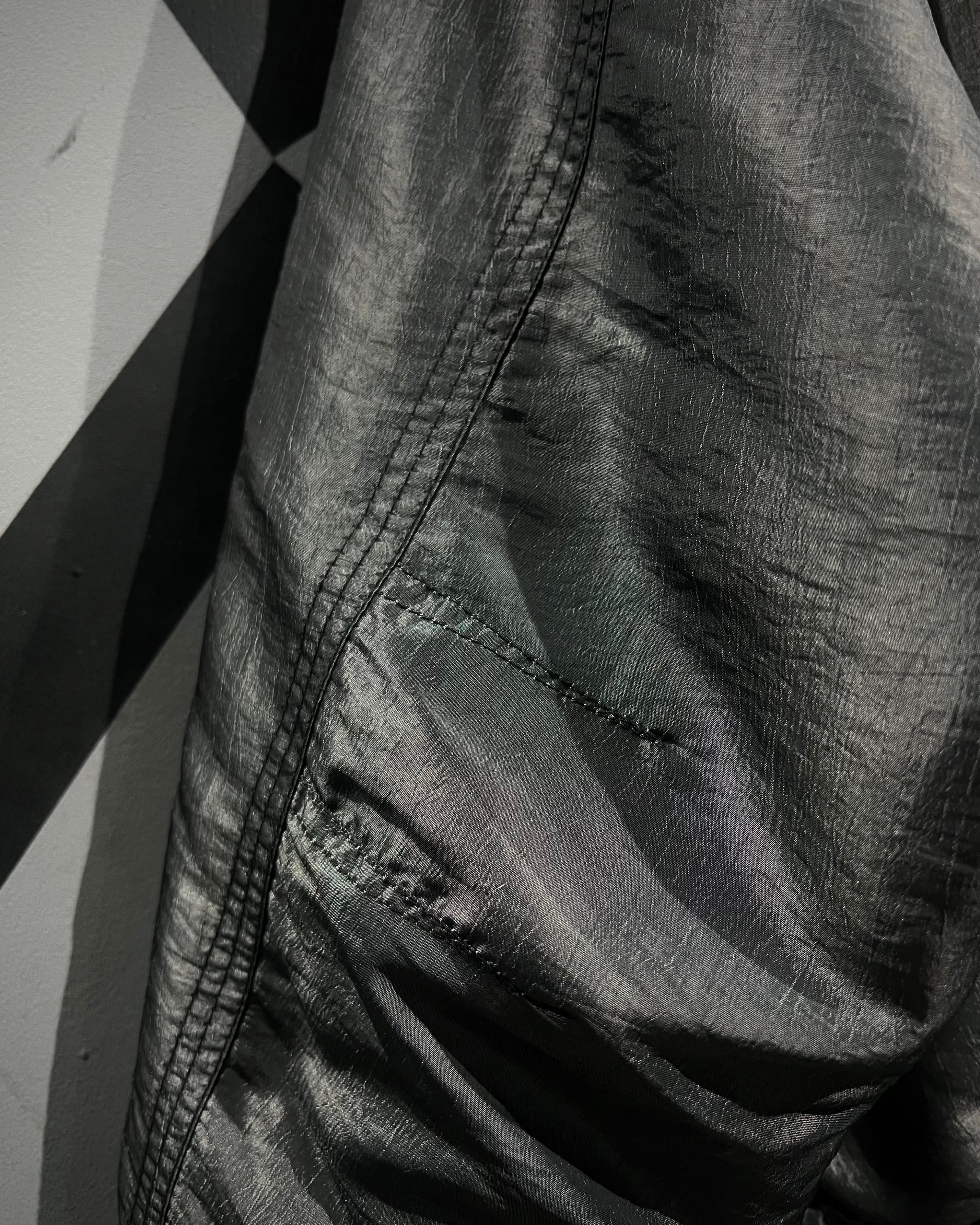 光を受けて鈍く輝く独特のシルバーは、ただ存在感があるだけでなく質感としての深みがあるのが魅力。ナイロン×ポリエステル特有のパリッとした張り感に、わずかに走るシワが陰影をつくり、表情に立体感を与えています。