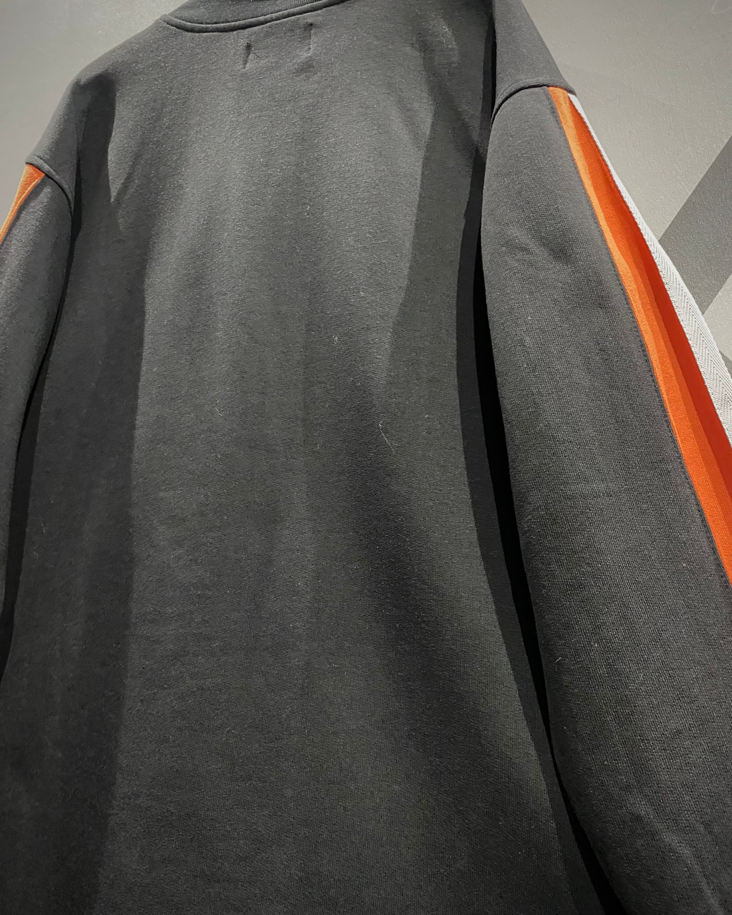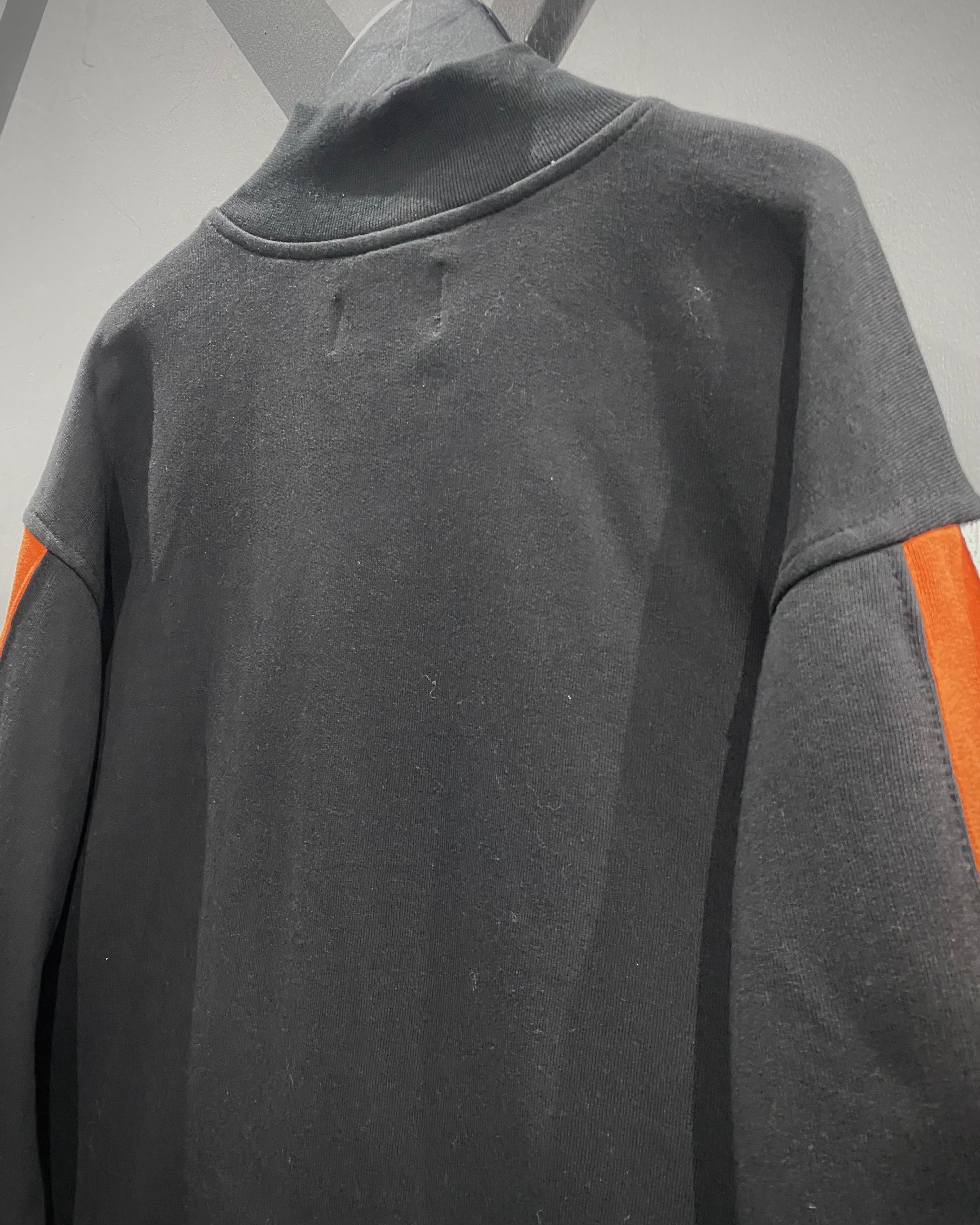 ネックまでしっかり高さを出したハーフジップ仕様で、ジップのビビッドなオレンジも良いアクセント。袖にまでラインを落とし込むデザインバランスも絶妙で、ストリートとスポーツの空気感を纏った1着に仕上がっています。
