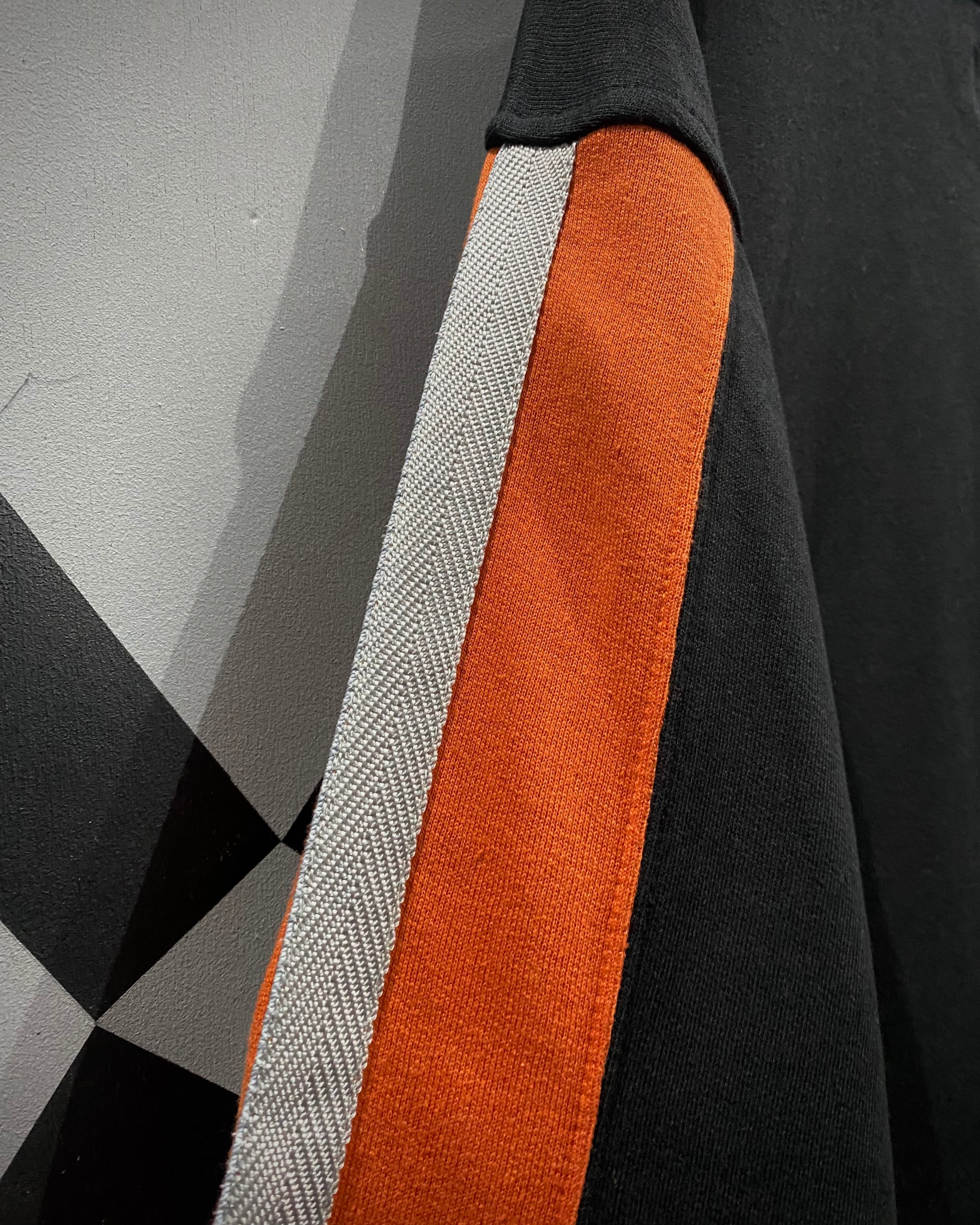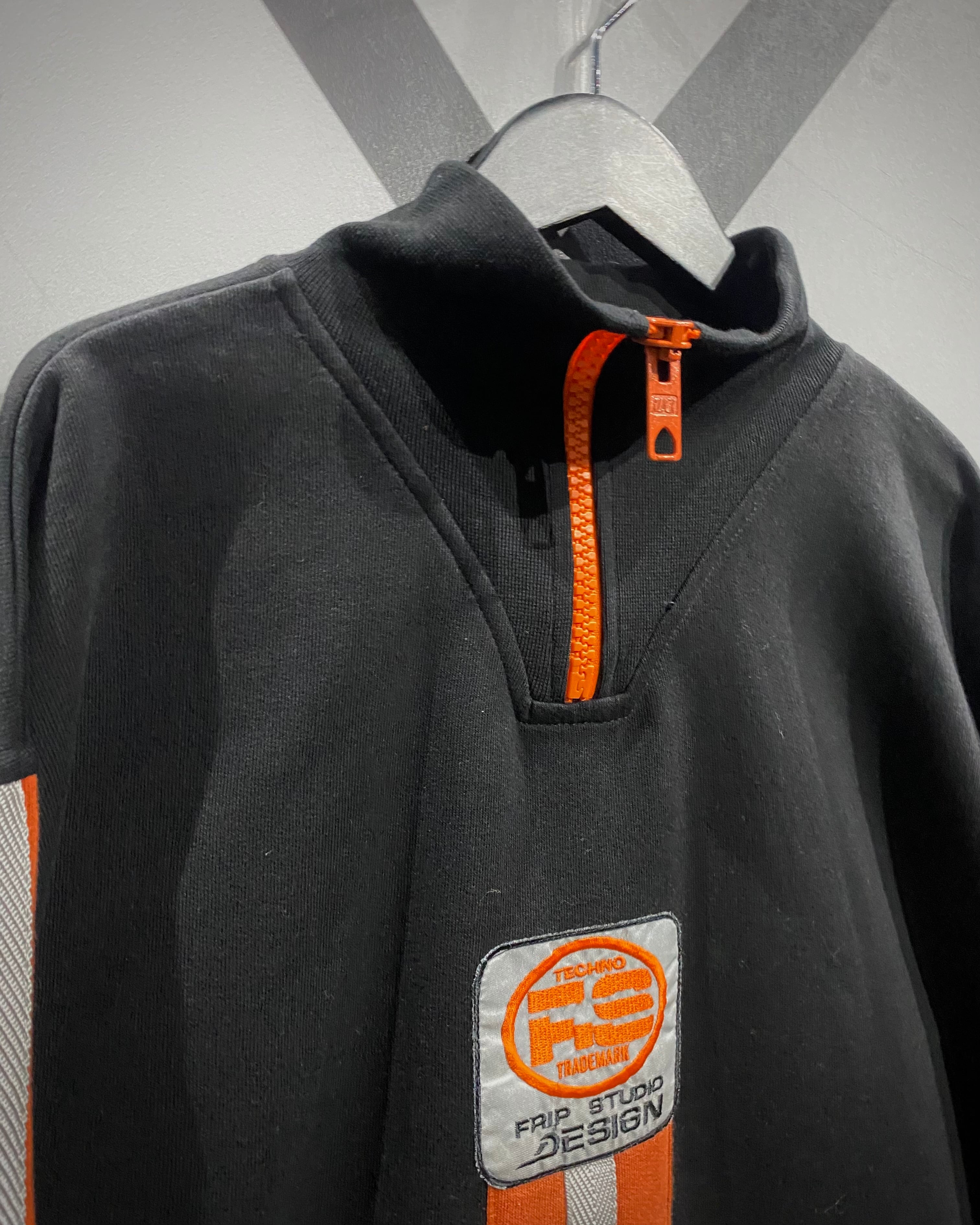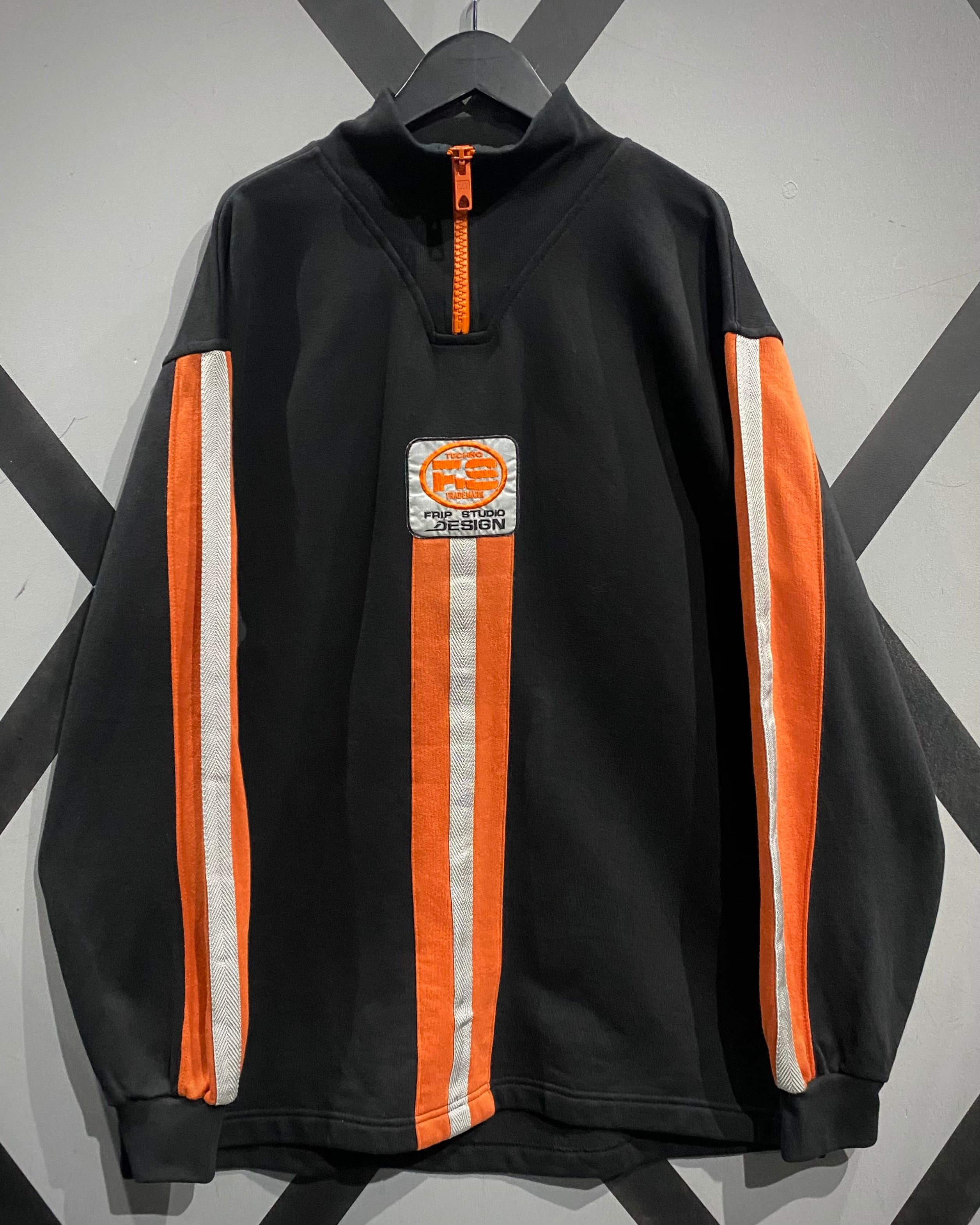 一見シンプルなブラックボディながら、フロントに走るオレンジ × ホワイトの大胆な2本ライン、そして胸元のワッペンが当時の空気感をしっかりと漂わせています。