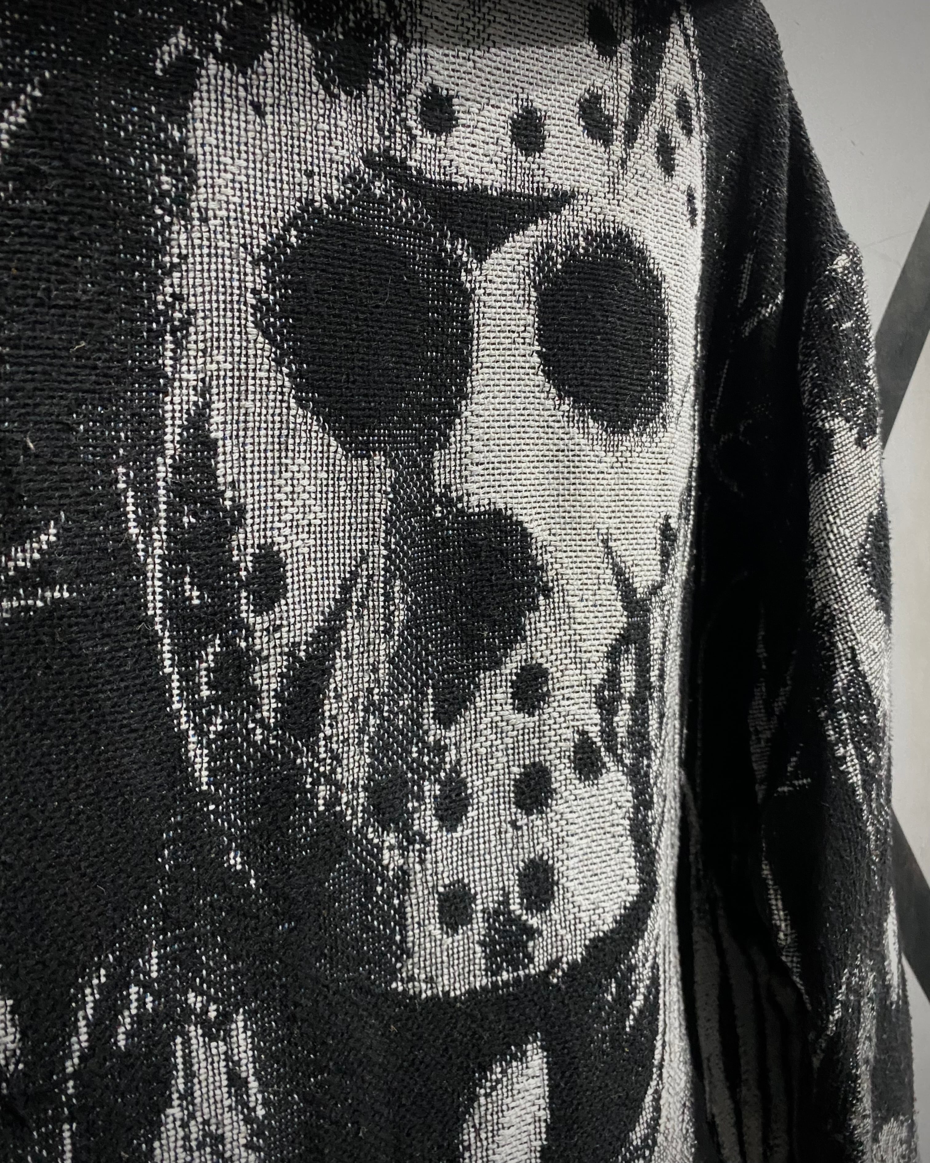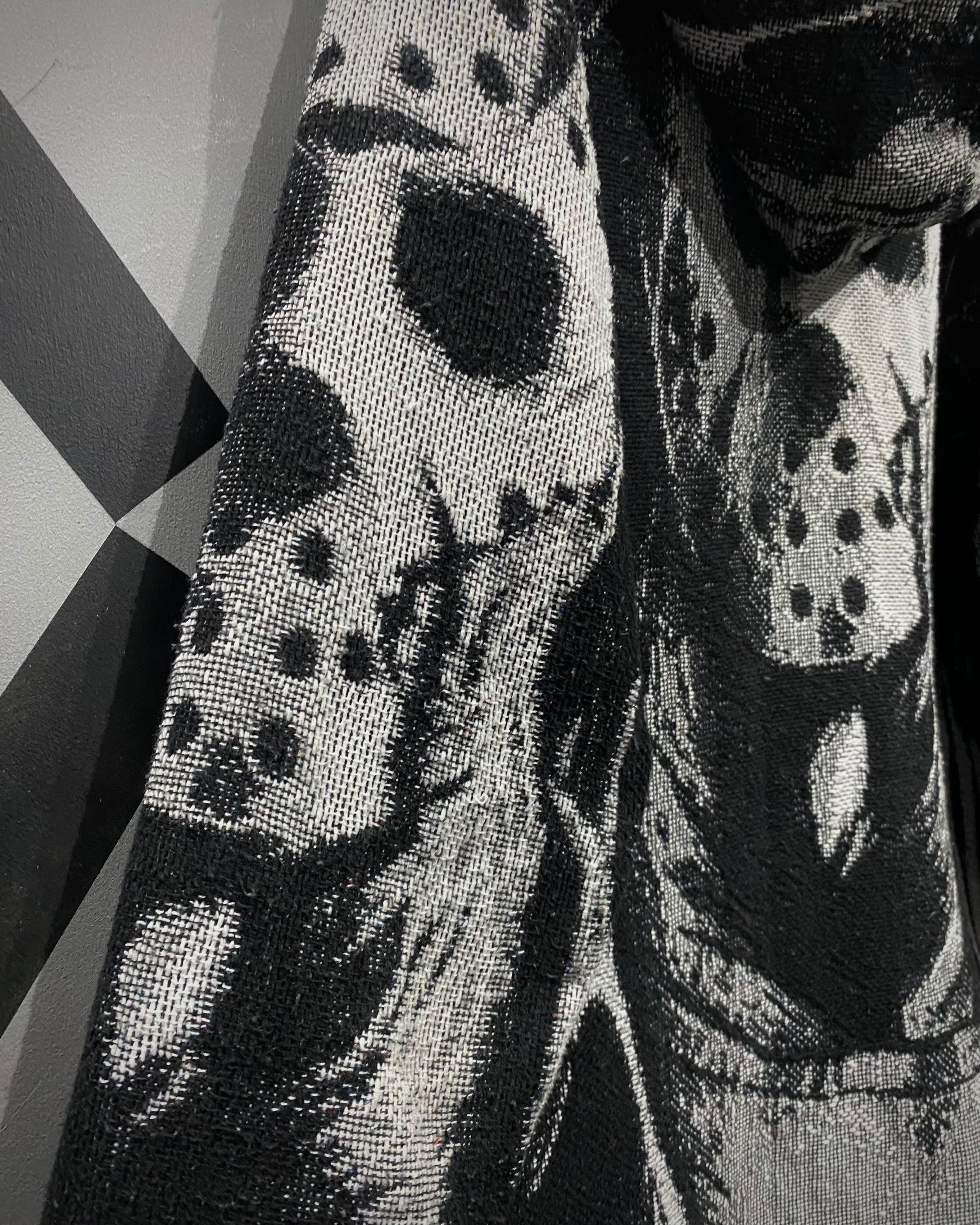 緻密な織り柄ならではの立体感と陰影が、ジェイソンの不気味さをより際立たせ、プリントでは出せない迫力を実現。ブラック×グレーのモノトーンでまとめることで、汎用的なのも嬉しいポイント。
