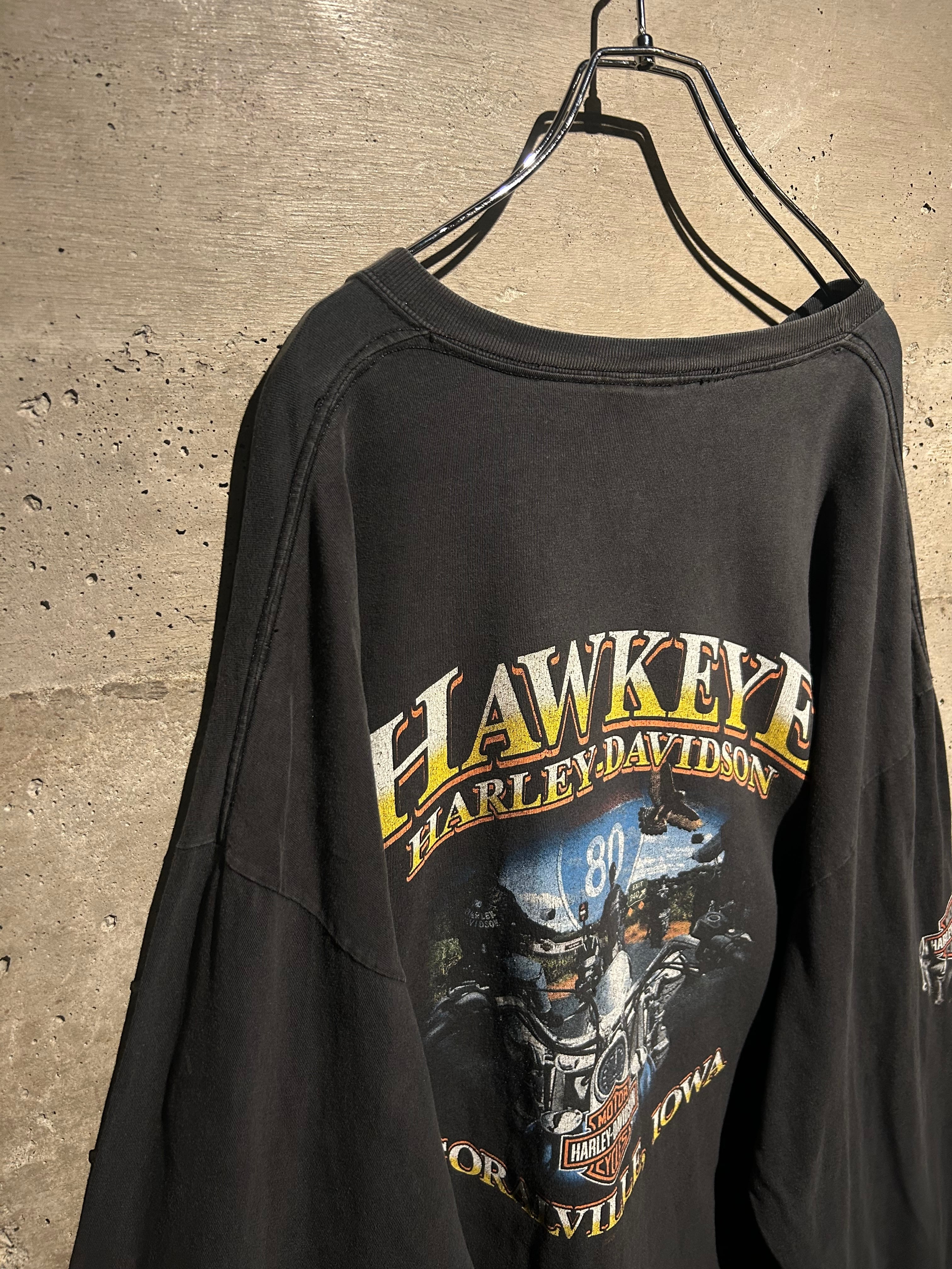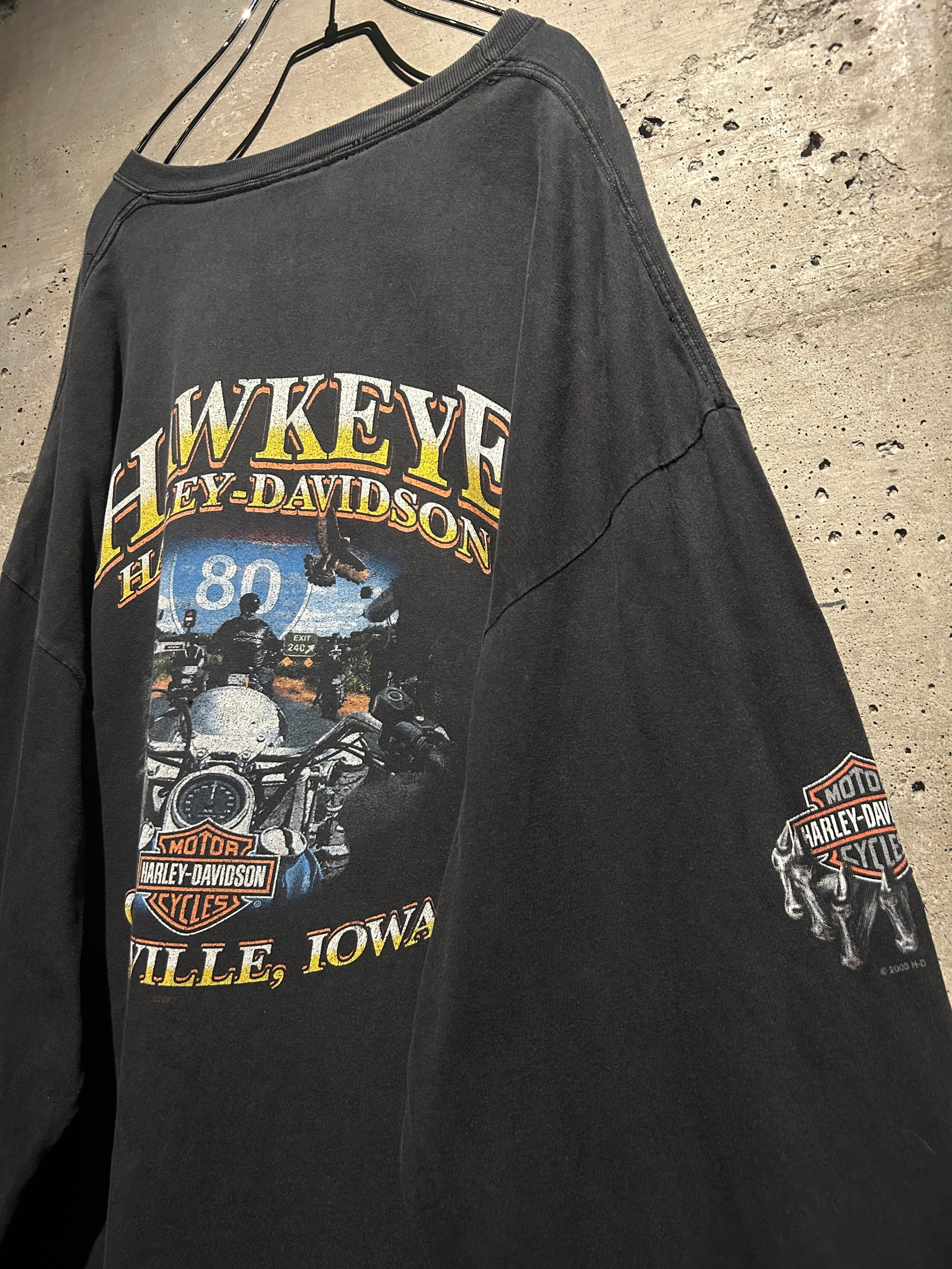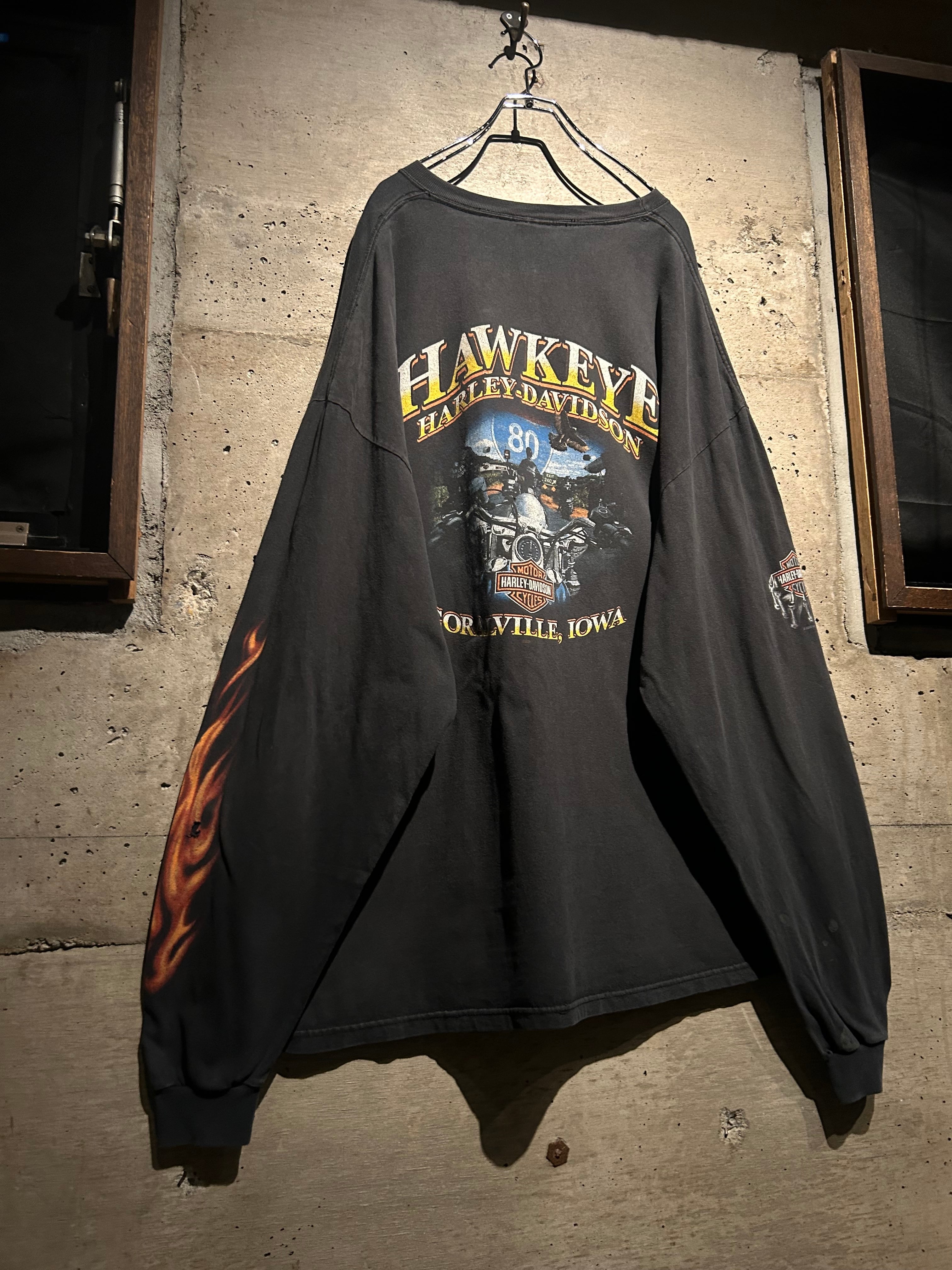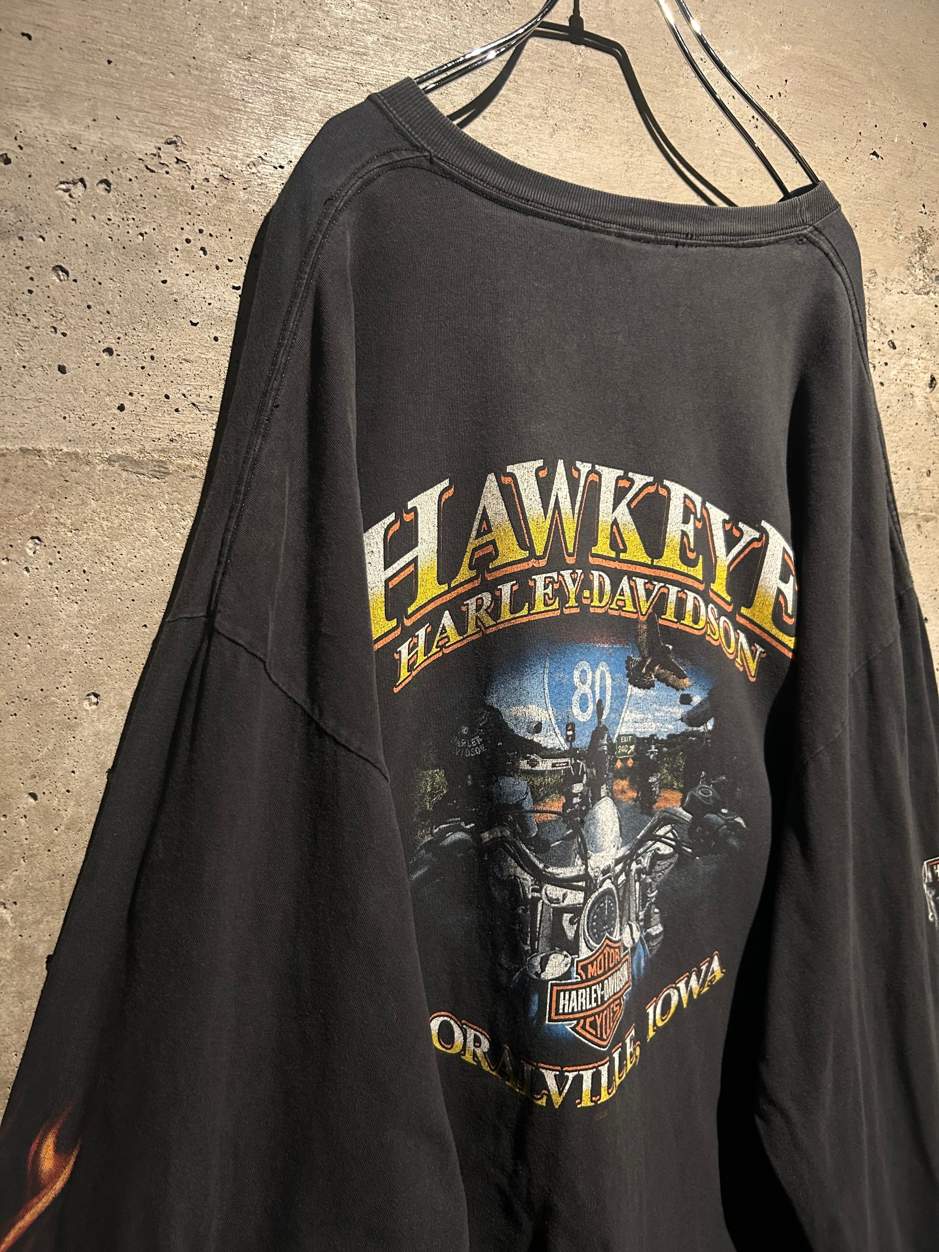 フェード感のあるボディに、フロントにはお馴染みのバー&シールドロゴ。アームにはフレイムプリント、バックには HAWKEYE HARLEY-DAVIDSON と、アイオワ州のローカルショップデザインが映える一枚。