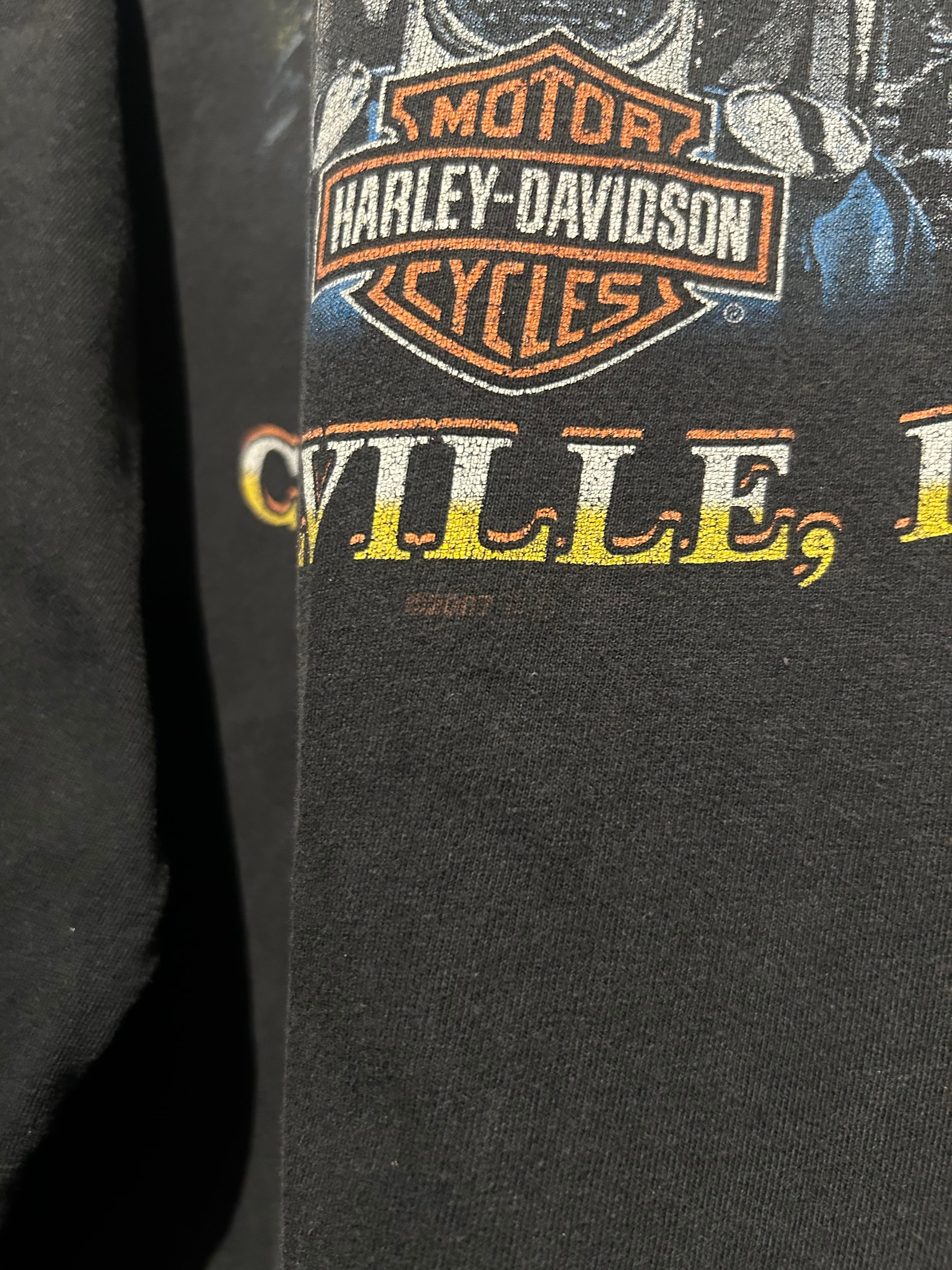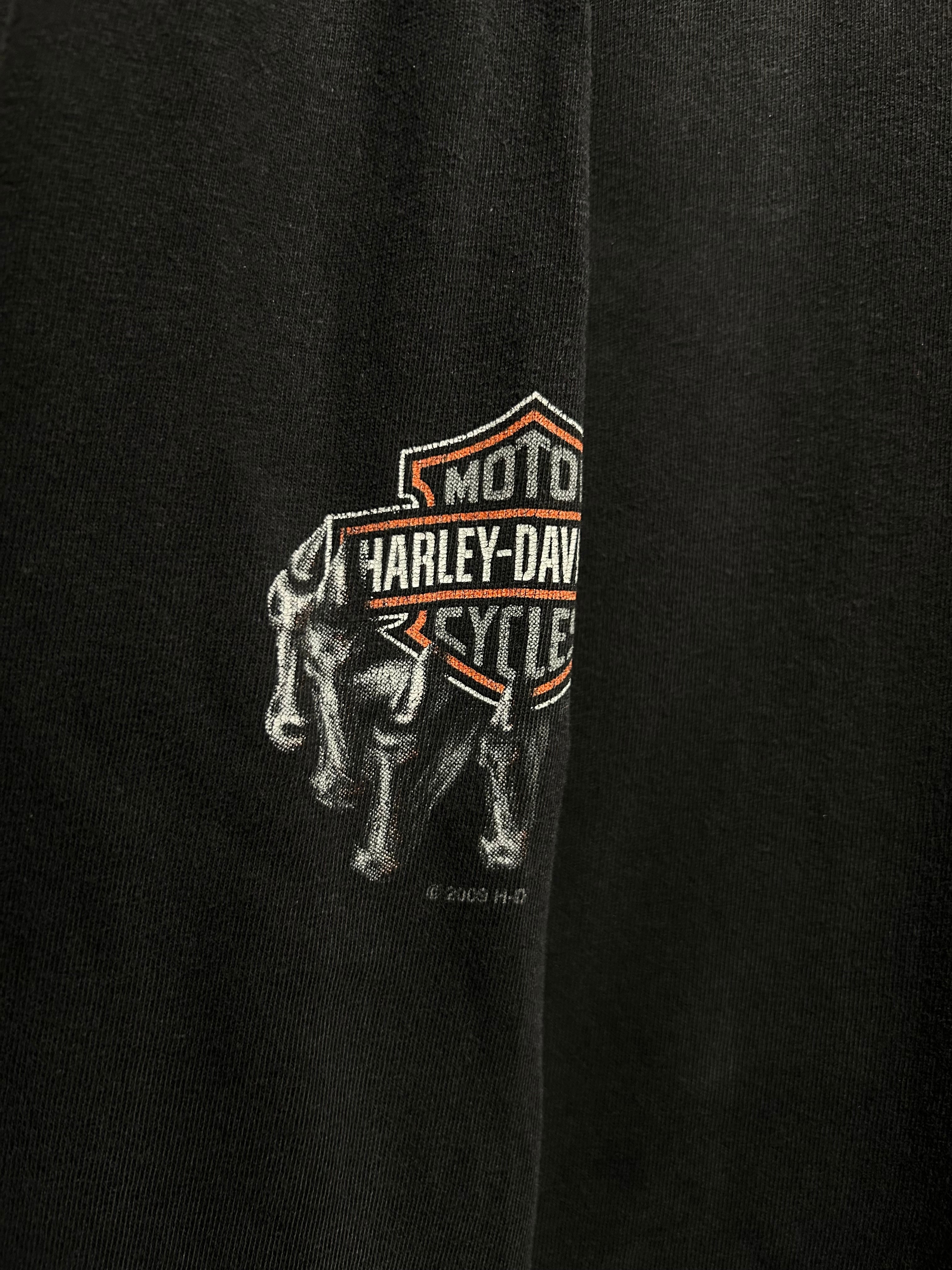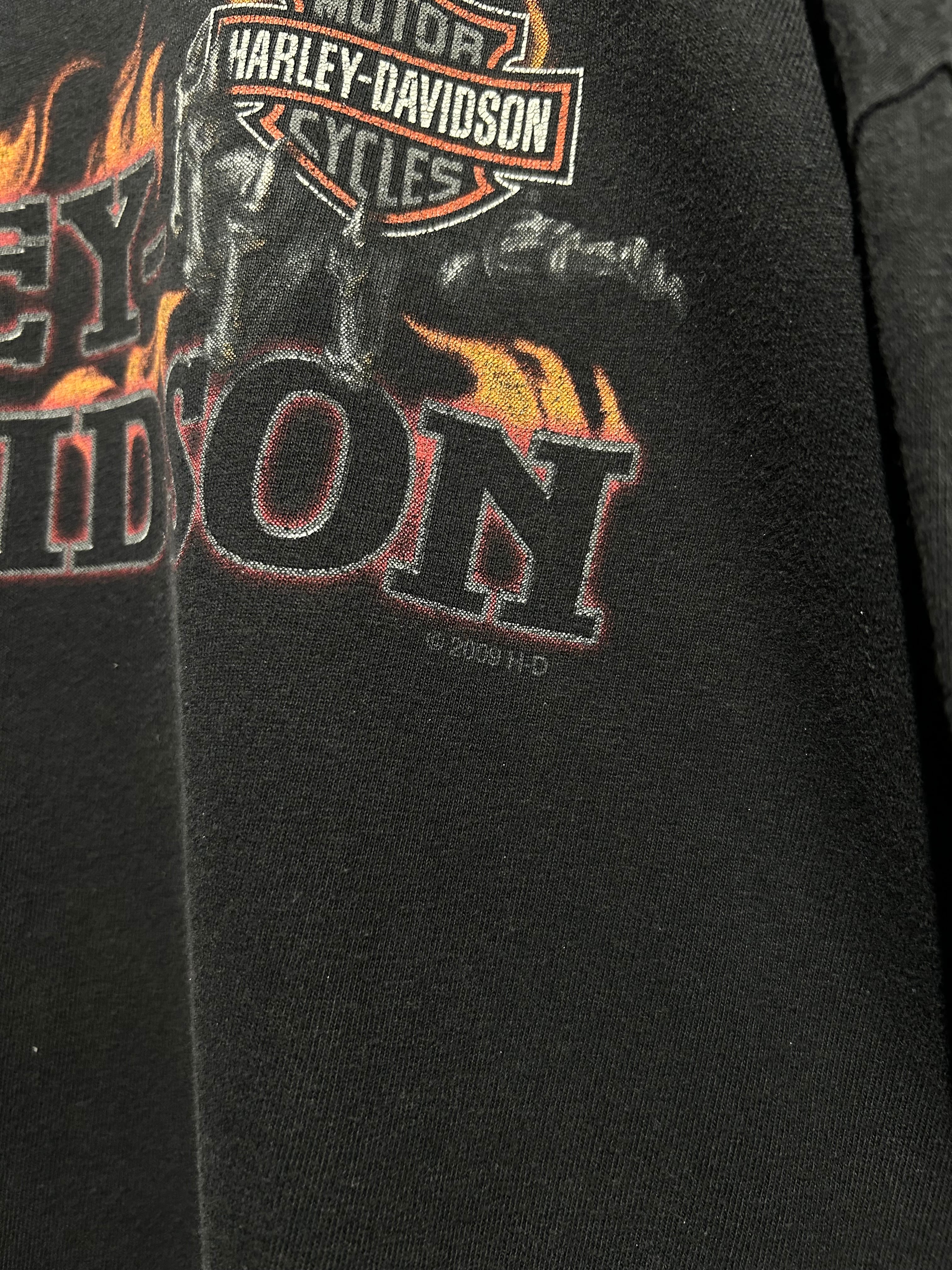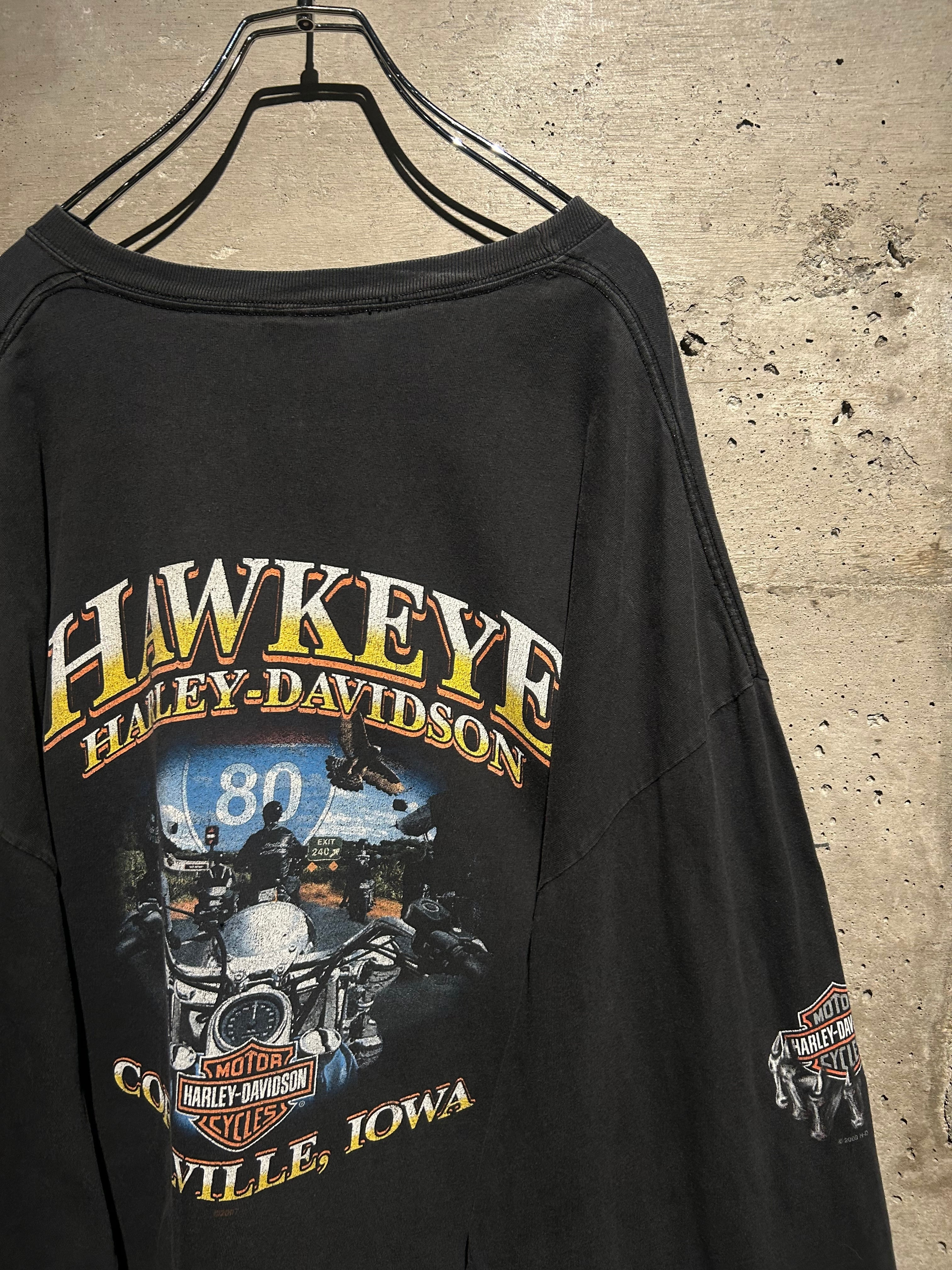 フェード感のあるボディに、フロントにはお馴染みのバー&シールドロゴ。アームにはフレイムプリント、バックには HAWKEYE HARLEY-DAVIDSON と、アイオワ州のローカルショップデザインが映える一枚。