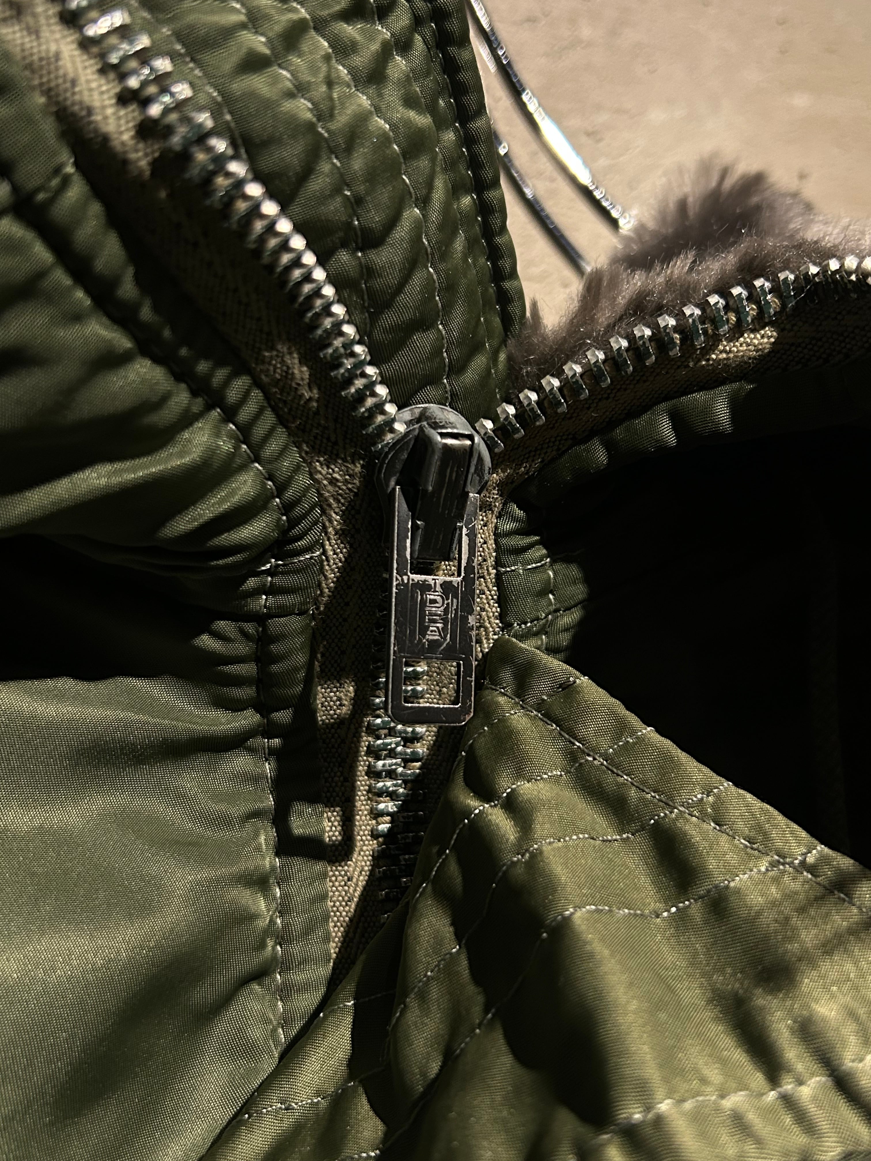 ボディは深いセージグリーンのナイロンシェル。中綿入りの肉厚ボリュームに加え、N-2B最大の特徴でもある分割式のフードがデザインのアクセントに。