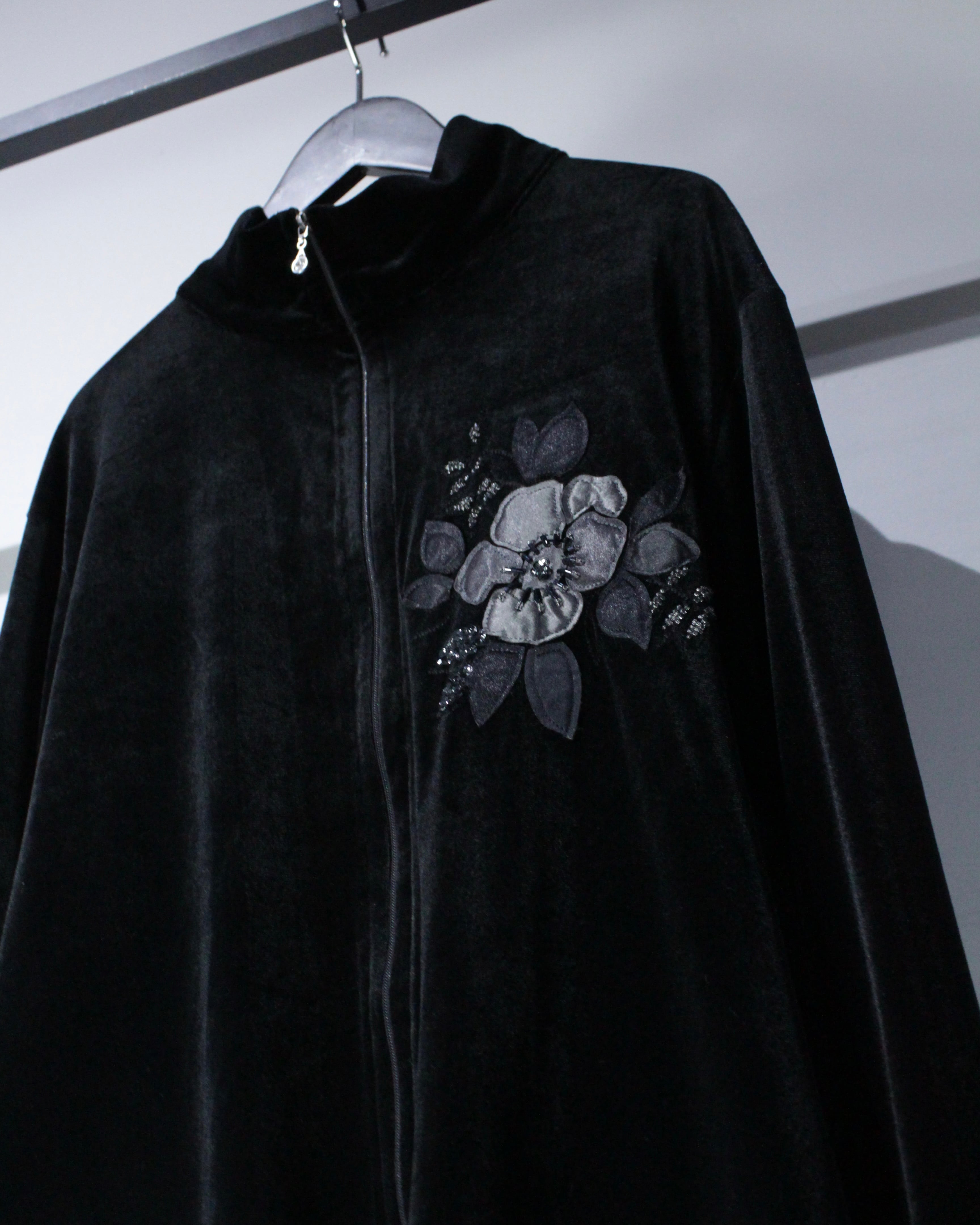 しっとりと落ちるベルベット特有の深い黒に、胸元へあしらわれたフラワーモチーフのパッチが静かにアクセントに。