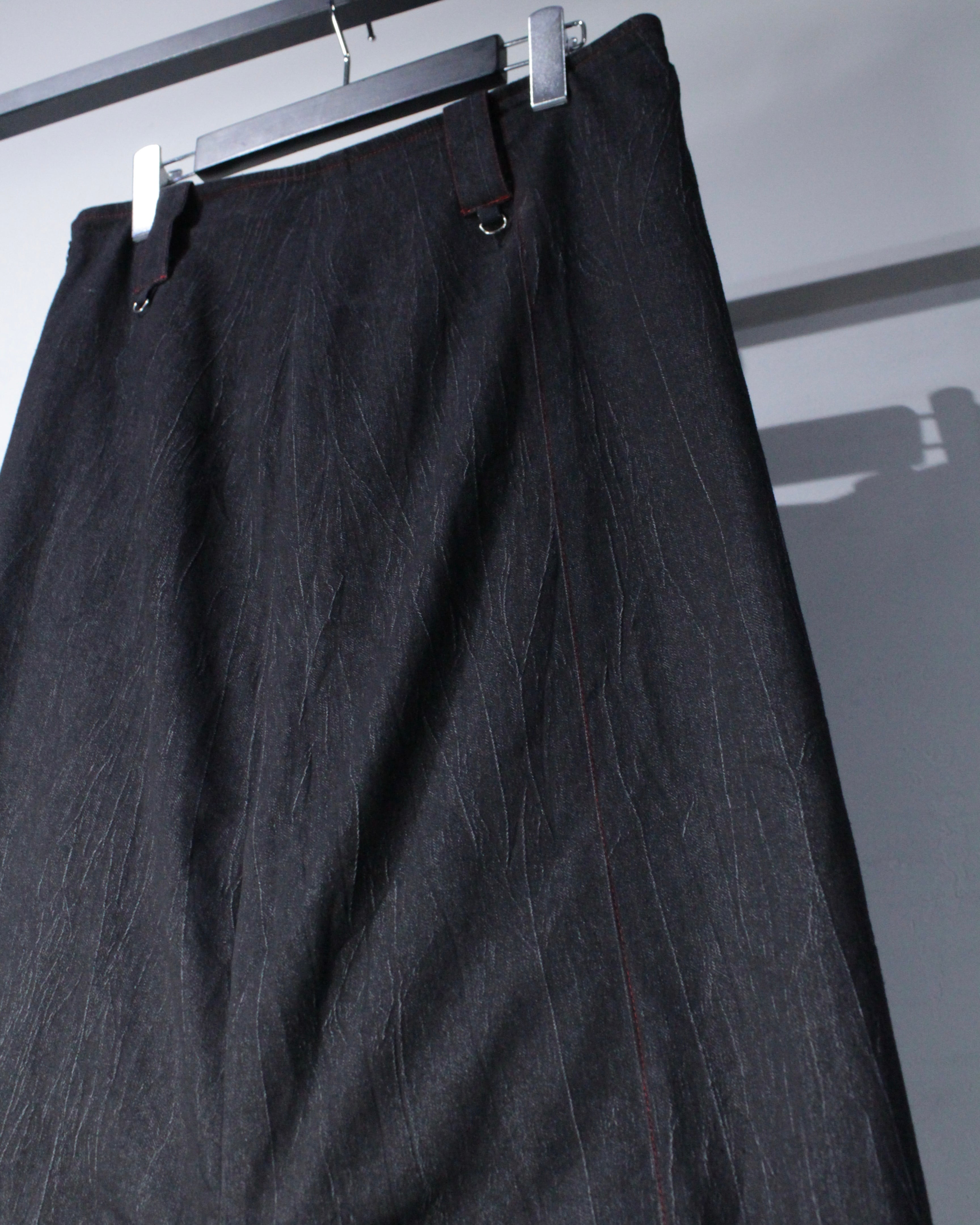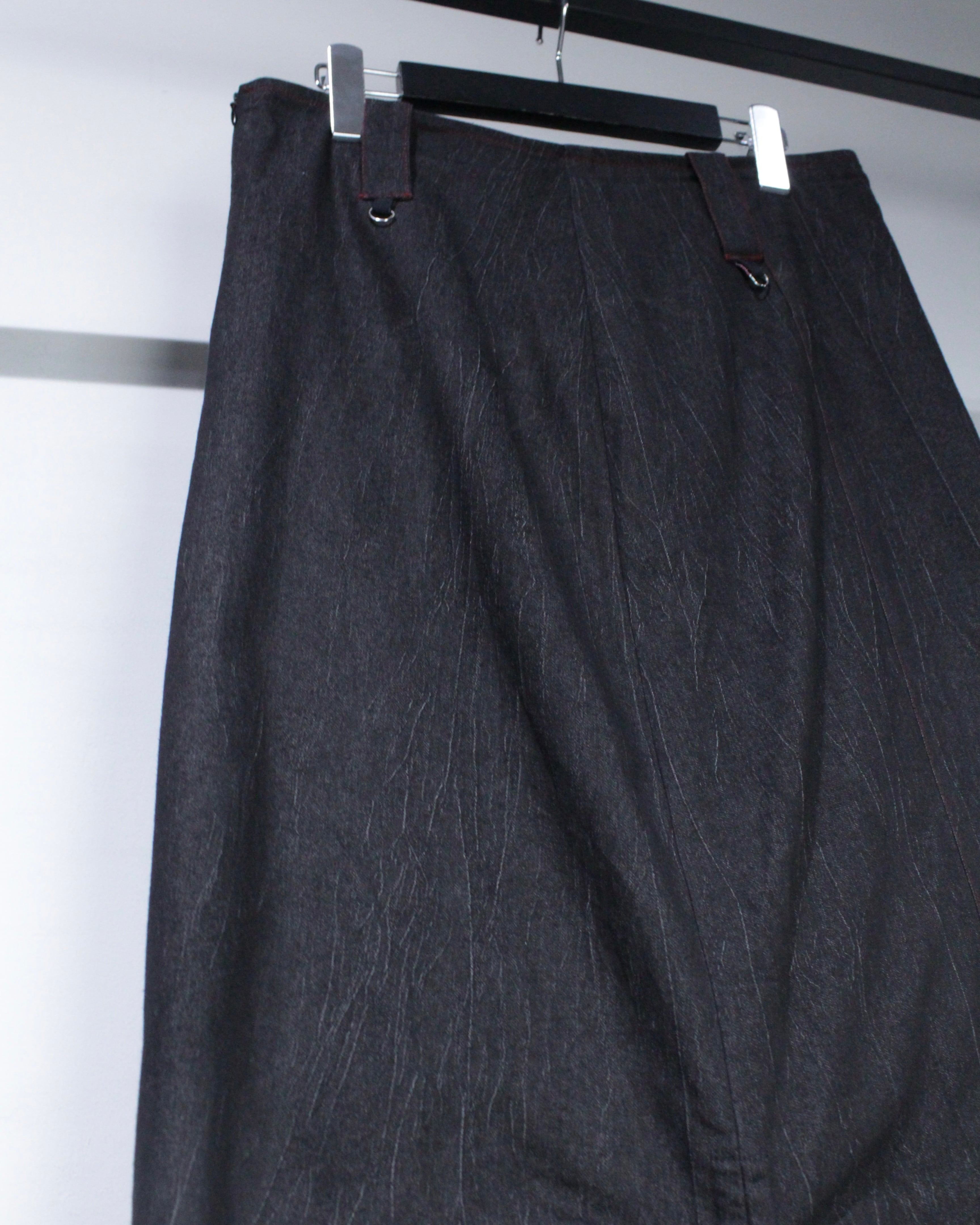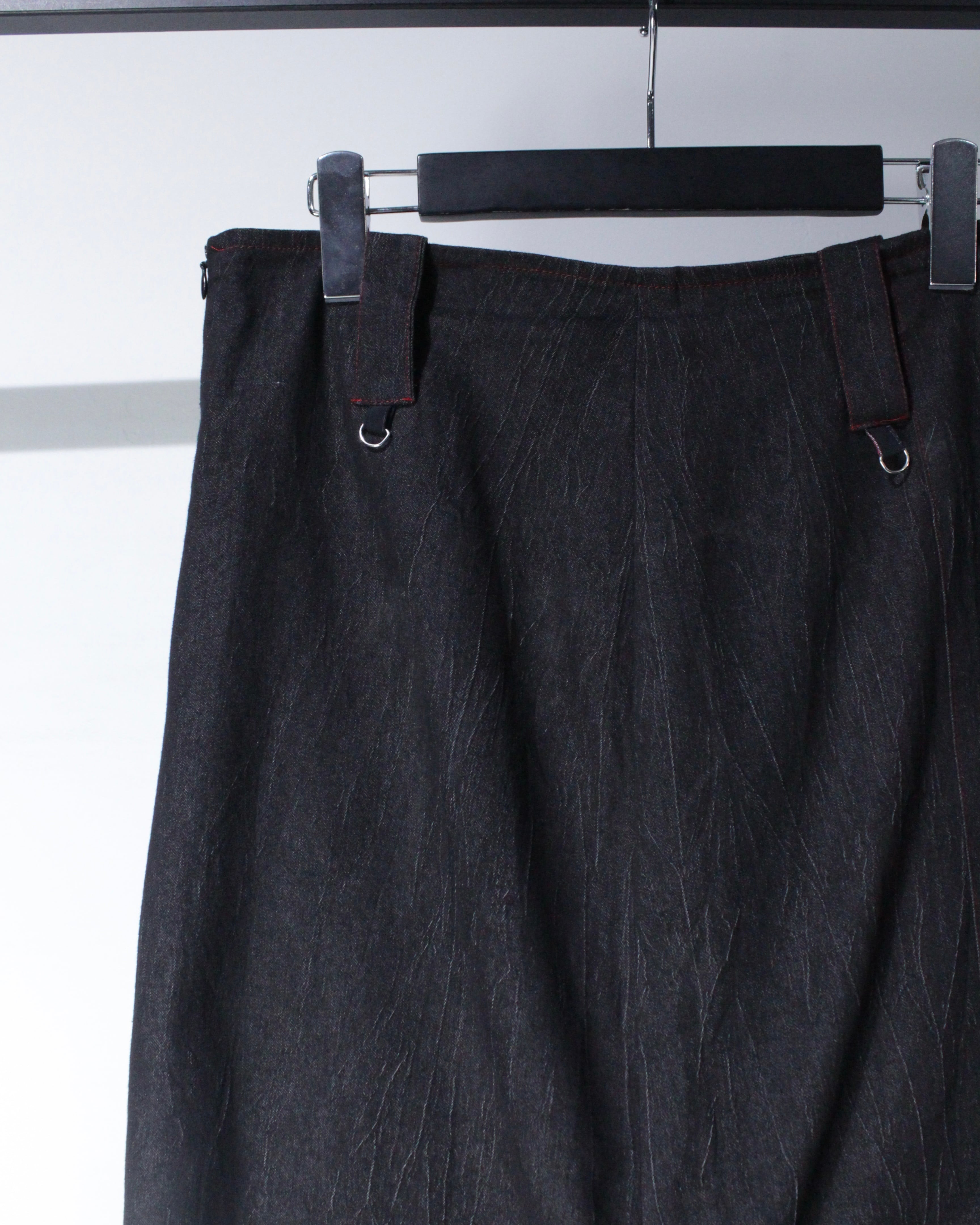 ウエストのDカンやストラップ使いも良いスパイス。トップスはタイトからオーバーまで幅広く受け止めてくれるバランスで、レザージャケットや変形ニットとの合わせがオススメです◎