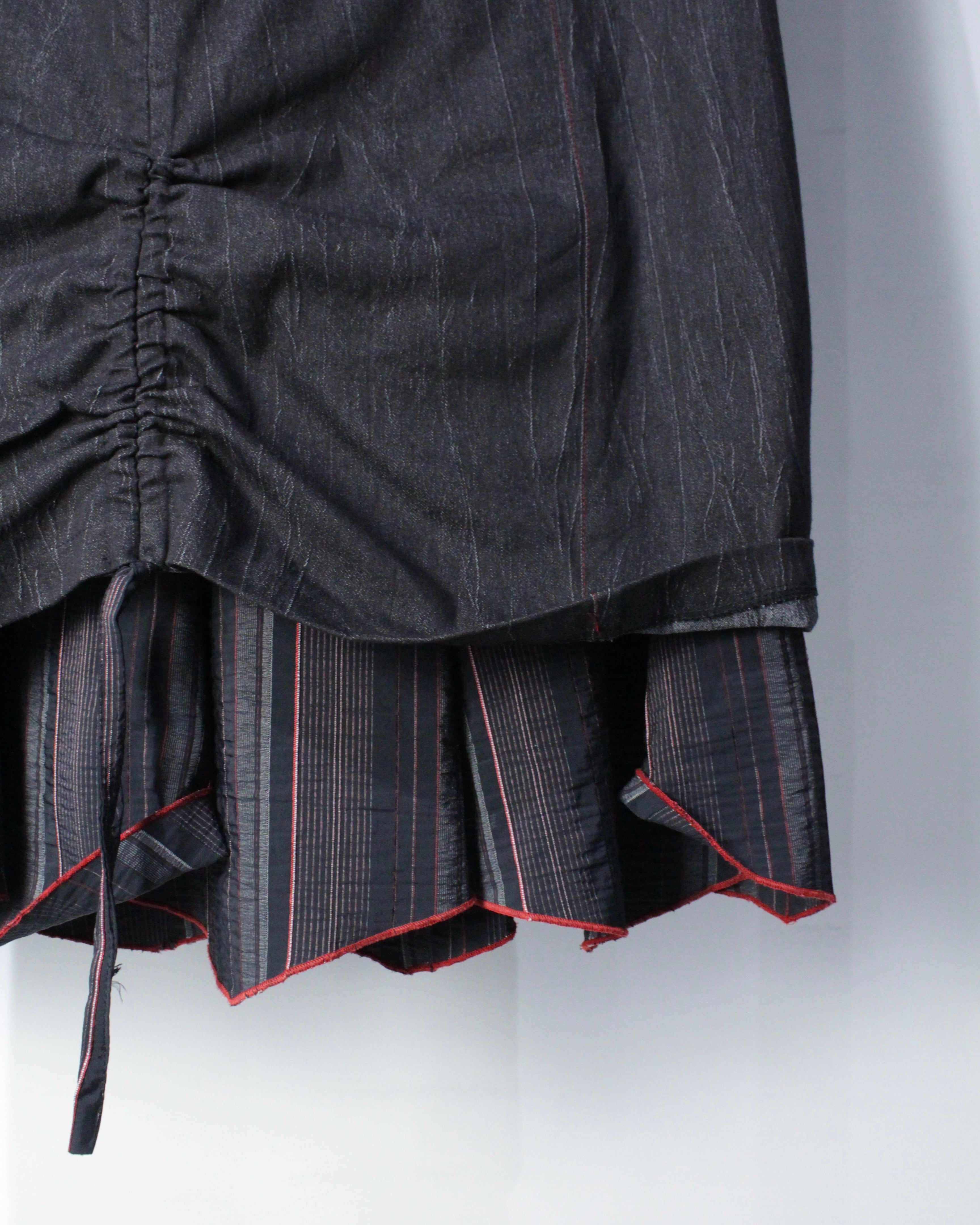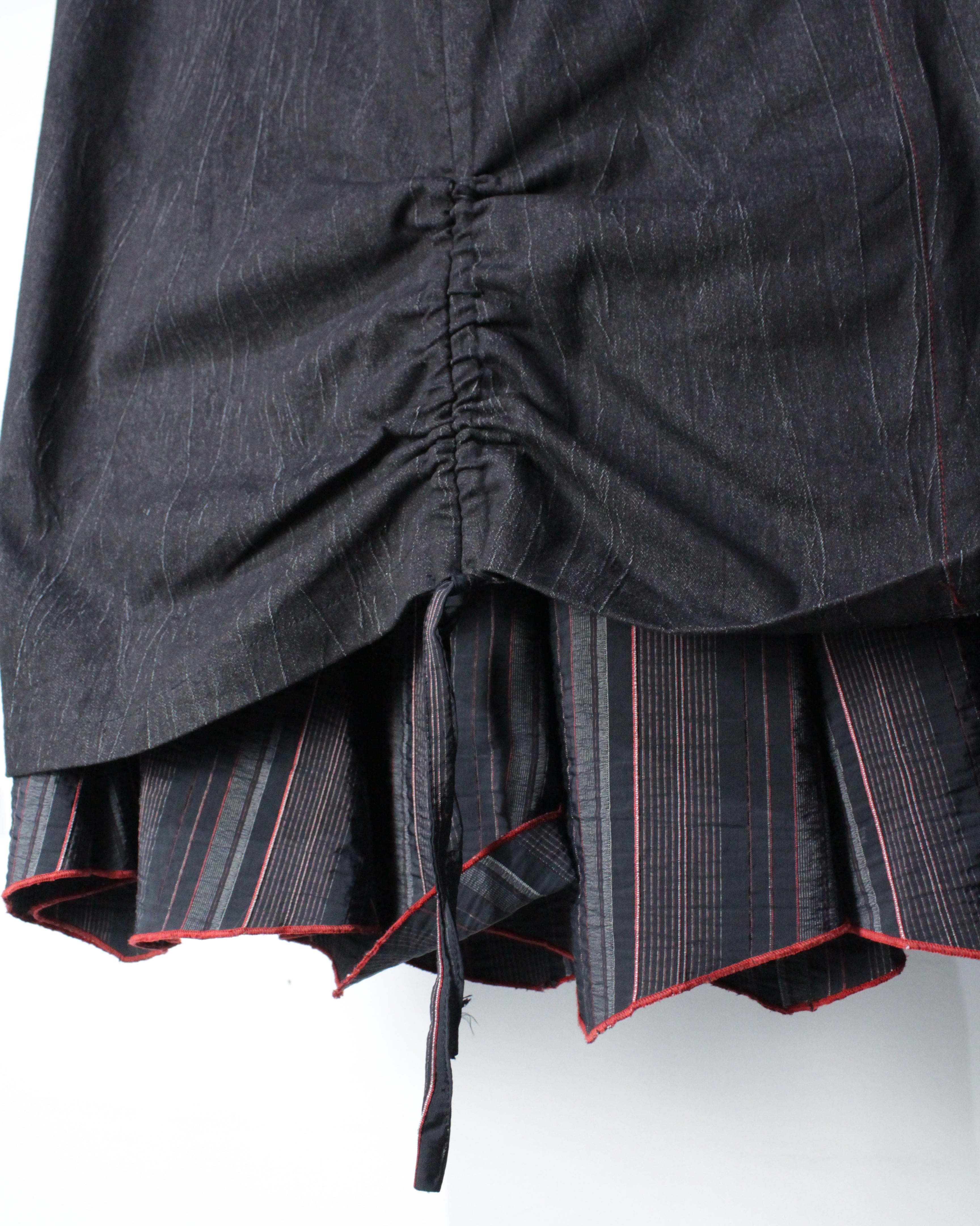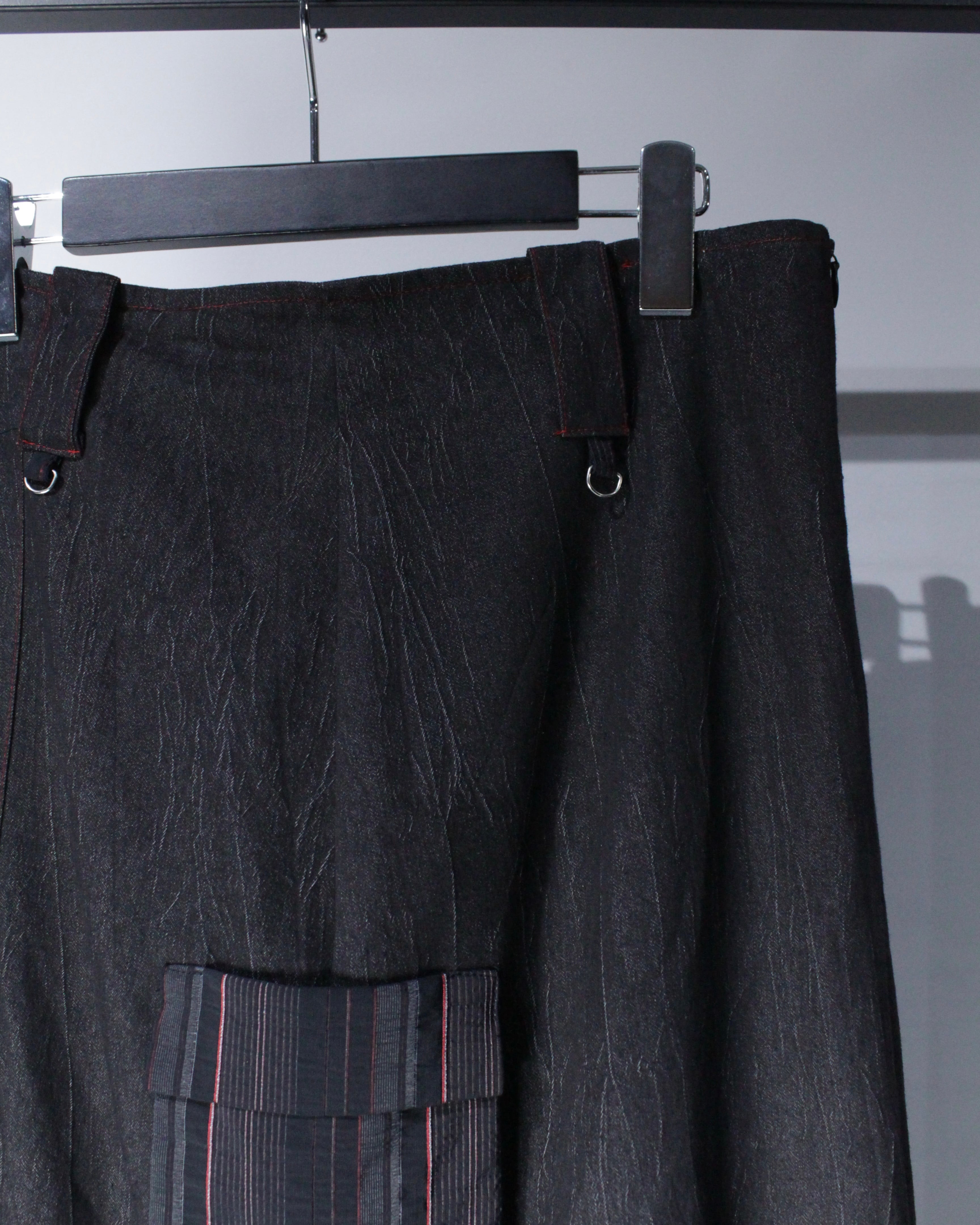 表側はデニム薄手のデニム生地、内側にはストライプ織りが美しいスカートを配し、歩くたびに異素材の表情が揺れ、エッジの効いたルックスに目と心の双方を奪われます。