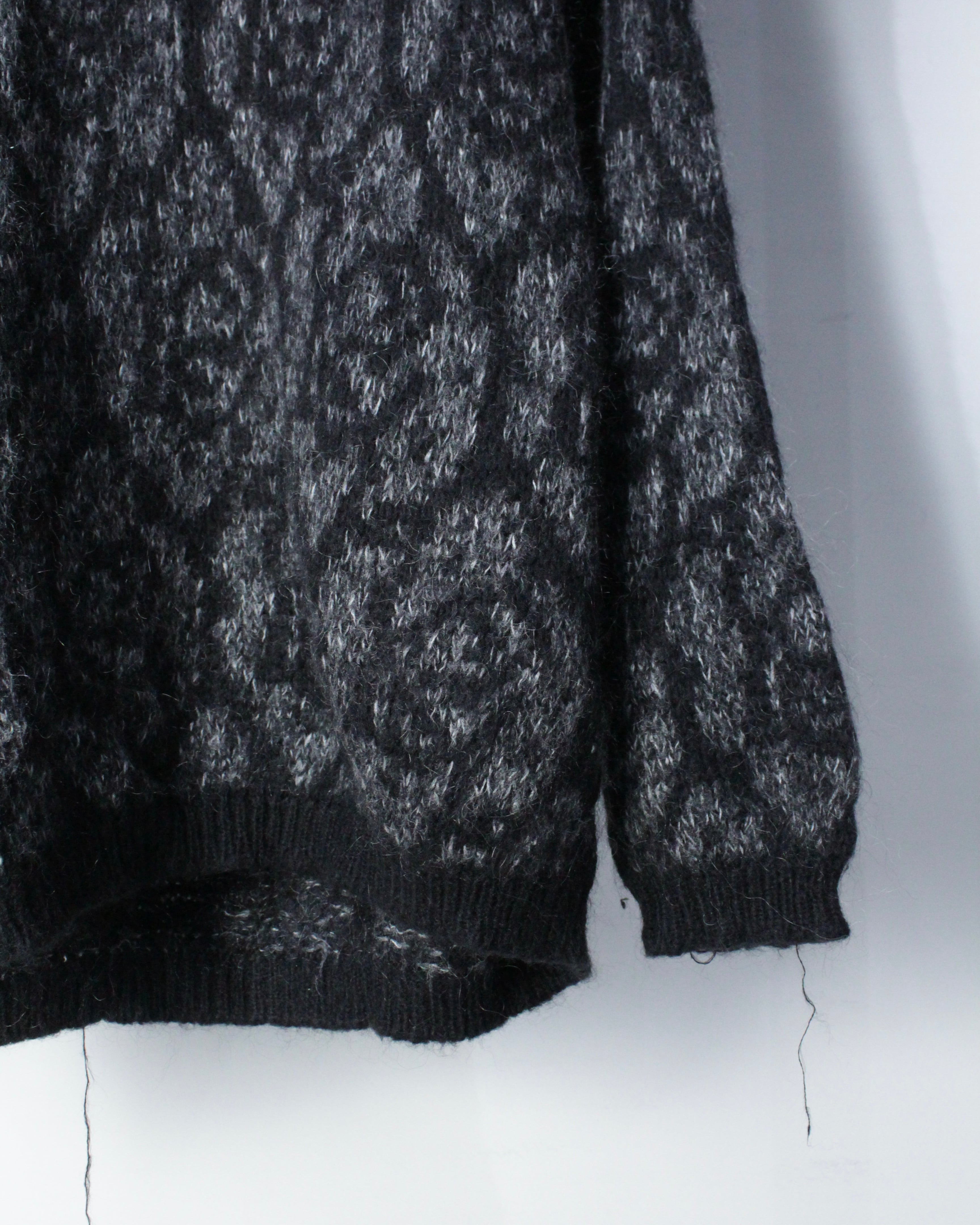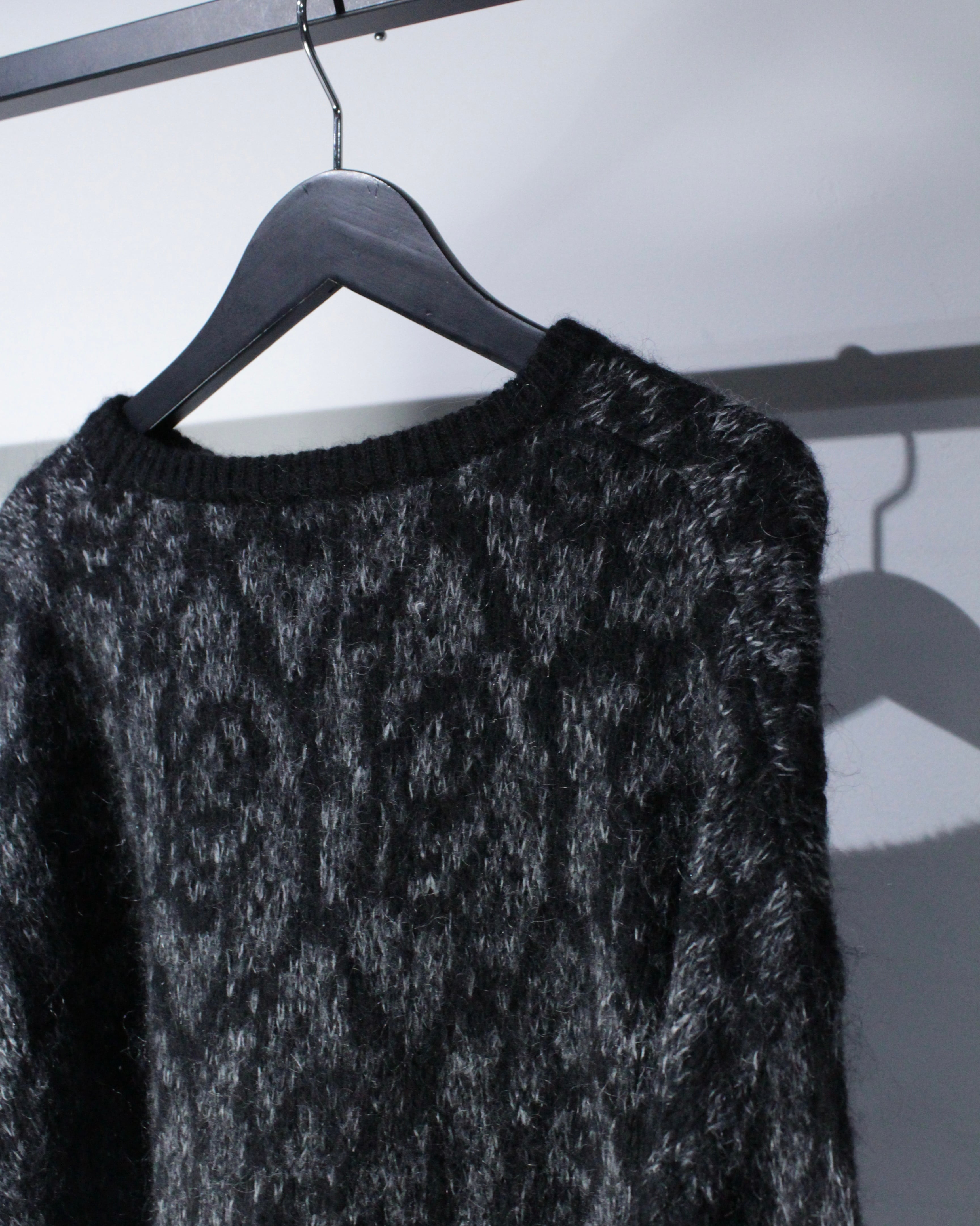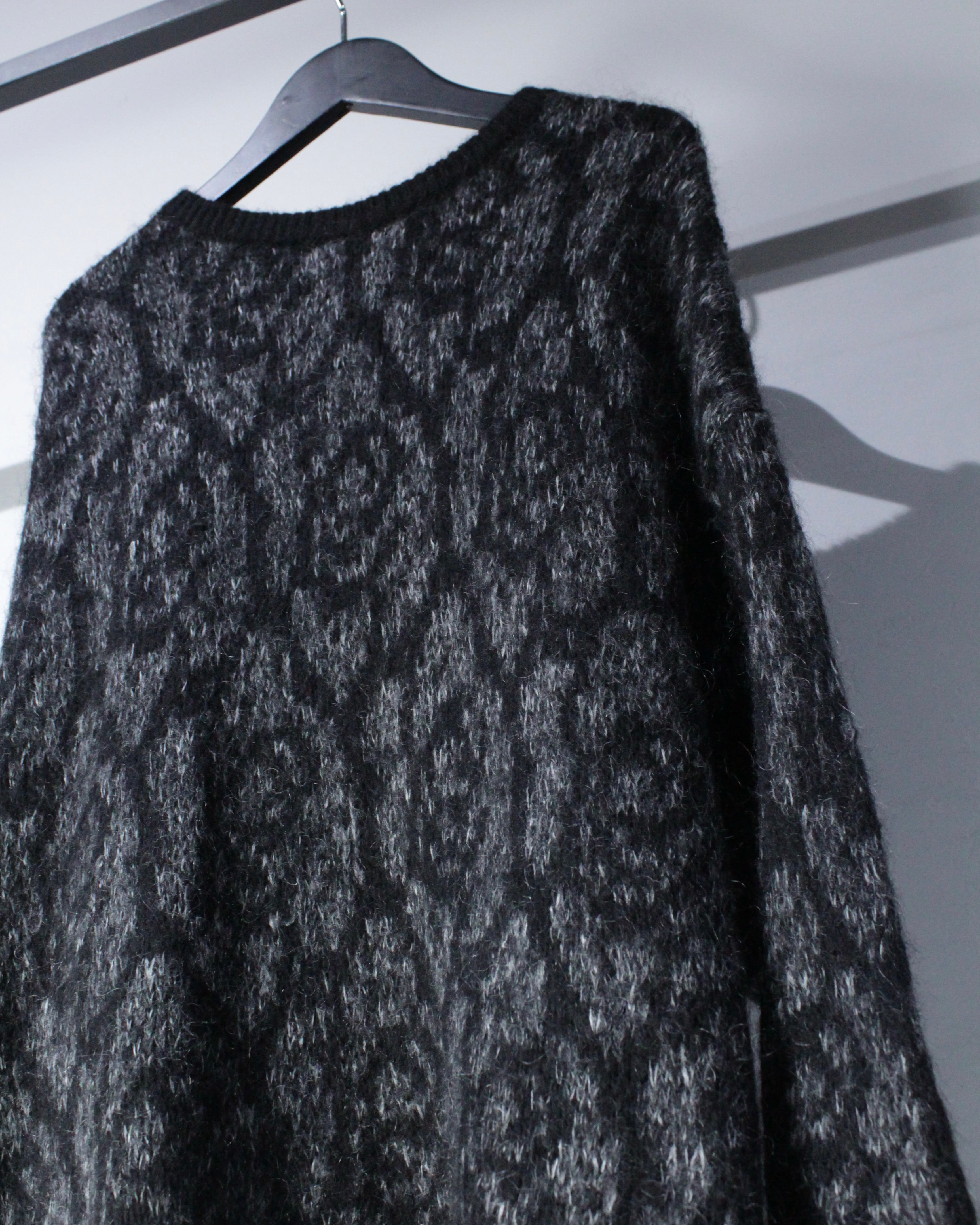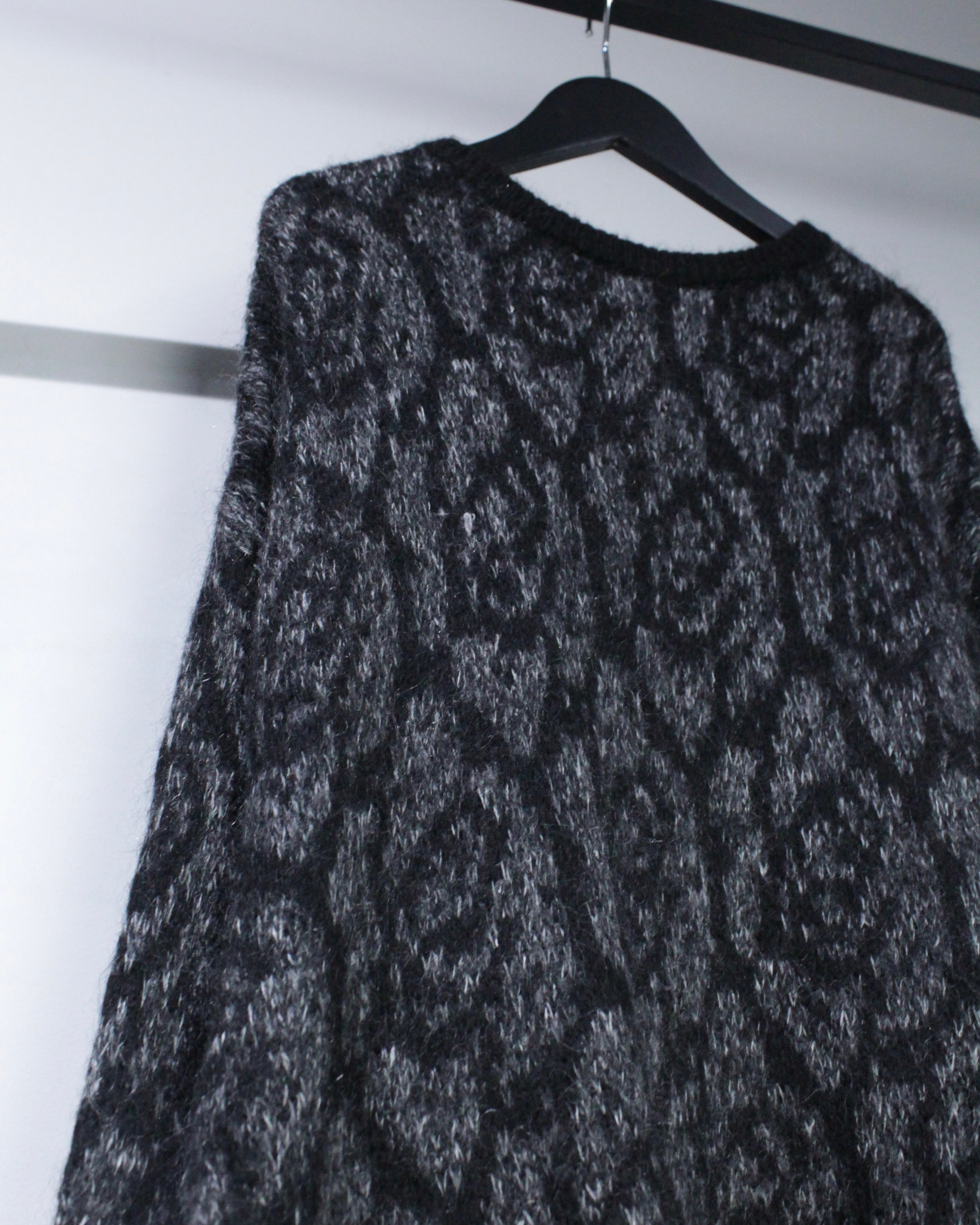 深みのあるチャコールトーンをベースに、うっすらと浮かび上がる花柄風のパターンが印象的なヴィンテージモヘアニット。
