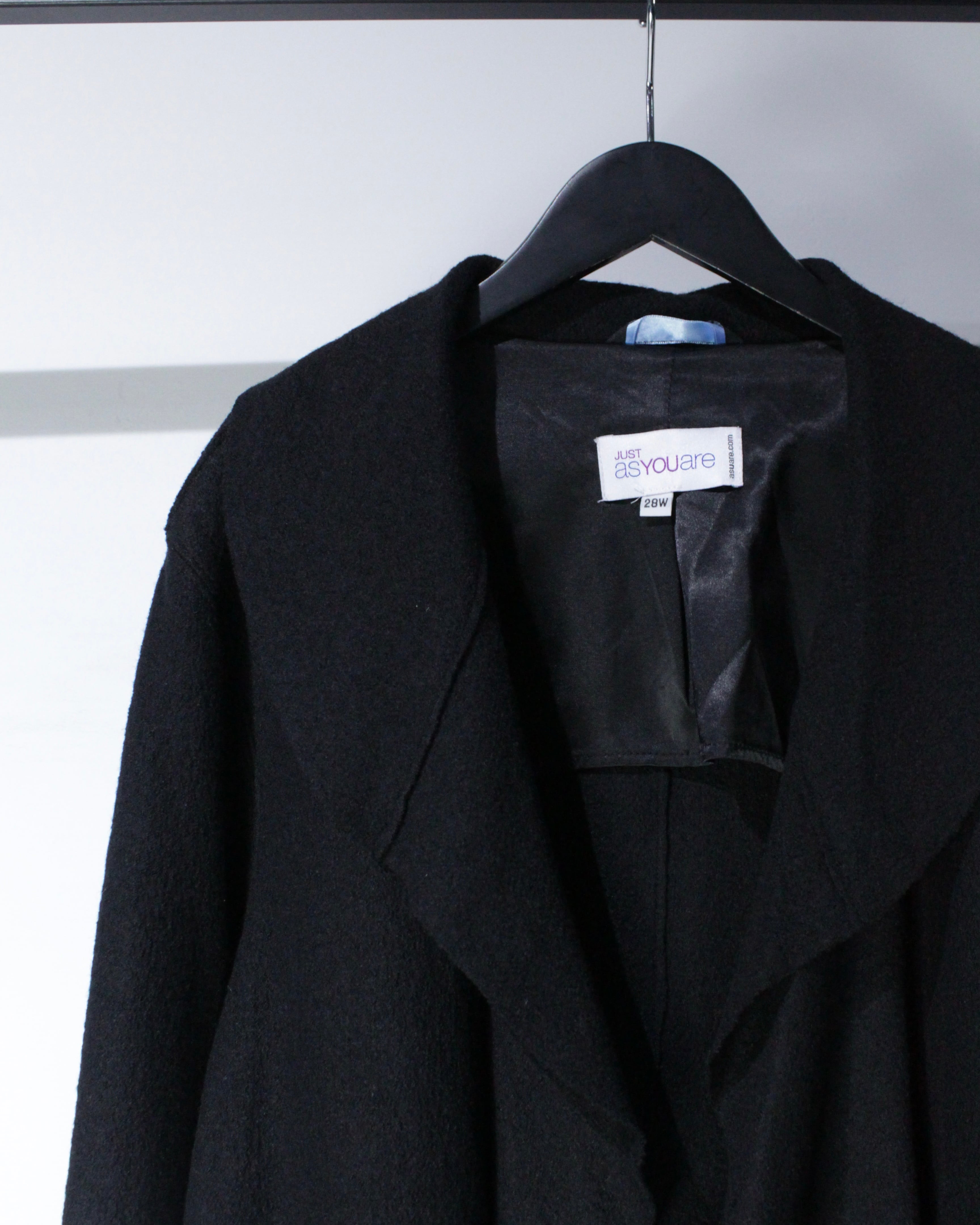 深めに落ちるカラーが美しく、フロントは自然なドレープを描きながら縦のラインを強調。オールブラックの中に豊かな表情をもたらしています。