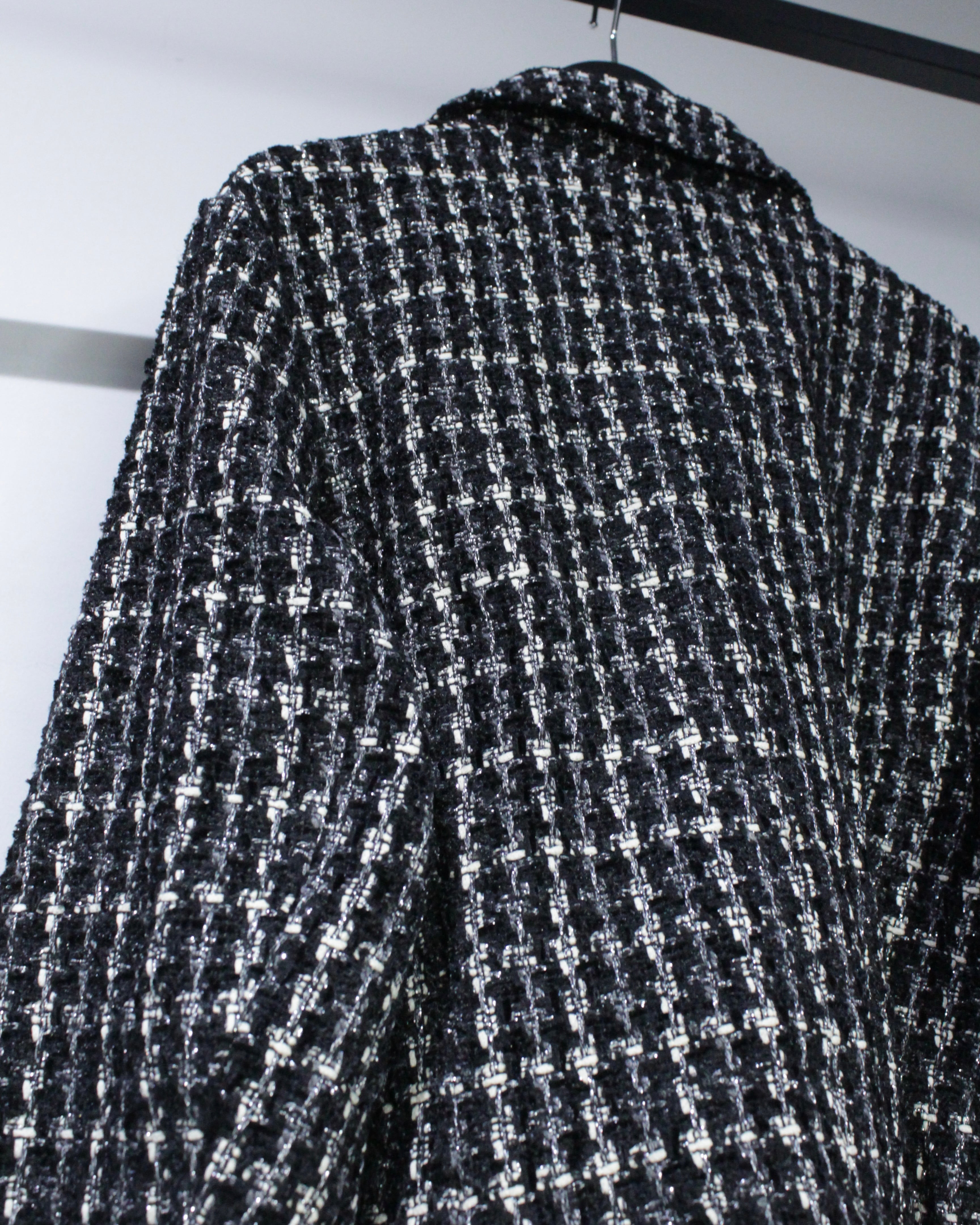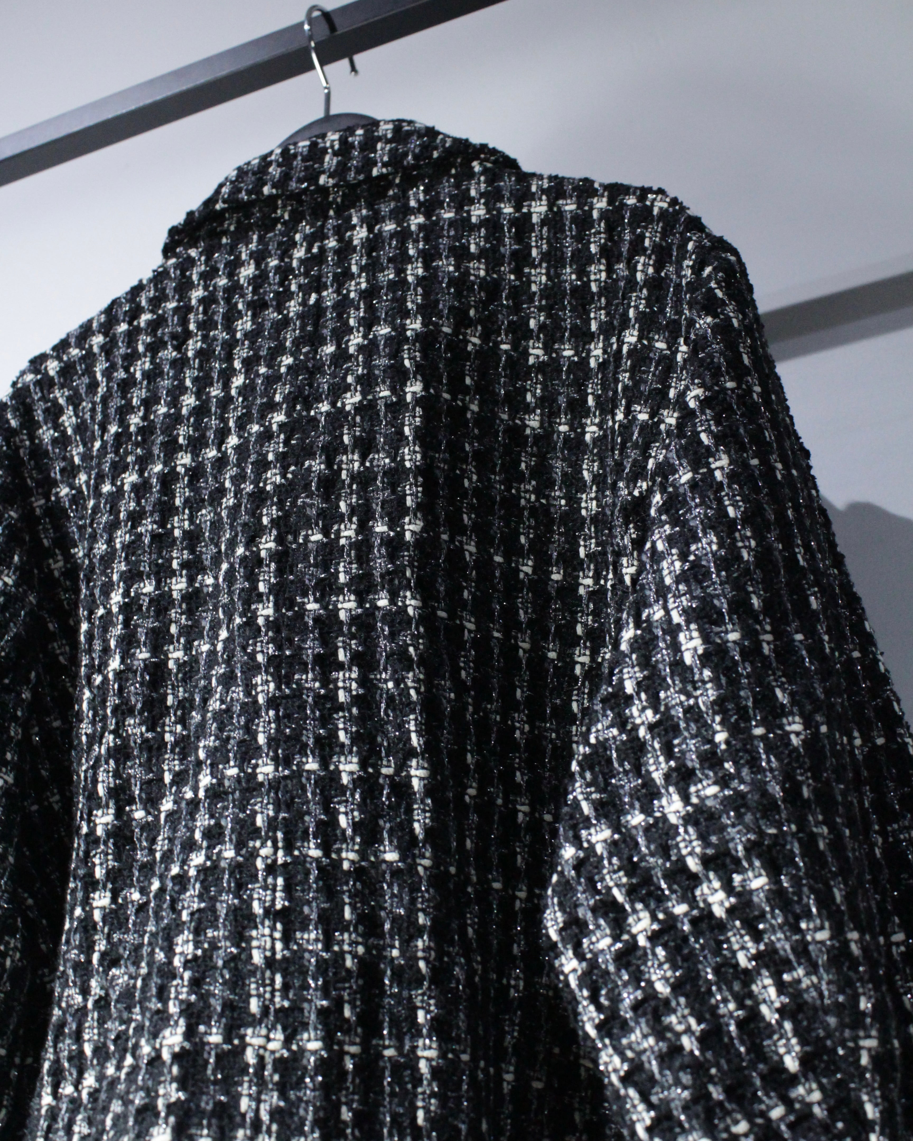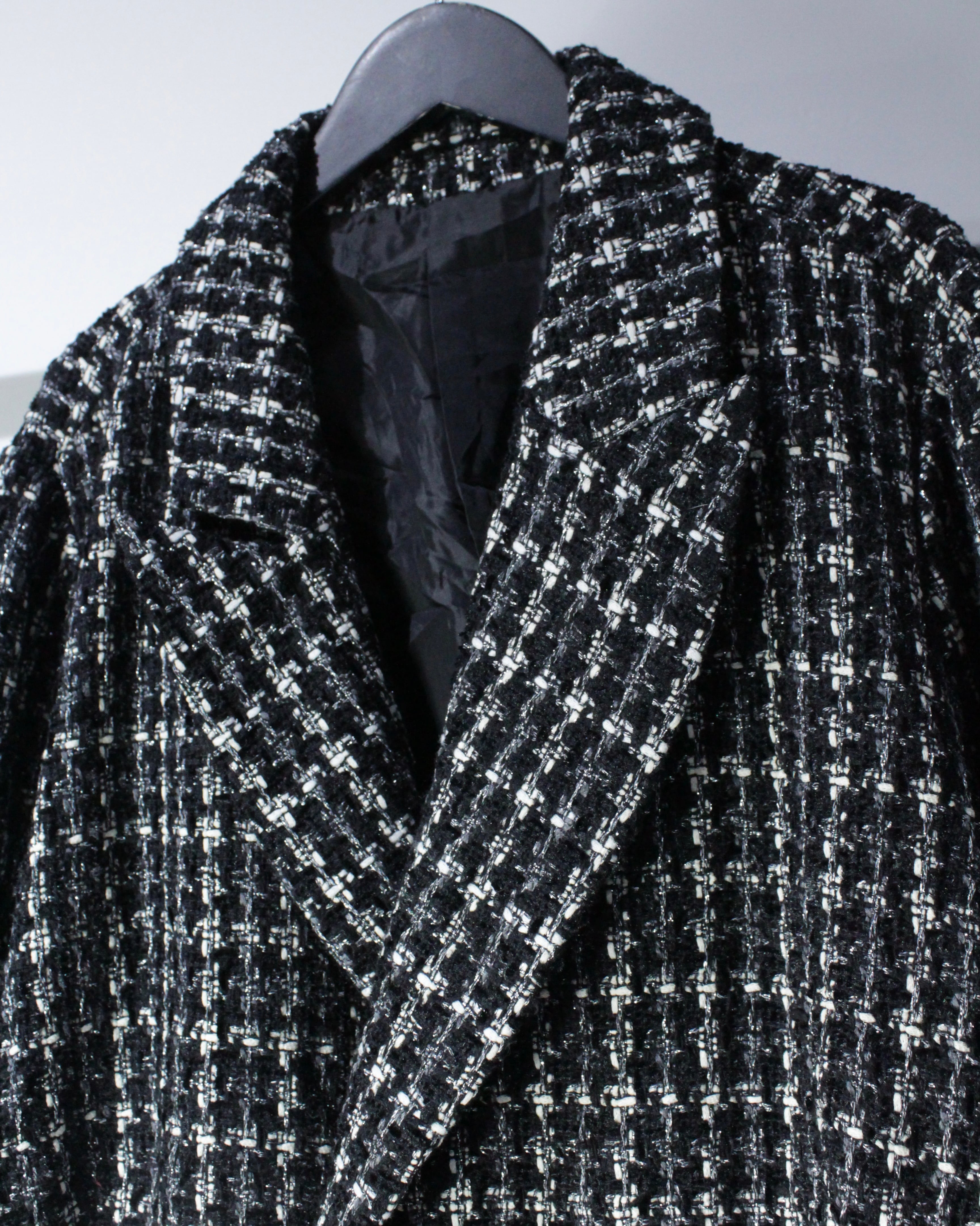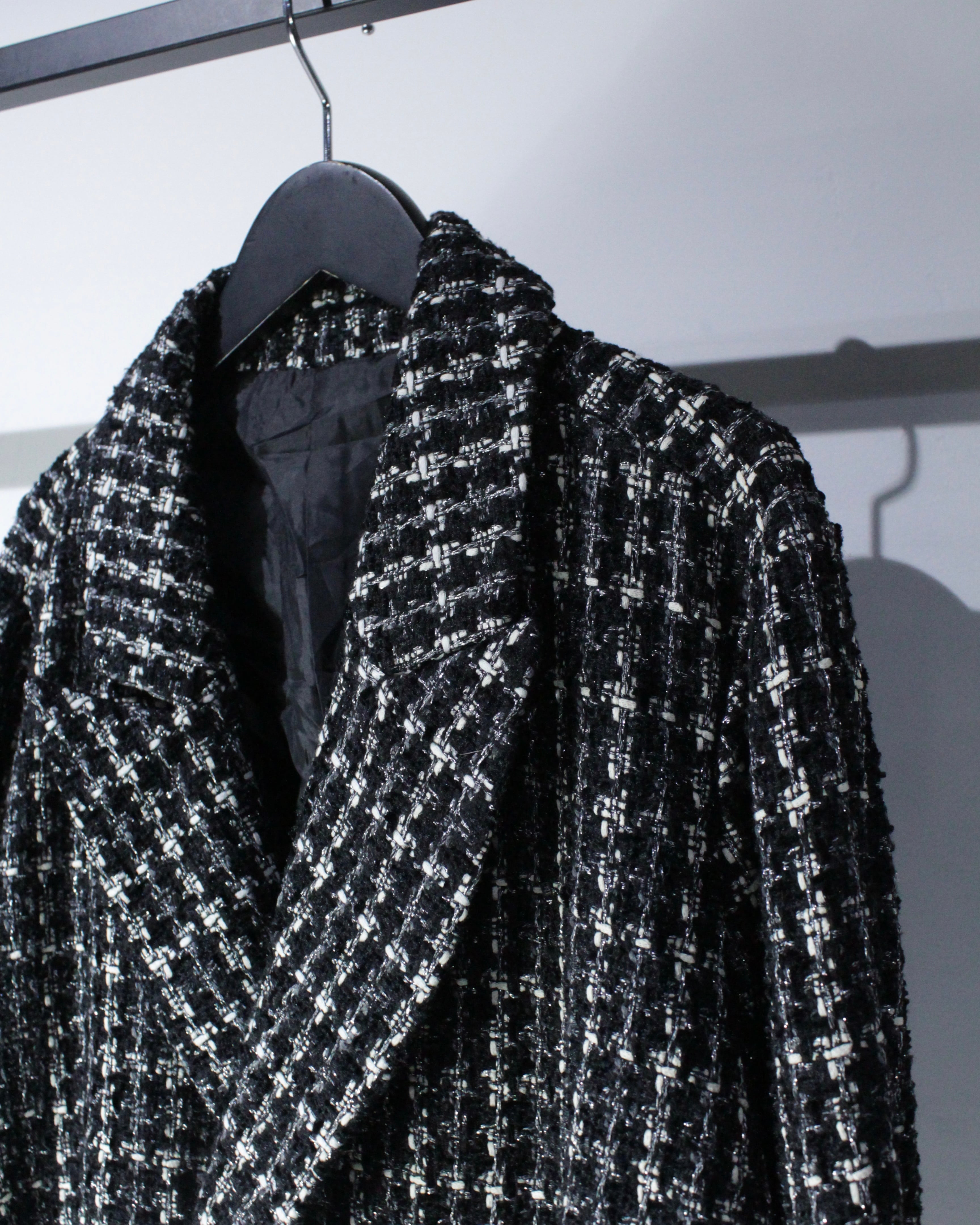 クラシックなツイード織りをベースに、ブラックトーンでまとめた重厚な表情。太めの糸をミックスした編み地は立体感があり、光の当たり方でさりげなく光を拾う深みのあるテクスチャーに仕上がっています。