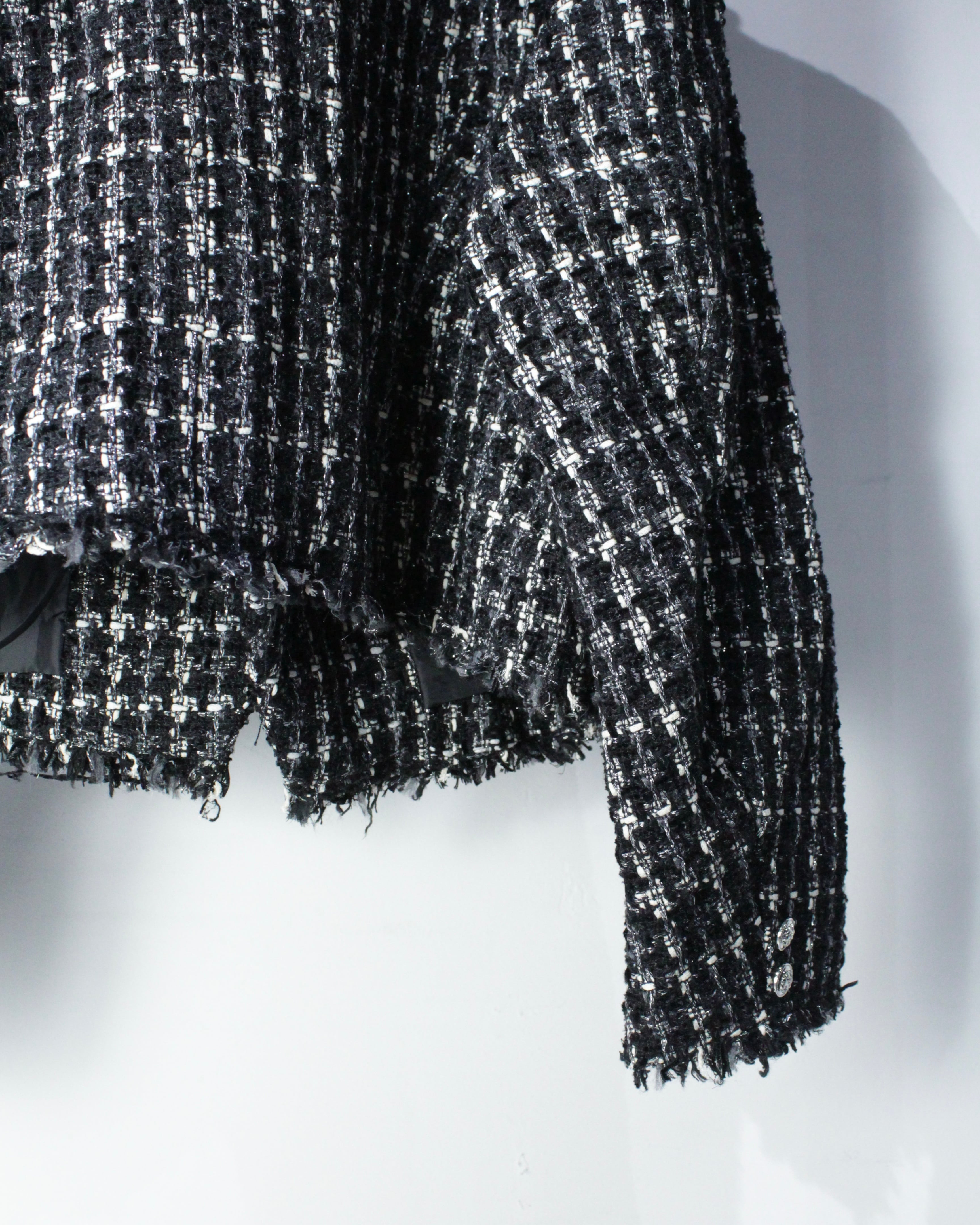様々な異なる要素が一つに合わさった、稀有な短丈ツイードテーラードジャケットです。