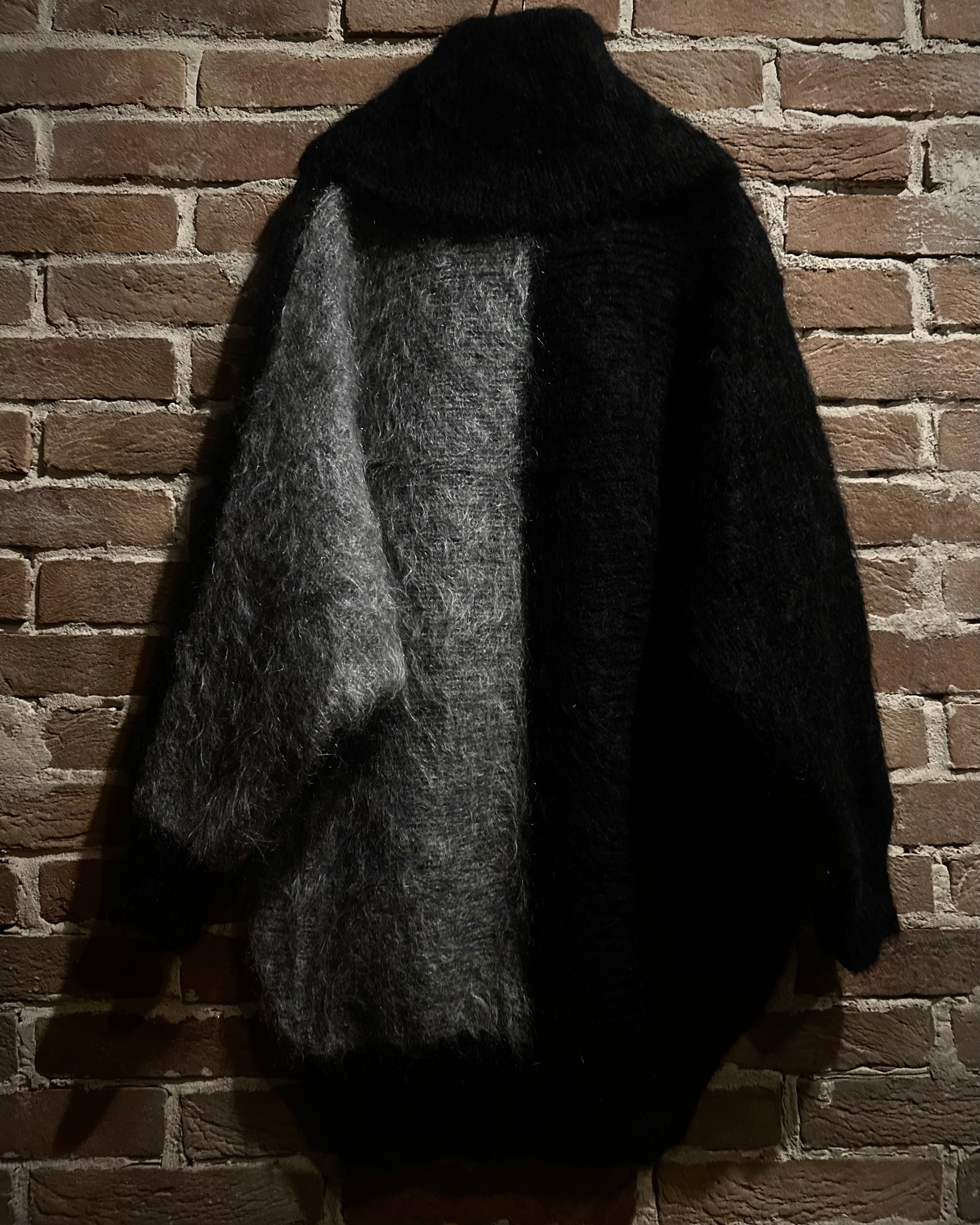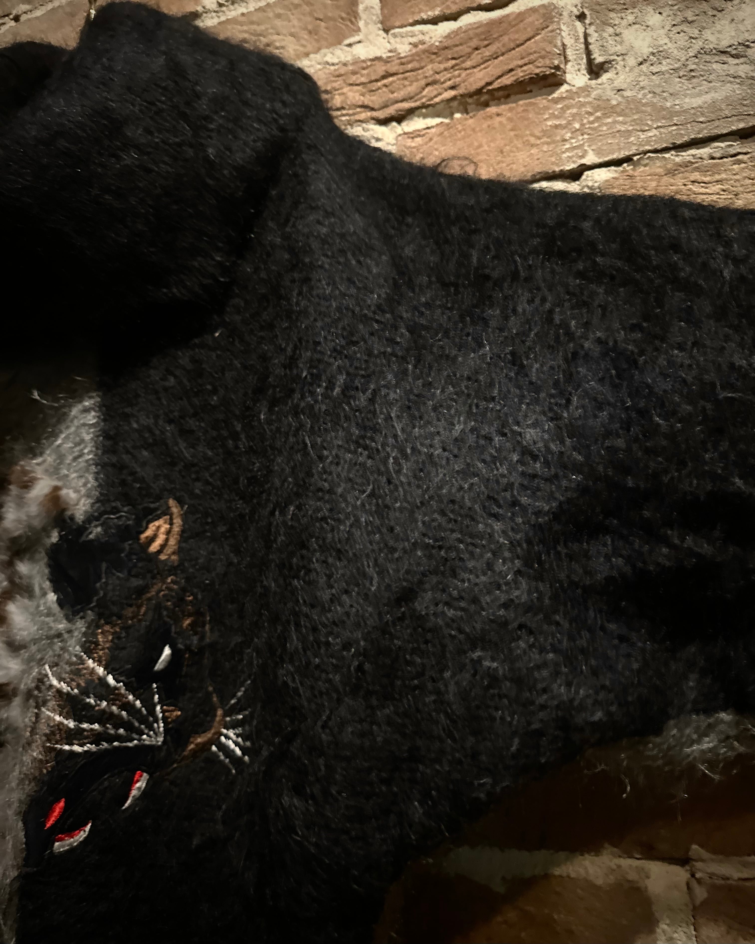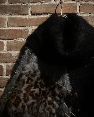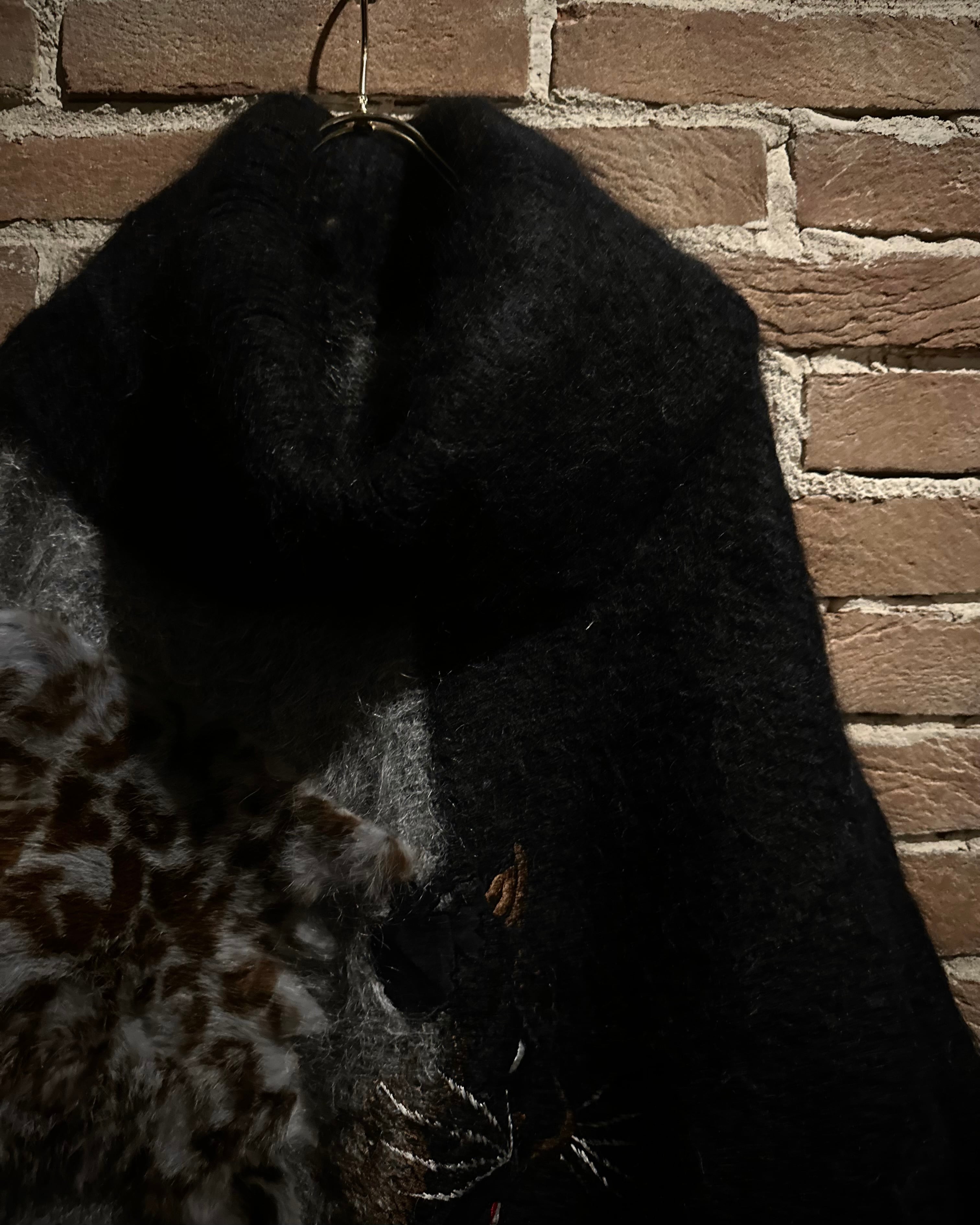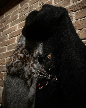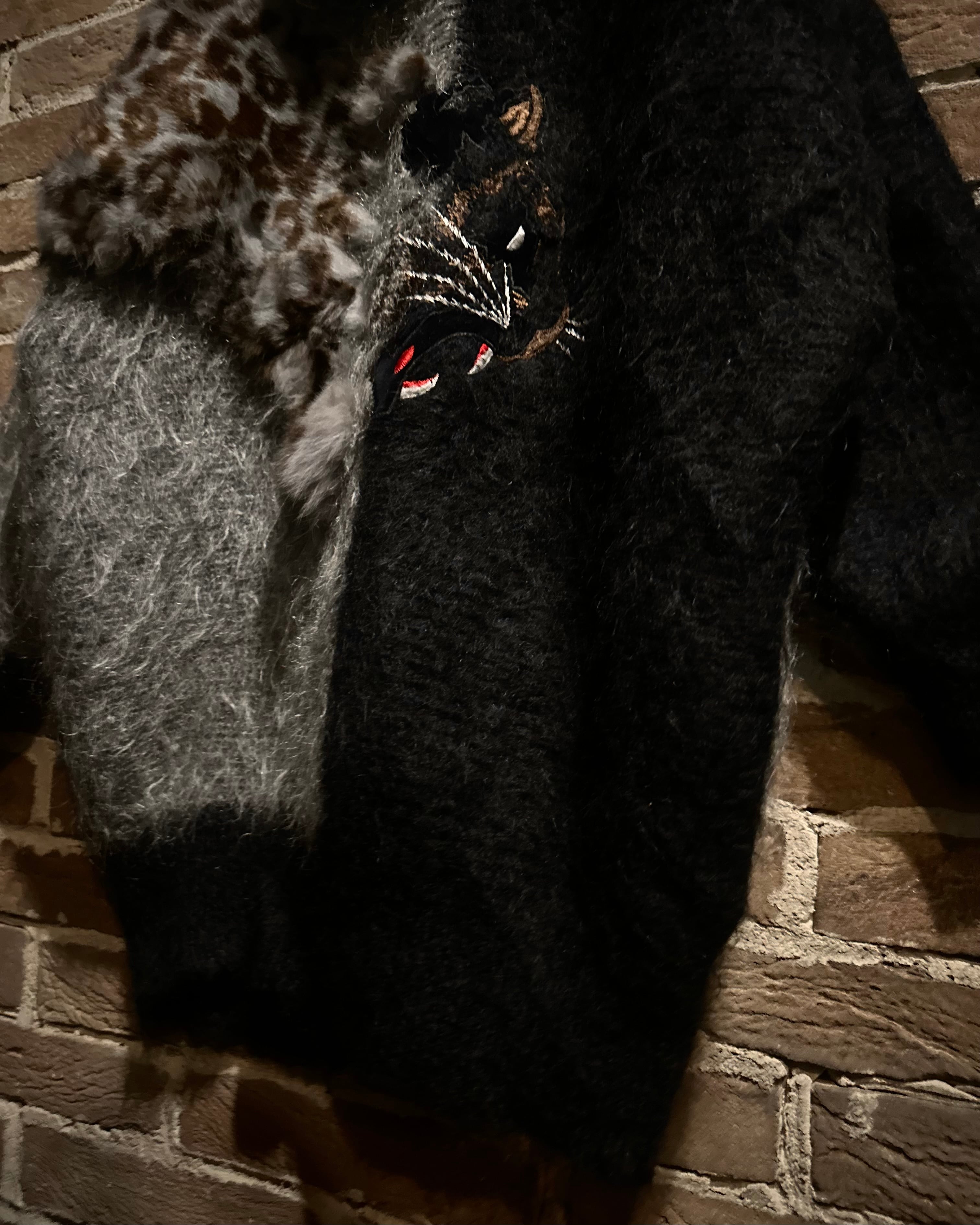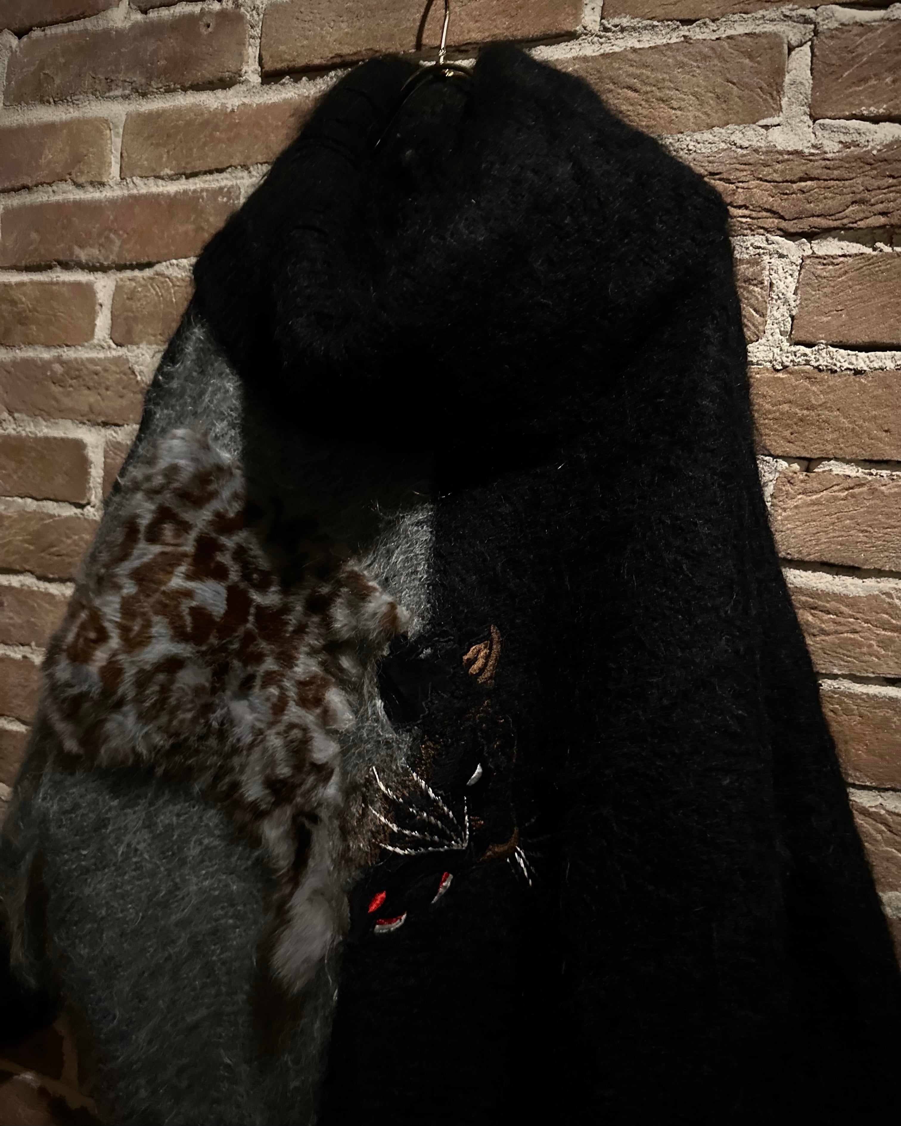 黒×グレーを切り替えたボディにレオパード柄のファーを立体的に配置し、刺繍で表現されたヒョウの顔がインパクト抜群で、モヘアの雰囲気と相まって存在感を漂わせています。