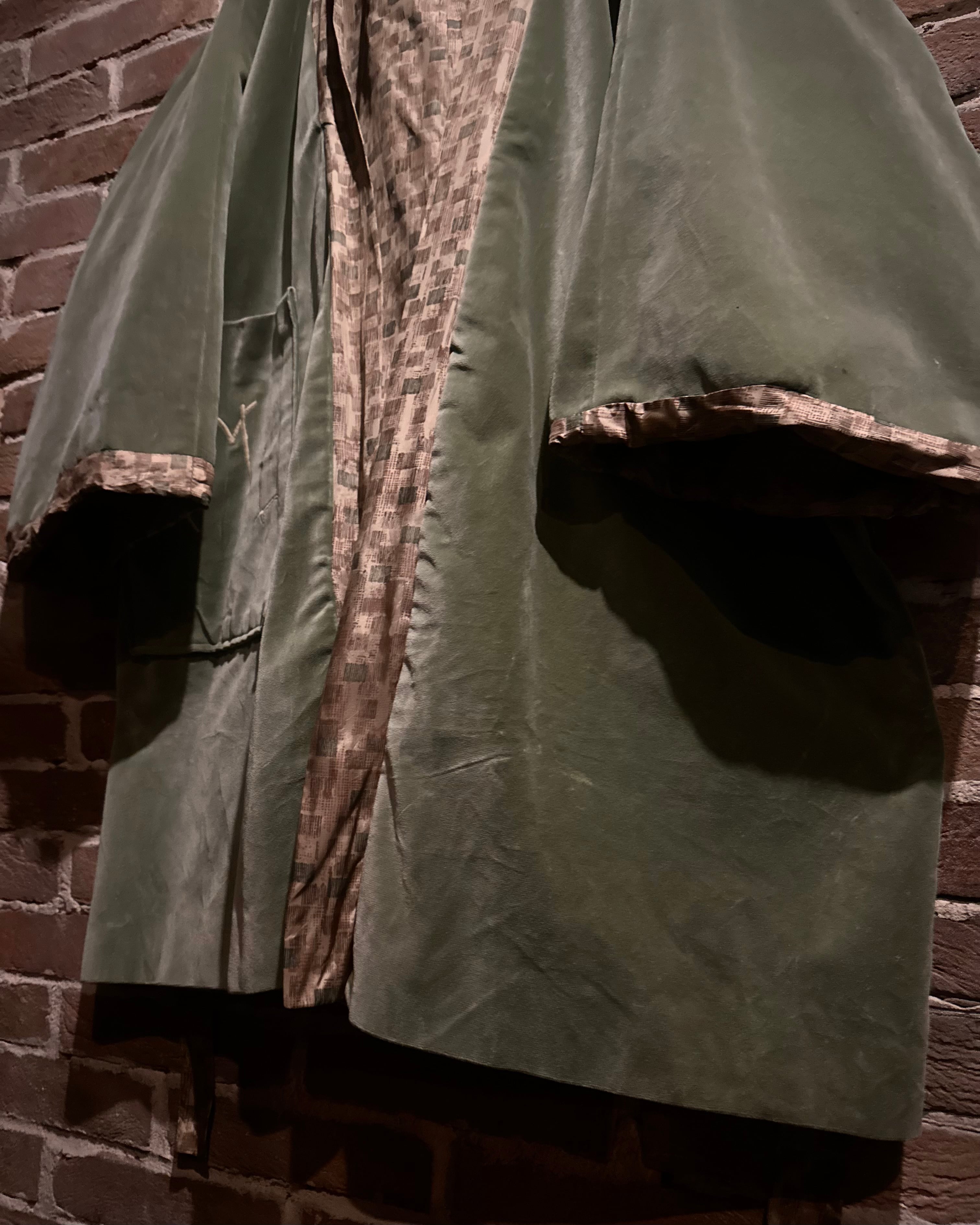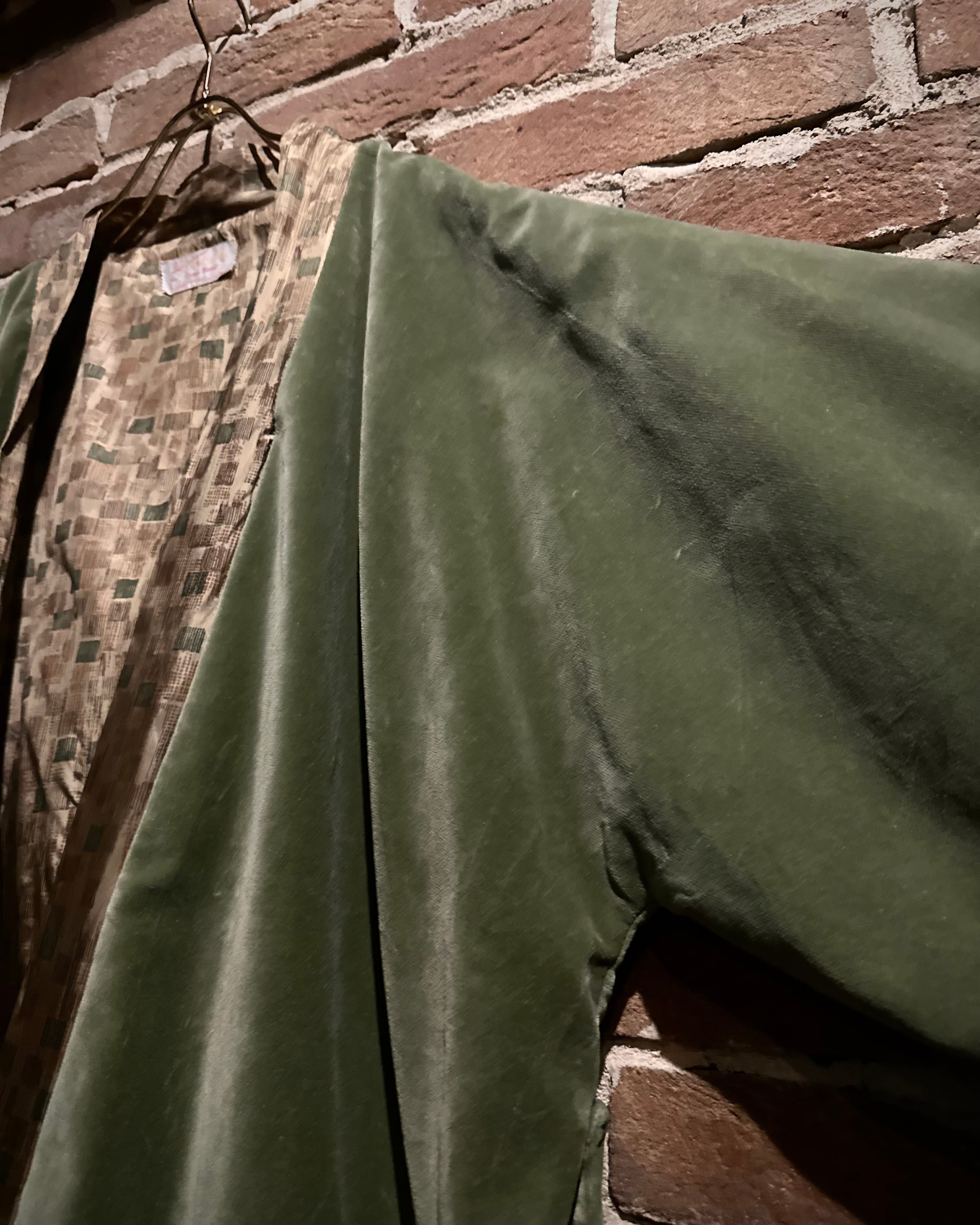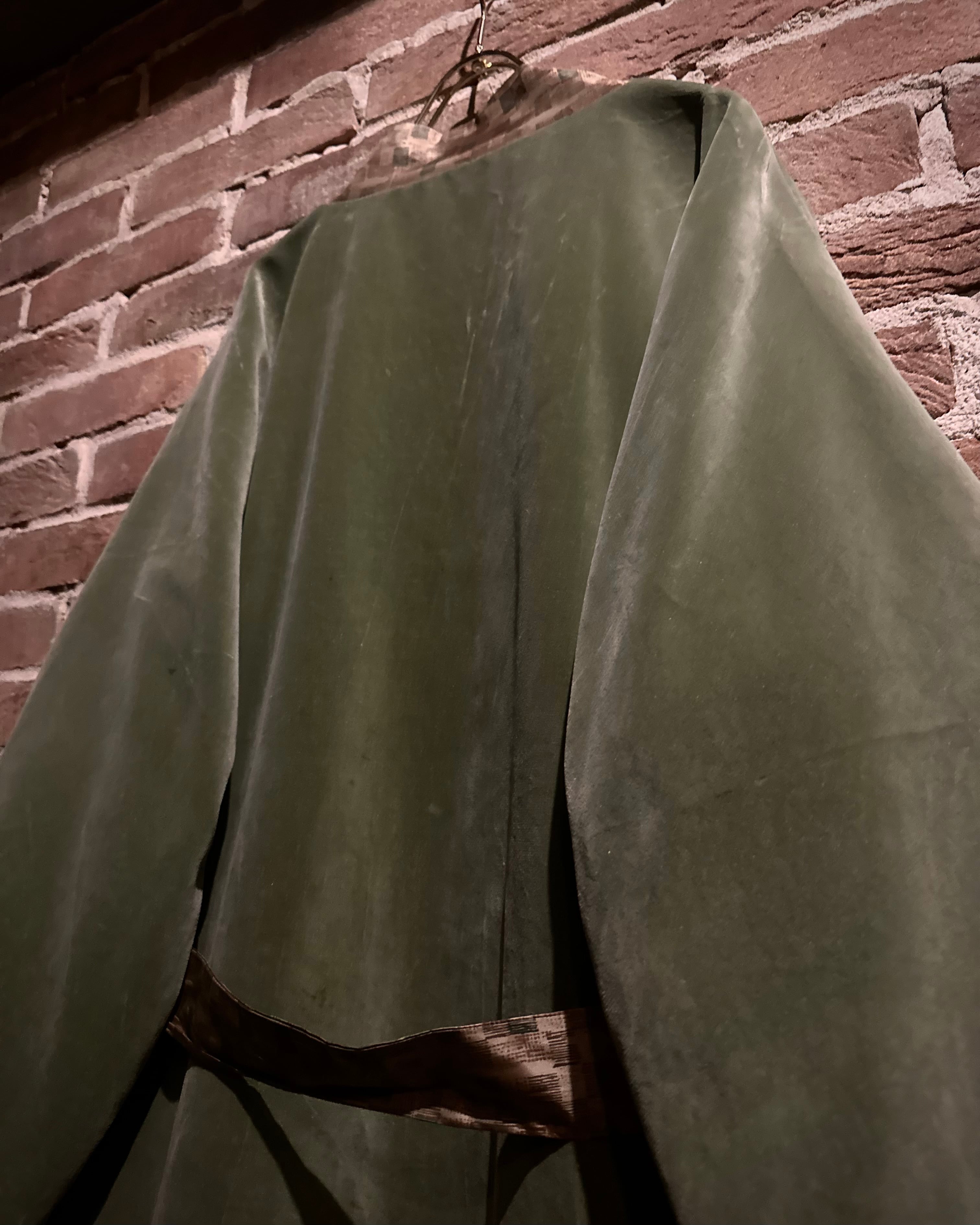 深く沈むようなオリーブトーンのベルベットが、光に触れる角度で静かに艶を放つヴィンテージのガウンコート。