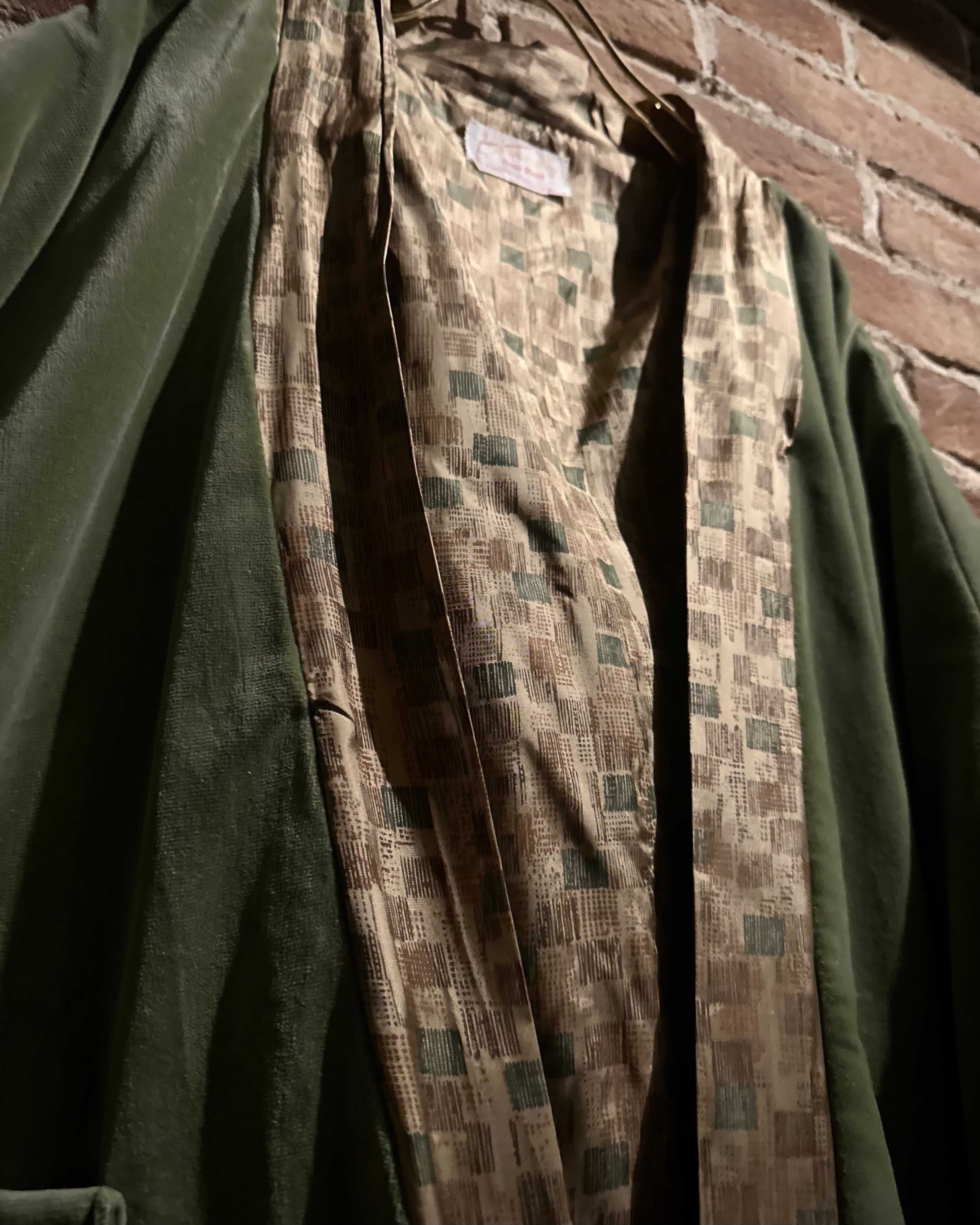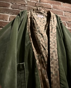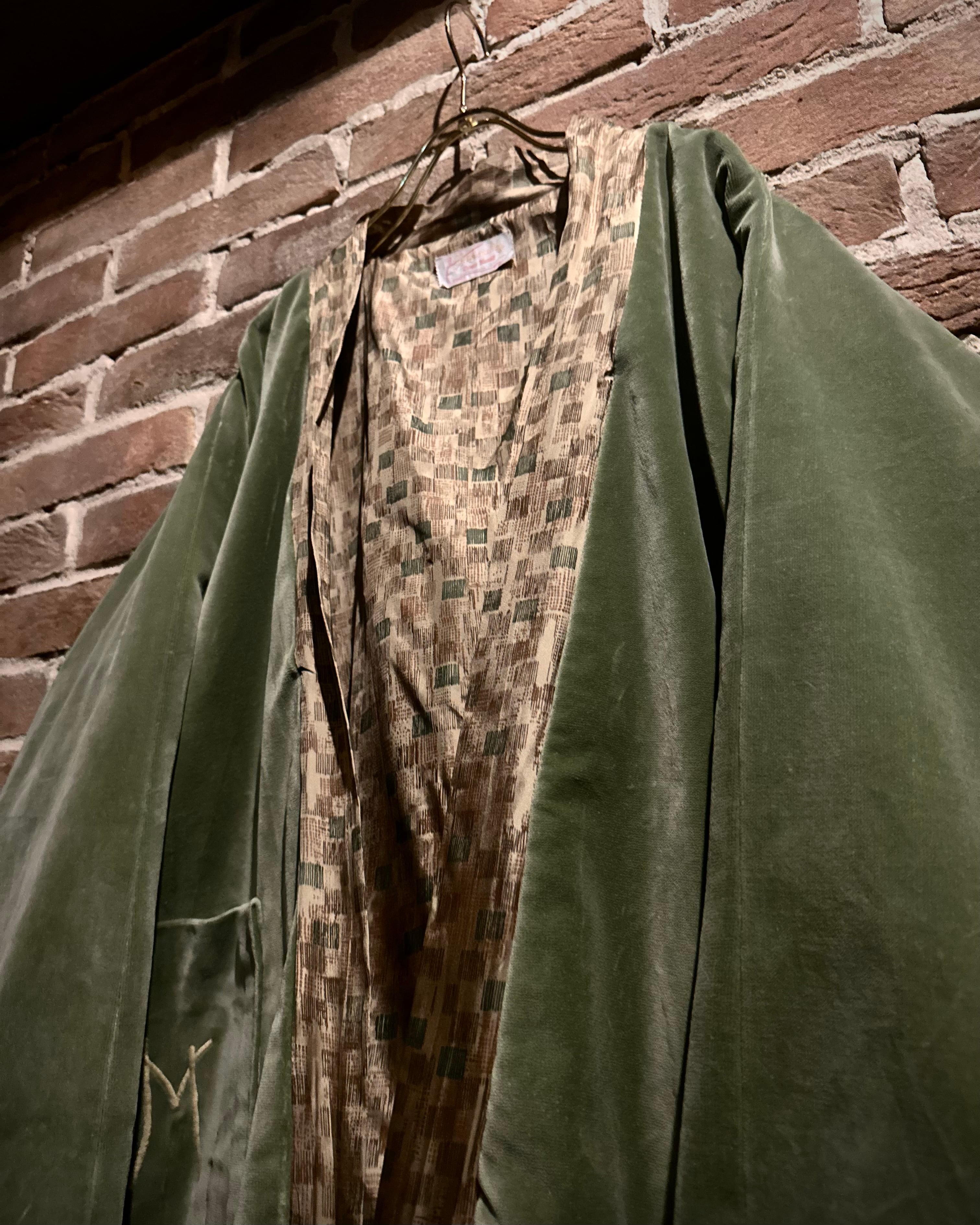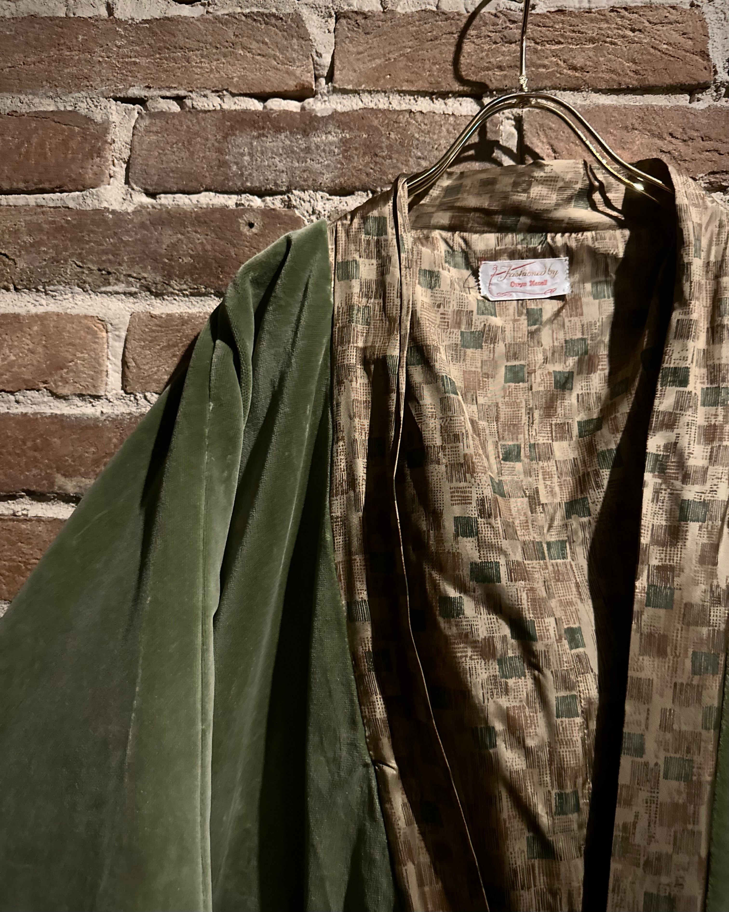 深く沈むようなオリーブトーンのベルベットが、光に触れる角度で静かに艶を放つヴィンテージのガウンコート。