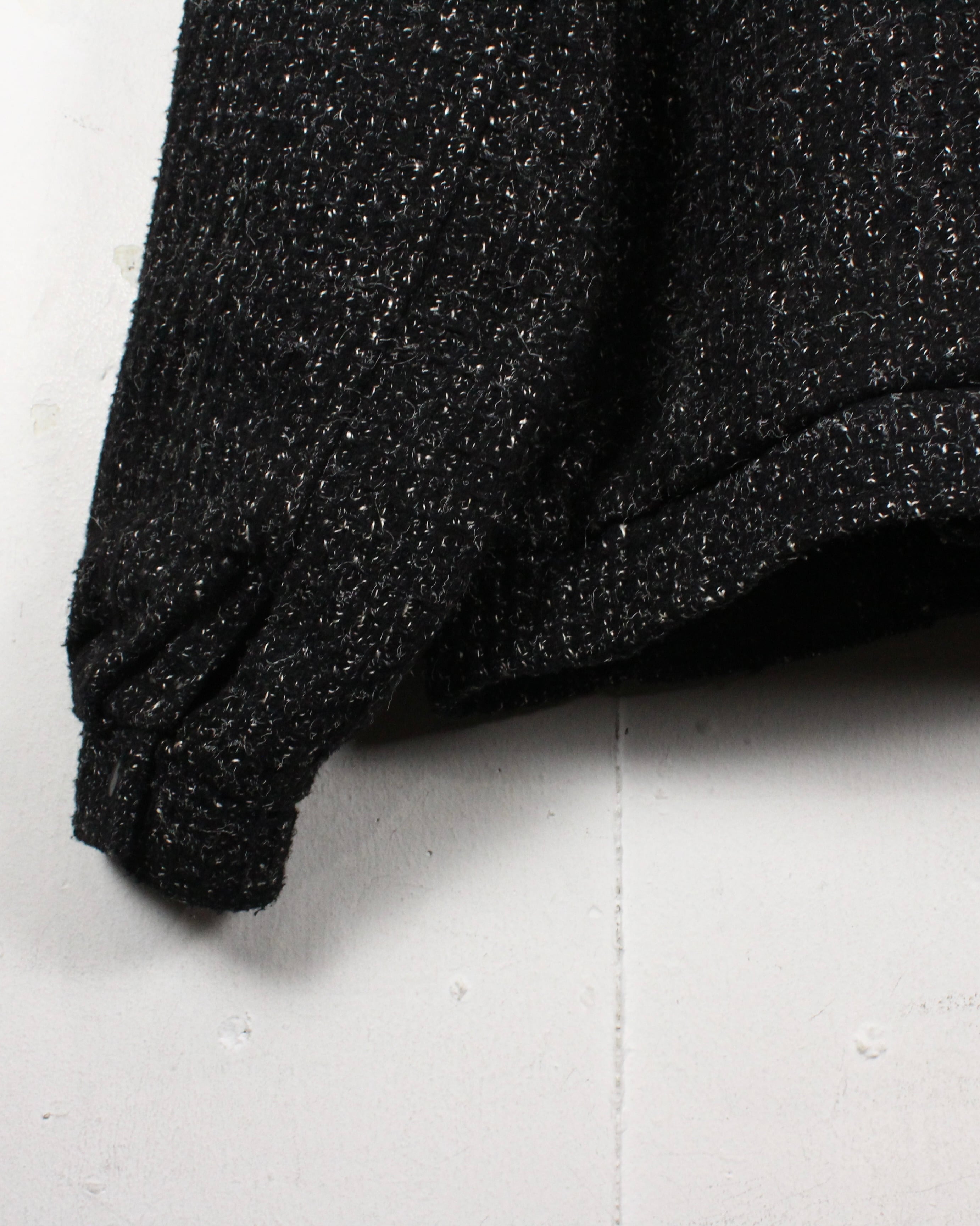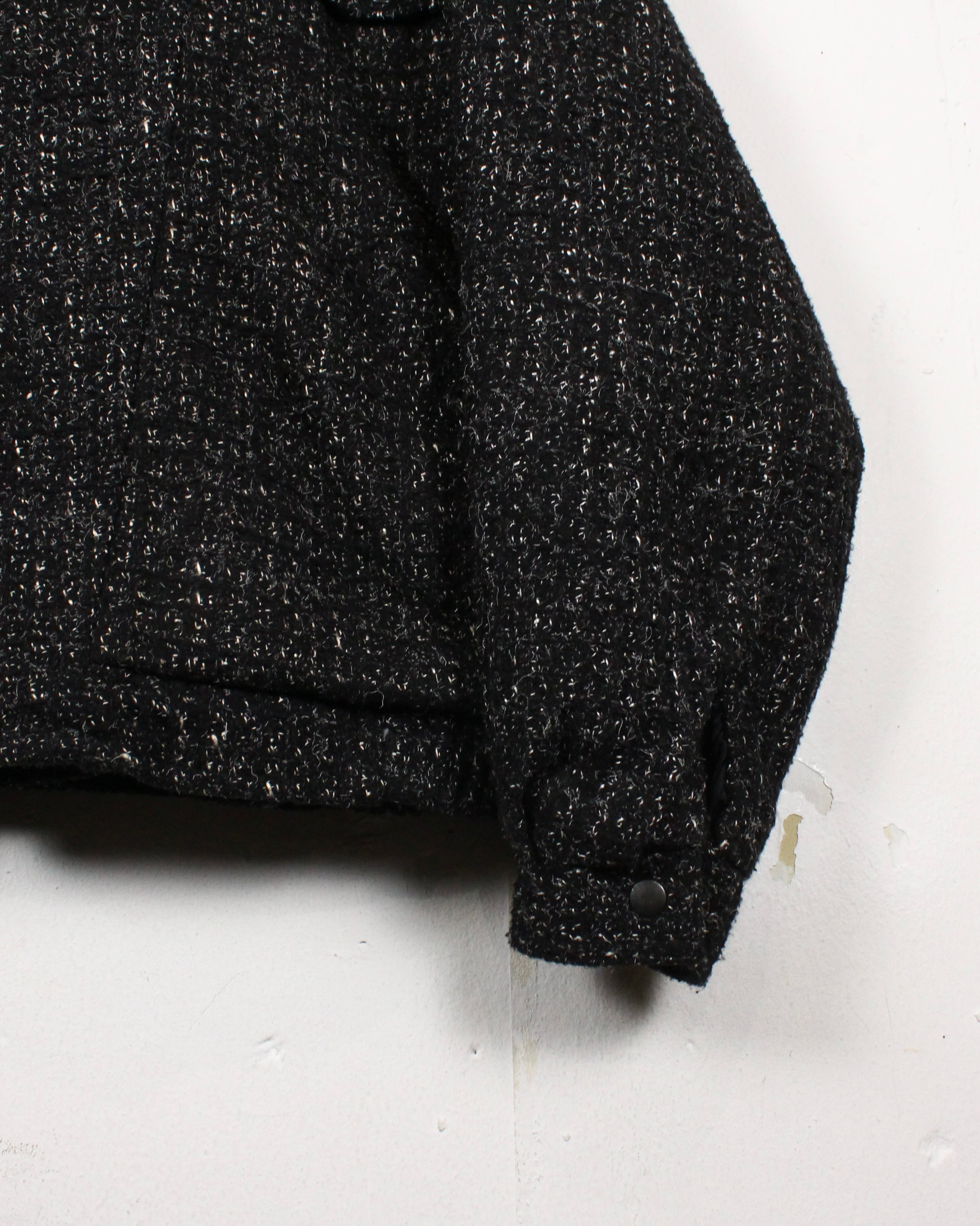 ざらりとした表情を持つブラックツイードは、光の入り方でわずかに表情を変える立体的な織り。そこに襟やエポレットへレザー切り替えを施すことで、ツイードだけでは出せない重厚感と色気をしっかりプラスし、この素材コントラストの妙が、とにかく秀逸なんです。