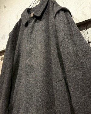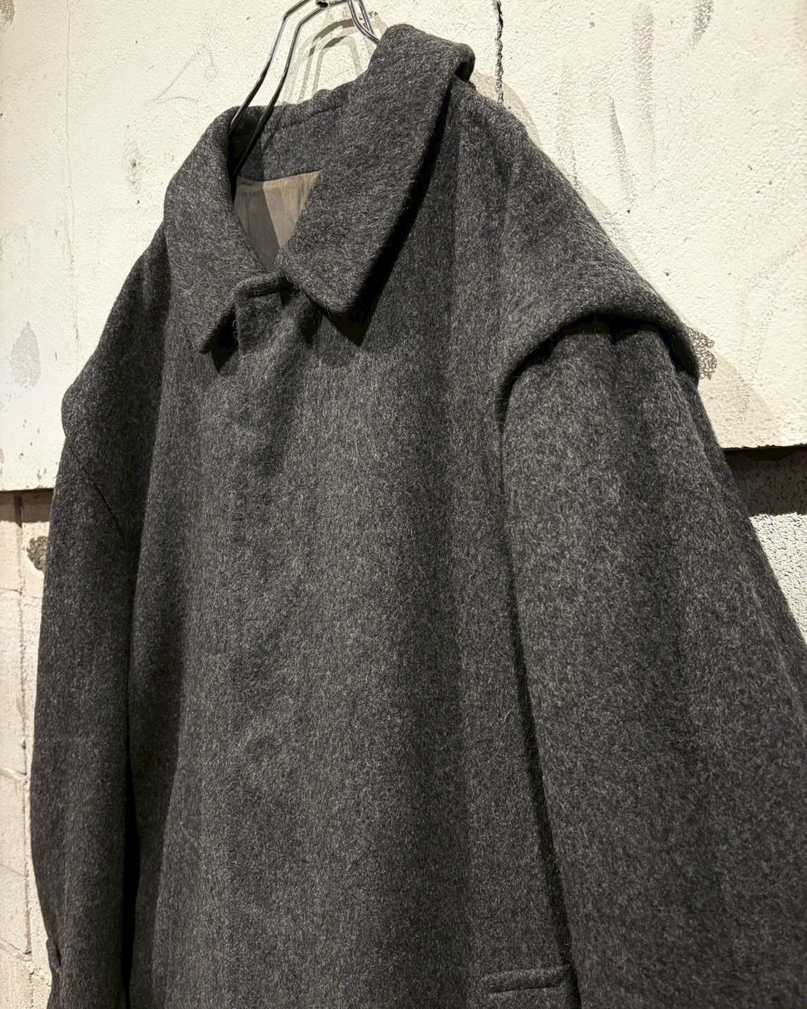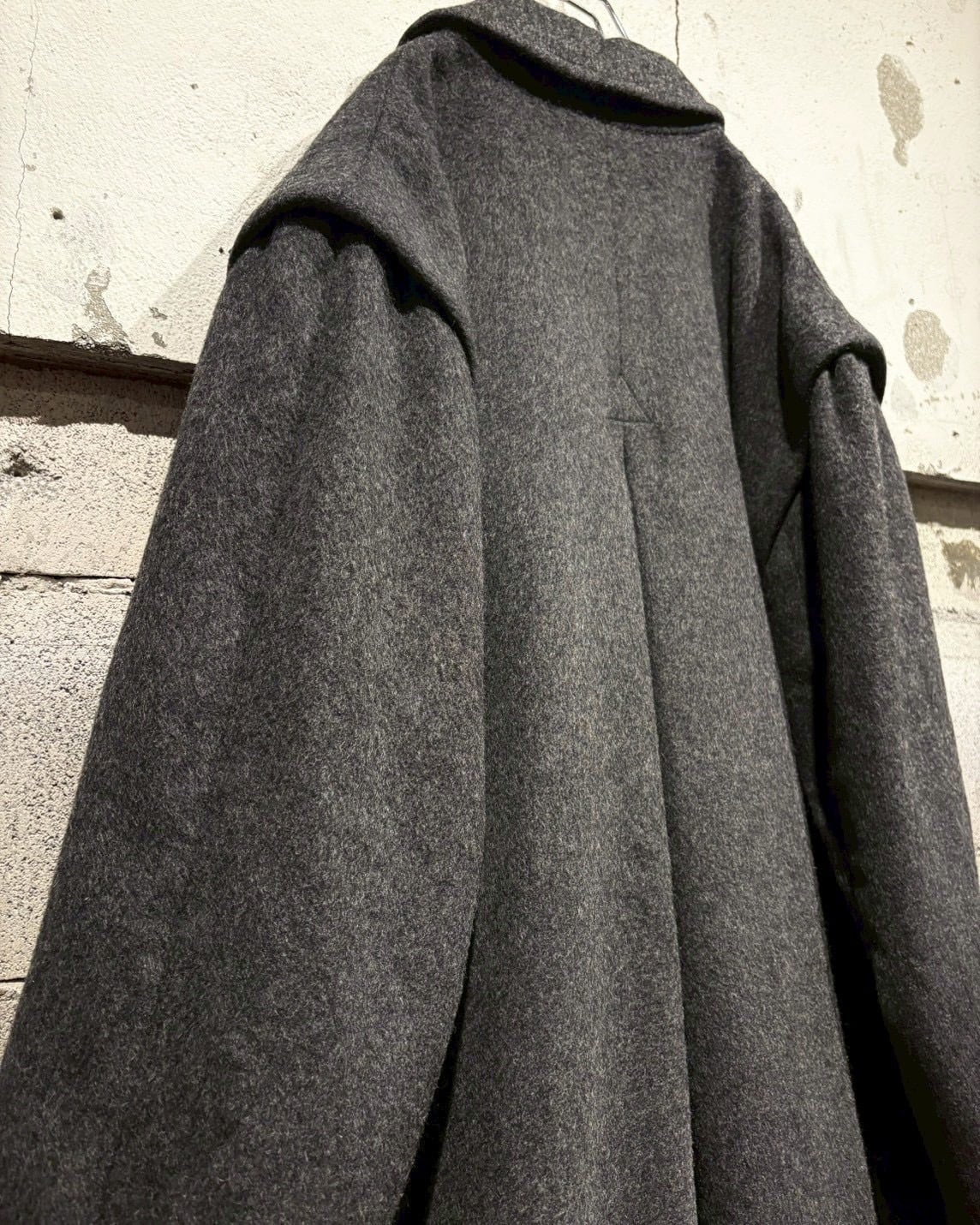比翼仕立てのフロントは風の侵入を防ぎながら、非常にミニマルな表情に。フローティングショルダー、背面には深いインバーテッドプリーツを採用し、歩くたびに生まれるドレープが美しい、、、