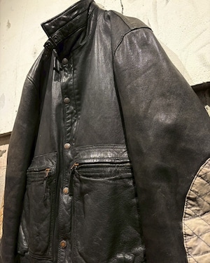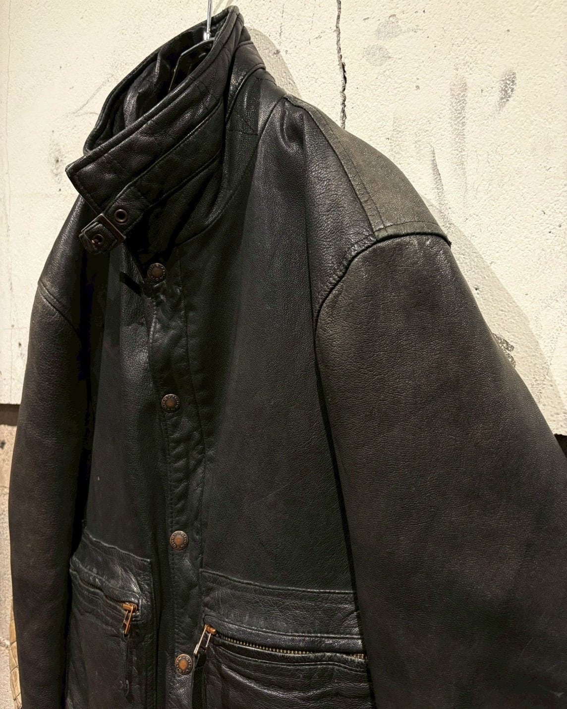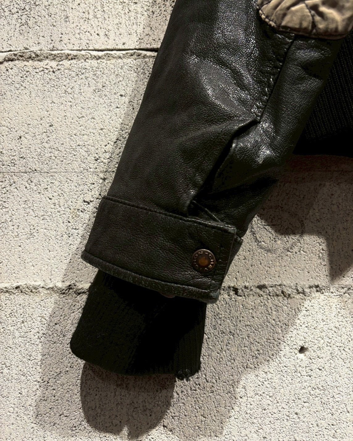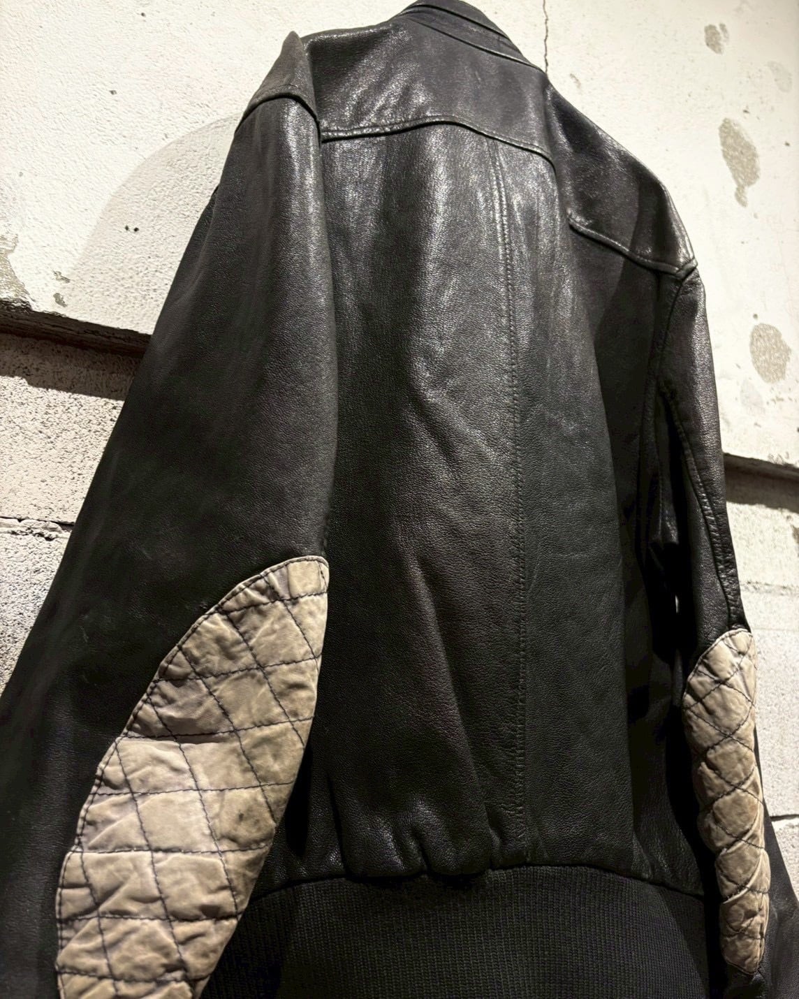艶やかな光沢を帯びた上質なブラックレザージャケットに、内側に味わい深い表情を見せるコットン生地のジャケットを重ねたような、レイヤード風のデザインに仕上げたレザージャケット。