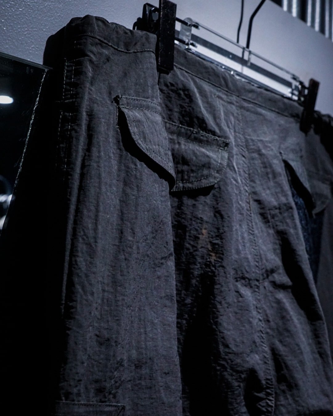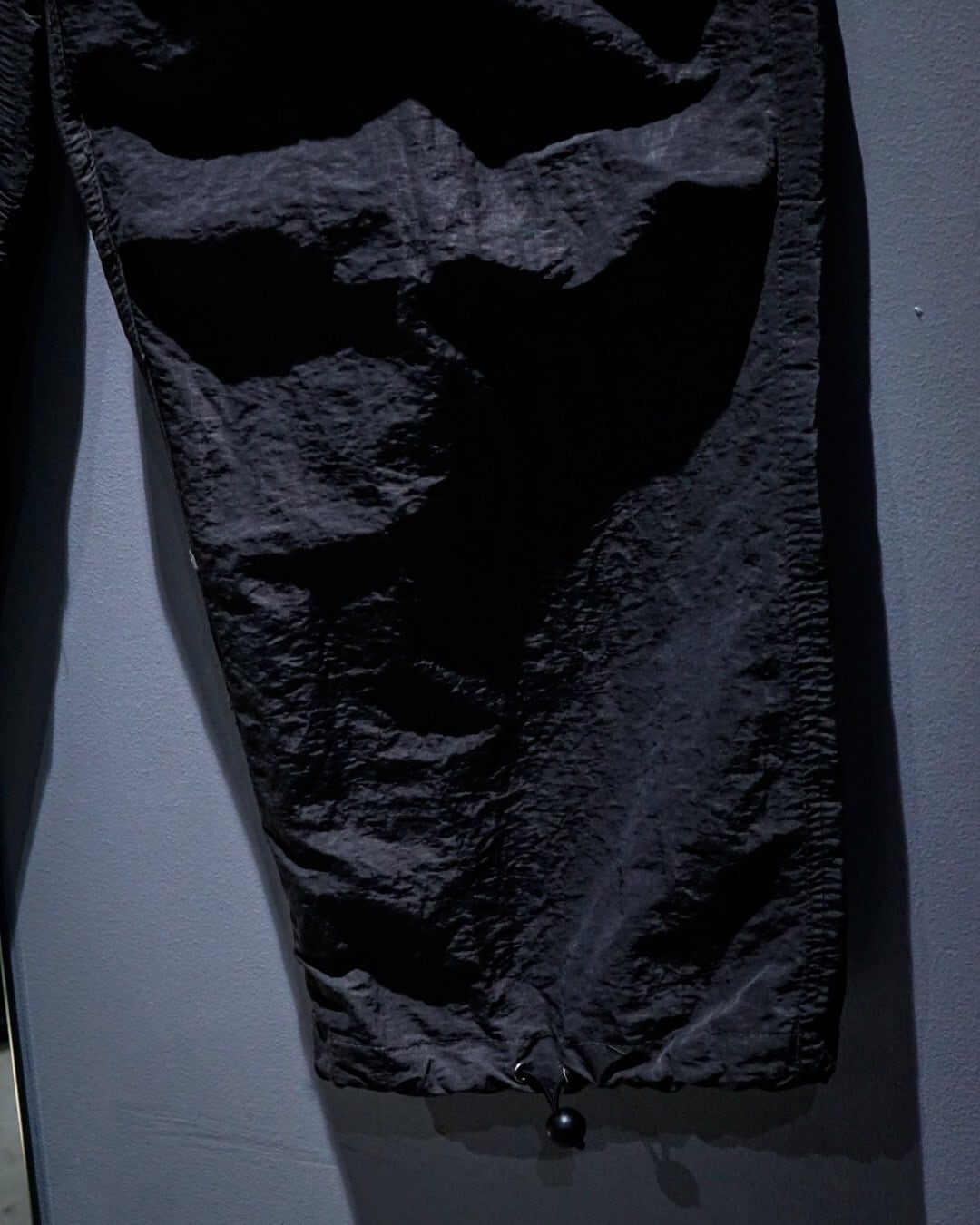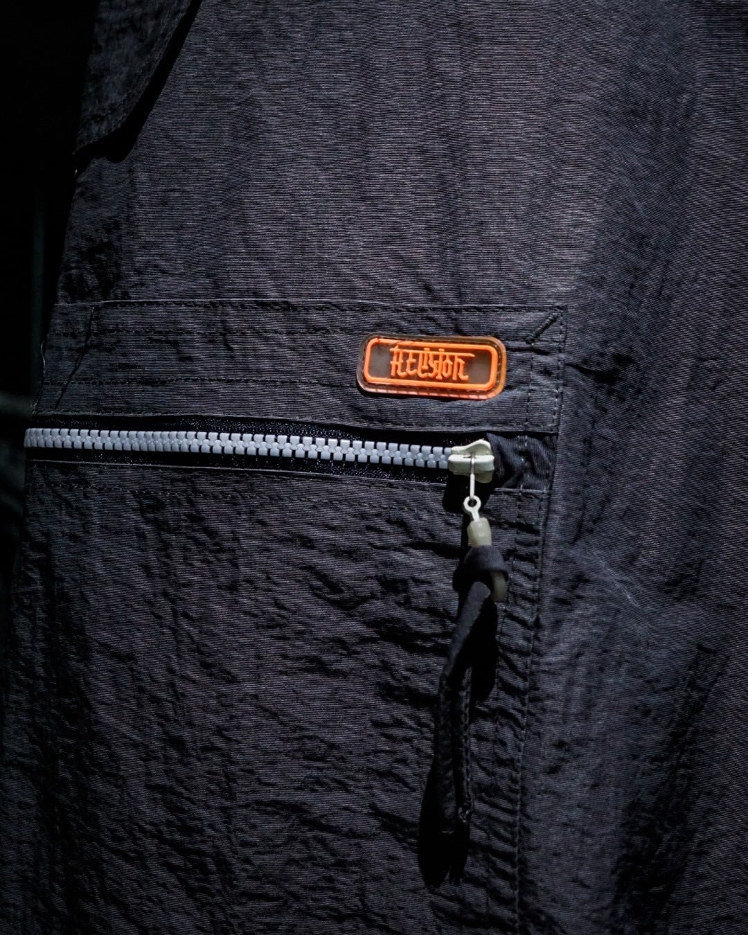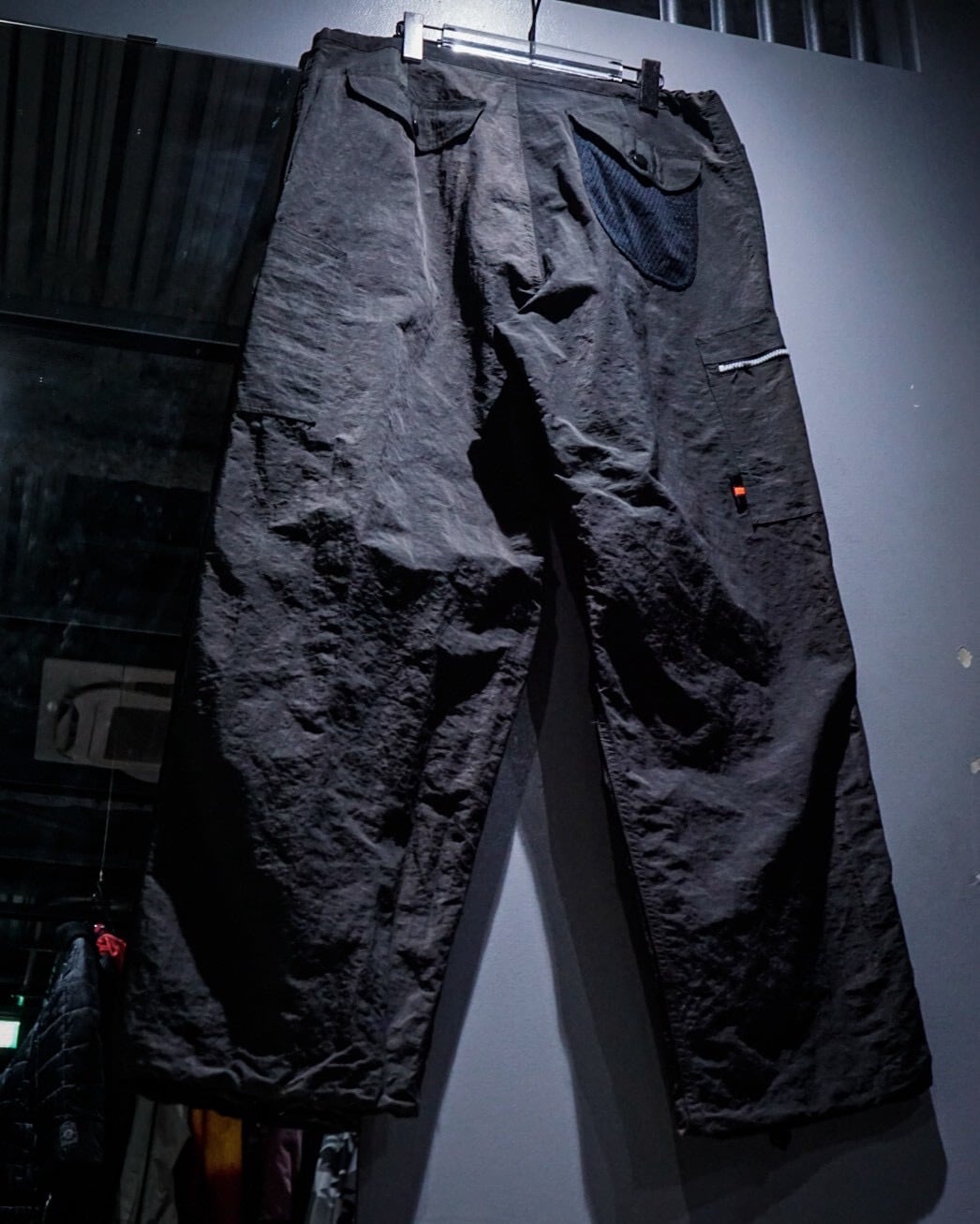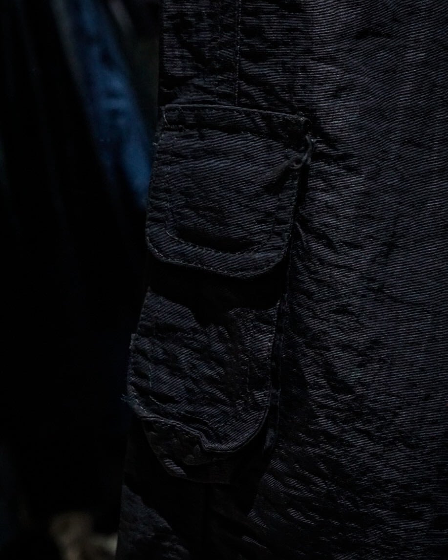 独特のシャリ感とシワ感を帯びたライトナイロンが、ムーブした時に程よく膨らむシルエットを演出し、レイブ特有の空気感をしっかり拾ってくれます。