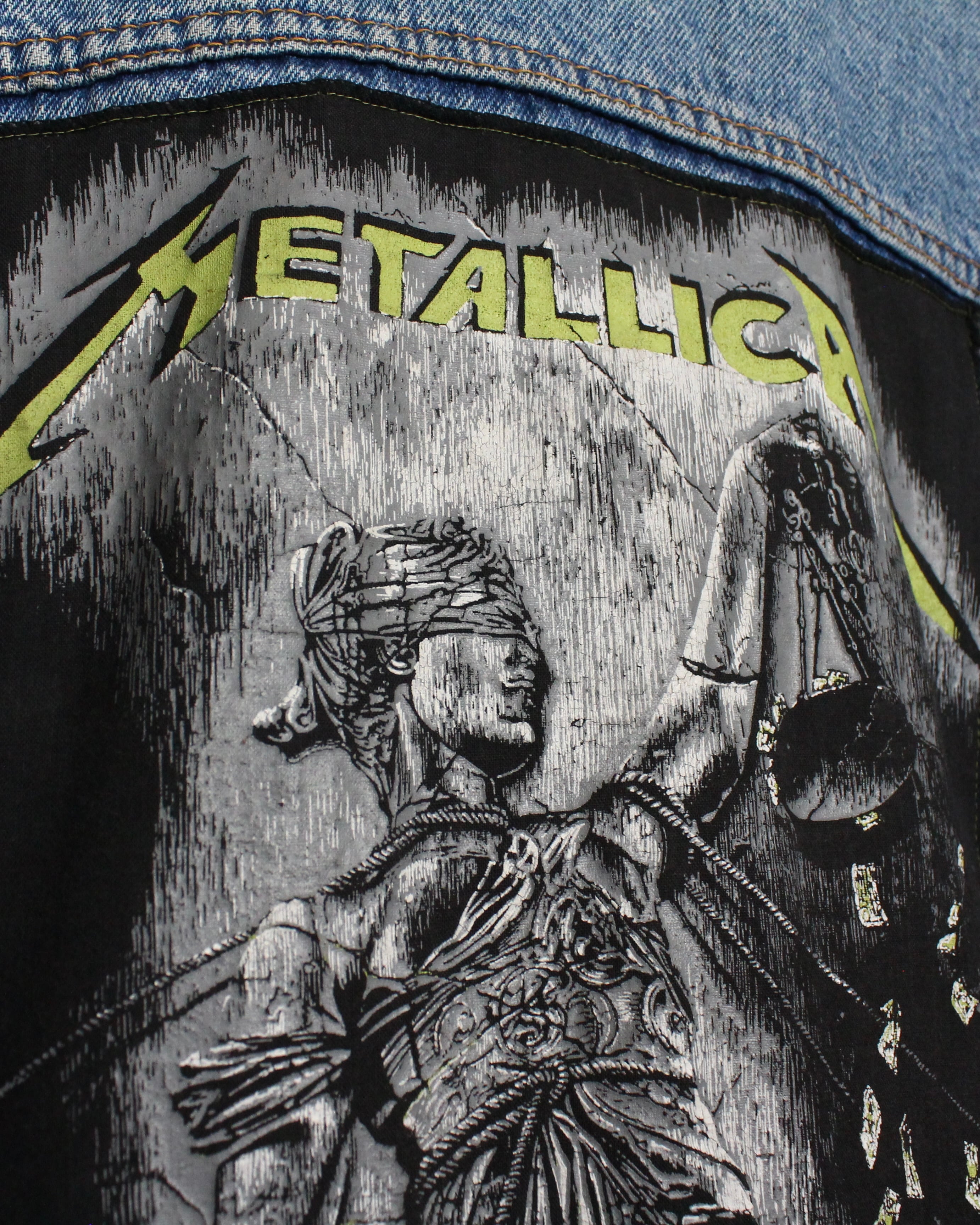 背面には1988年リリースの名盤『…And Justice For All』のアートワークを大判なパッチで配置。象徴的なグラフィックはデニムの色落ちと相性抜群で、ジャケットの雰囲気を一段階引き上げています。