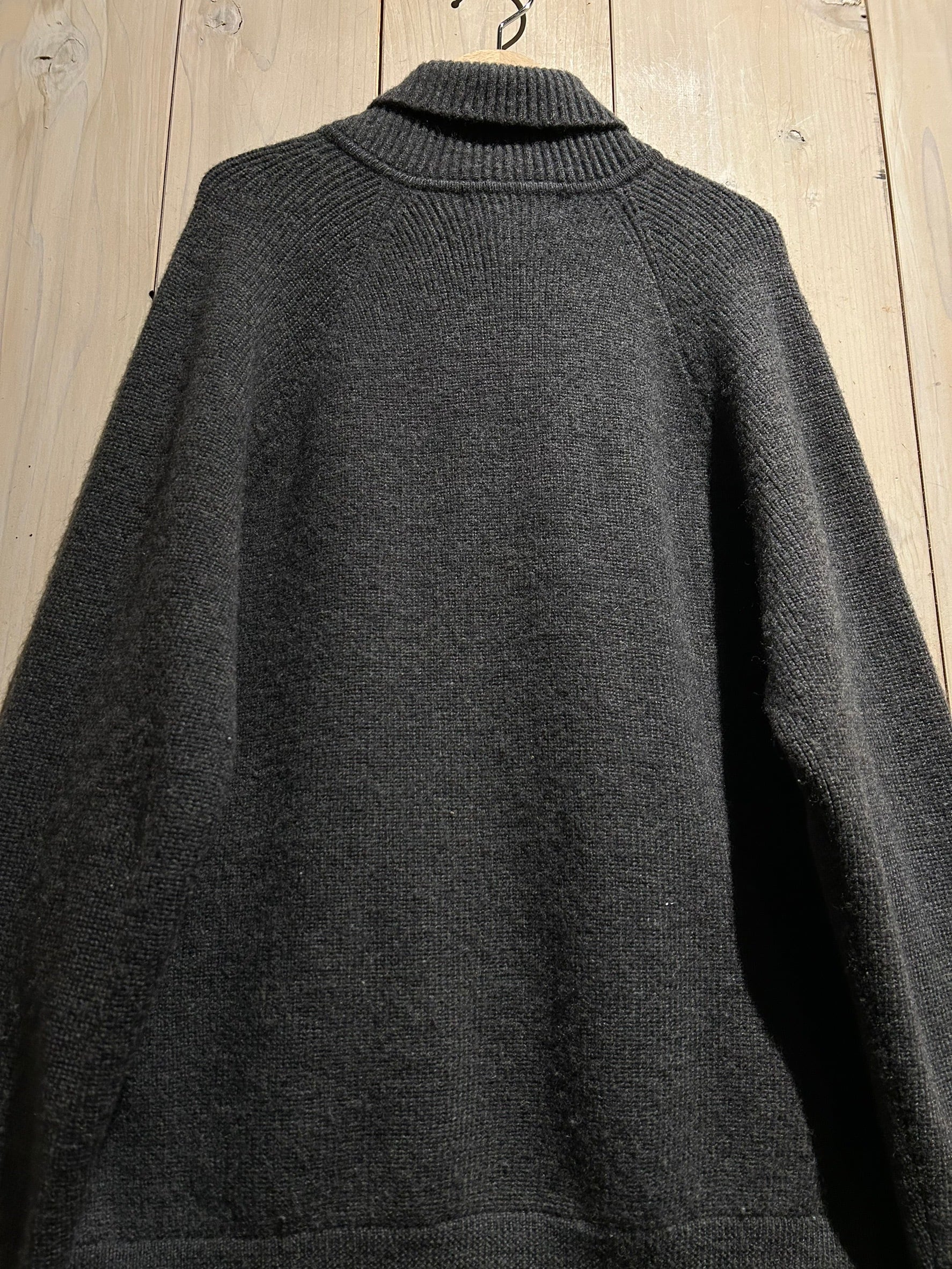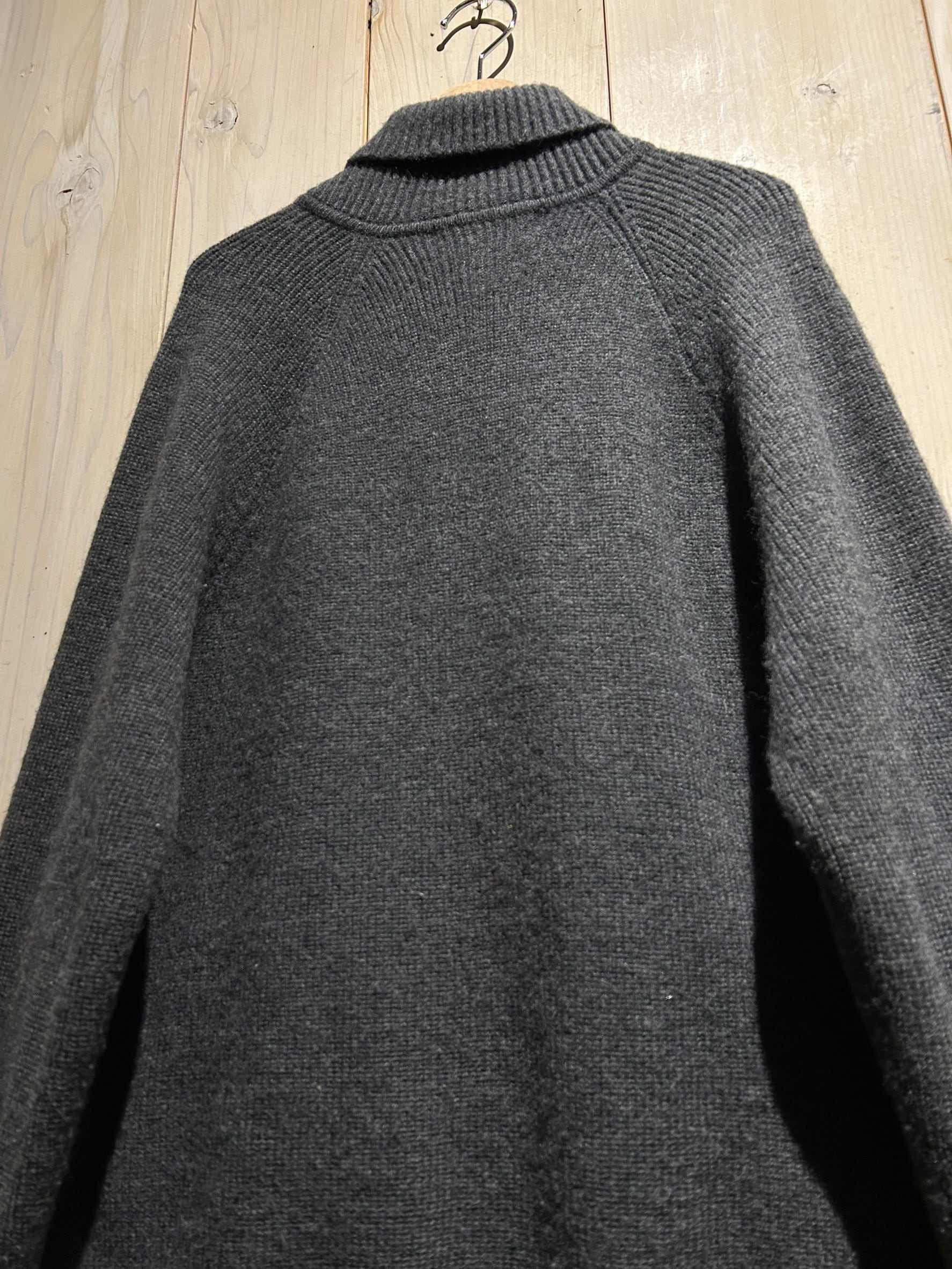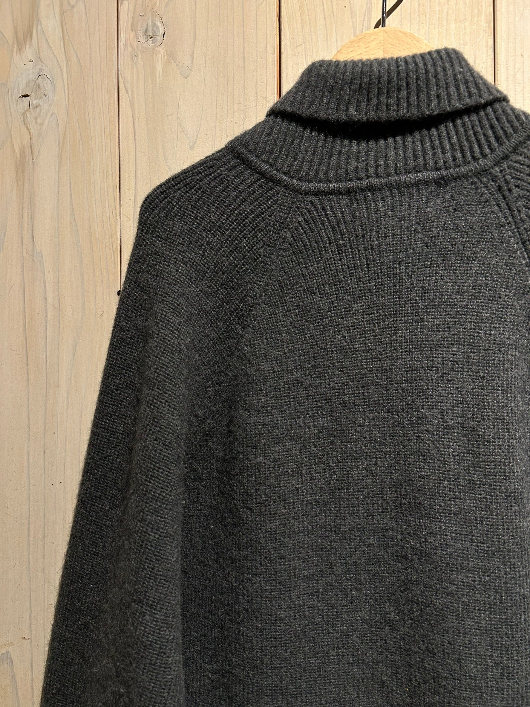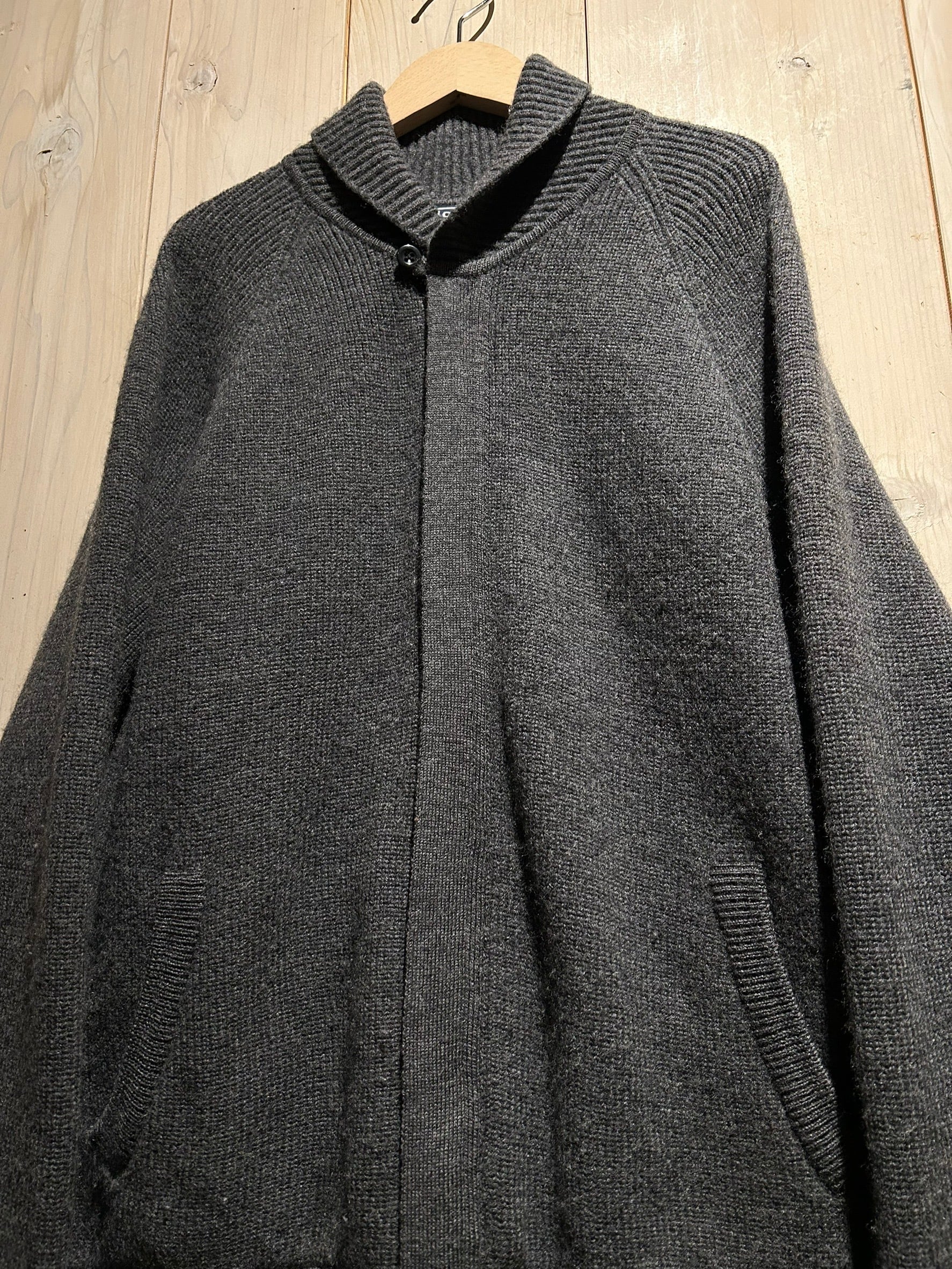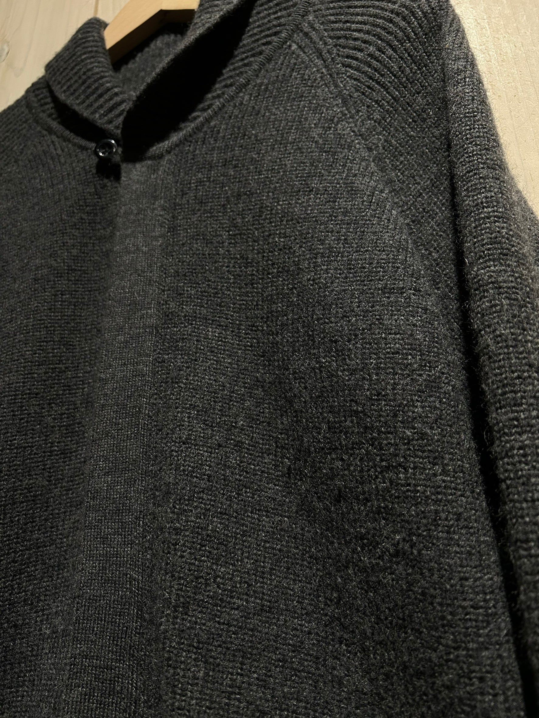 ミニマルなボディに対し、ショールカラーの肉厚な襟元が象徴的な1着。トップボタンはループ仕様、フロントはジップにスナップの比翼仕立てで、洗練されたミニマルなルックスが魅力です。サイドにはスラッシュポケットを備え、実用面も抜かりなし。