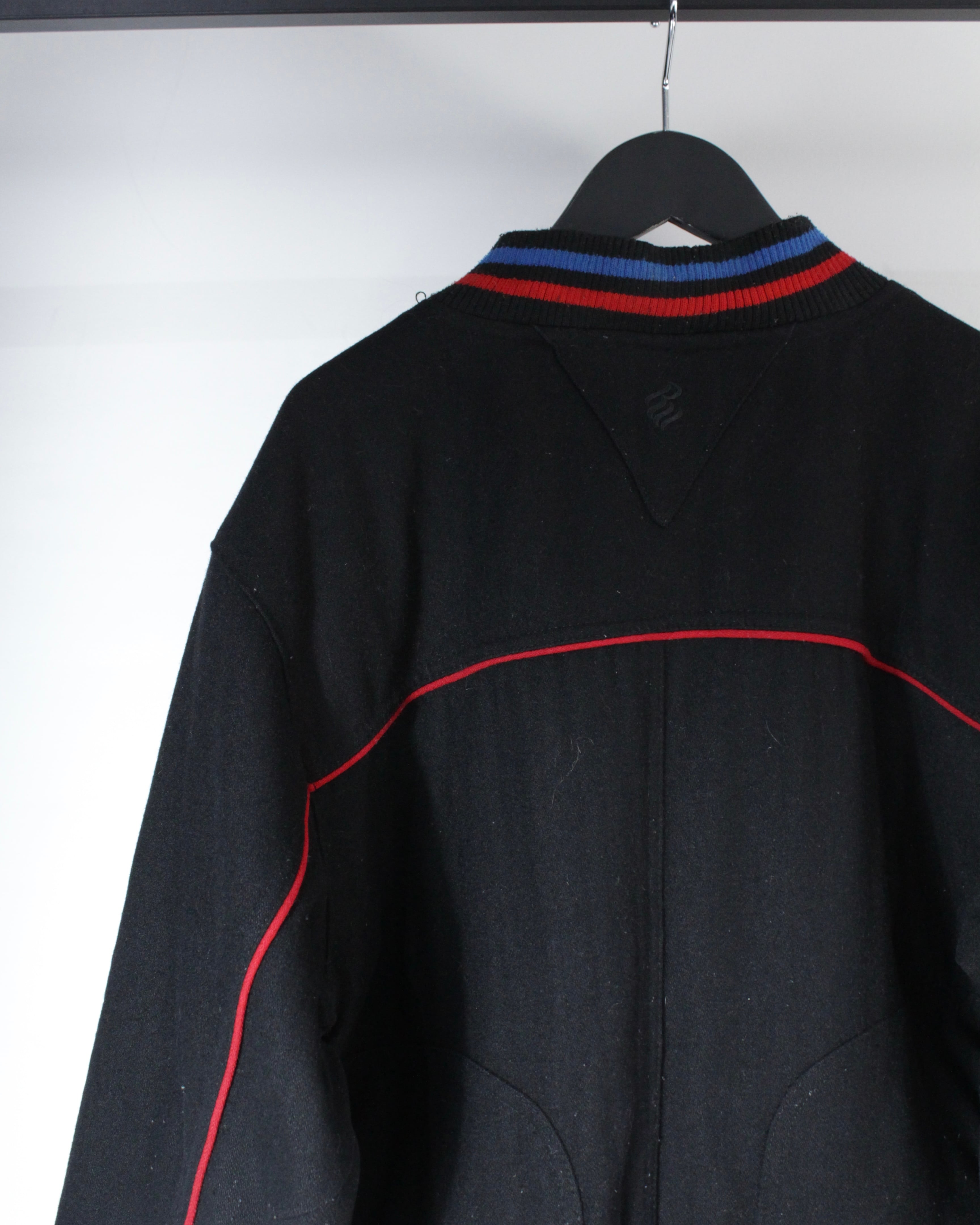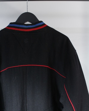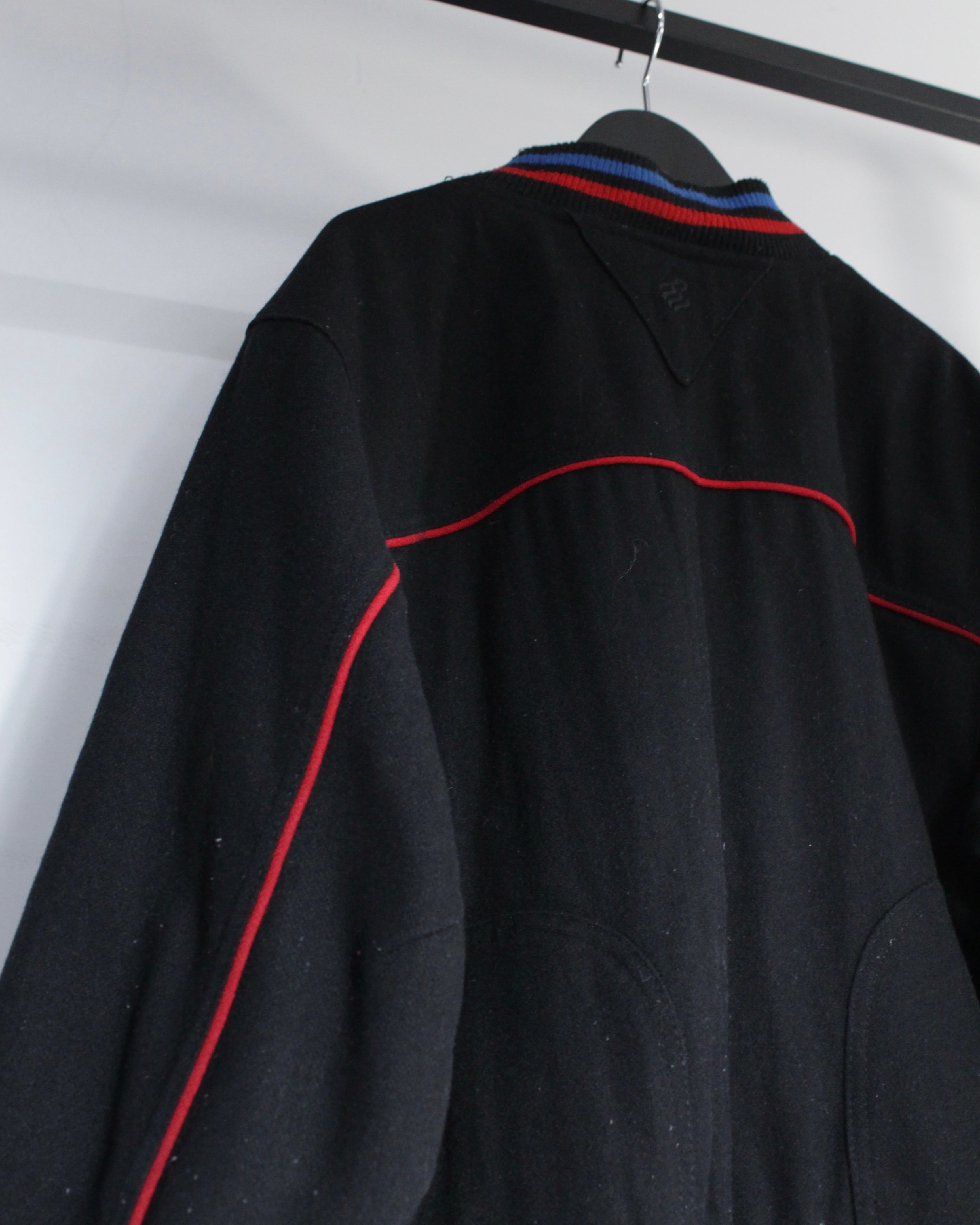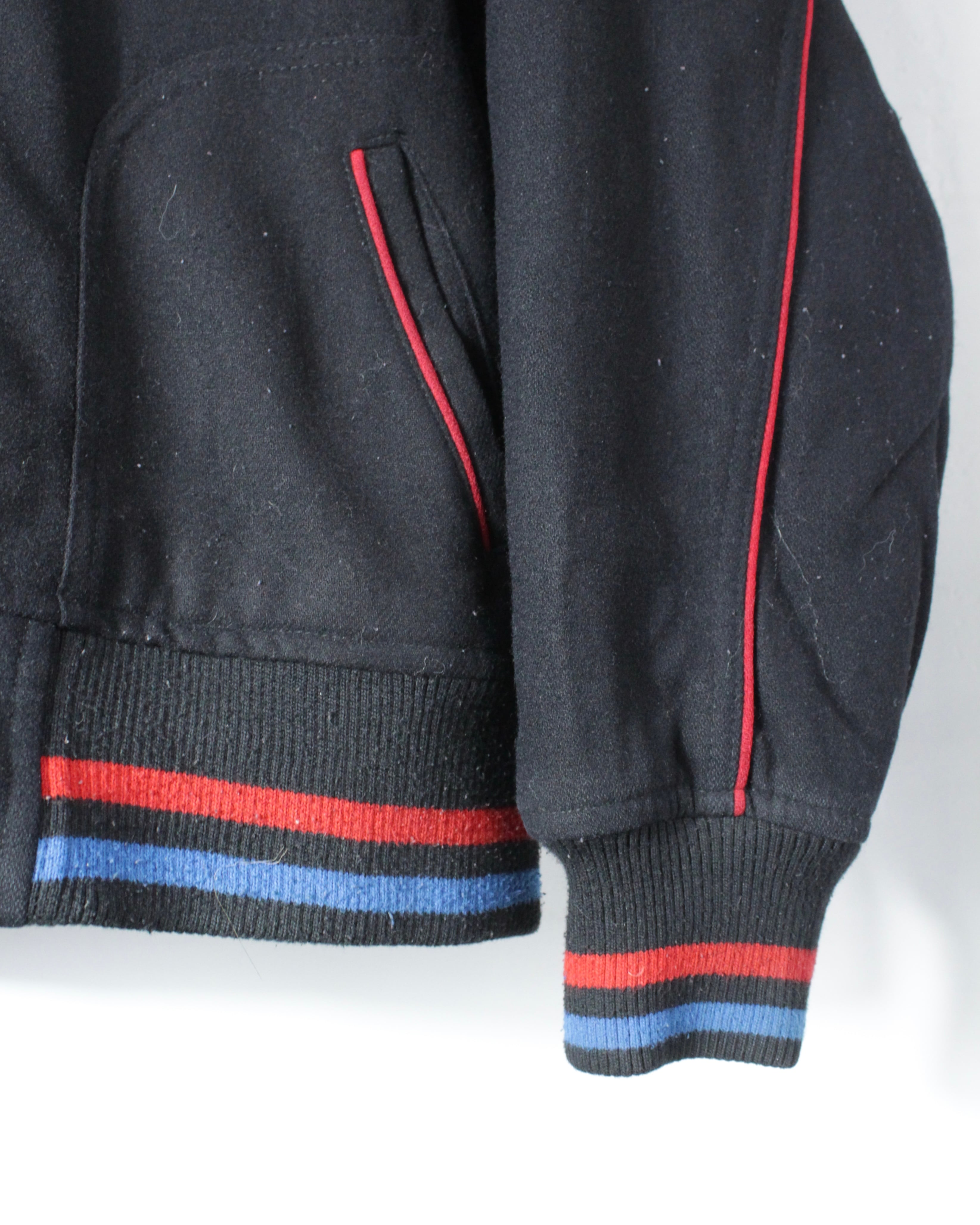 リブにはブルーとレッドのラインを配し、全体のアクセントとして絶妙に機能。ボディは肉厚で温かみのあるウールで起毛感を持ち、ブラックカラーの中にしっかりと映える刺繍とのコントラストが秀逸。