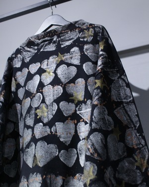 一つひとつのハートが均一ではなく、インクの乗り方やかすれ具合が異なるため、同じものが二つとない一点物の仕上がり。光の当たり方でメタリックの陰影が変化し、スタイリングの主役になってくれるかと。