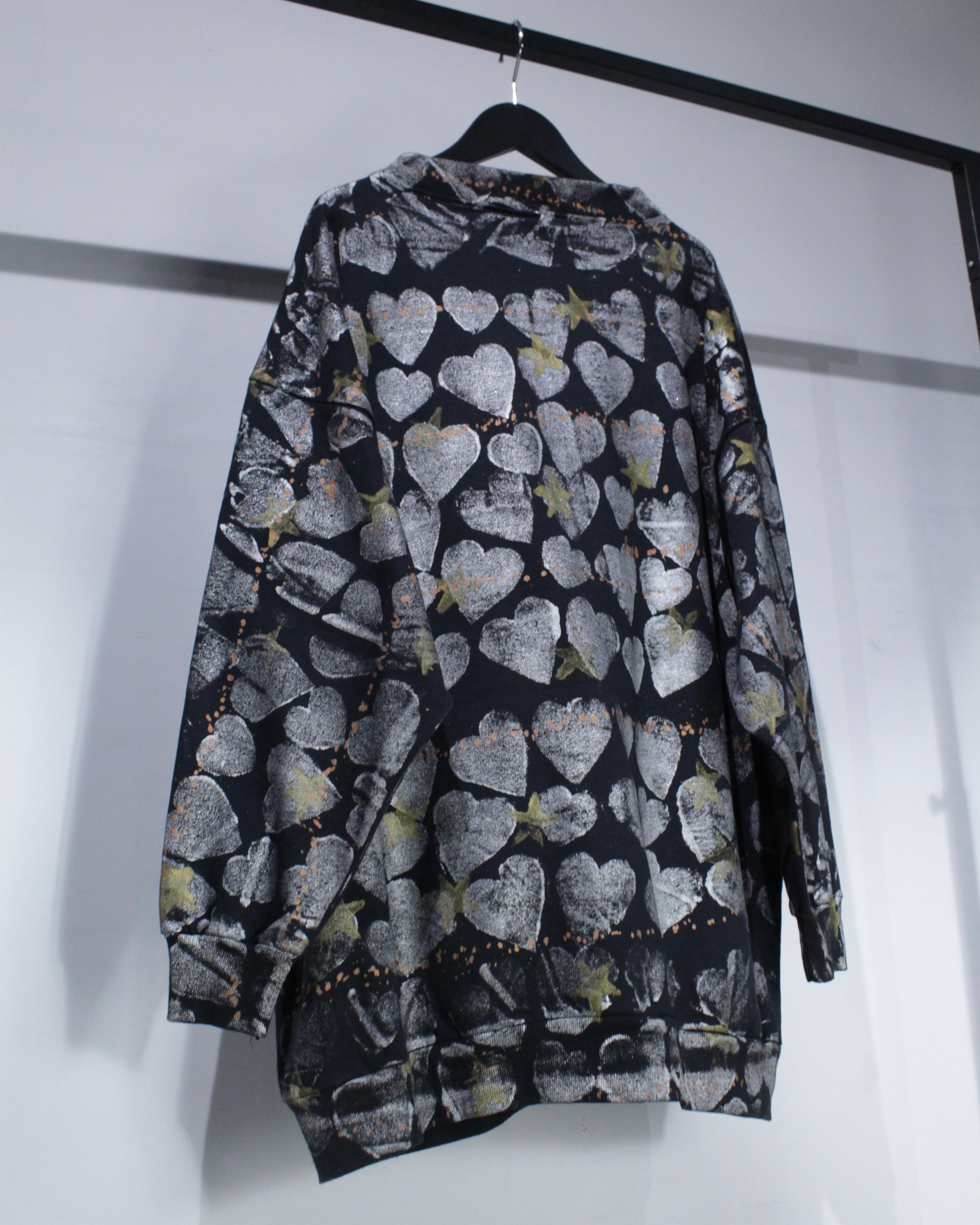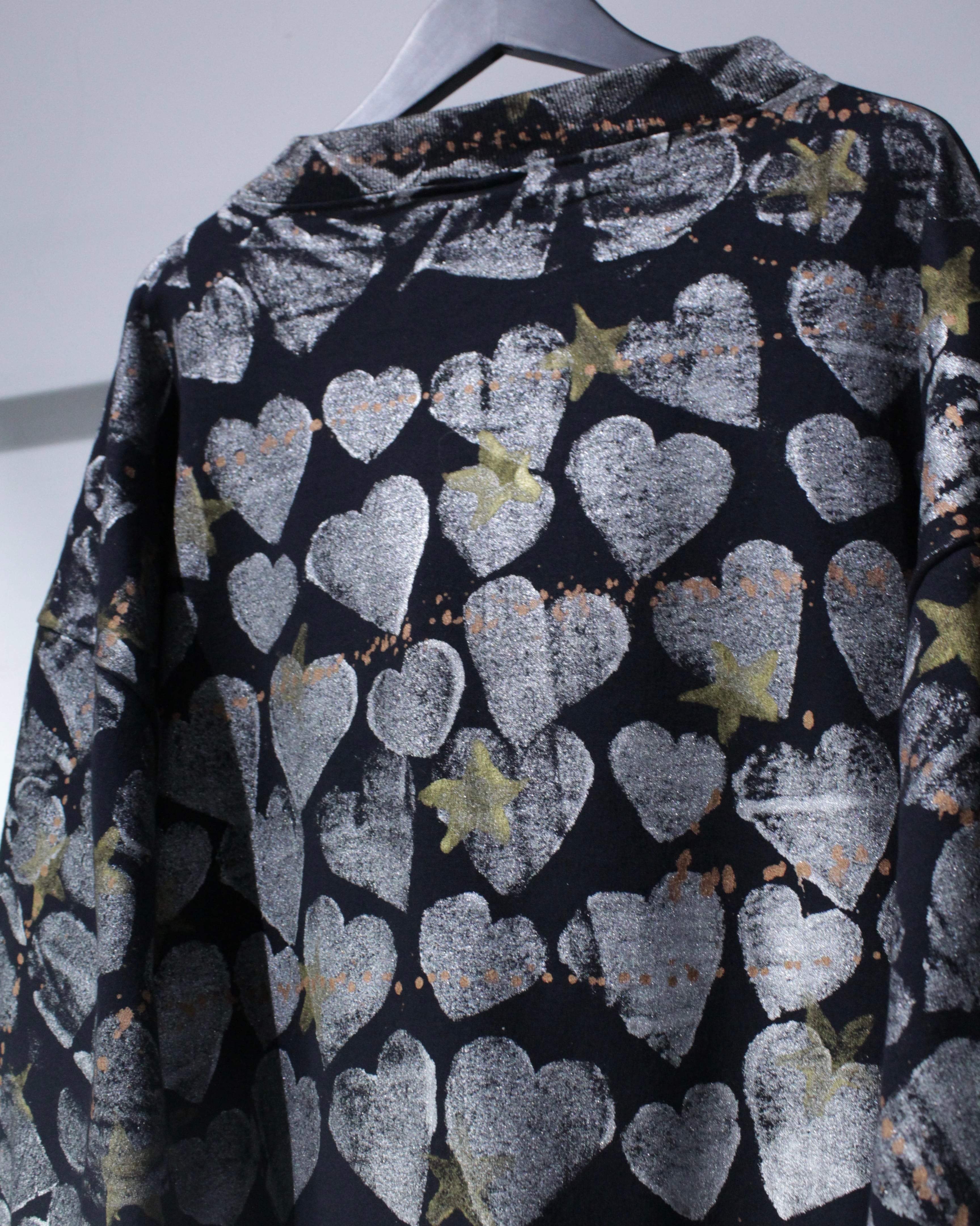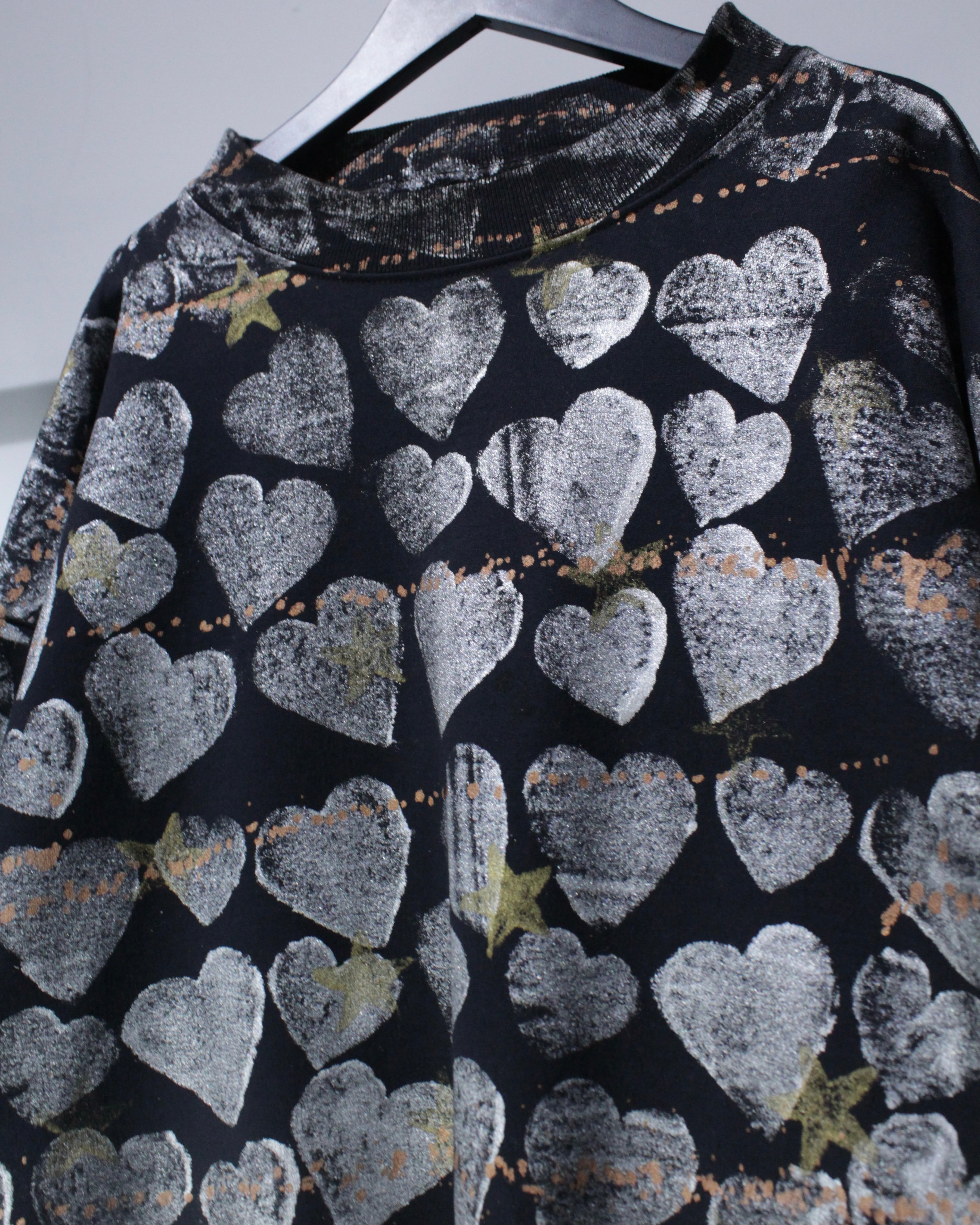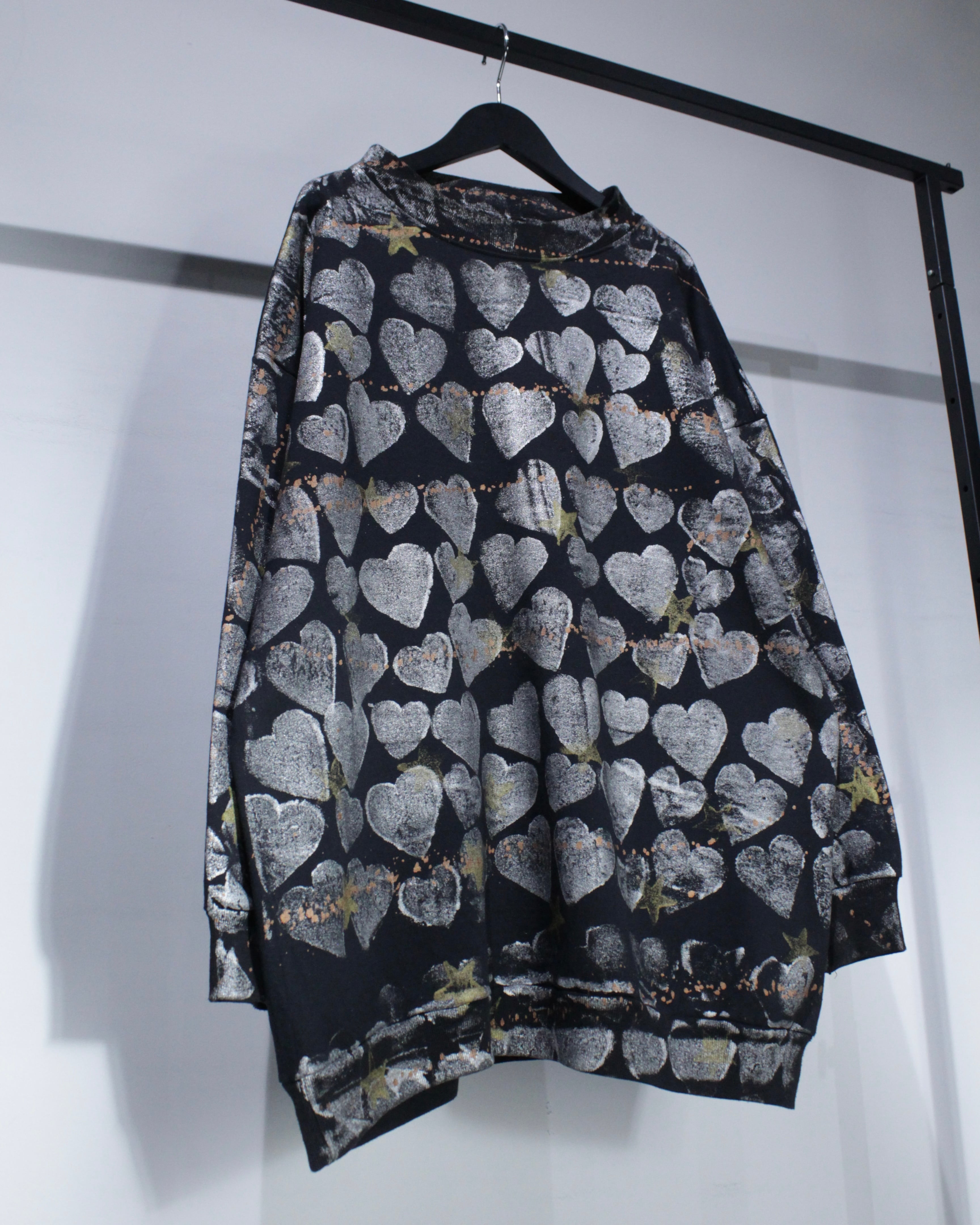 全面に施されたハートとスターのシルクスクリーンが存在感を抜群に放つスウェット。