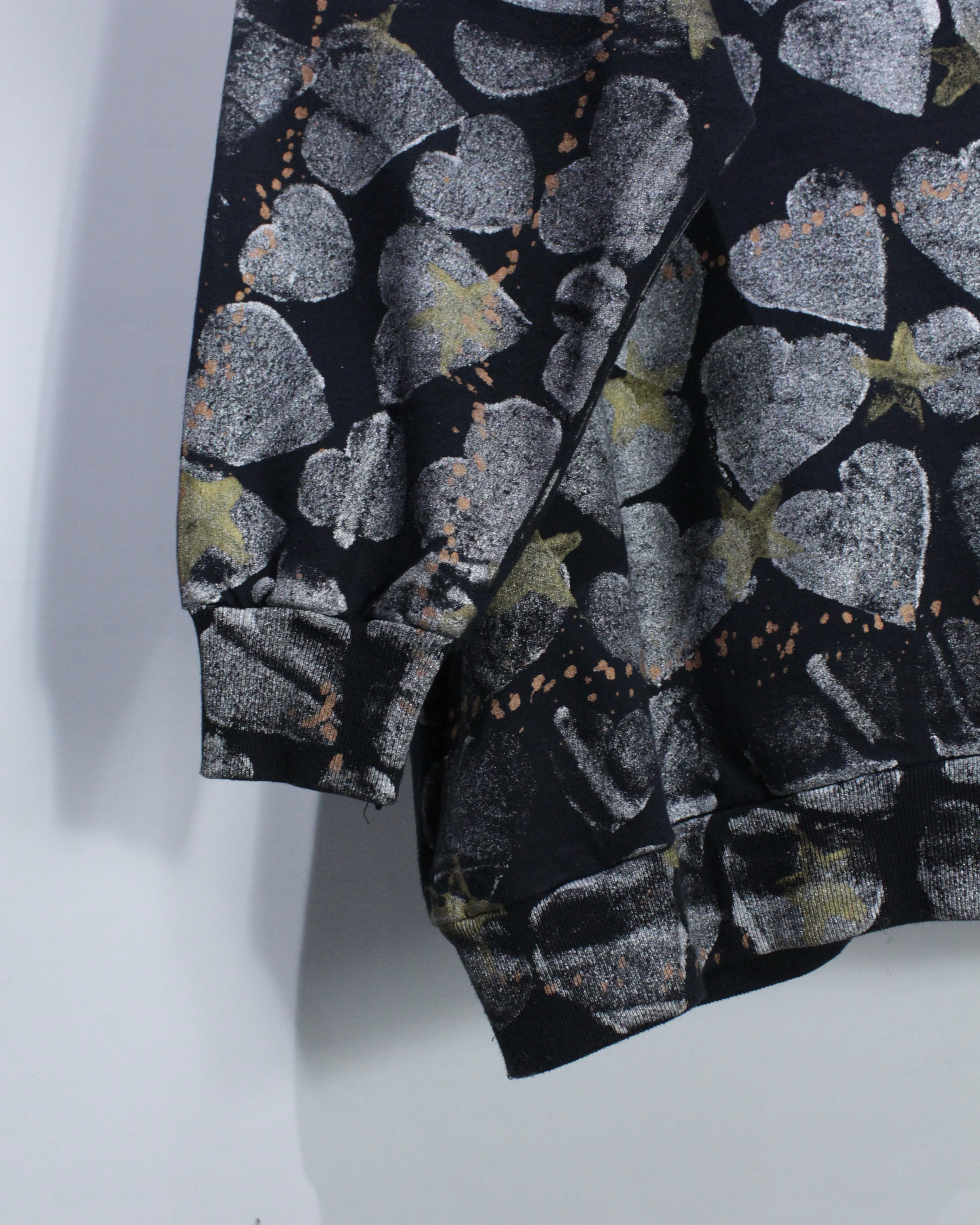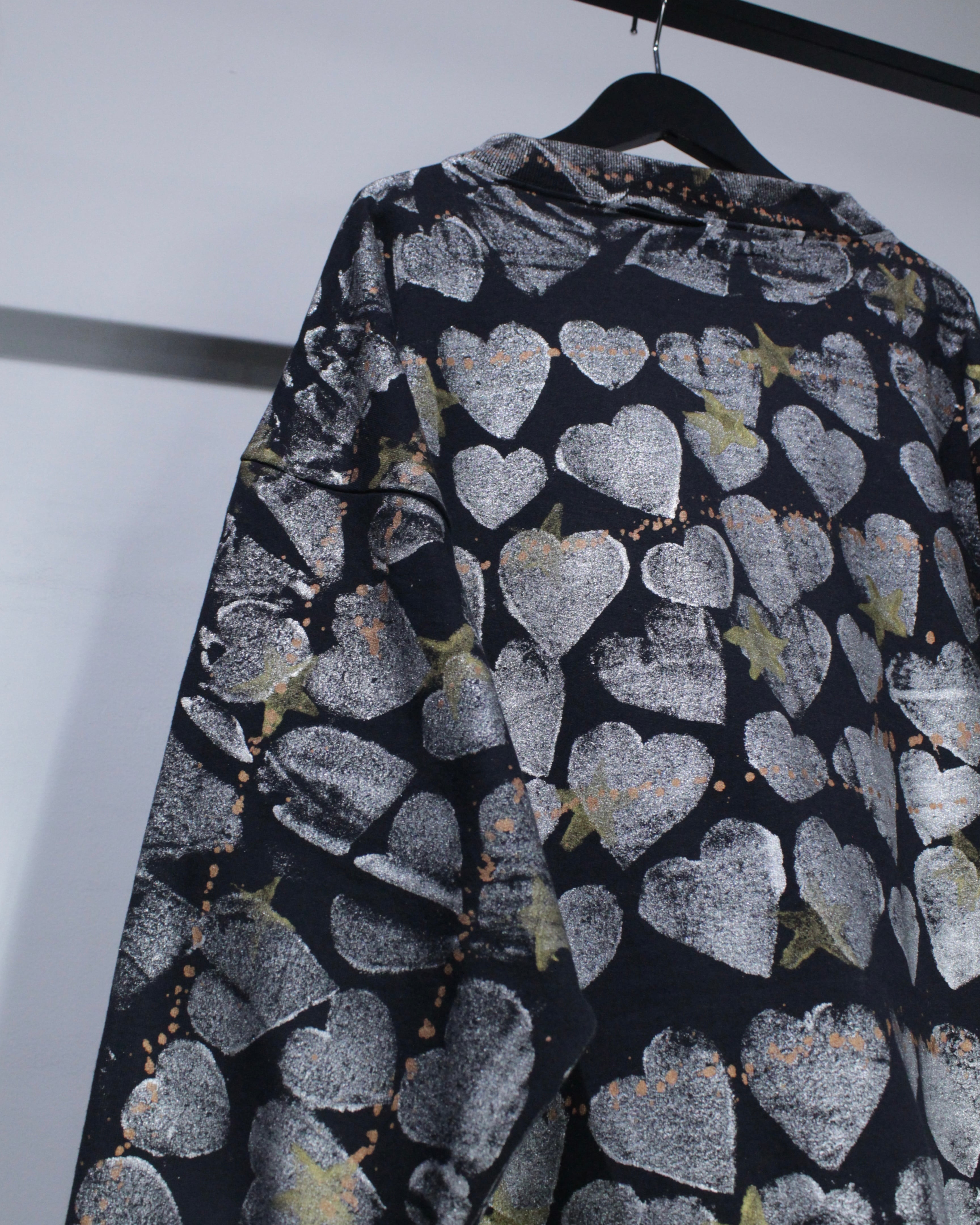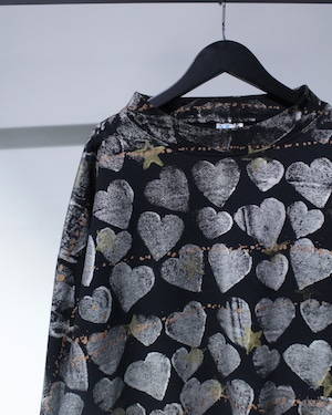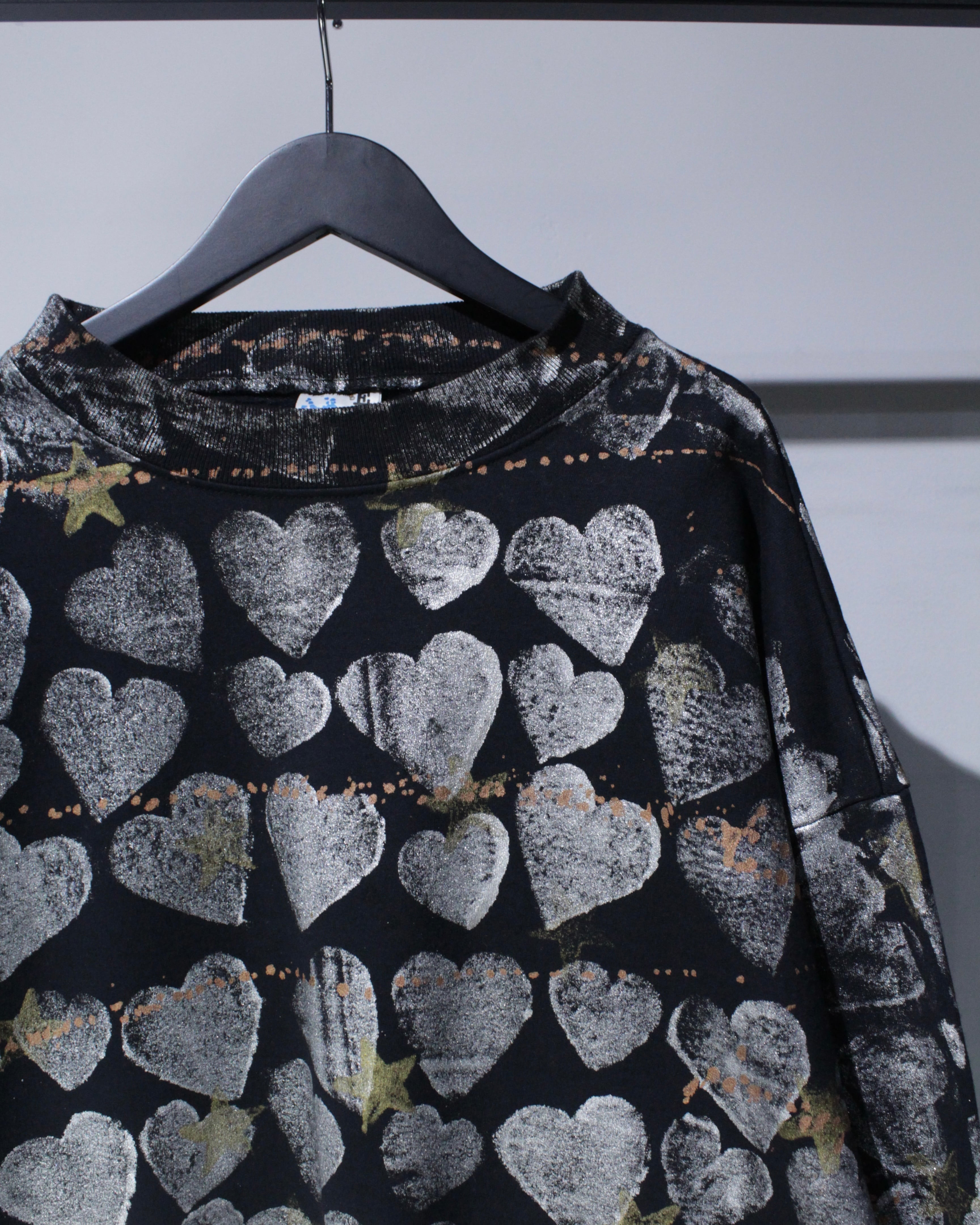 全面に施されたハートとスターのシルクスクリーンが存在感を抜群に放つスウェット。