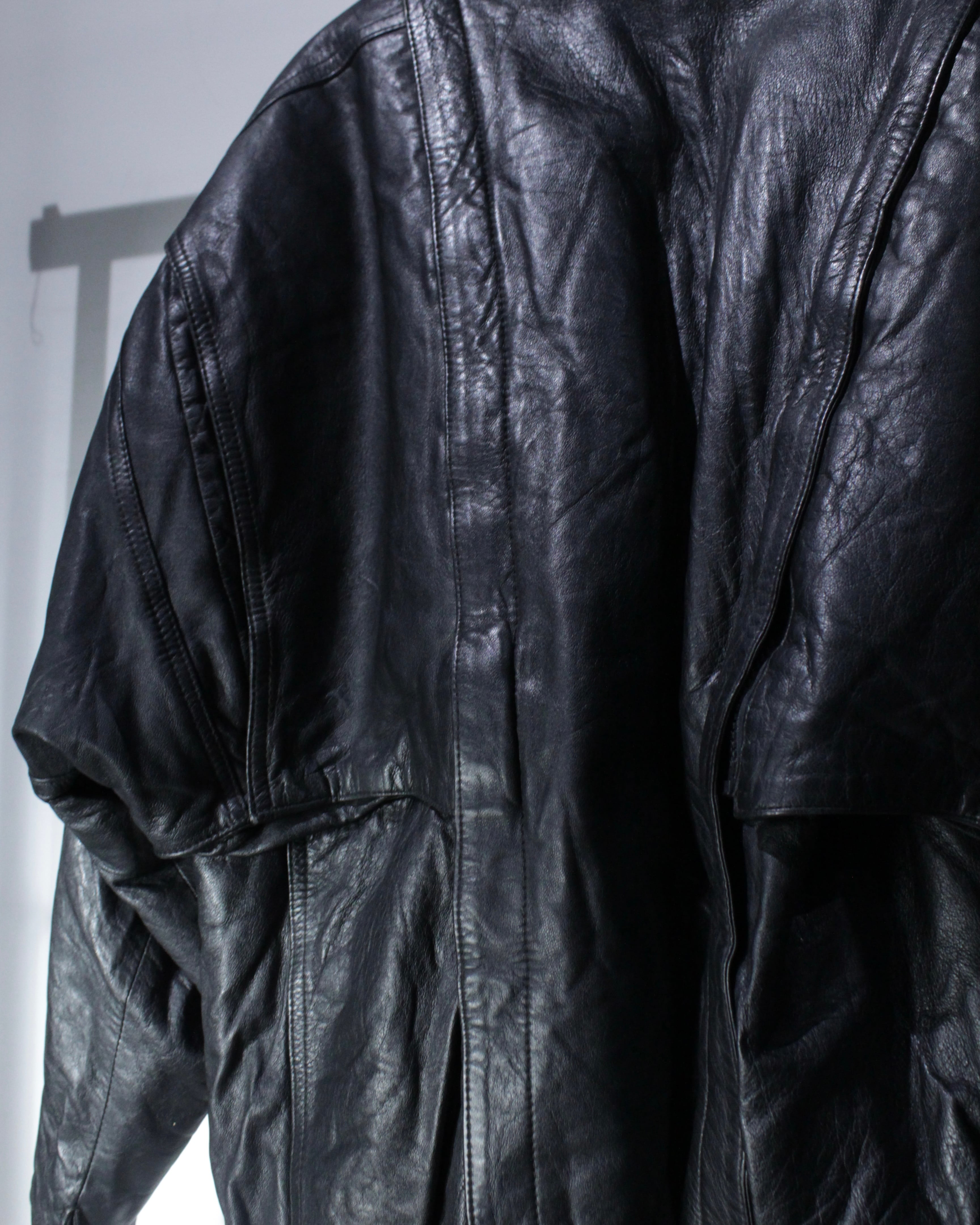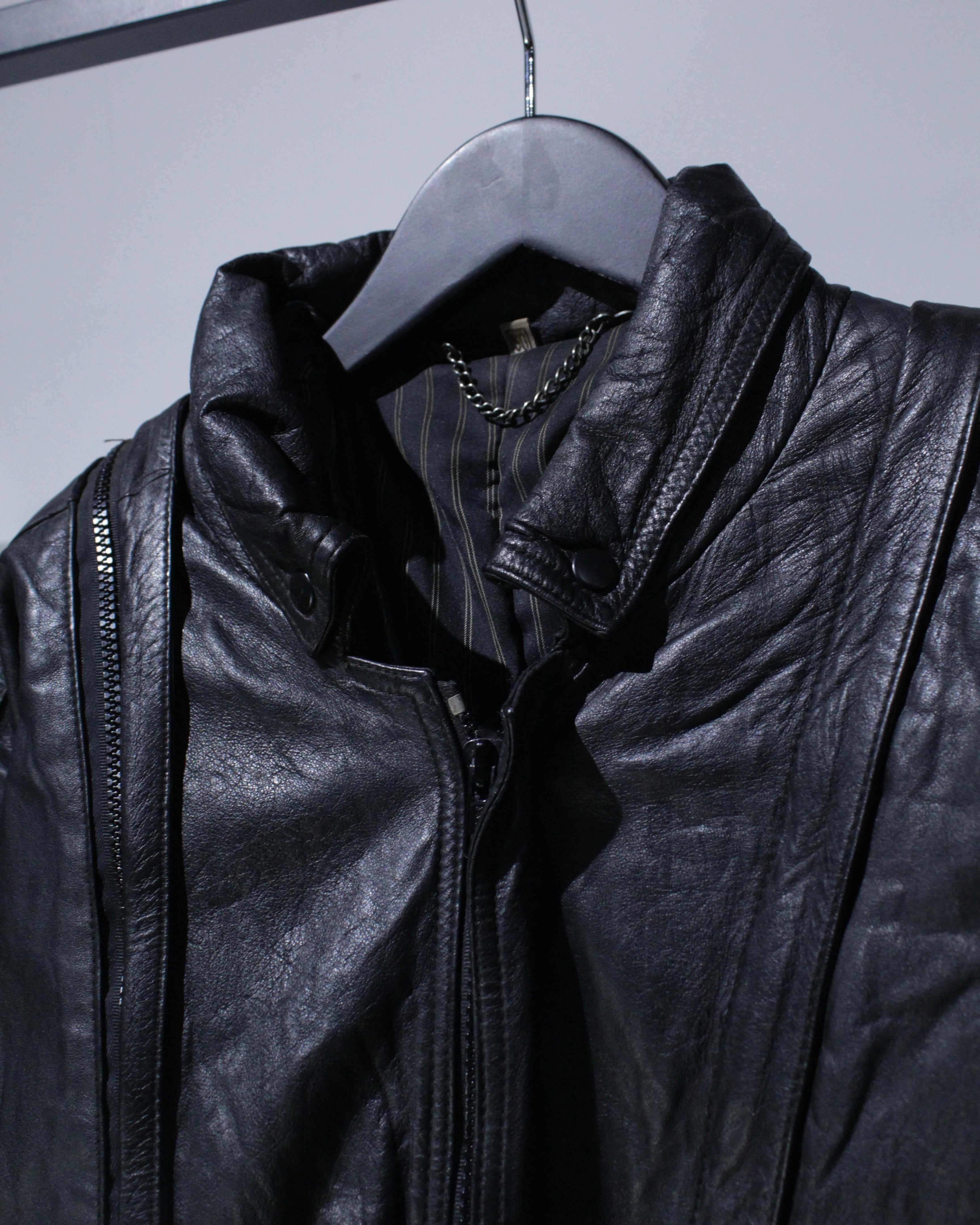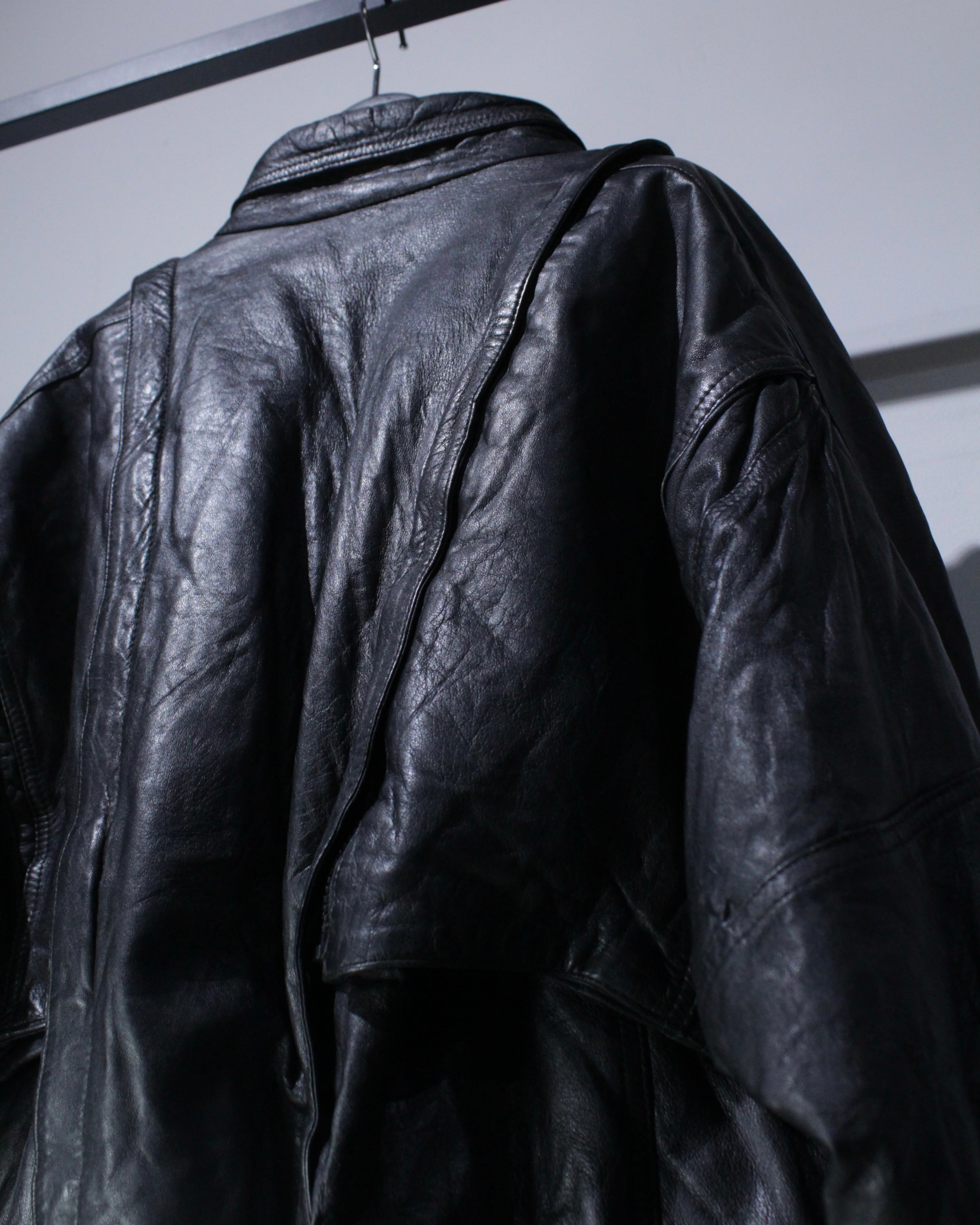 しなやかで肉厚なブラックレザーを贅沢に使用し、ヴィンテージ特有の深い皺感と艶が存分に味わえるレザージャケット。