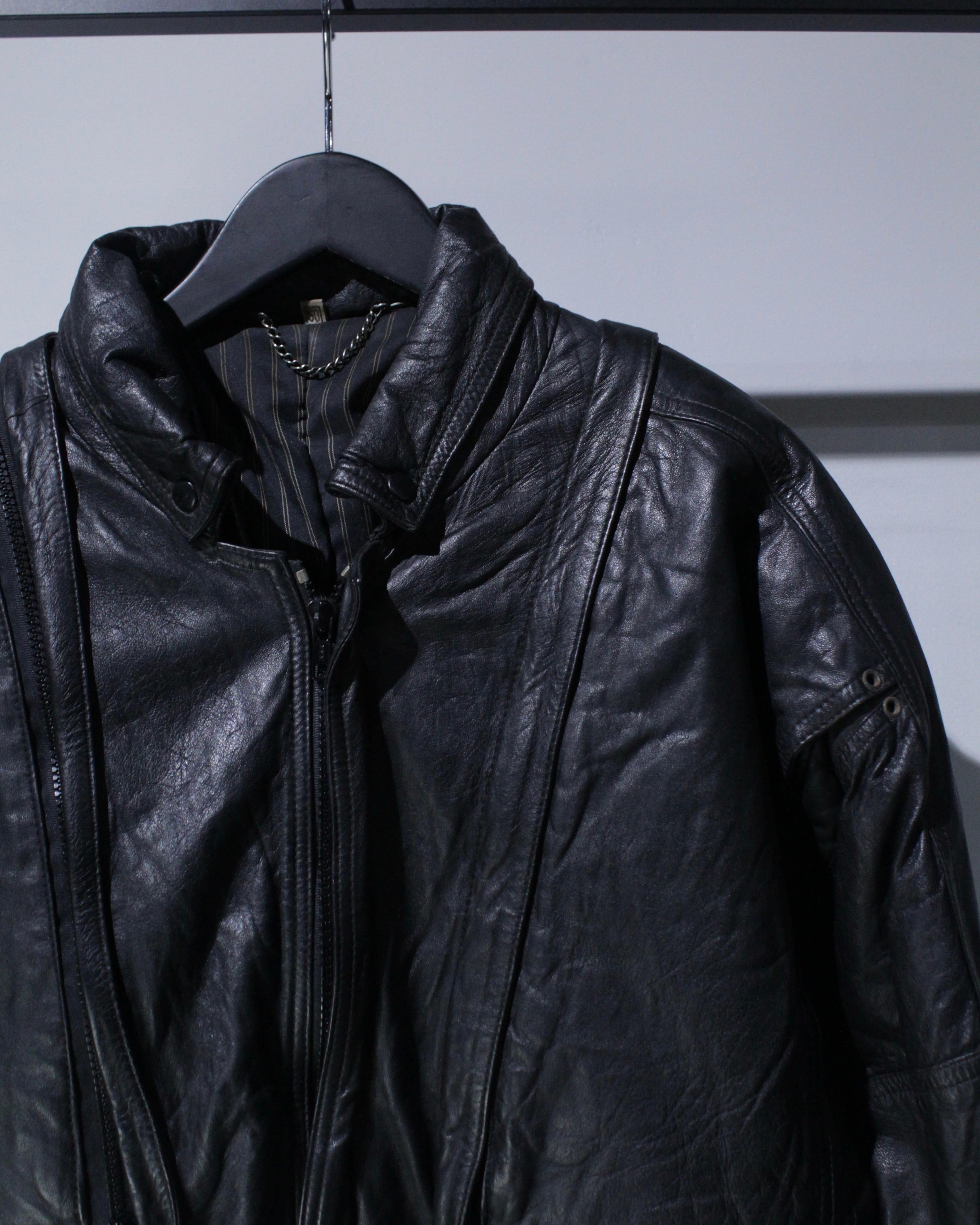 目玉は、なんと言ってもアーム部分をジップで着脱できる変形ギミック。袖を外せば一気にレザーベストへとフォームチェンジし、インナーの色やレイヤードによってまったく違う表情を見せてくれます。