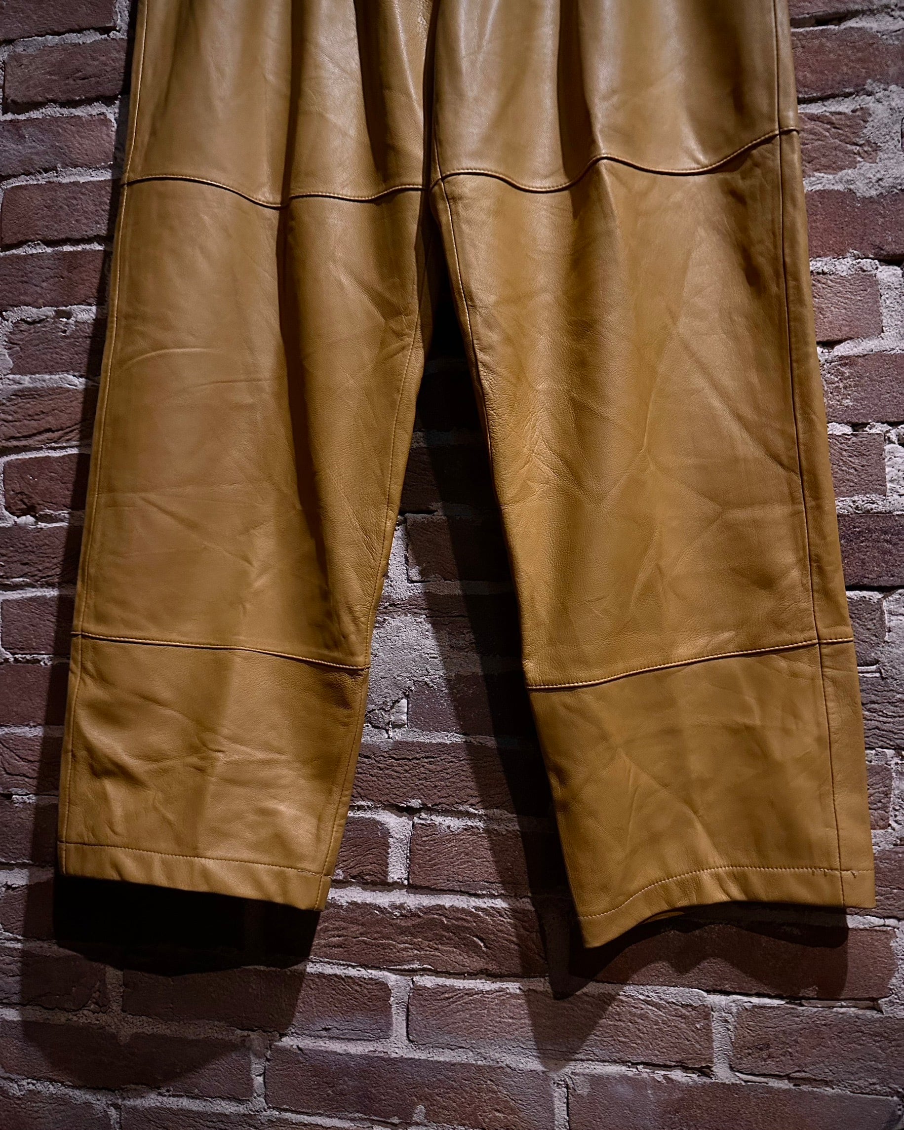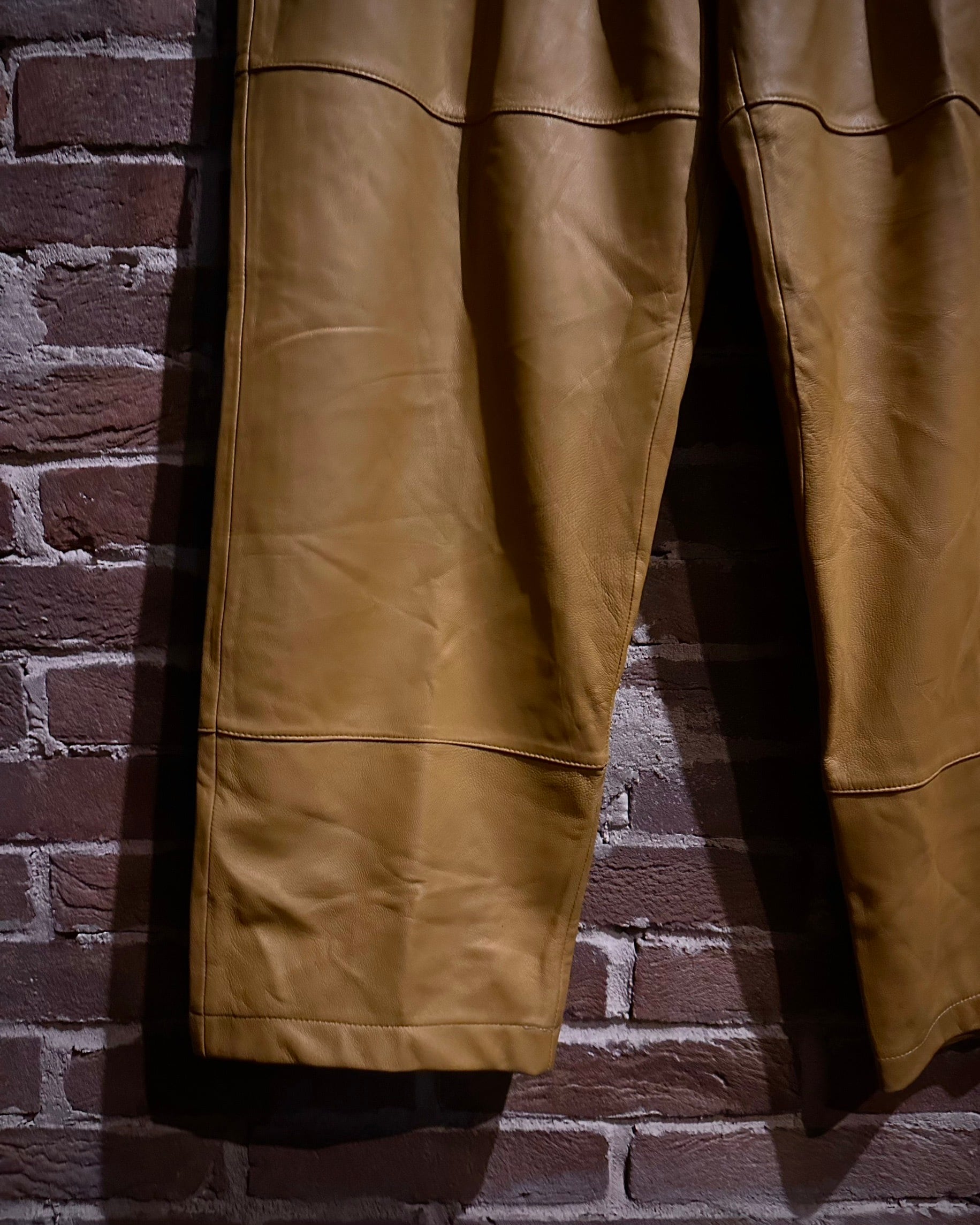 しなやかで柔らかなレザー特有のドレープが美しく、動きに合わせて陰影を生みます。フロントにはタックを備え、腰周りに程よいゆとりを持たせたワイドシルエット。レザー特有の重さを感じさせずにストンと落ちるラインが実に秀逸です。