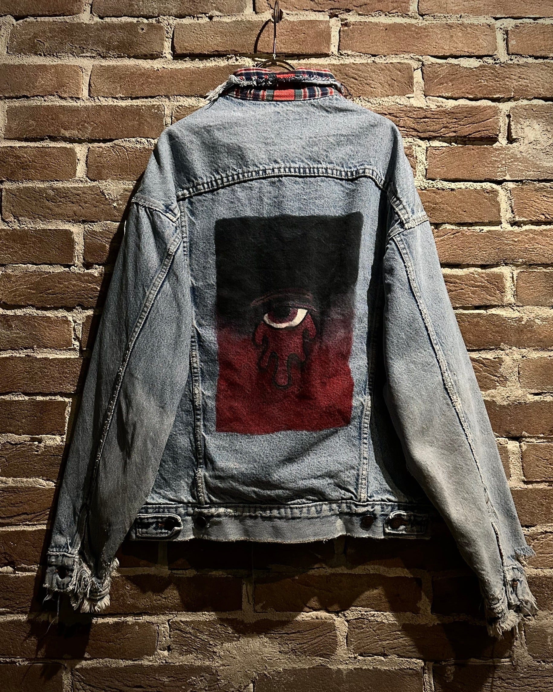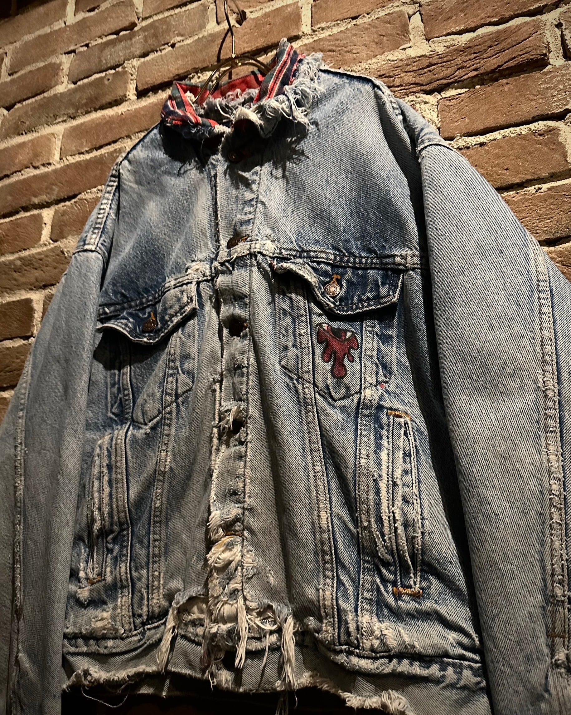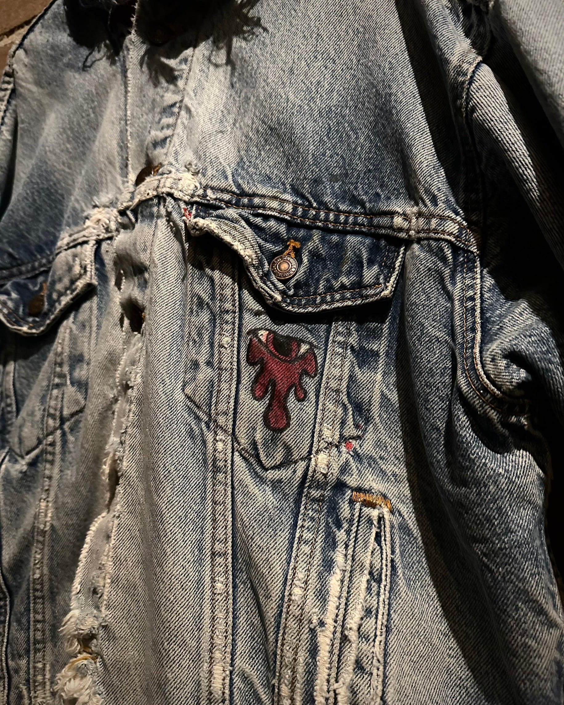 ベースはLevi’sのデニムジャケット。長年の着用で育った淡いブルーのフェード、前立て、袖先、裾に走るボロ具合など、リアルな経年変化が全体に広がり、ハンドドローイングの世界観と完璧に噛み合っています。裏地のチェック柄もアクセントに。