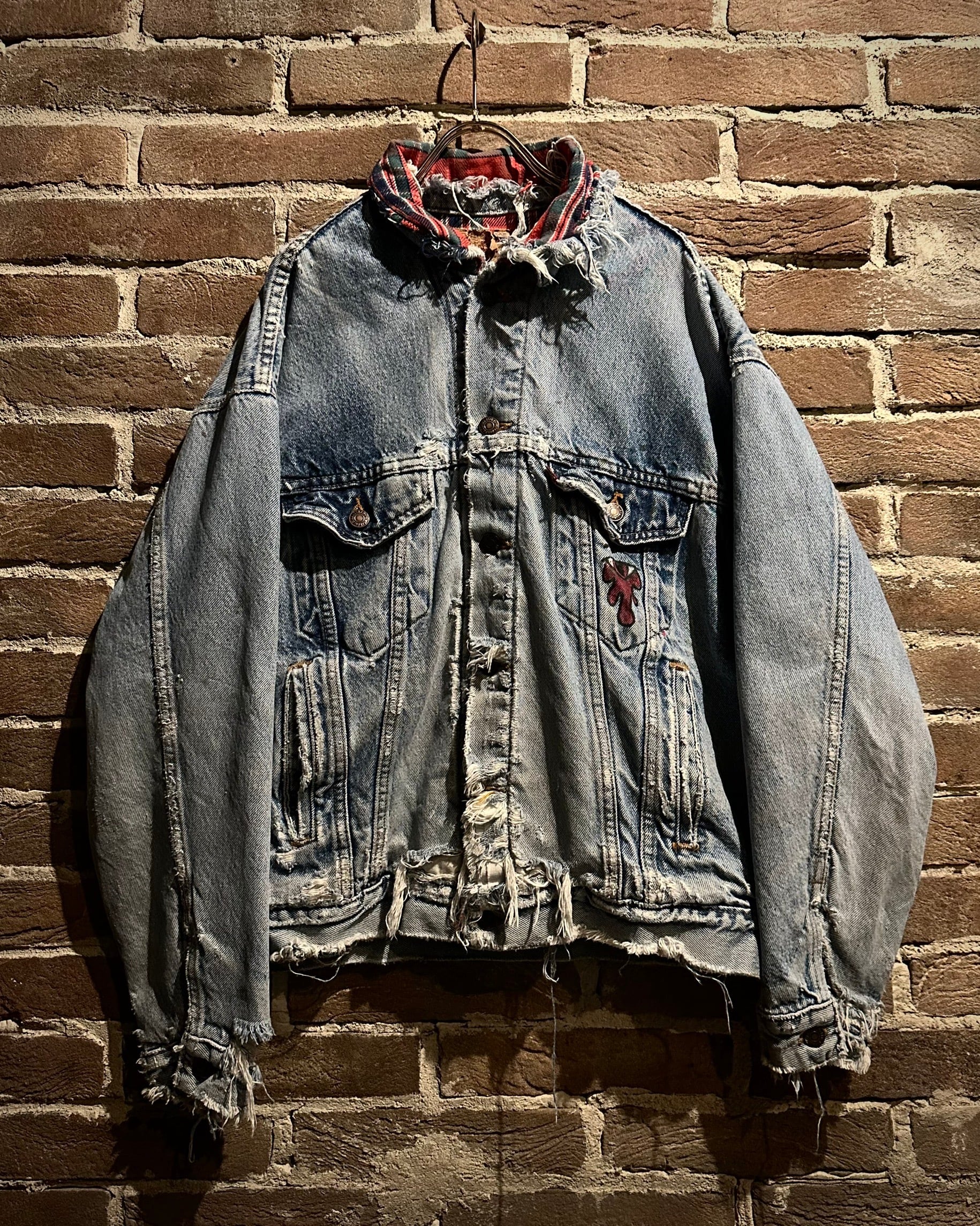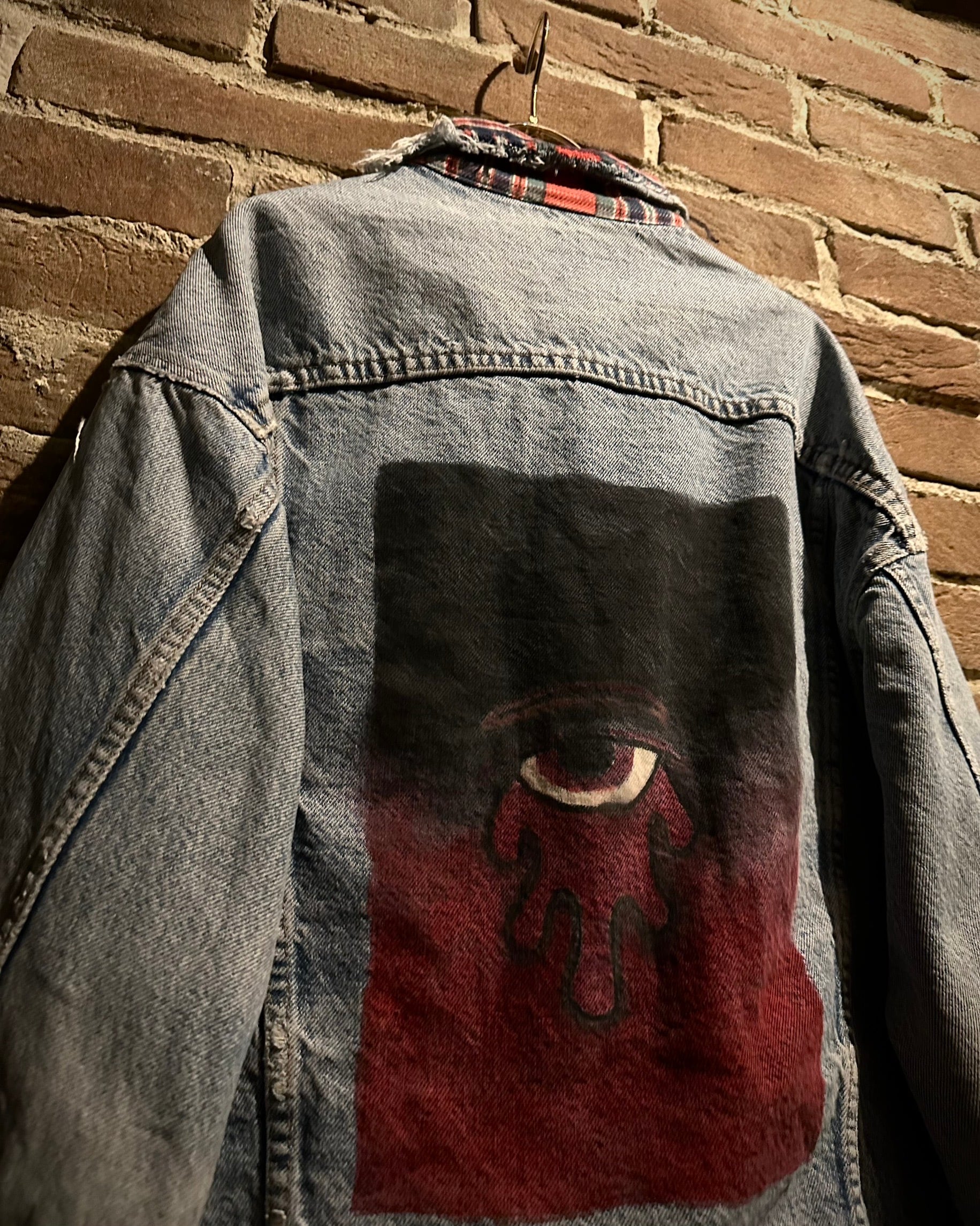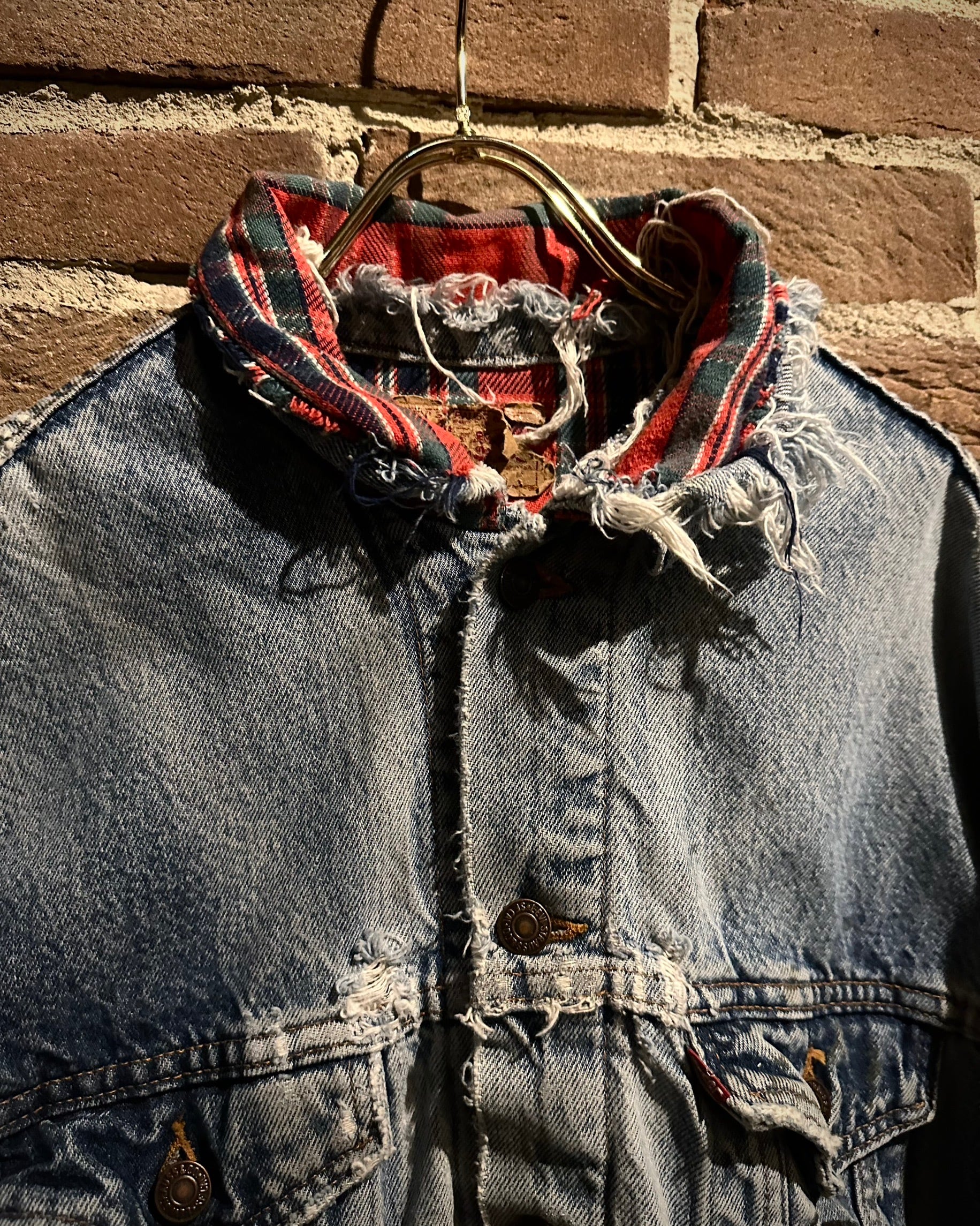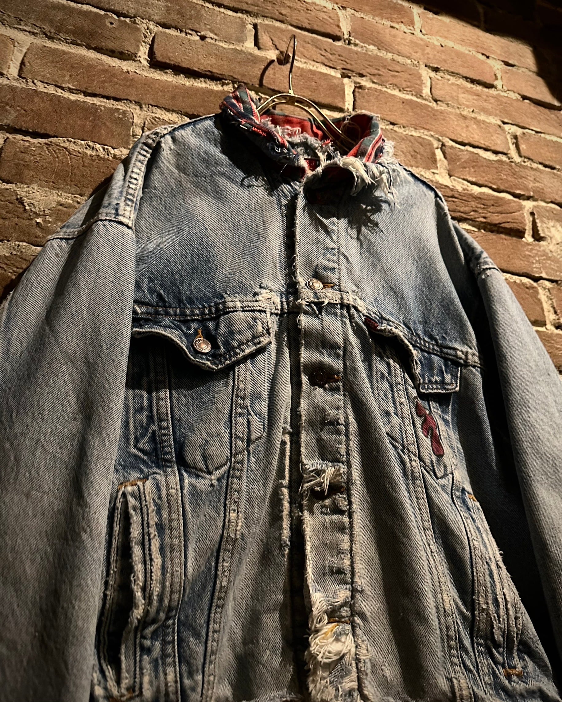 ベースはLevi’sのデニムジャケット。長年の着用で育った淡いブルーのフェード、前立て、袖先、裾に走るボロ具合など、リアルな経年変化が全体に広がり、ハンドドローイングの世界観と完璧に噛み合っています。裏地のチェック柄もアクセントに。