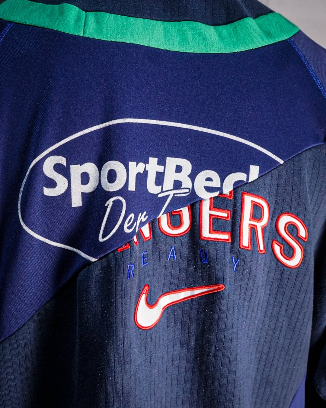 ネイビーベースのハーフジッププルオーバーに、刺繍ロゴ、プリント、ラインデザインを散りばめ、要所にスウェット生地を用いて複雑な切り替えラインを入れた逸品。