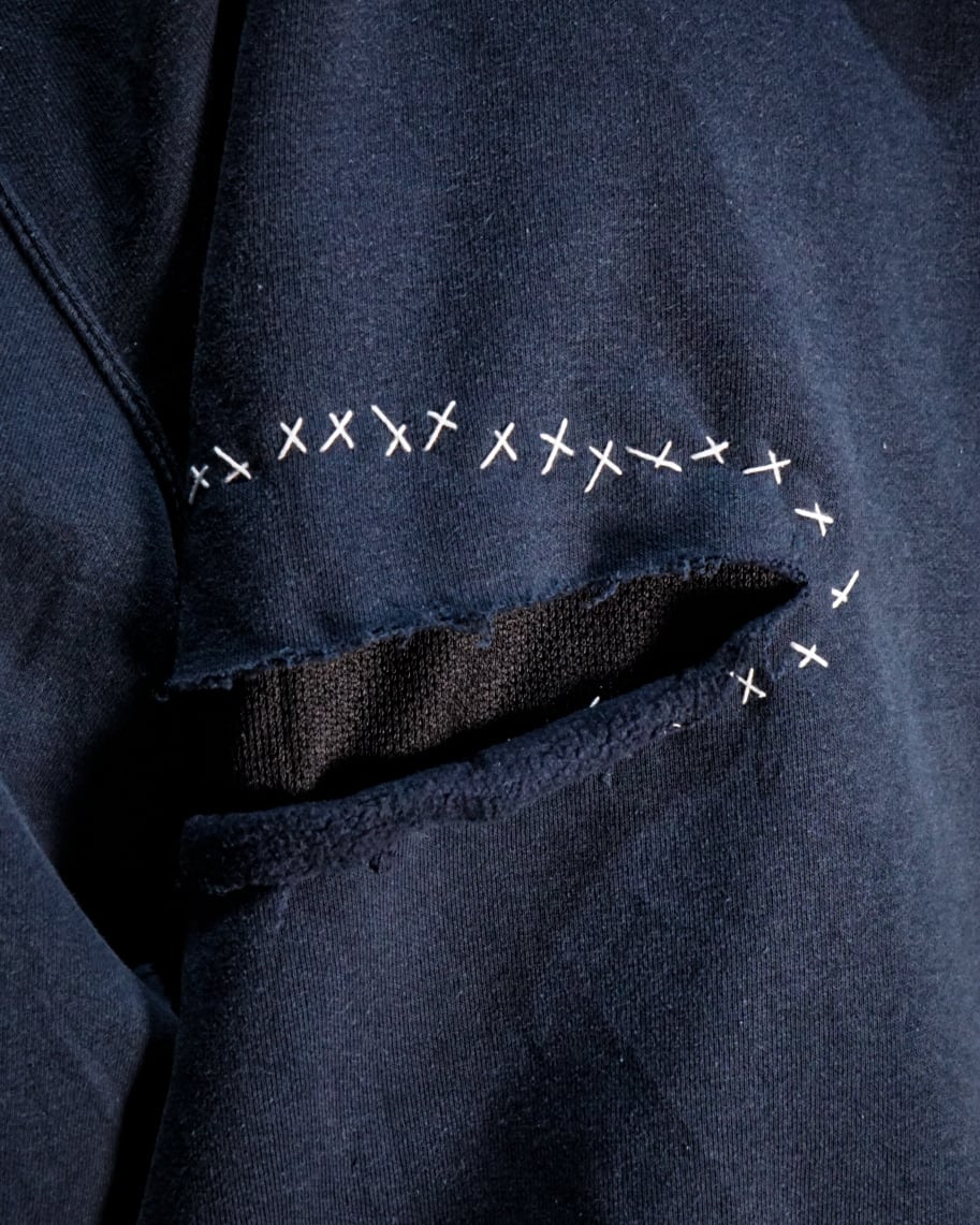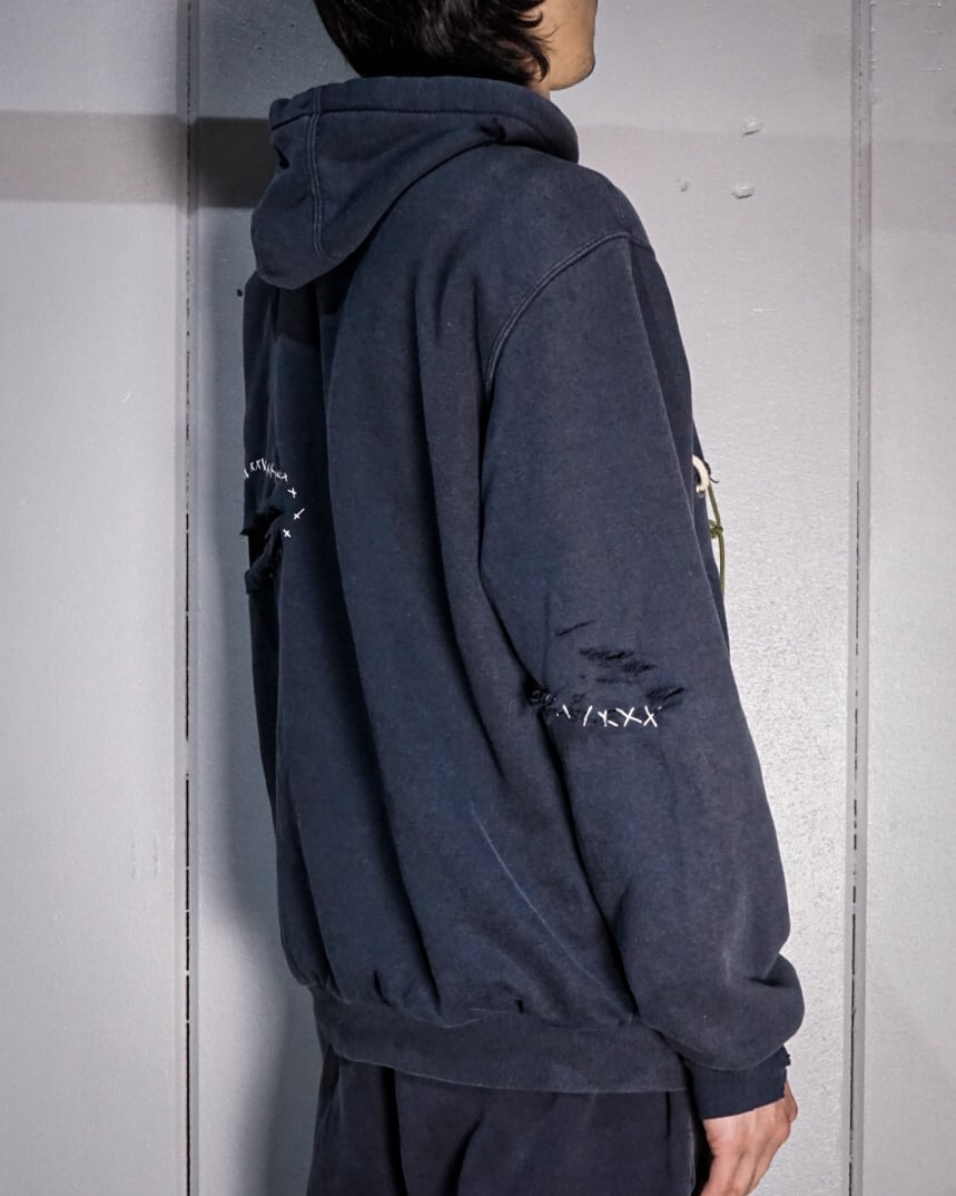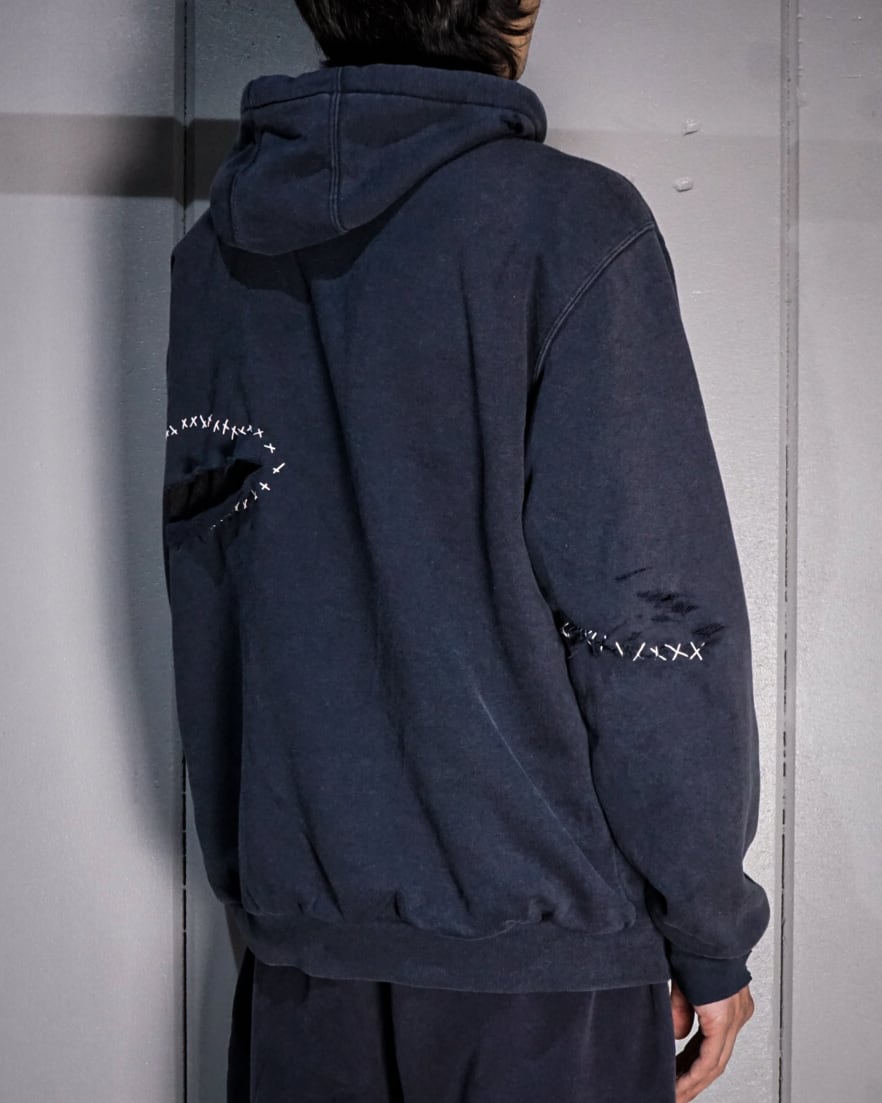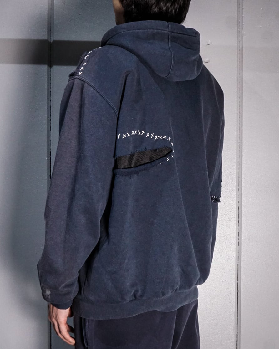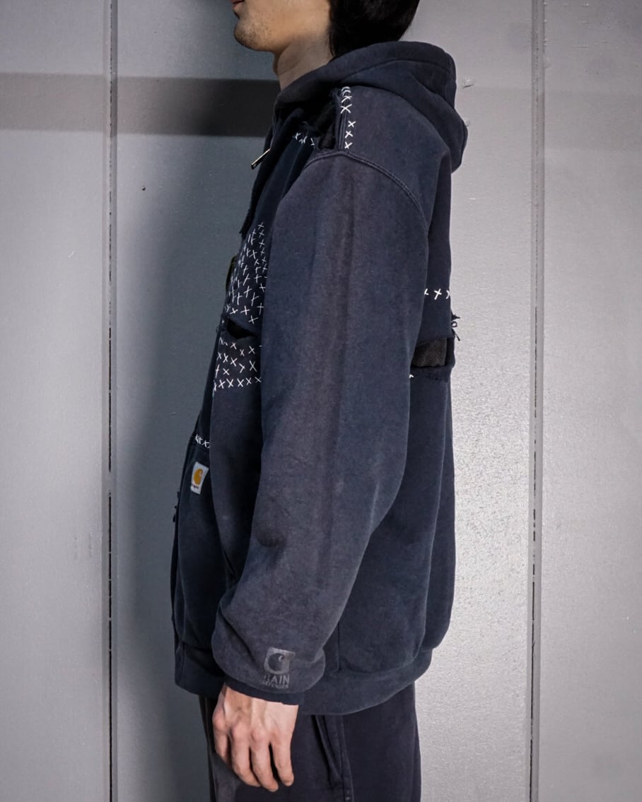 Carharttのジップフーディをボディに用い、ダメージ×リペア加工やハトメを用いたレースアップ、刺し子風の十字状のステッチデザインを効かせた1着。