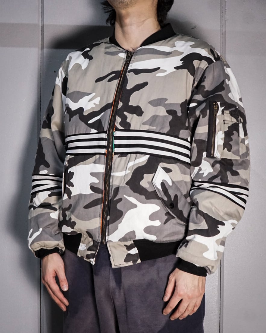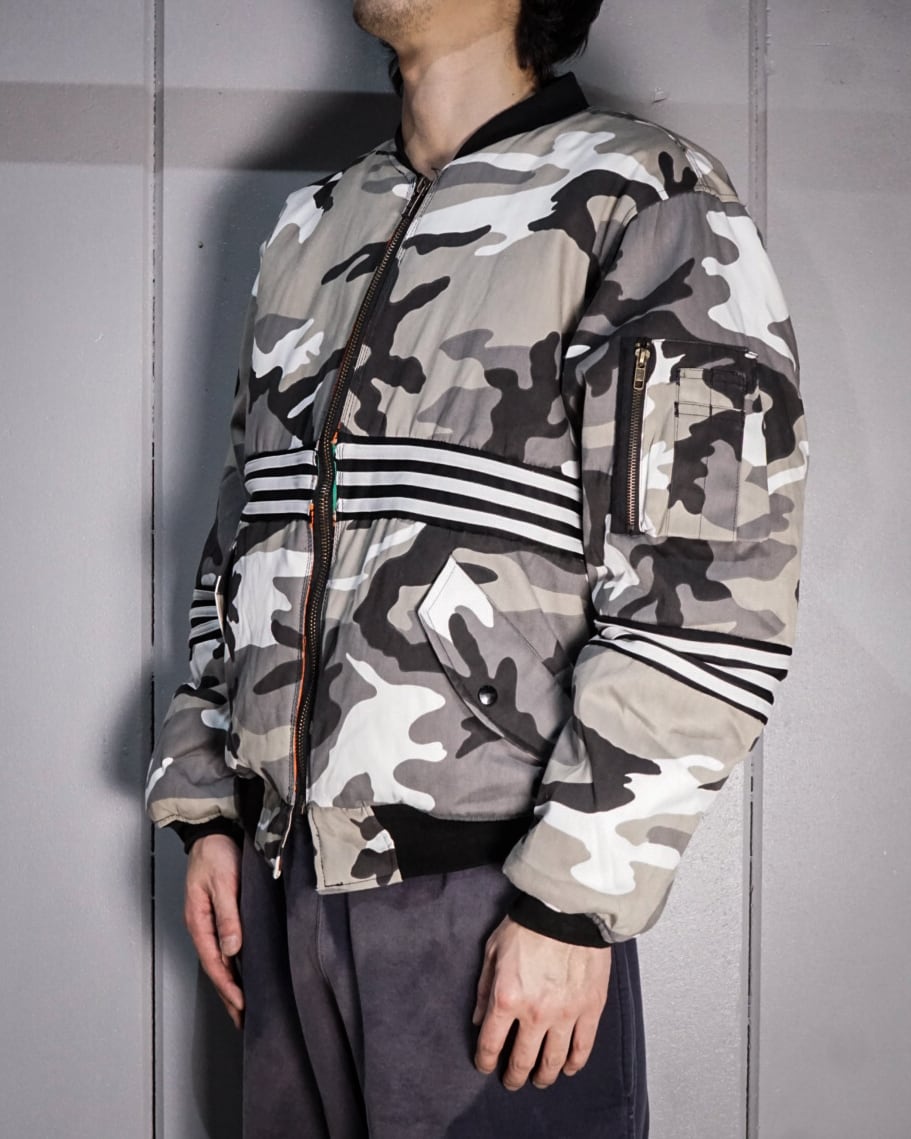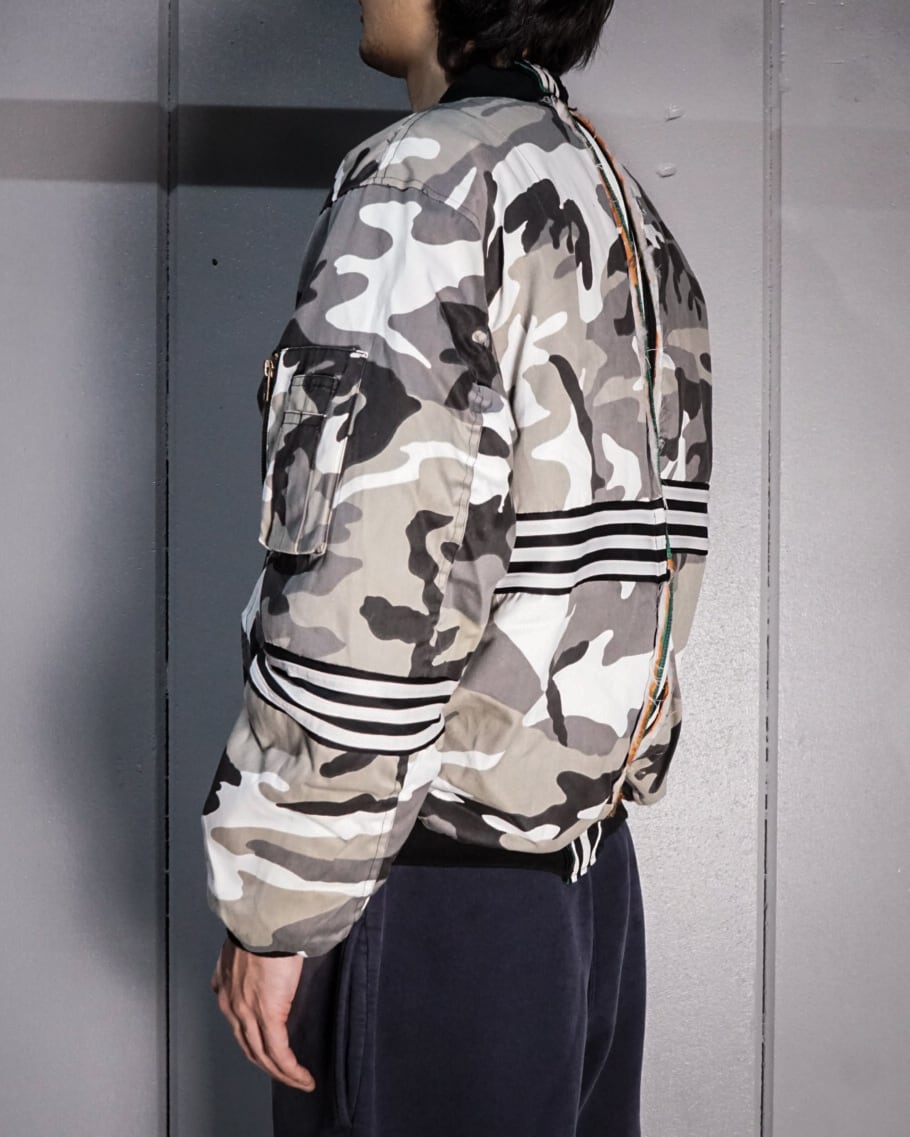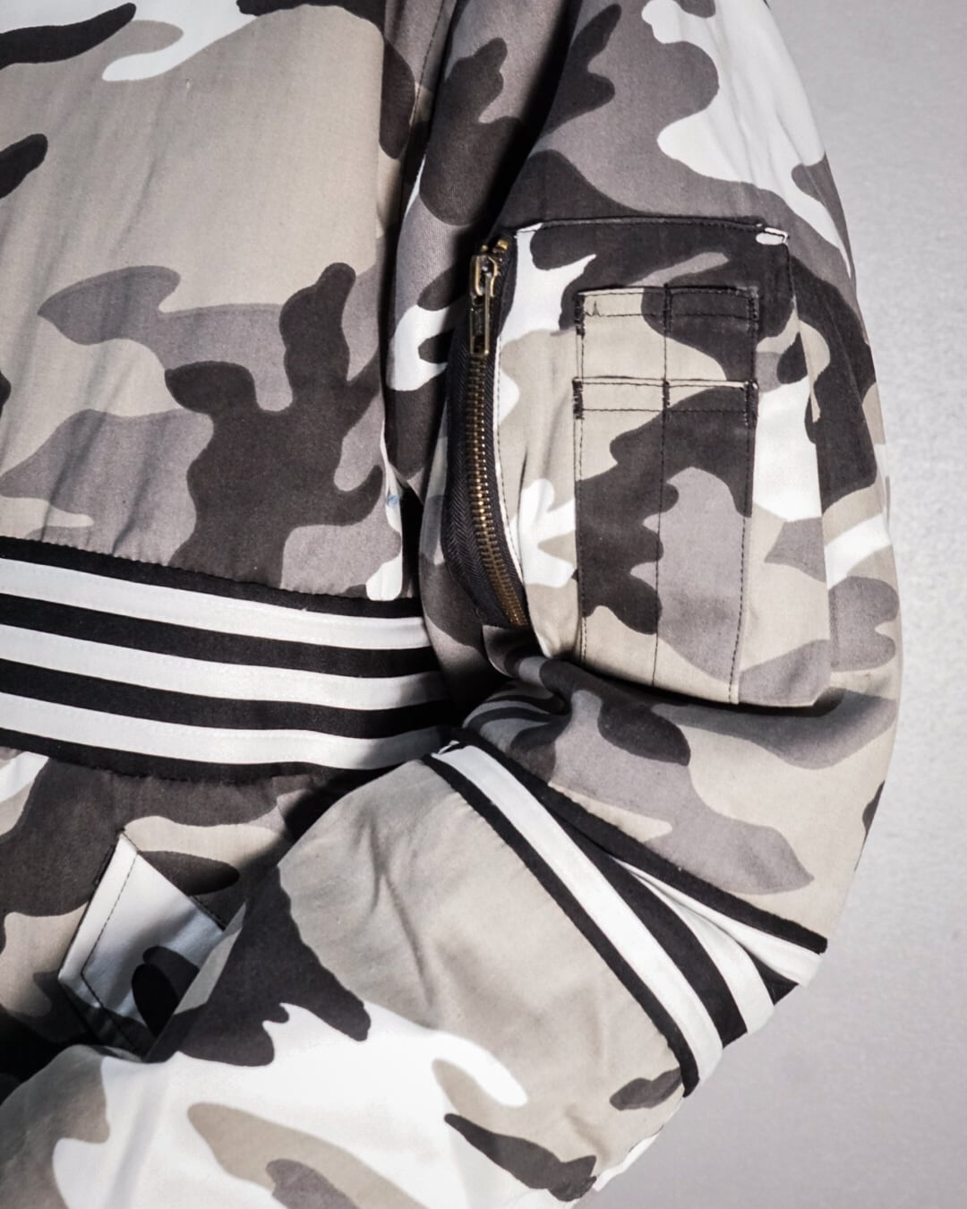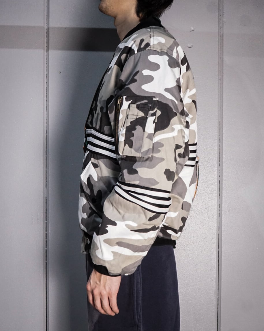 モノトーンのカモフラージュ柄を載せたボディをベースに、3ラインをフロント、背面、アームにドッキングし、見事にデザインとして組み込んだ1着。