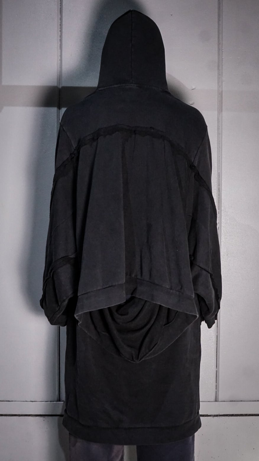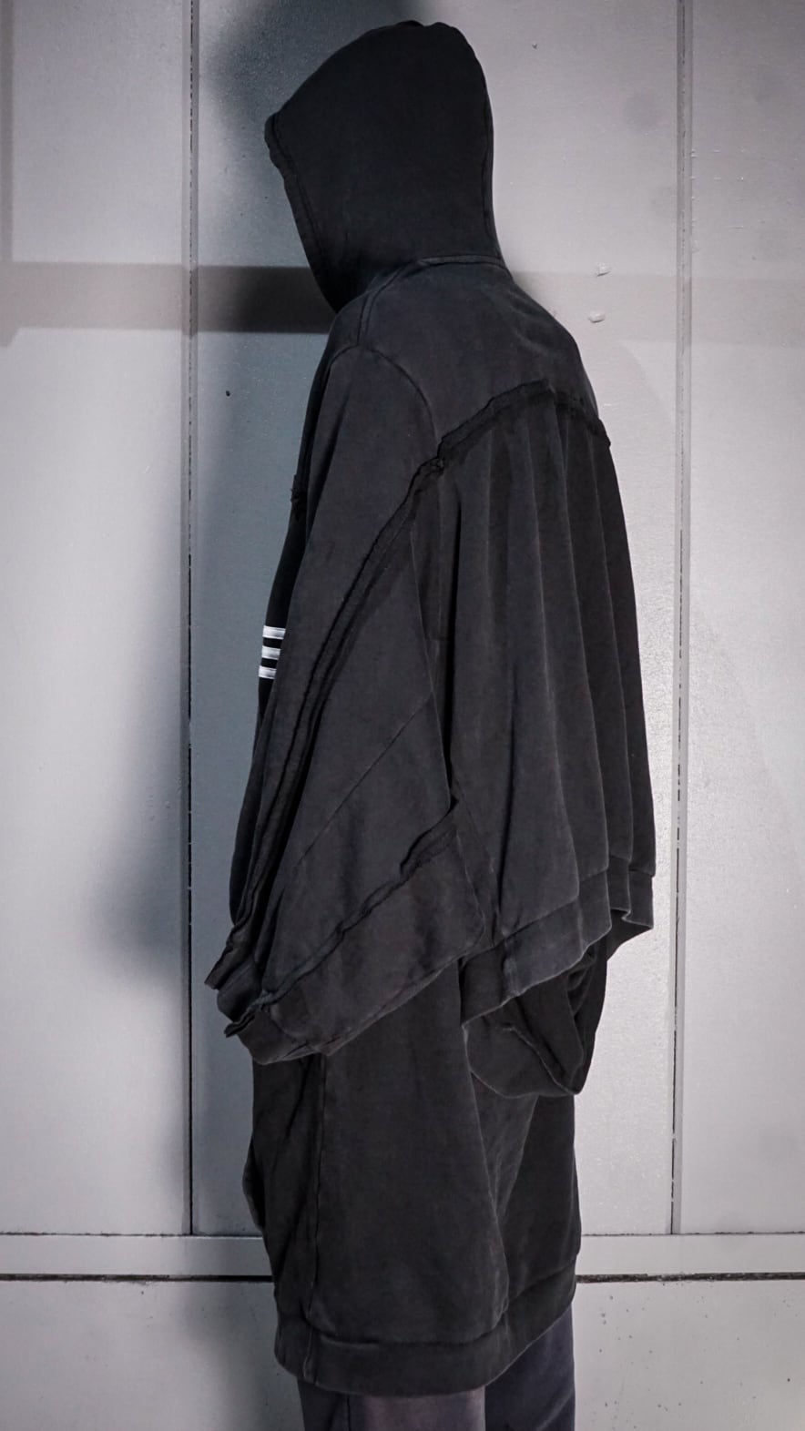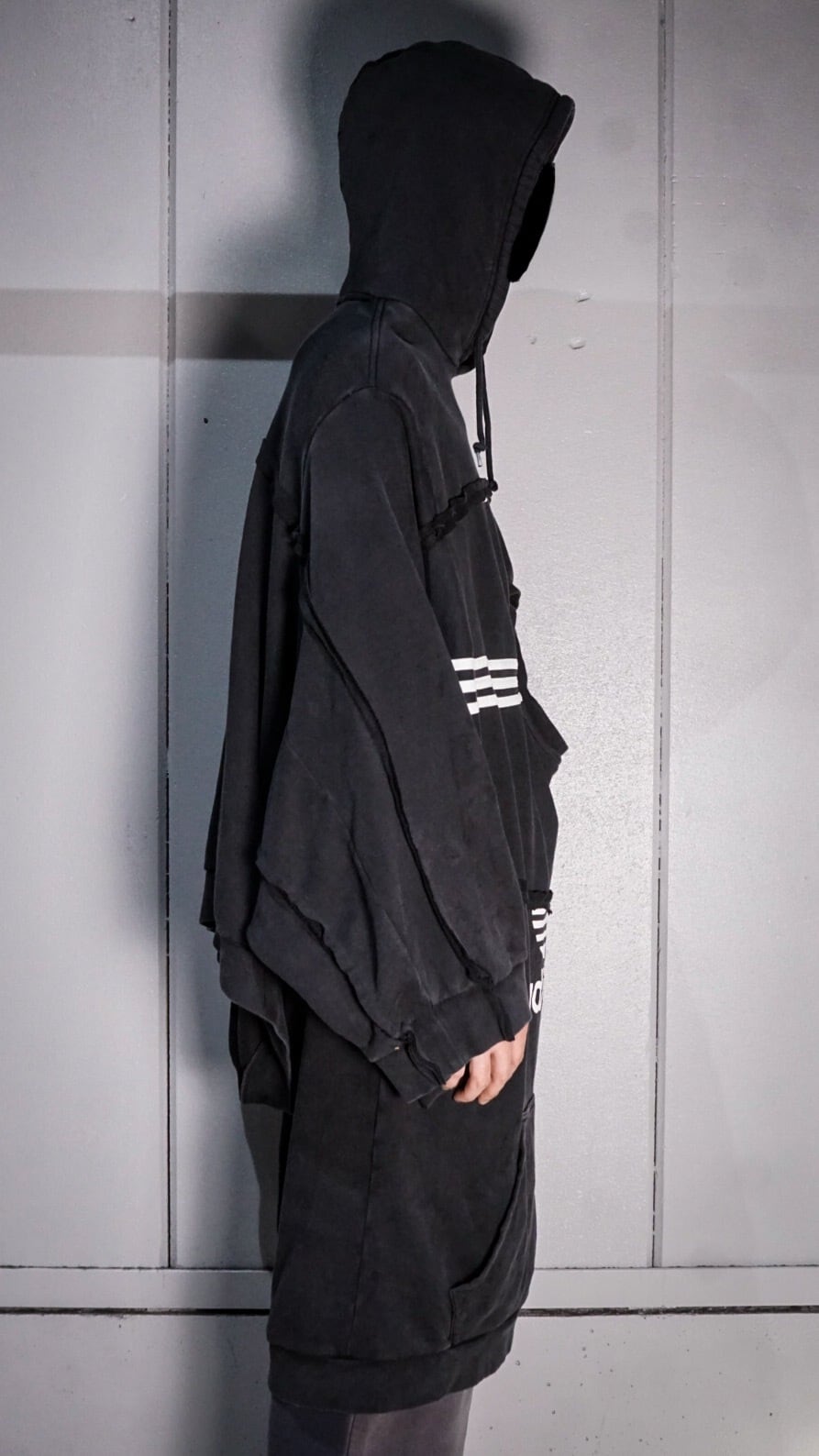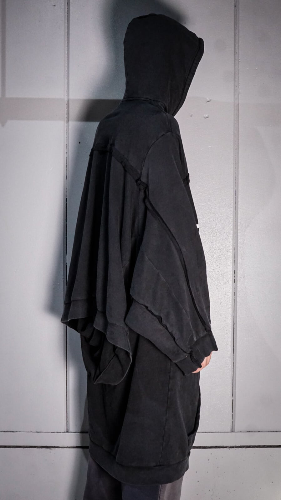 身頃からアームにかけて繋ぎ合わせることで着丈も長く、アームもたっぷりとしたオーバーサイズのゆったりとしたシルエットを演出。