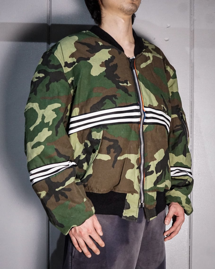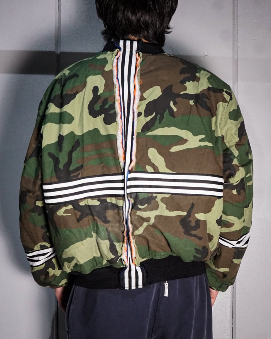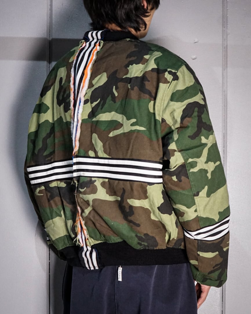 カーキのカモフラージュ柄を載せたボディをベースに、3ラインをフロント、背面、アームにドッキングし、見事にデザインとして組み込んだリバーシブル仕様の1着。