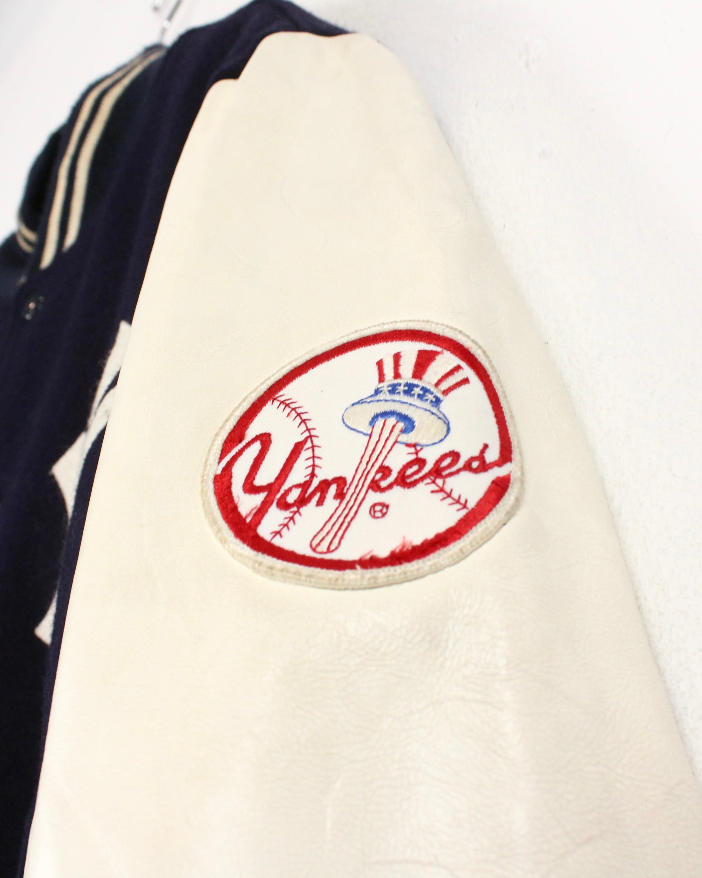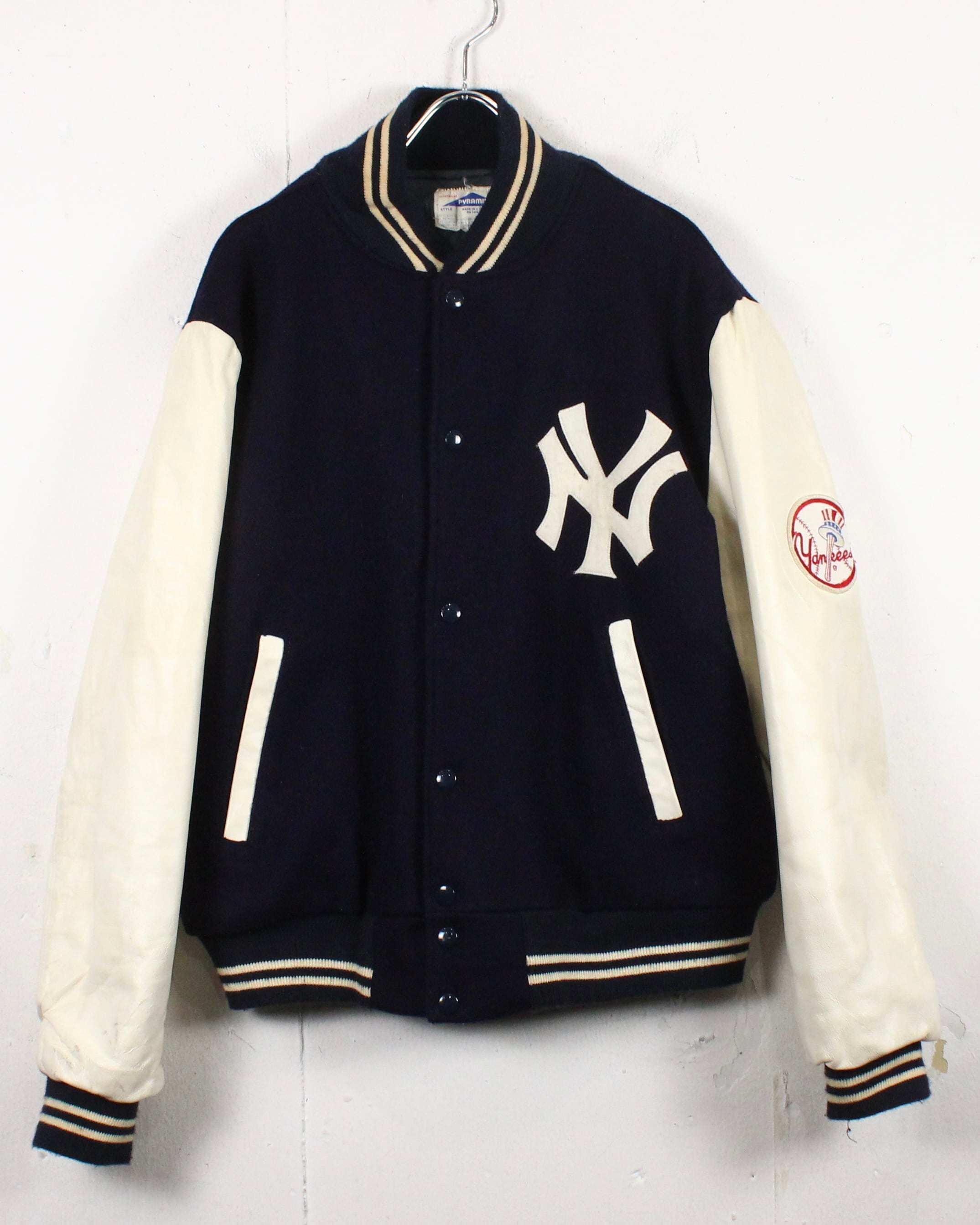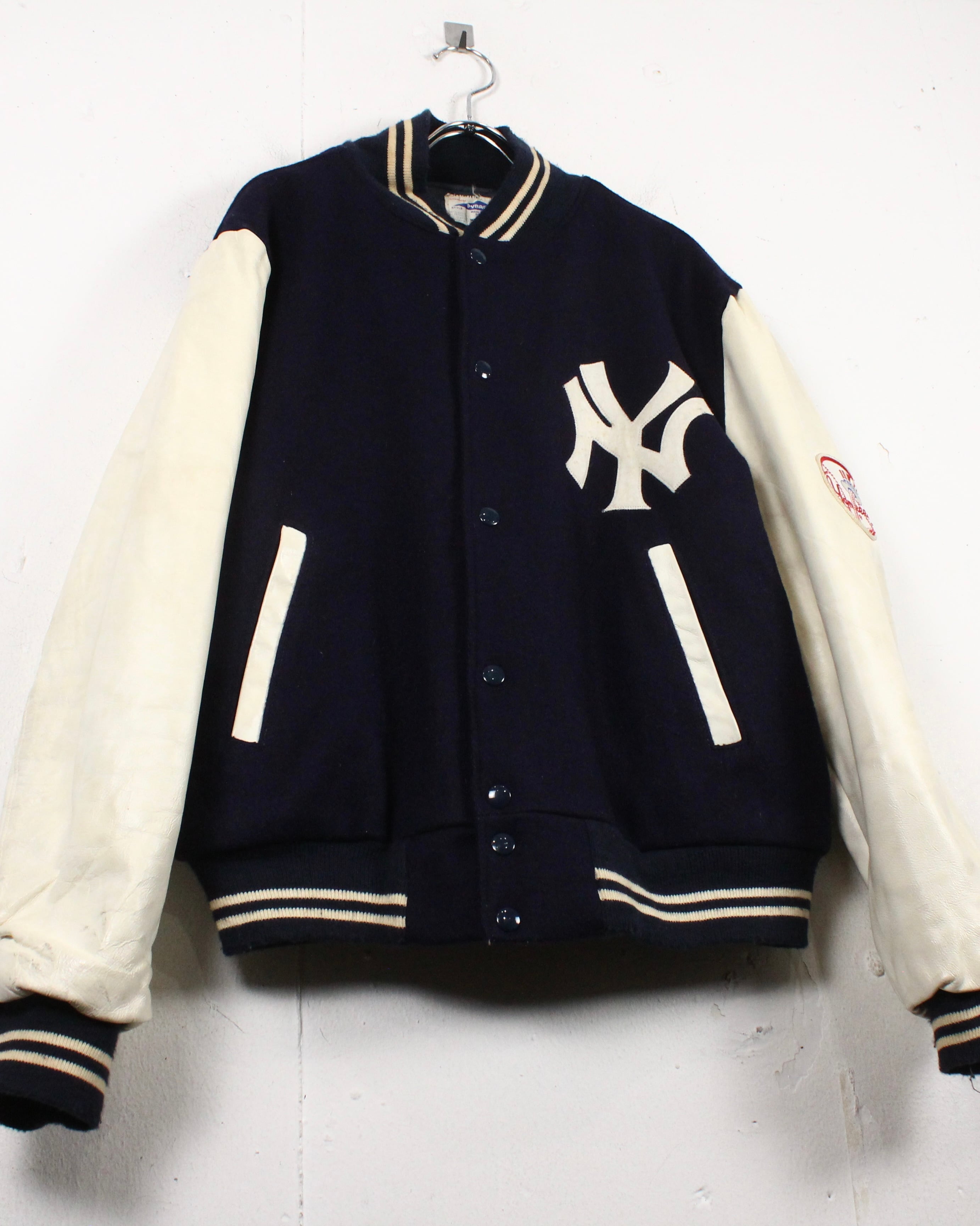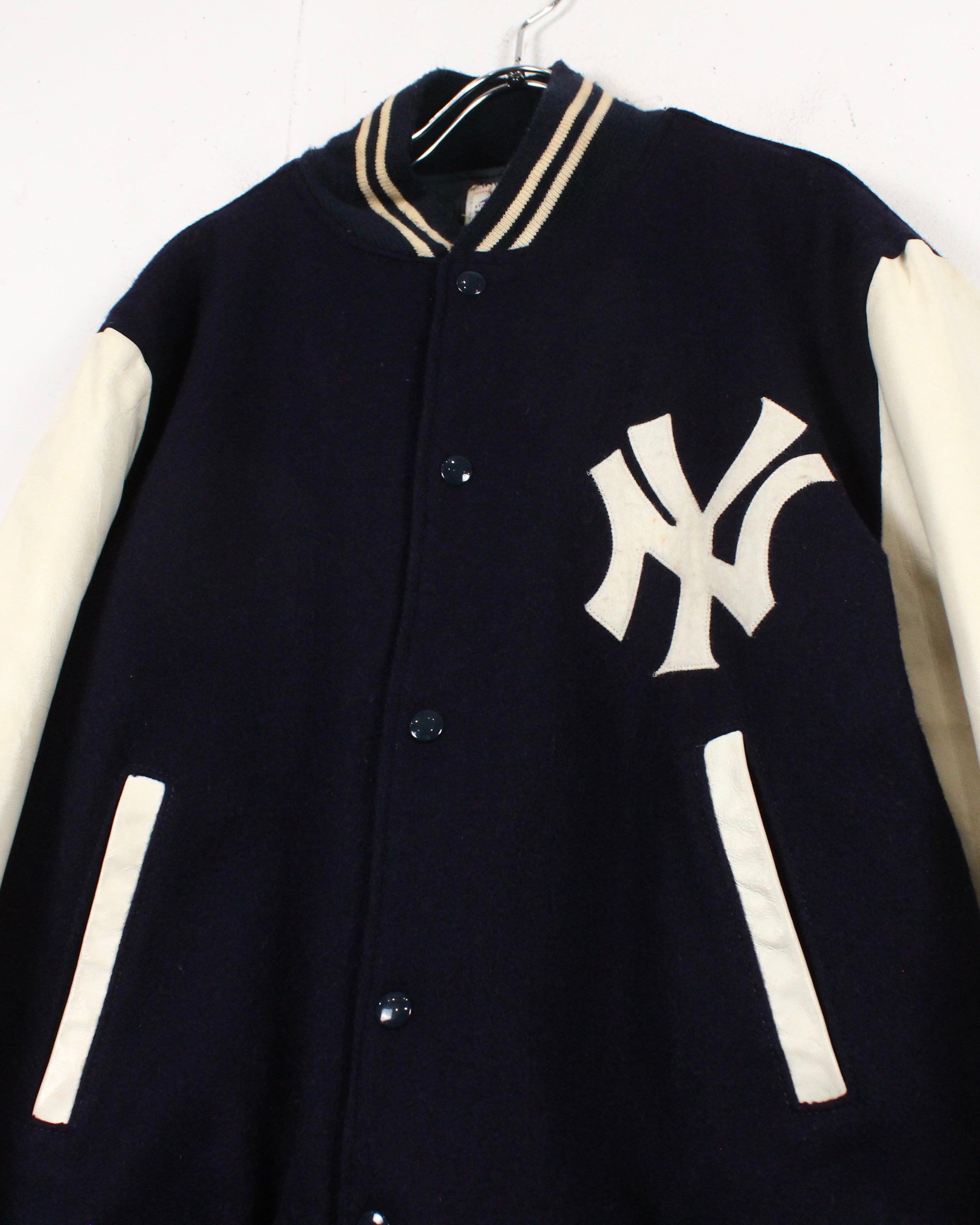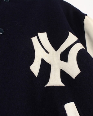 ギュッと目の詰まったネイビーのウール素材のボディに、アームにはホワイトレザーを切り替えた“NEW YORK Yankees”のバーシティジャケット。