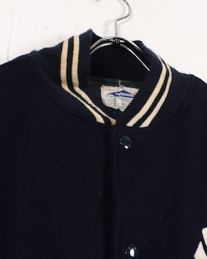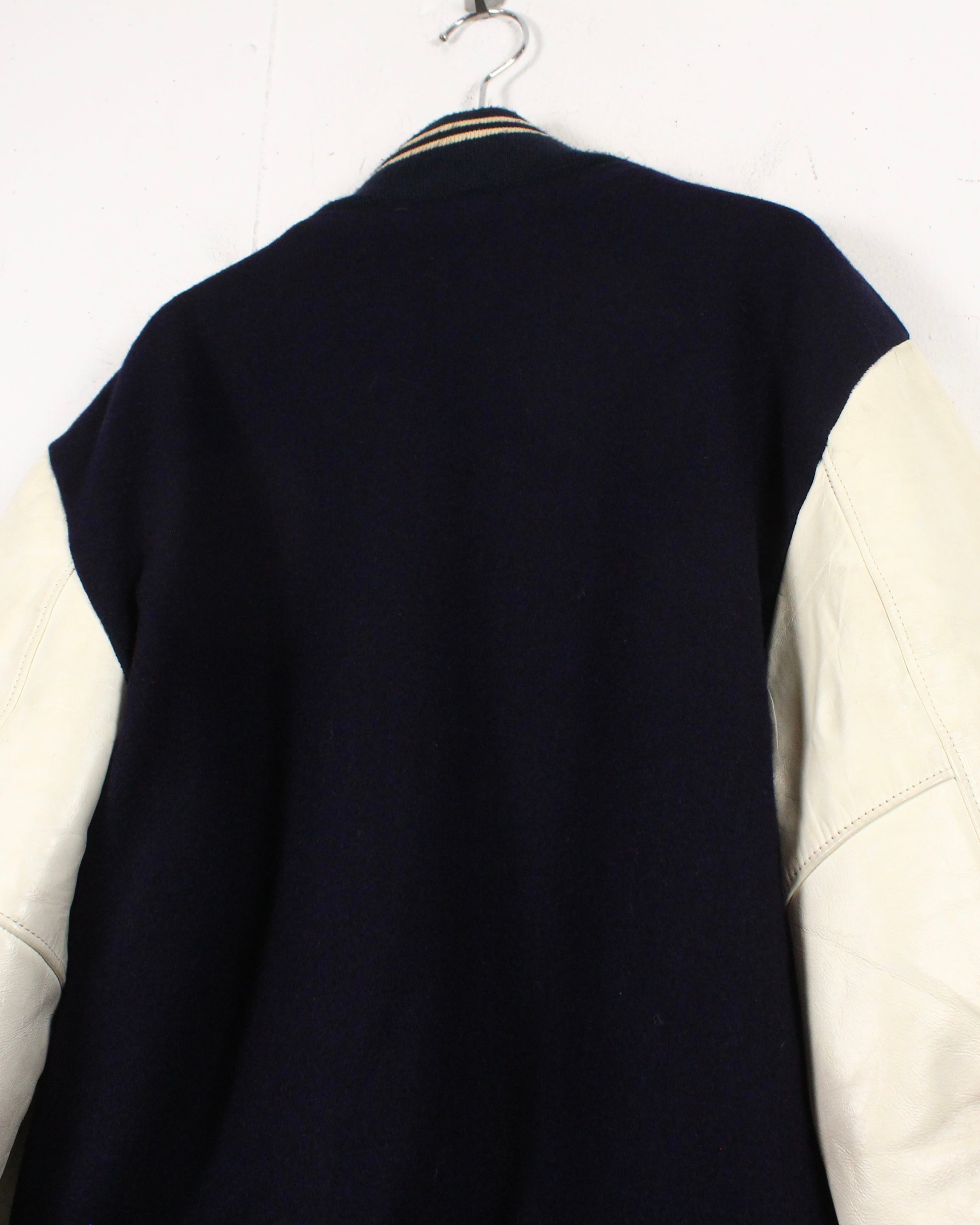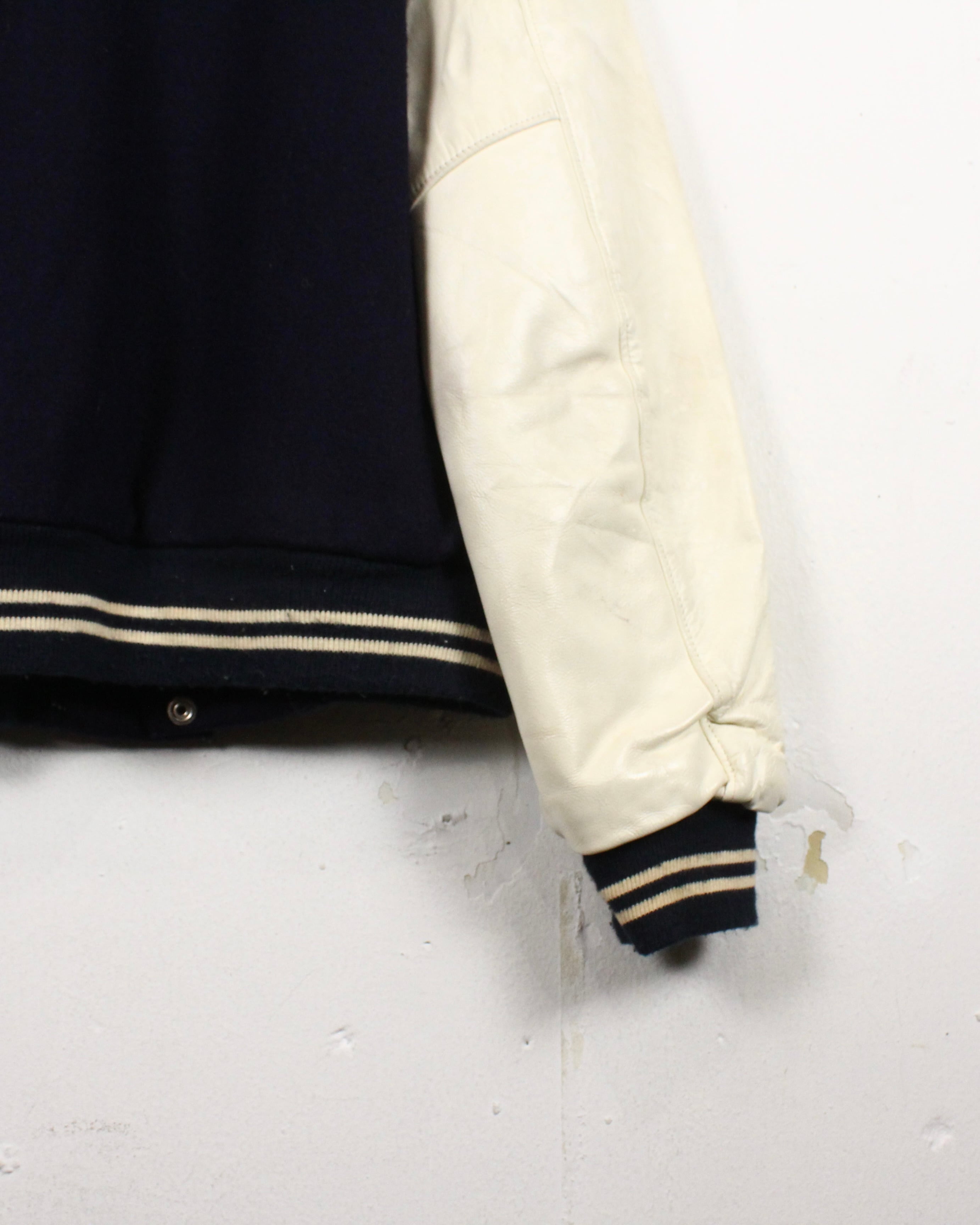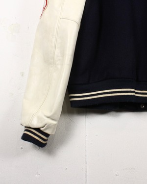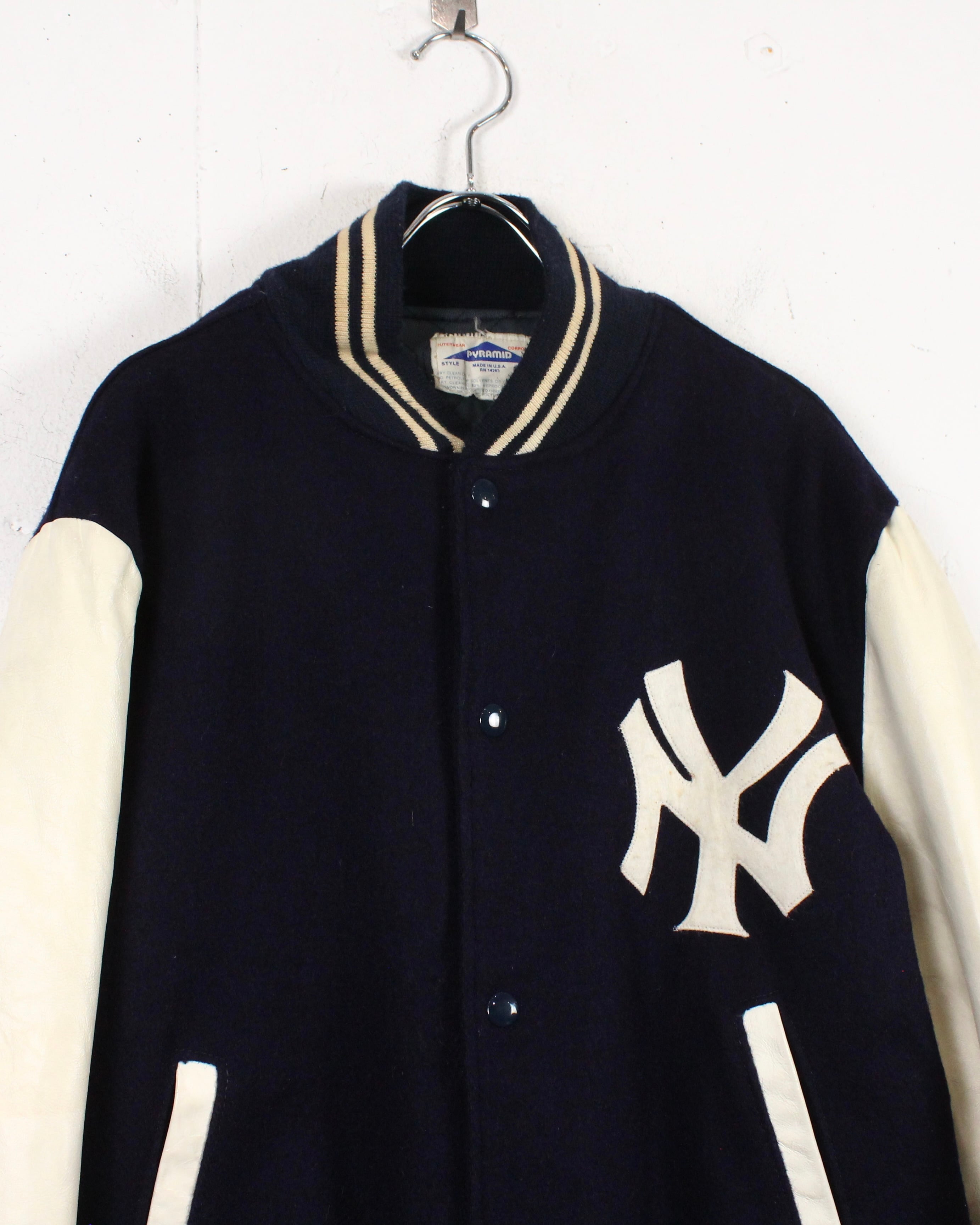 ギュッと目の詰まったネイビーのウール素材のボディに、アームにはホワイトレザーを切り替えた“NEW YORK Yankees”のバーシティジャケット。