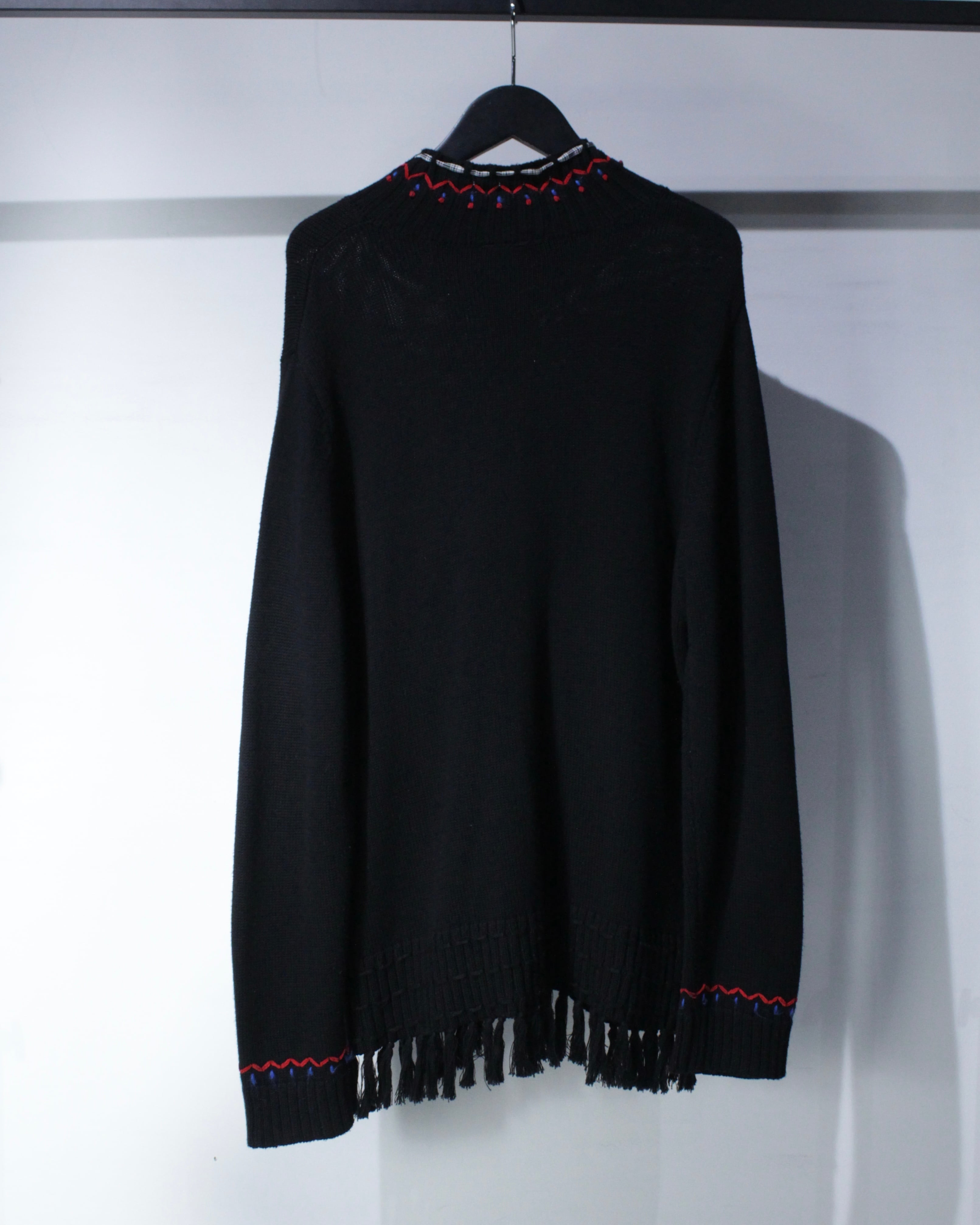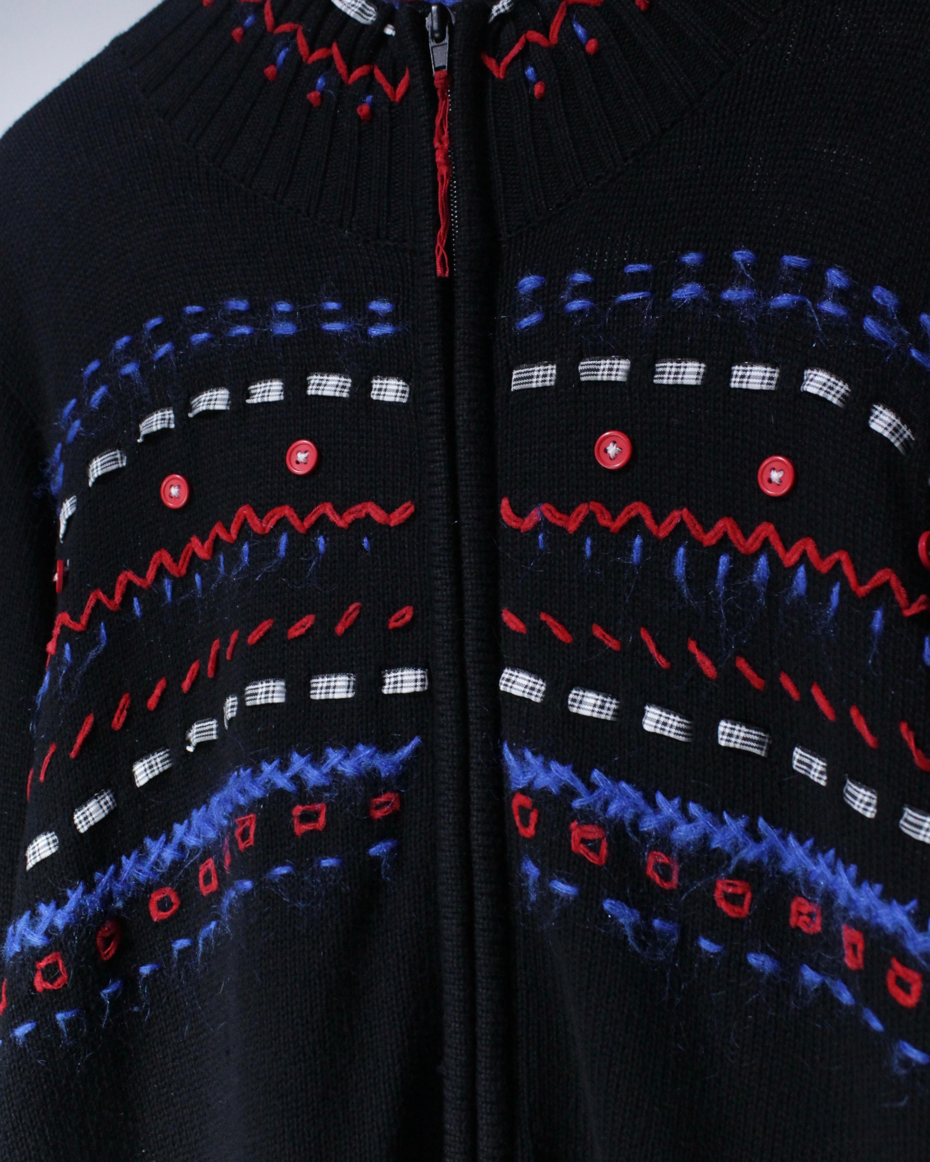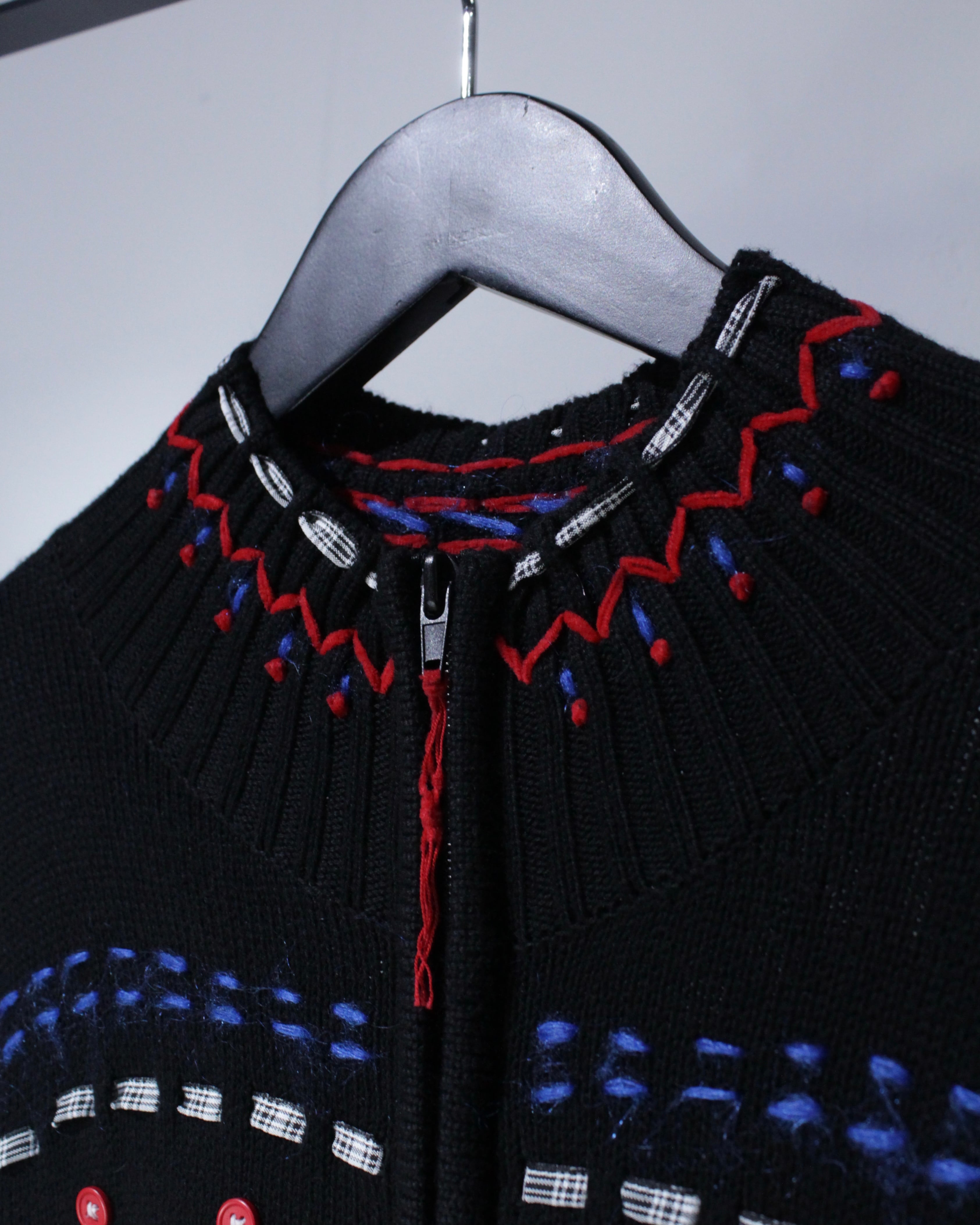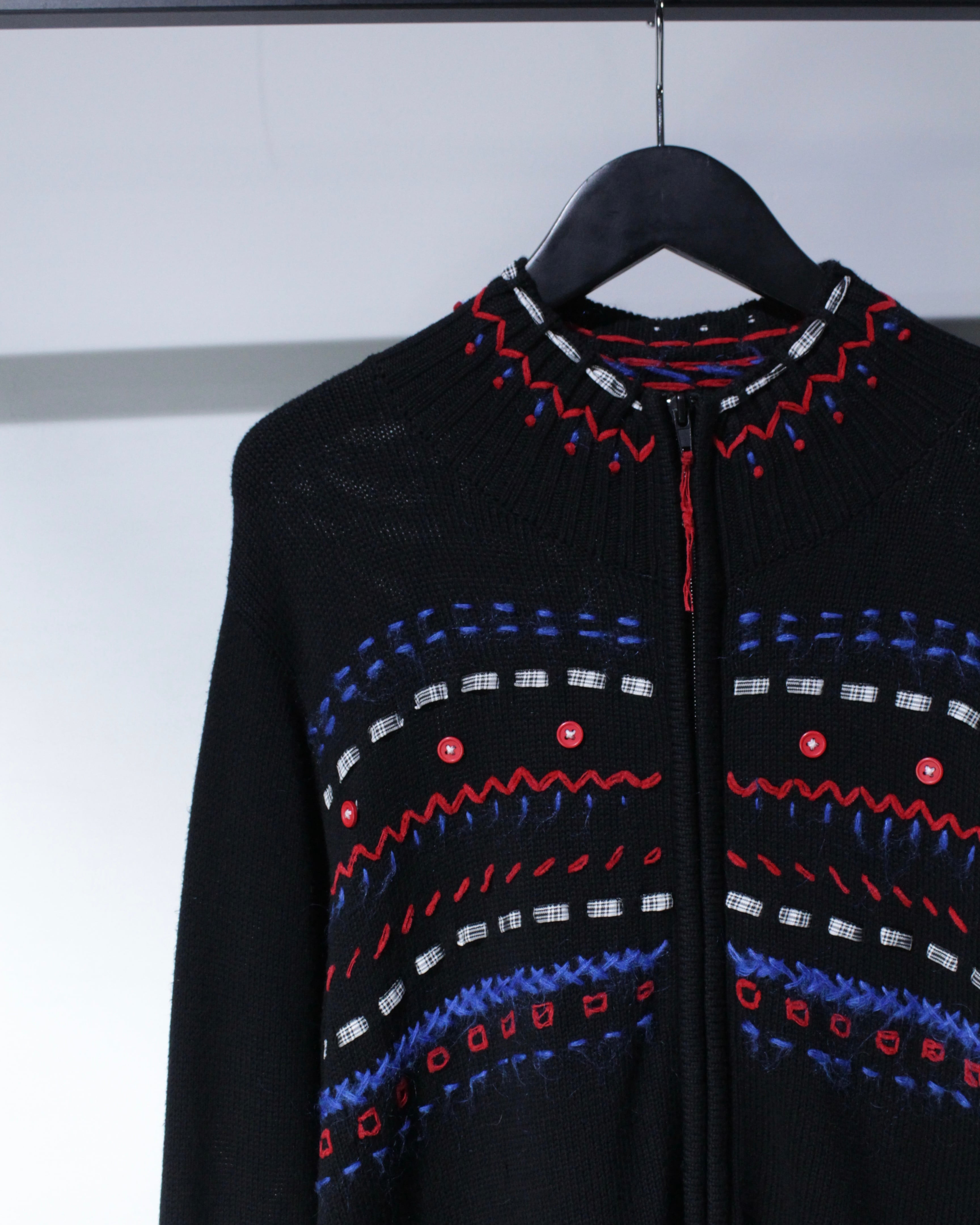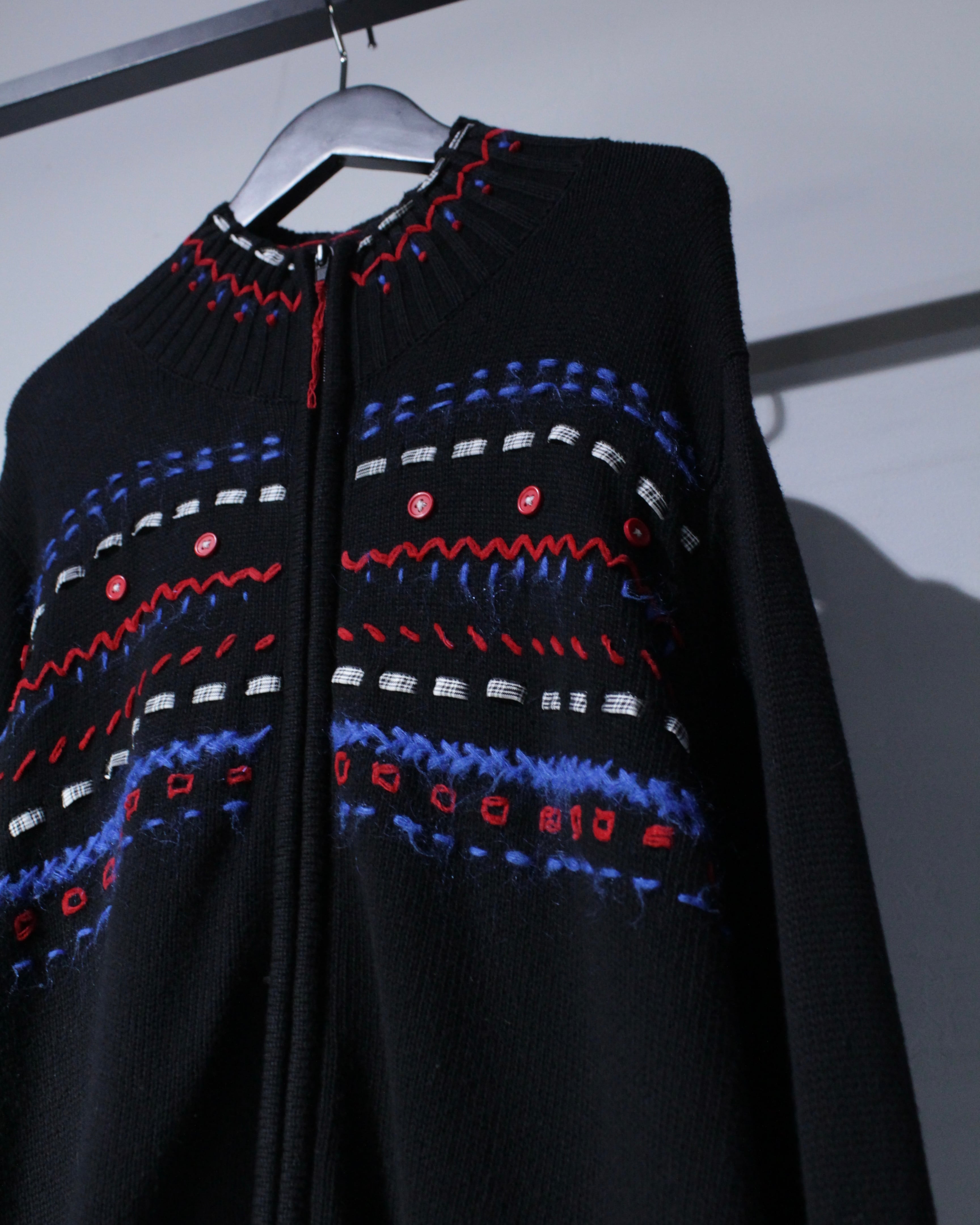 ブラックボディをキャンバスに、立体的な刺繍と編み込みを贅沢に散りばめたスペシャルなジップアップニットジャケット。