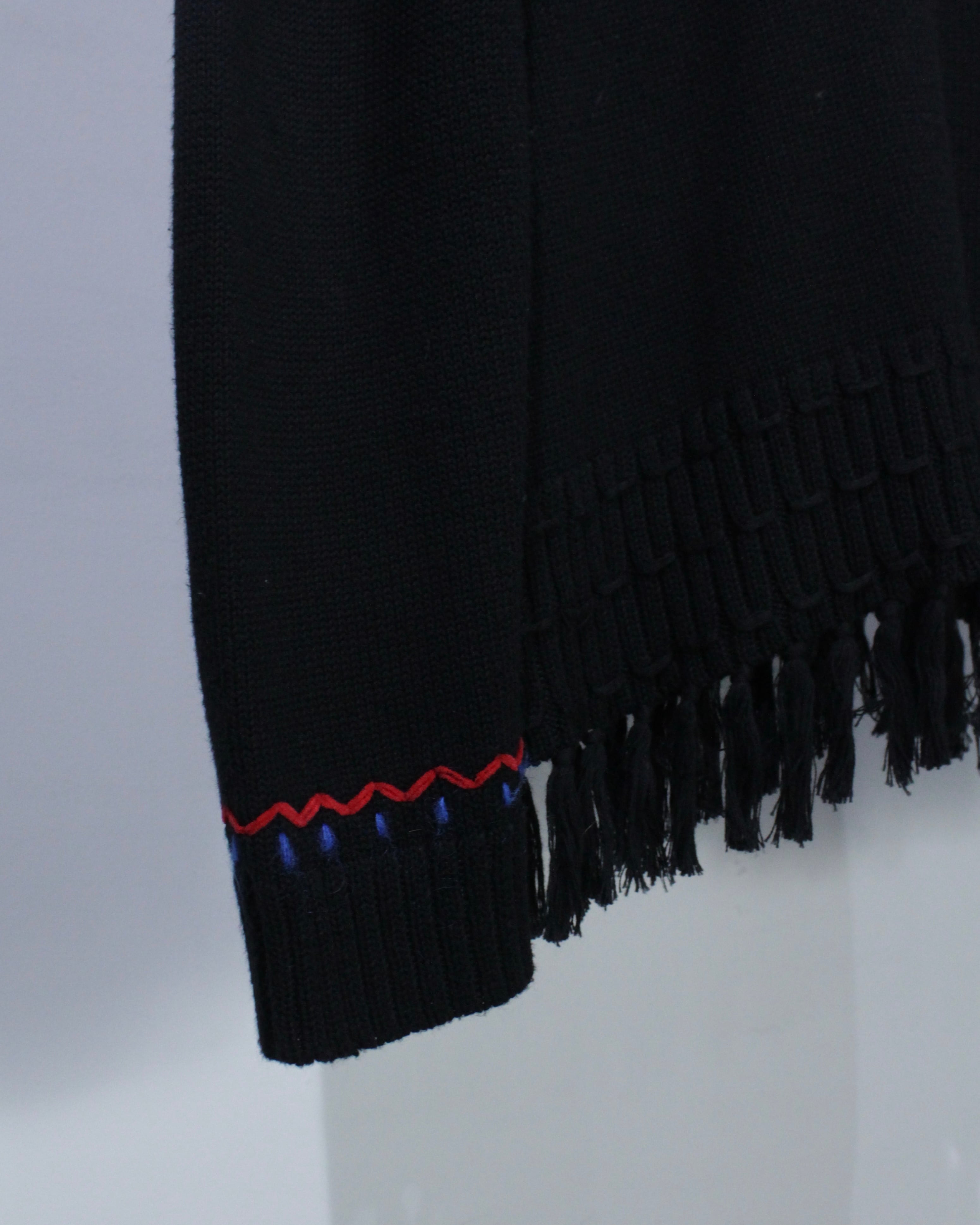 首元には赤のジグザグステッチがリズム良く走り、胸元から裾にかけては青・赤・白の糸を用いた立体的なデザイン。ボタンの装飾や細かな作り込みから、手間を惜しまない丁寧な制作が伝わります。