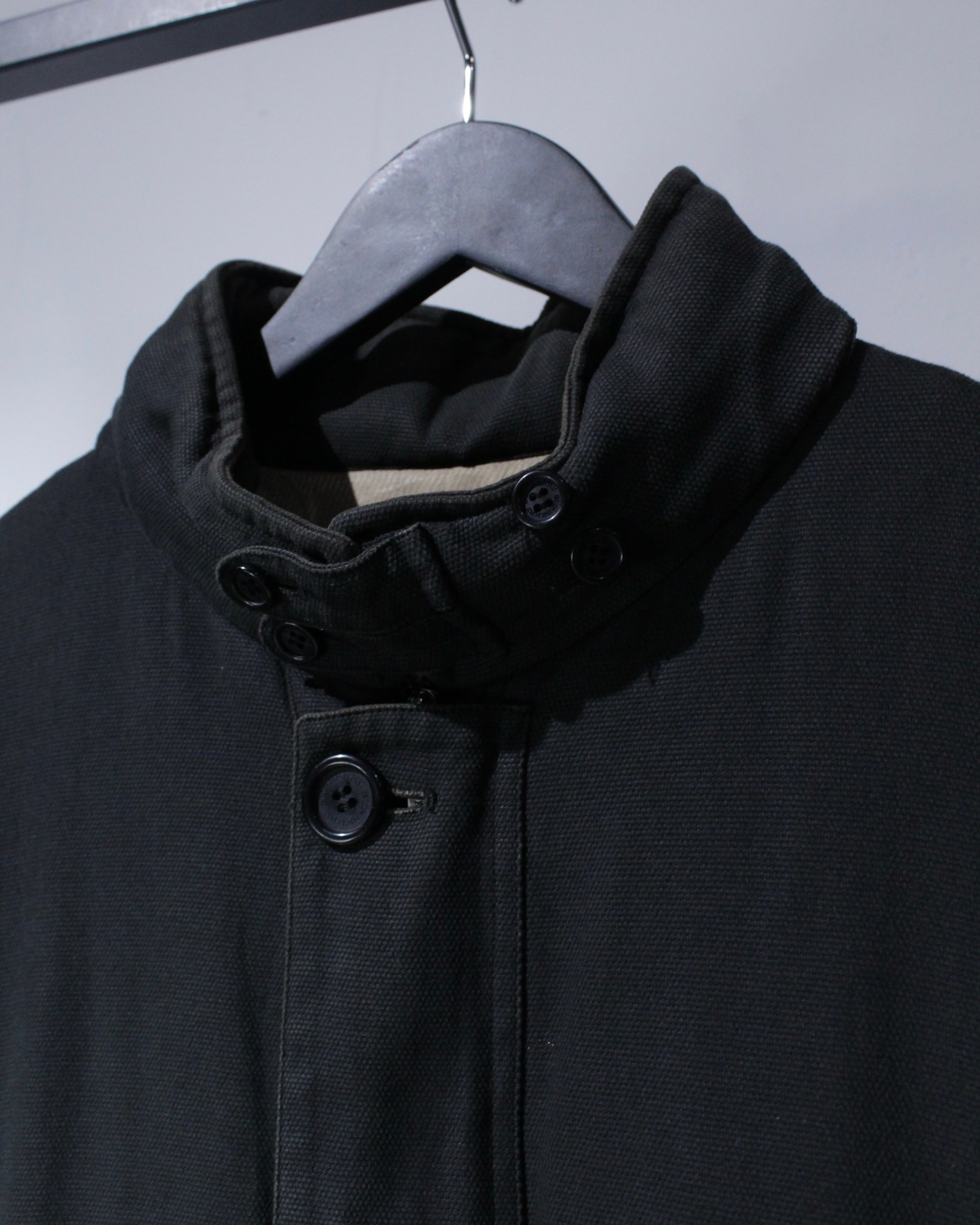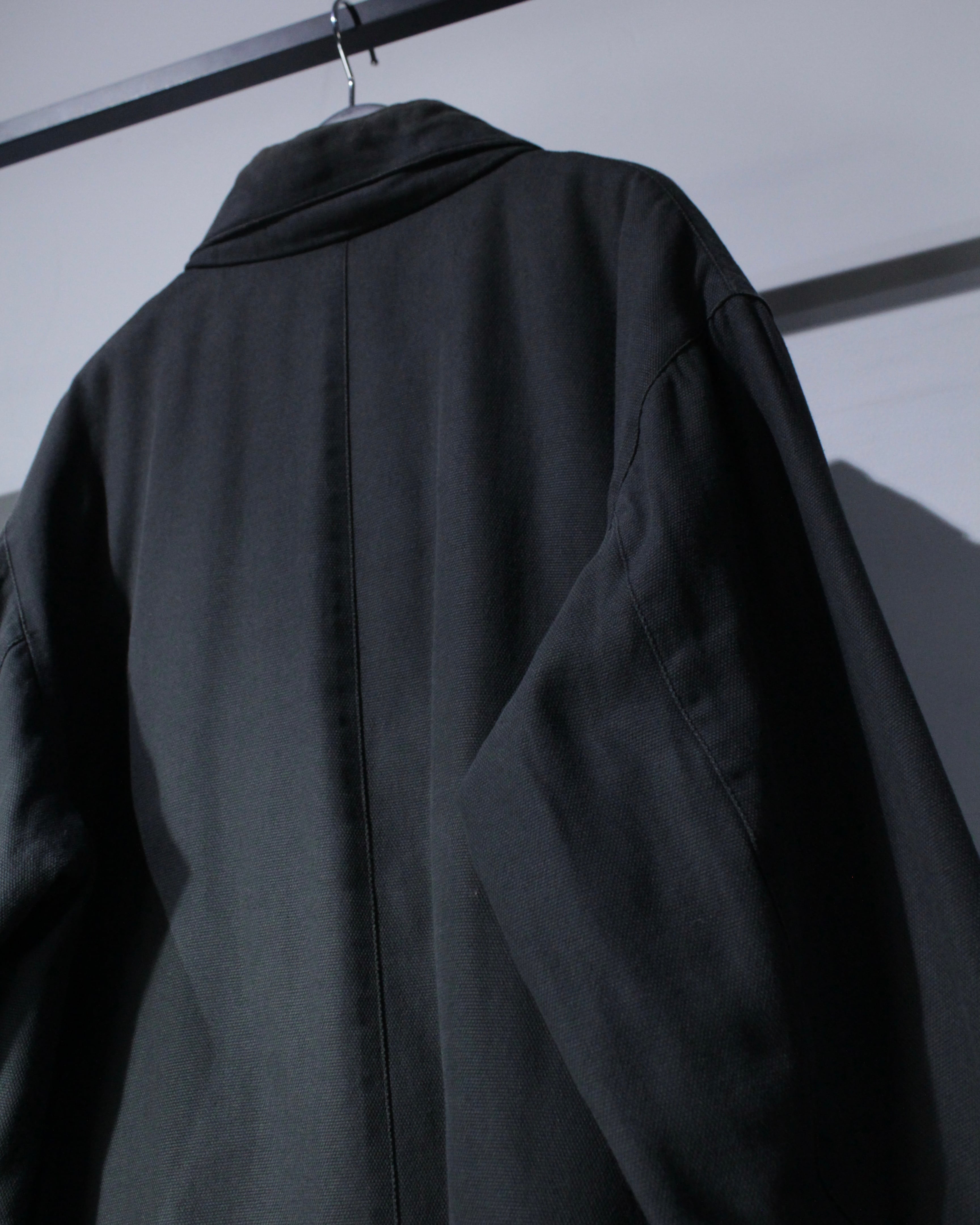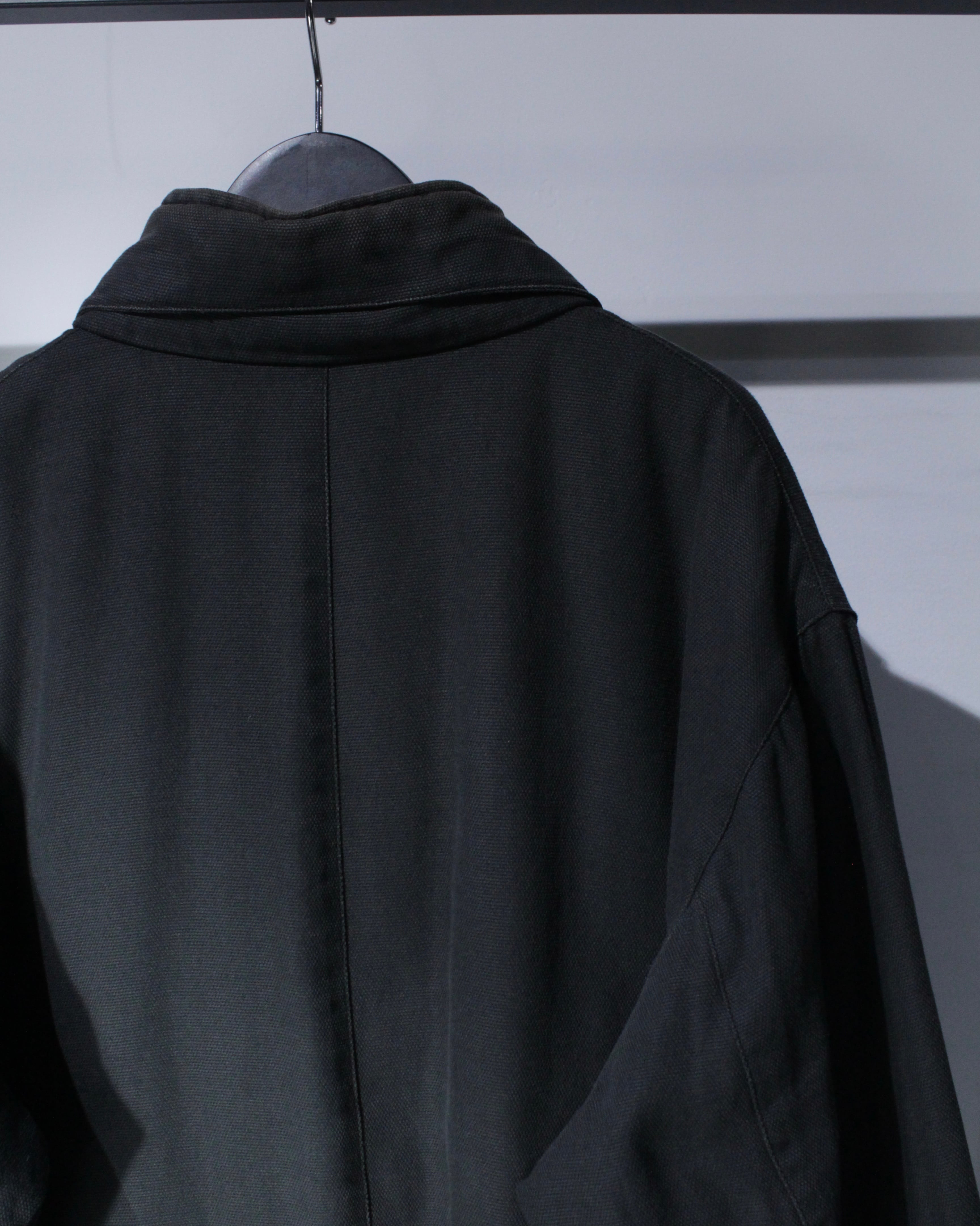 深いチャコールグレーのボディには、粗めに織られたキャンバス地の独特の質感が宿り、ワークウェアの堅牢さを思わせながらも、シルエットはゆるやかでモードな雰囲気を漂わせています。