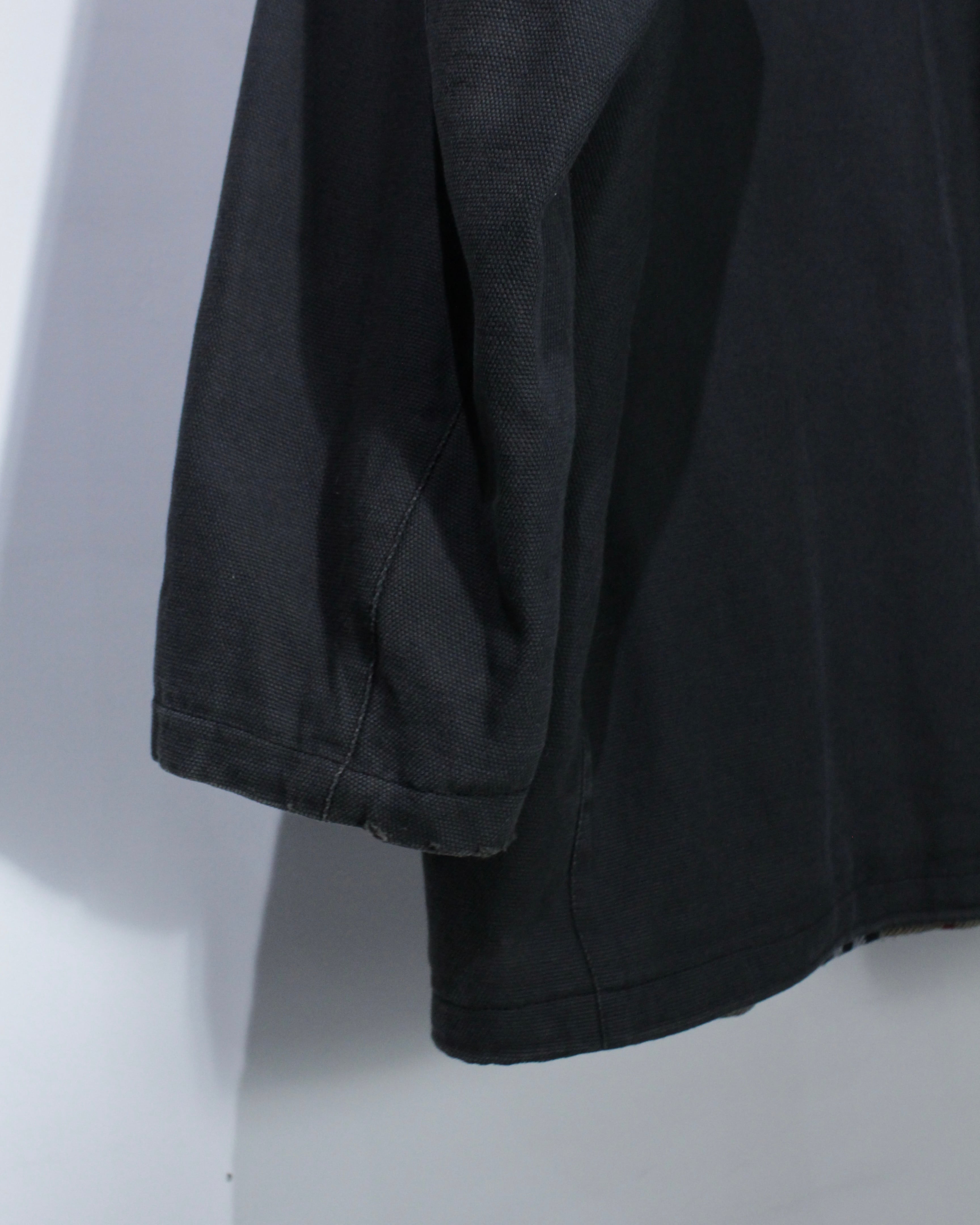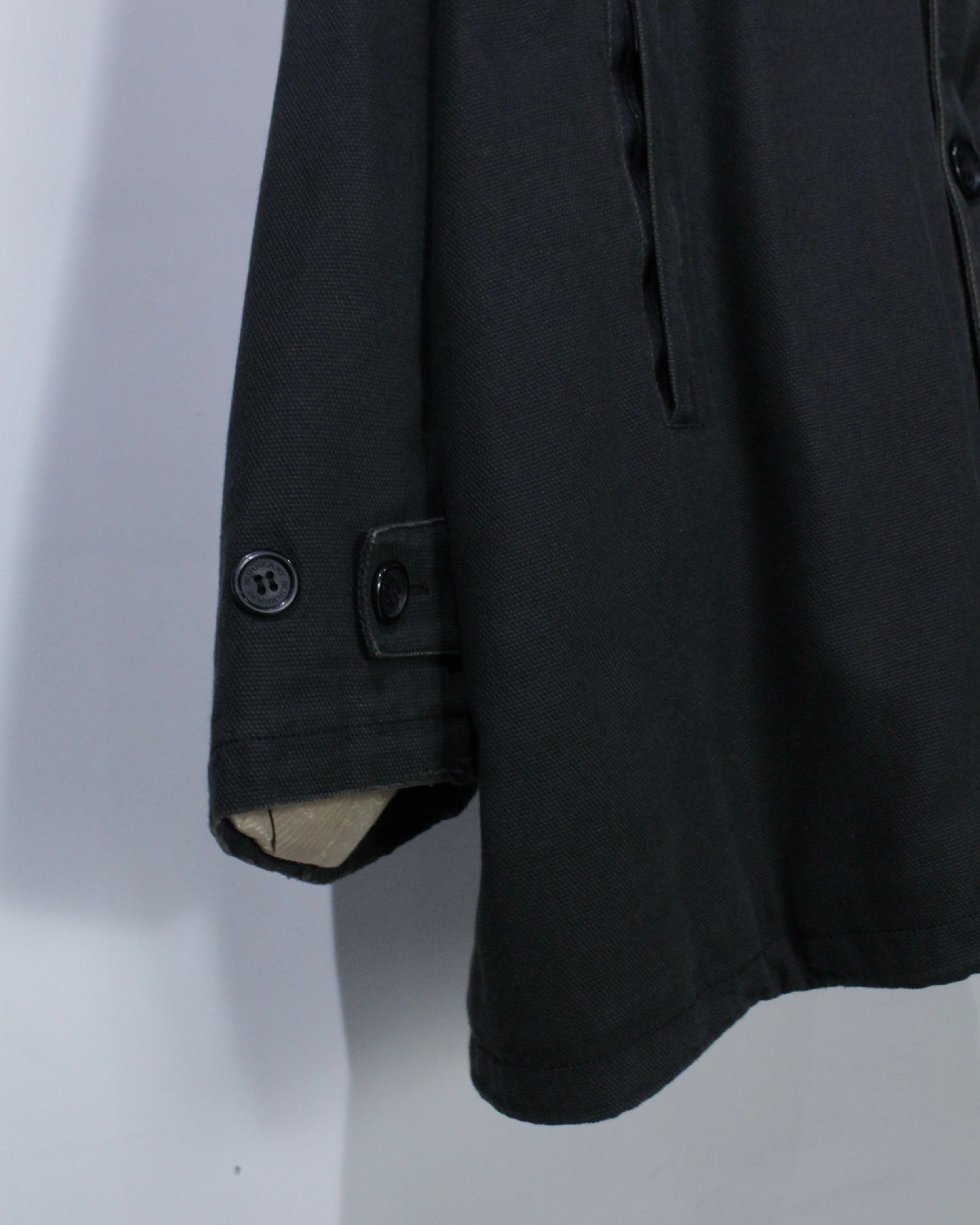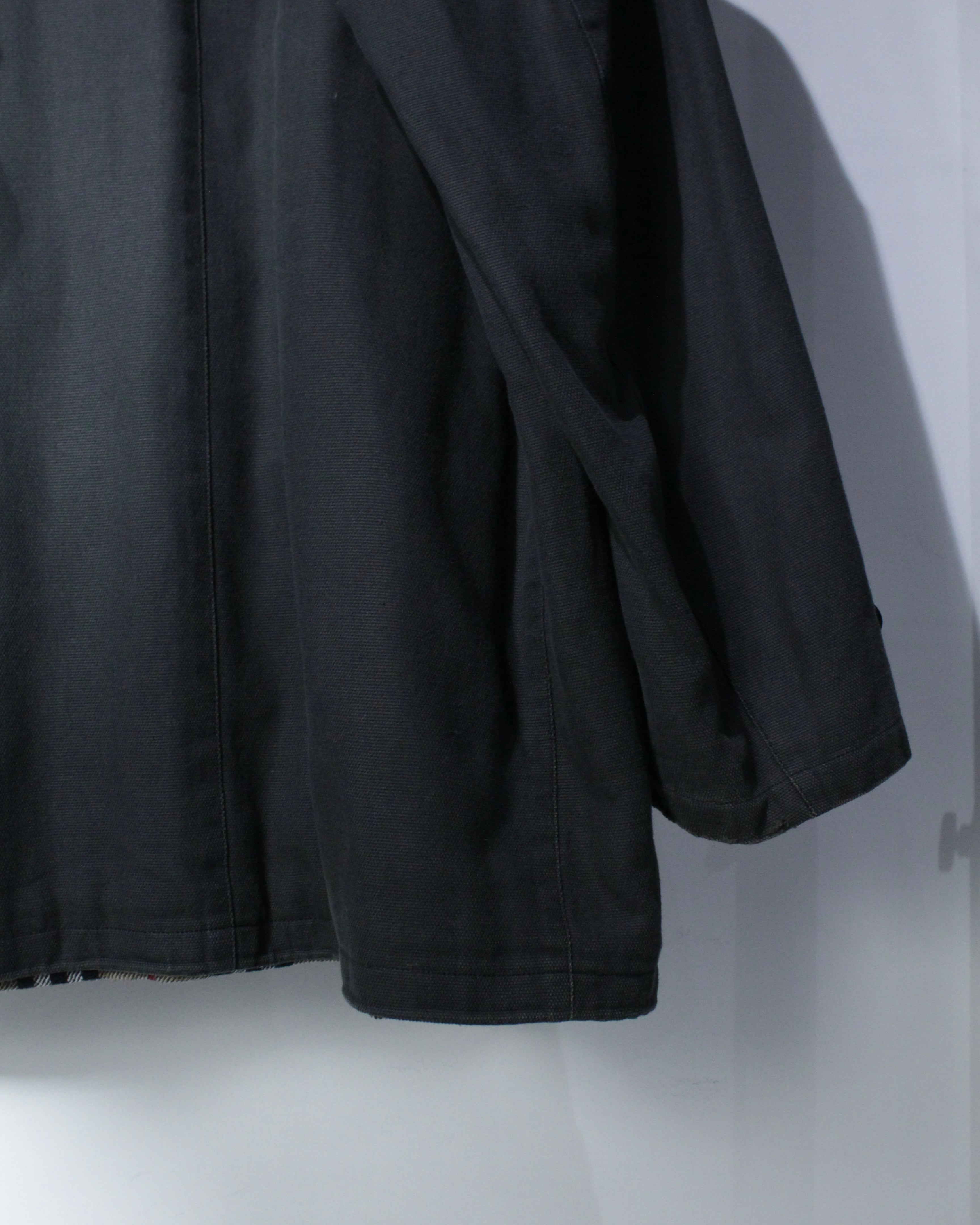 深いチャコールグレーのボディには、粗めに織られたキャンバス地の独特の質感が宿り、ワークウェアの堅牢さを思わせながらも、シルエットはゆるやかでモードな雰囲気を漂わせています。