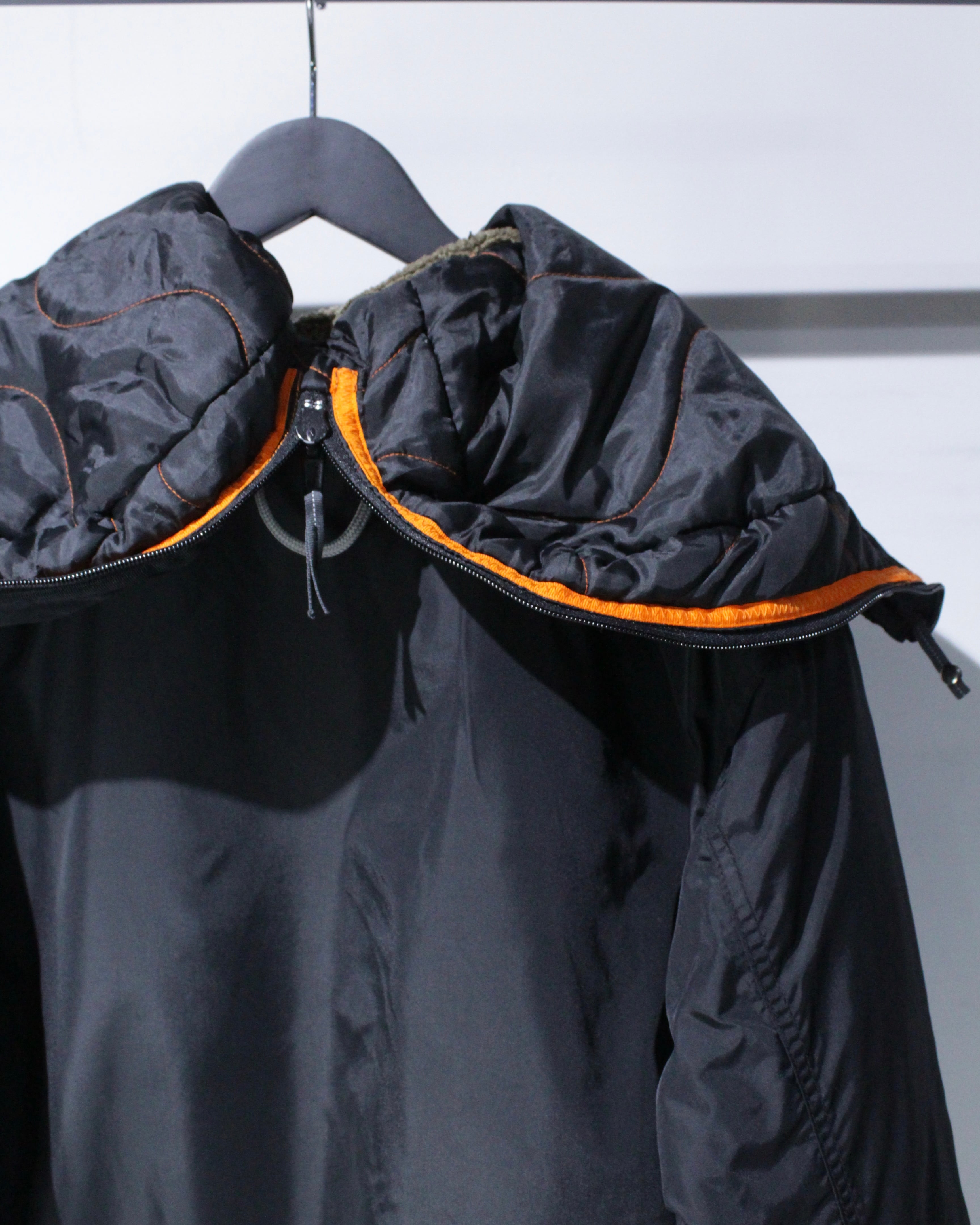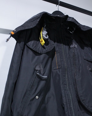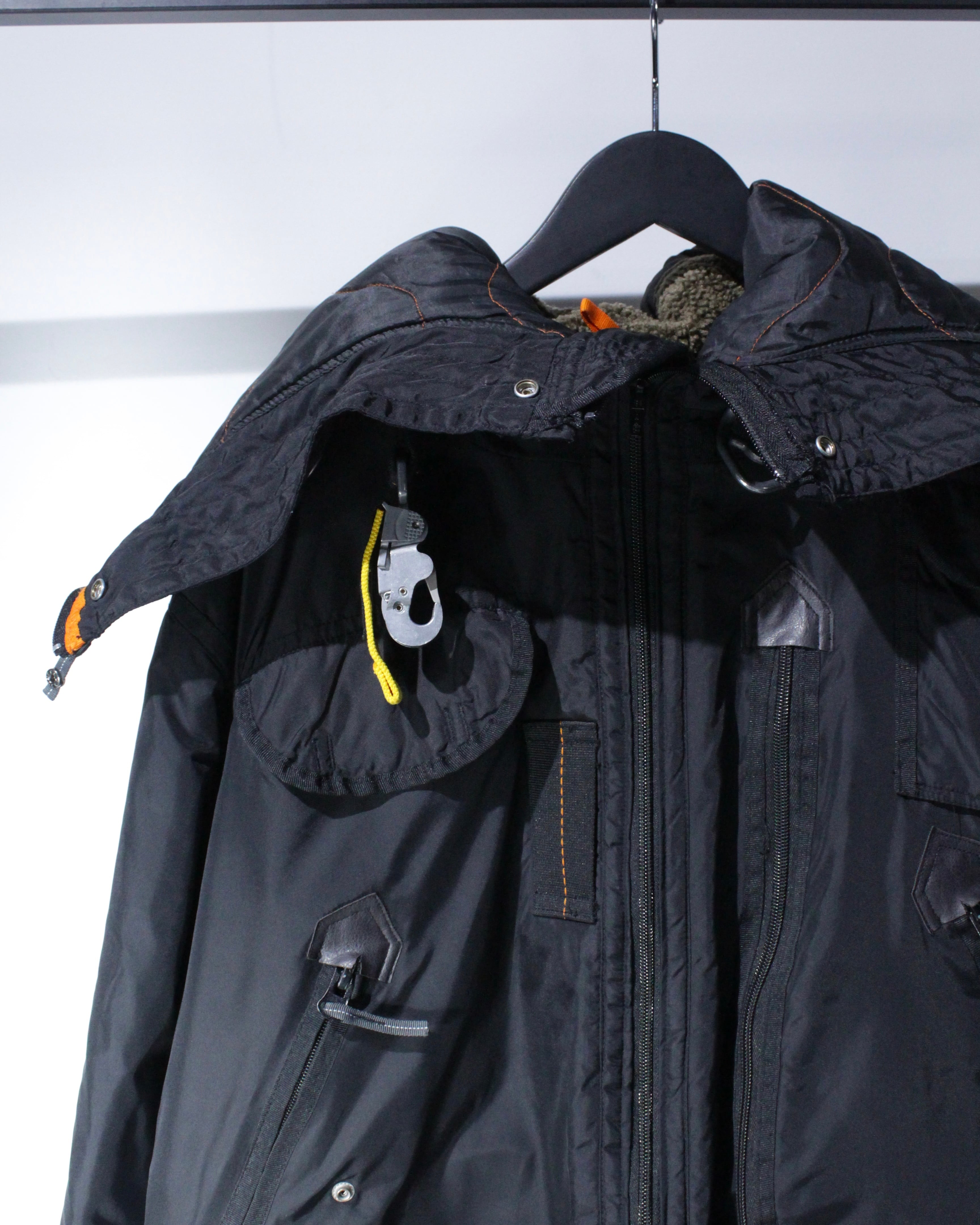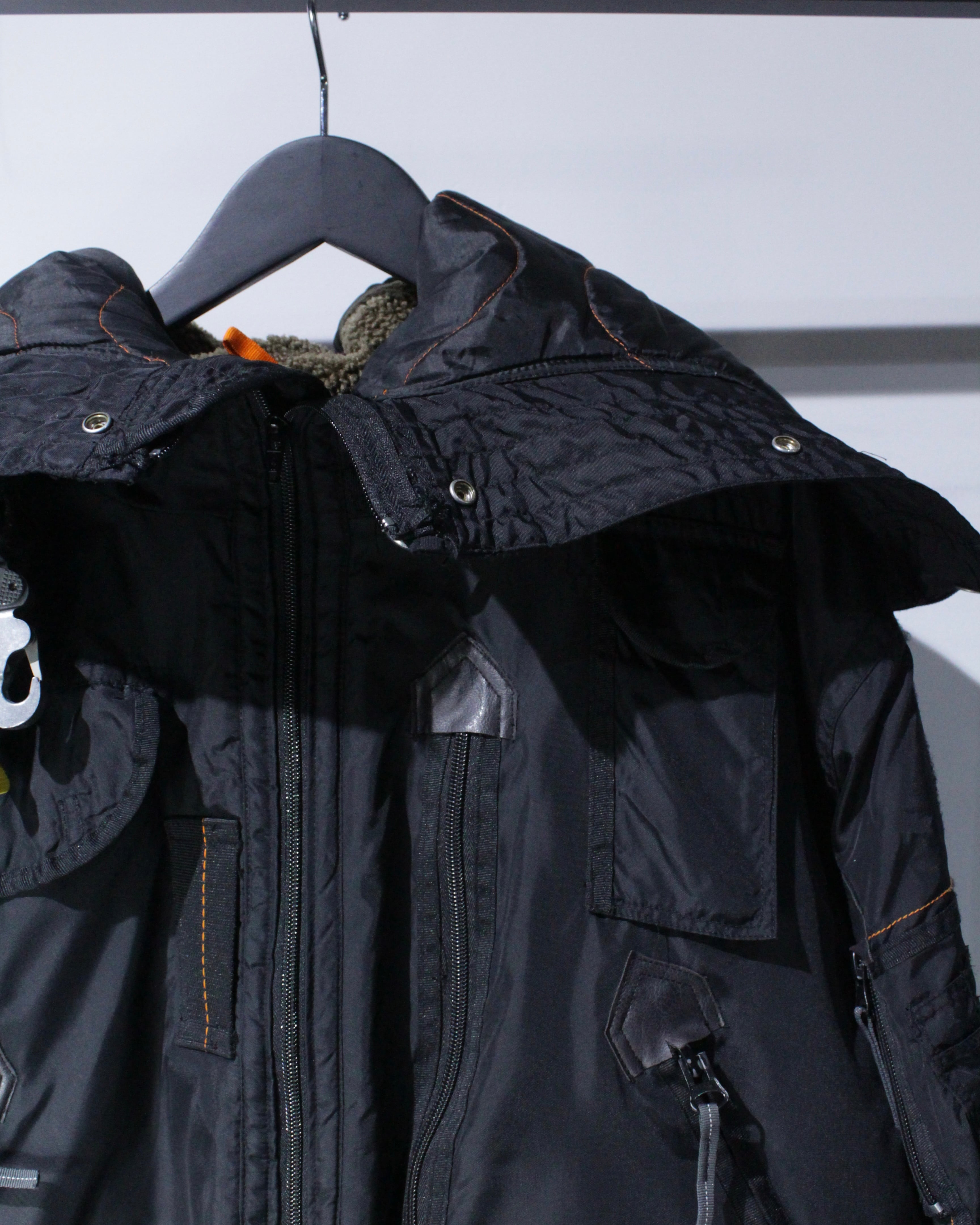 フロントにはフラップポケットやジップポケットを配置し、実用性と存在感を両立。胸元に備えられた金属フックのギアディテールが、ストリートでもアウトドアでも刺さる唯一無二のアクセントに。